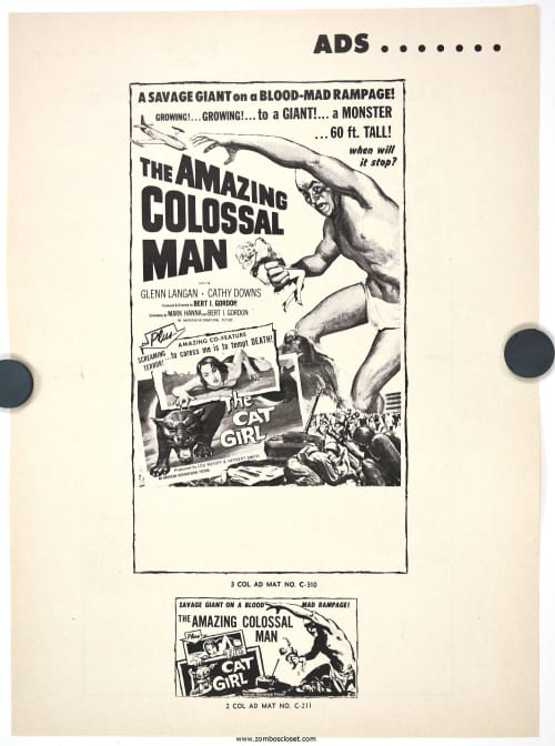 I love the folder-type double bill pressbooks with separate inserts for each movie (or campaign manuals as they were called, too). Here's one from American International Pictures touting a double bill of The Amazing Colossal Man and The Cat Girl. I have The Cat Girl waiting for me–on my DVR–courtesy of TCM. I don't think I ever caught that one. But who hasn't seen The Amazing Colossal Man?