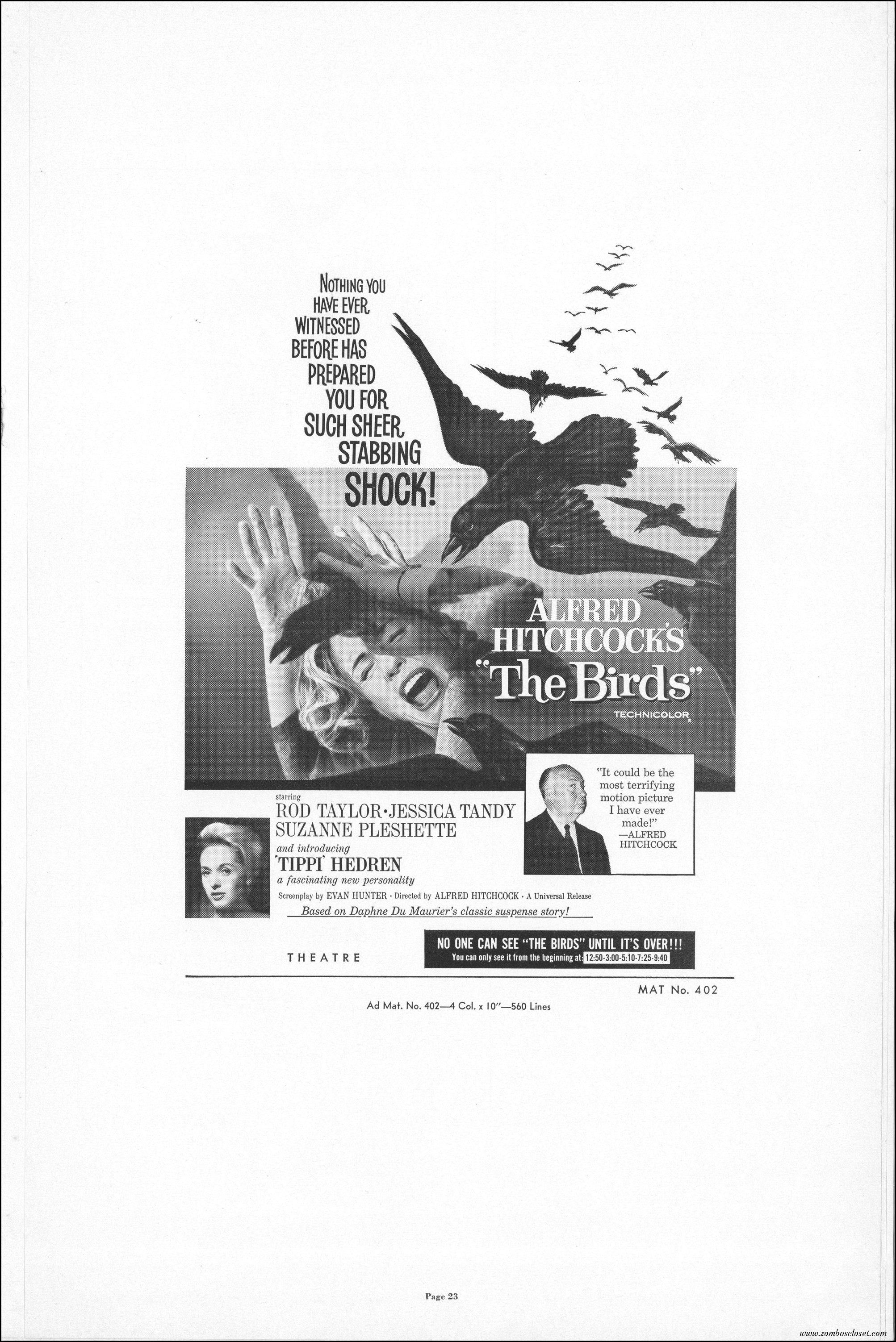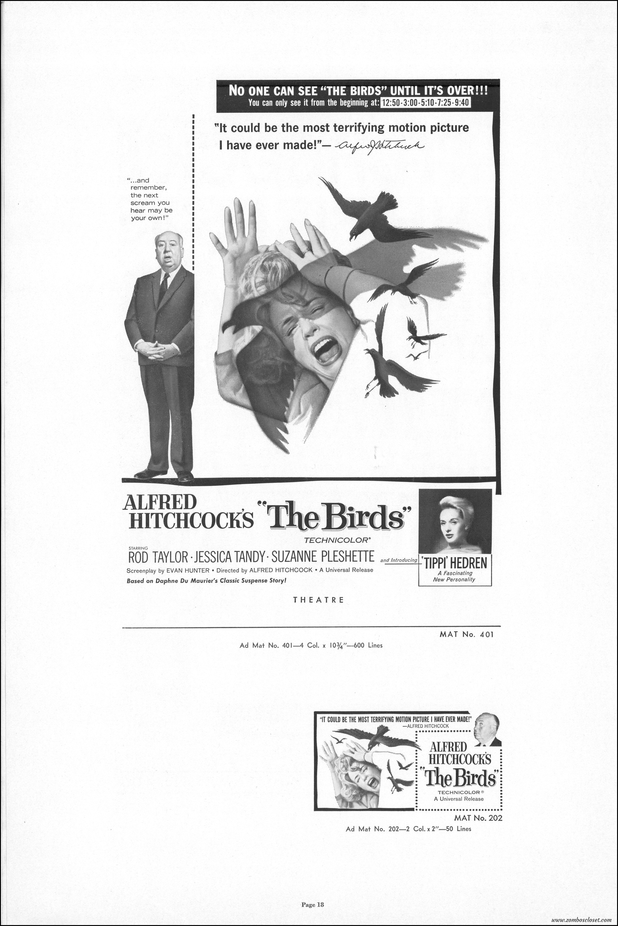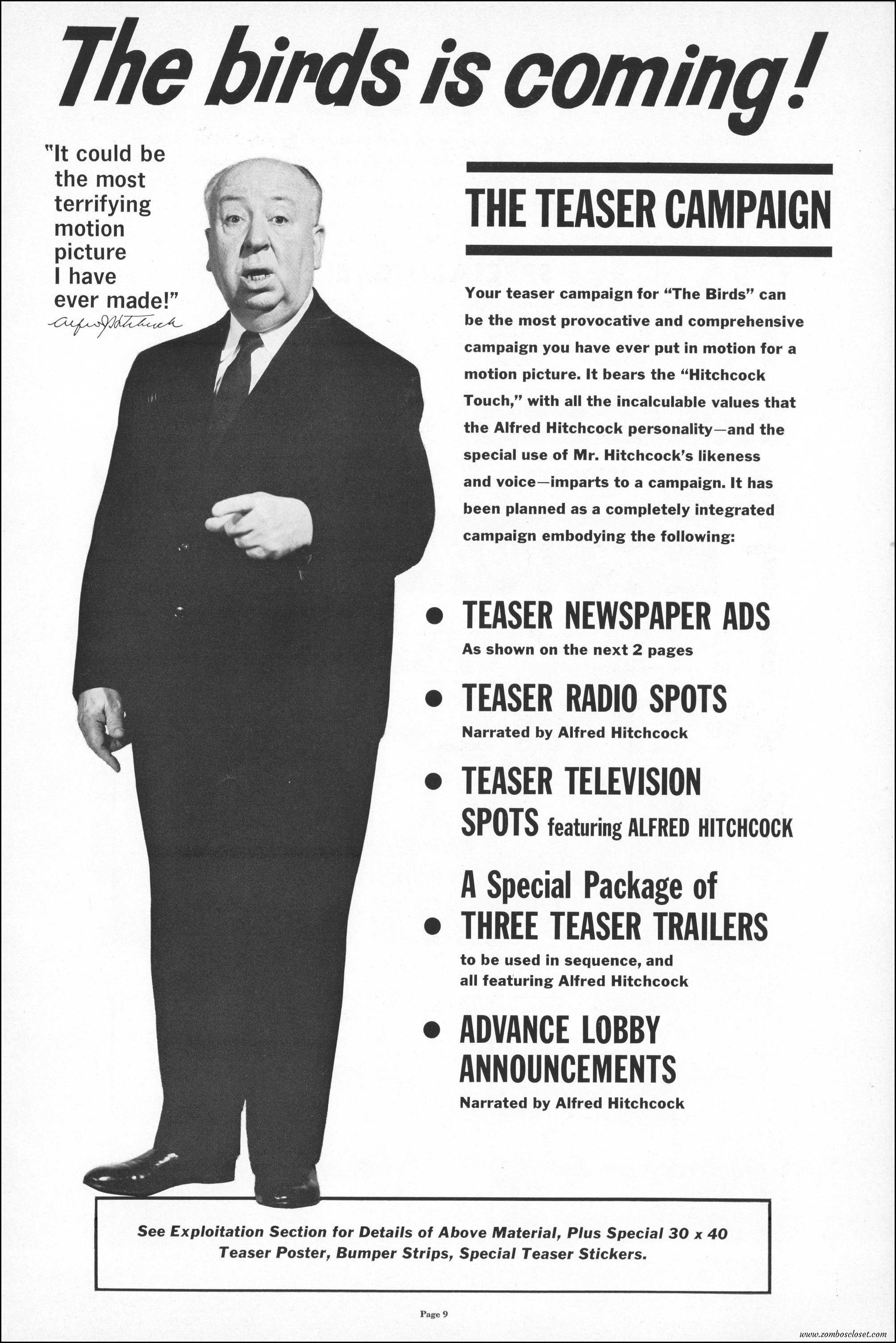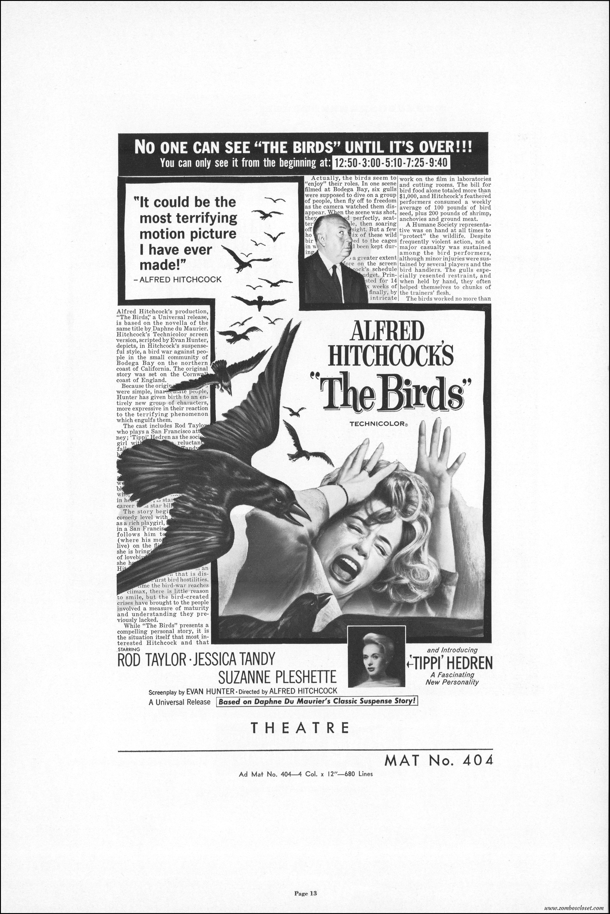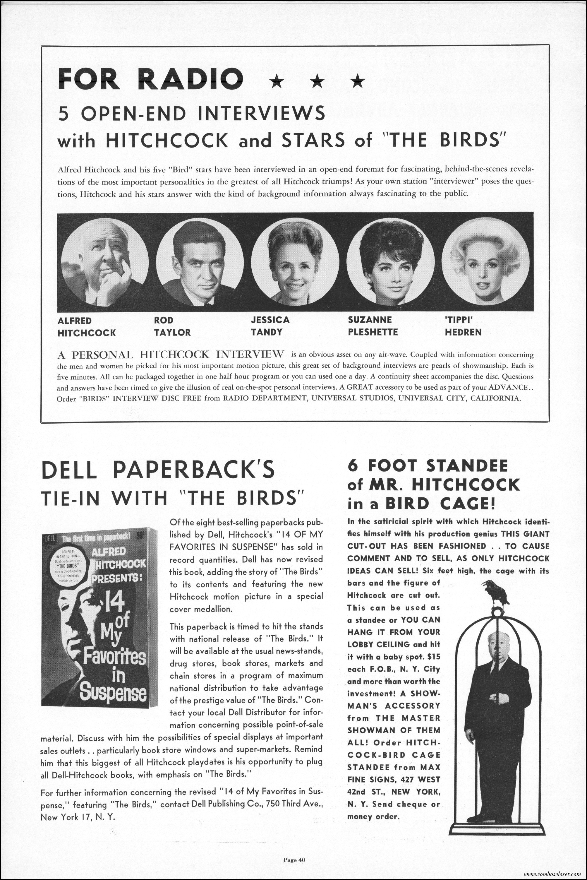 Hitchcock had mentioned the birds rise up against humans because they are fed up with us. Given how badly we’ve messed up the planet, I’m expecting The Birds to become a reality any day now. Much of nature seems to be gunning for us these days. Back in the the 1970s there were a slew of movies depicting how mother nature turned into a mean bitch. From Frogs to Long Weekend to Soylent Green, we’ve been told this story again and again. But Hitchcock makes it pretty terrifying indeed. This 40-plus page pressbook for The Birds is a showman’s dream. Like William Castle, Alfred Hitchcock liked to play pitchman to his movies, and appeared to have fun doing so. The 6 foot standee of Hitchcock in a bird cage is awesome. Now my life won’t be complete until I find one.