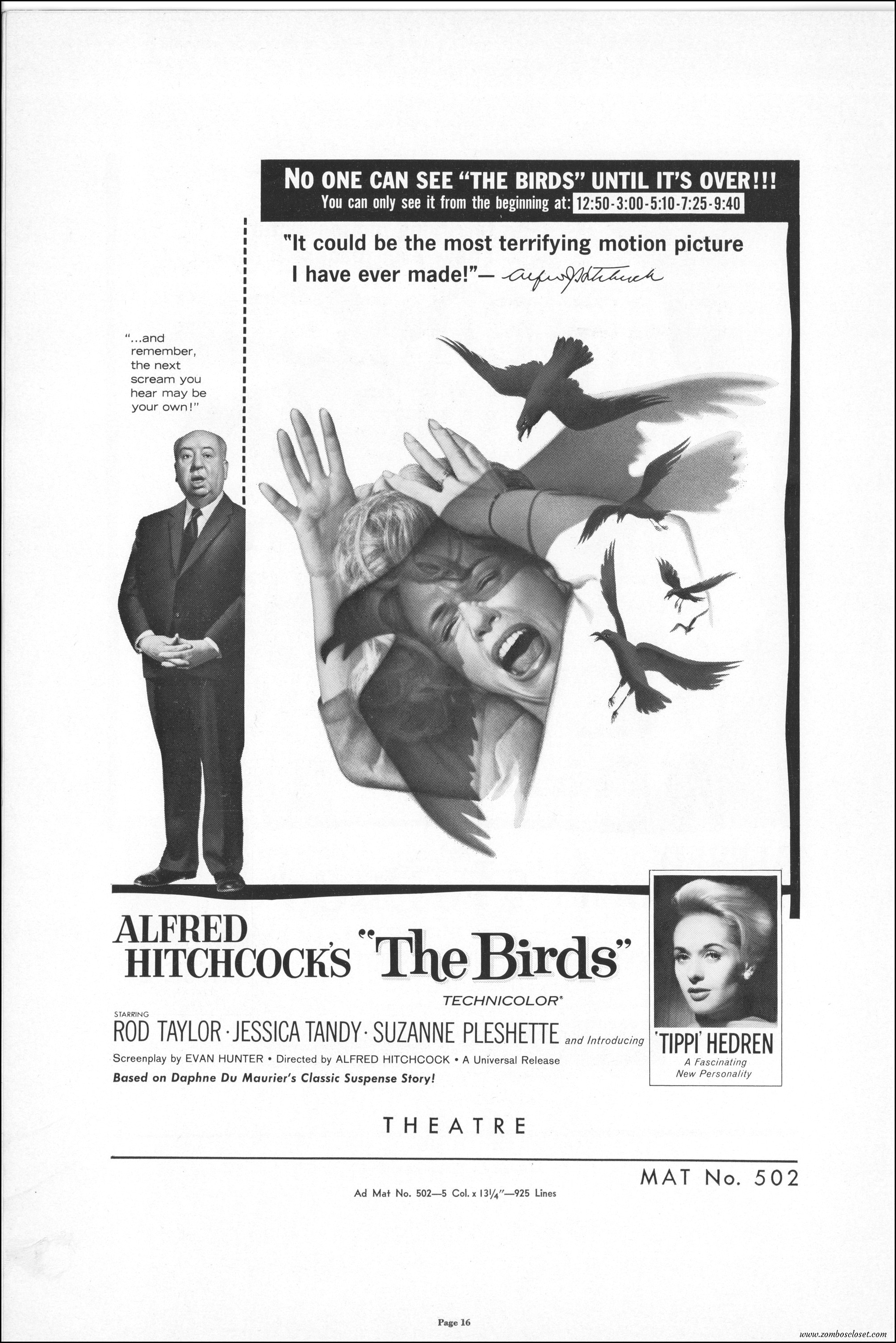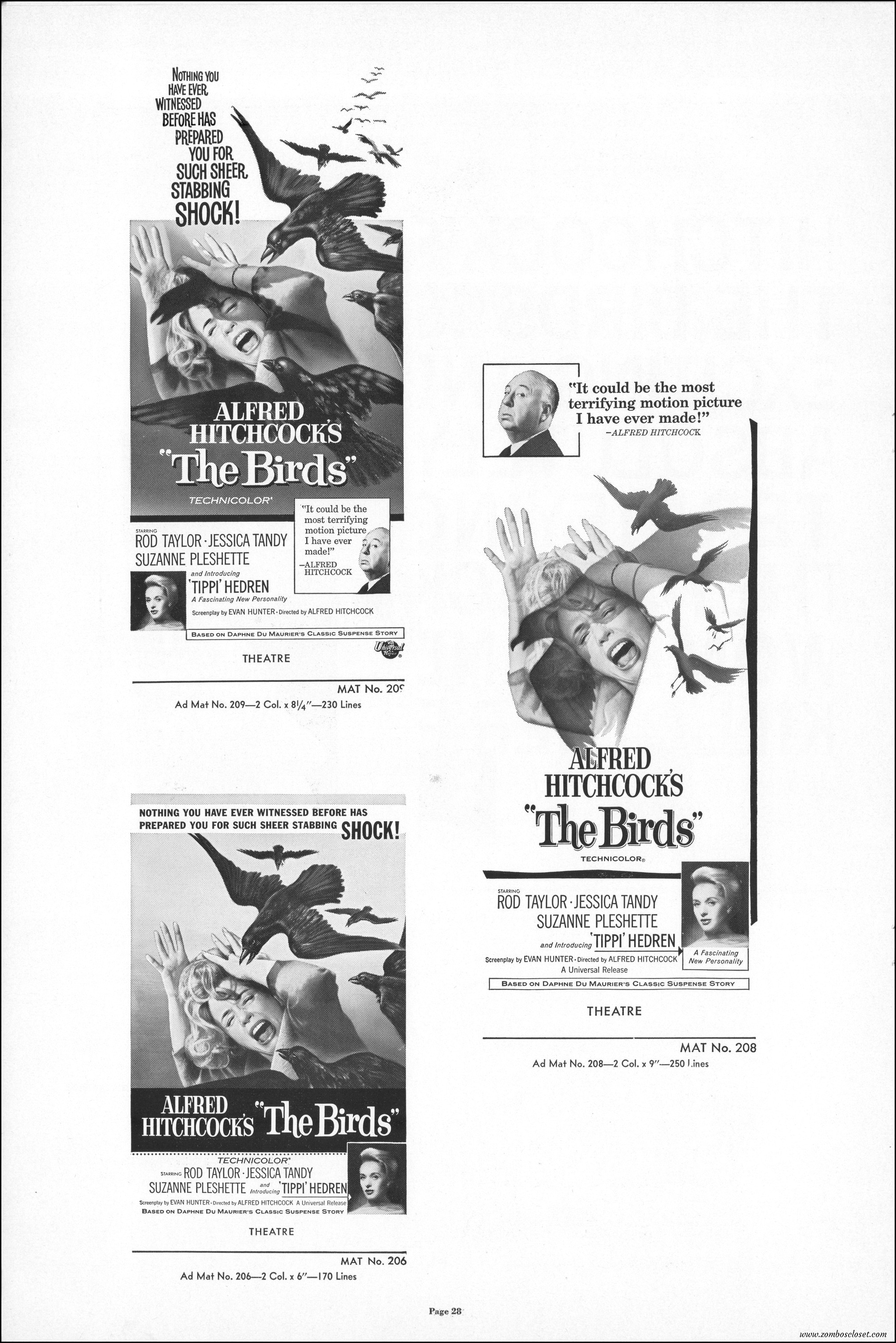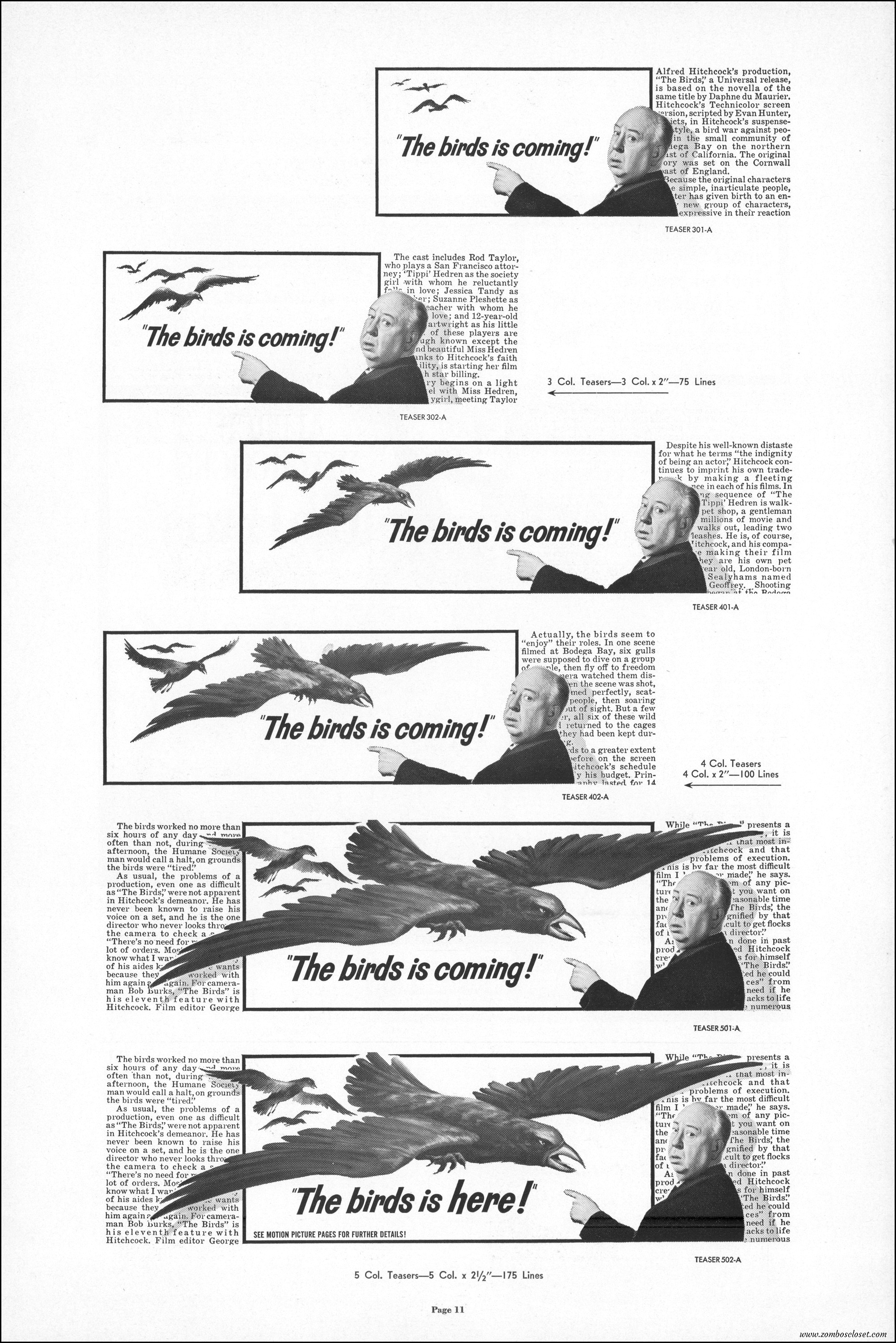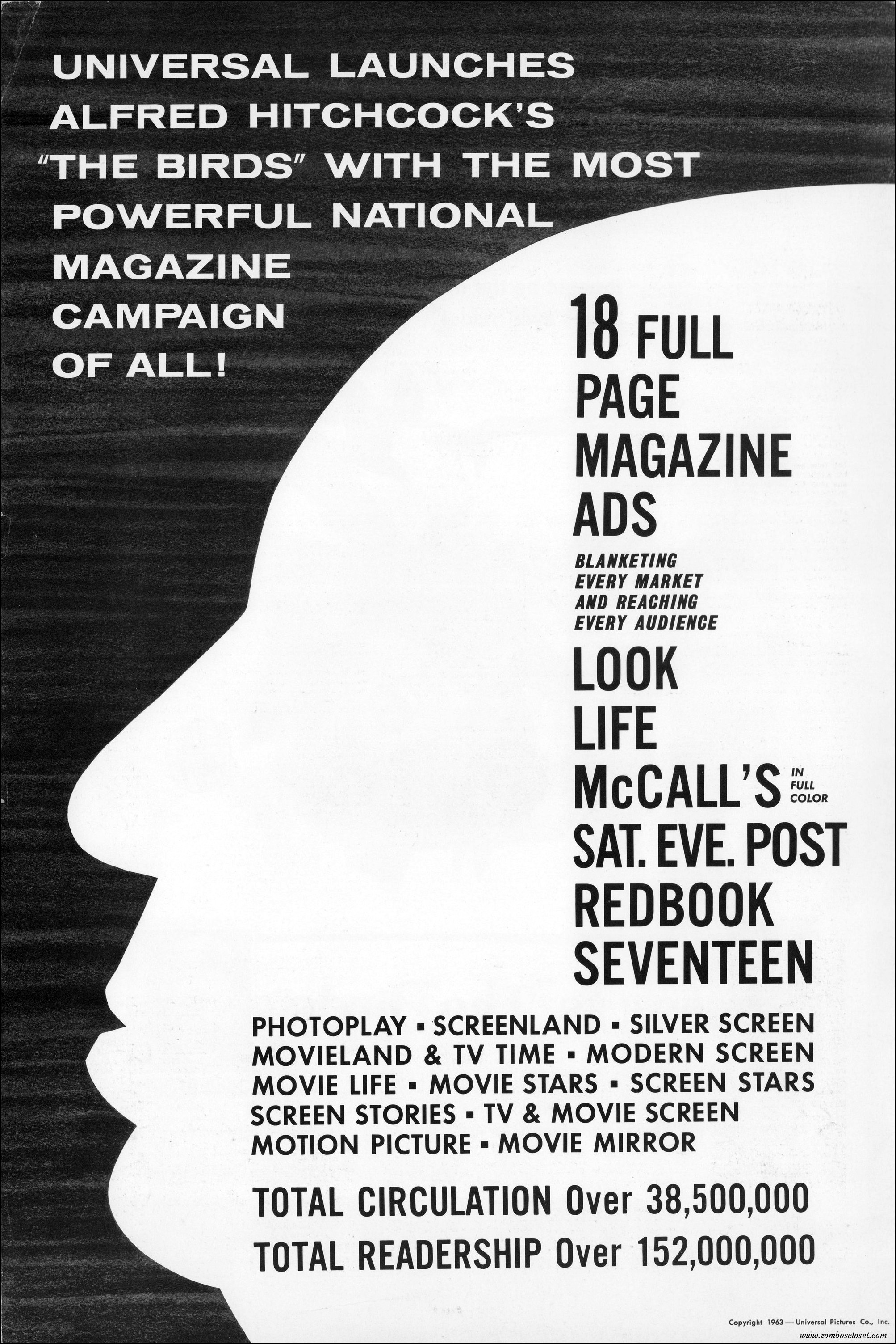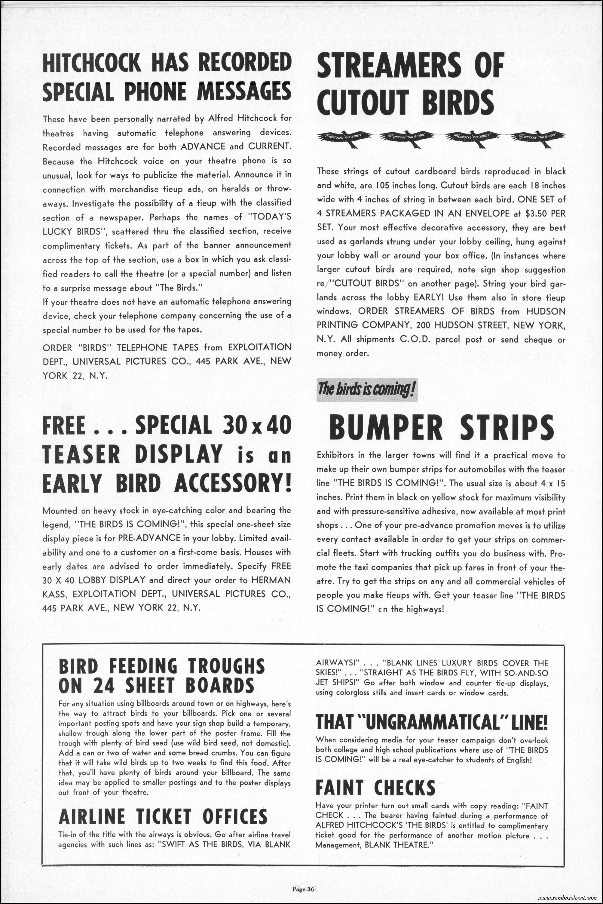 Hitchcock had mentioned the birds rise up against humans because they are fed up with us. Given how badly we’ve messed up the planet, I’m expecting The Birds to become a reality any day now. Much of nature seems to be gunning for us these days. Back in the the 1970s there were a slew of movies depicting how mother nature turned into a mean bitch. From Frogs to Long Weekend to Soylent Green, we’ve been told this story again and again. But Hitchcock makes it pretty terrifying indeed. This 40-plus page pressbook for The Birds is a showman’s dream. Like William Castle, Alfred Hitchcock liked to play pitchman to his movies, and appeared to have fun doing so. The 6 foot standee of Hitchcock in a bird cage is awesome. Now my life won’t be complete until I find one.