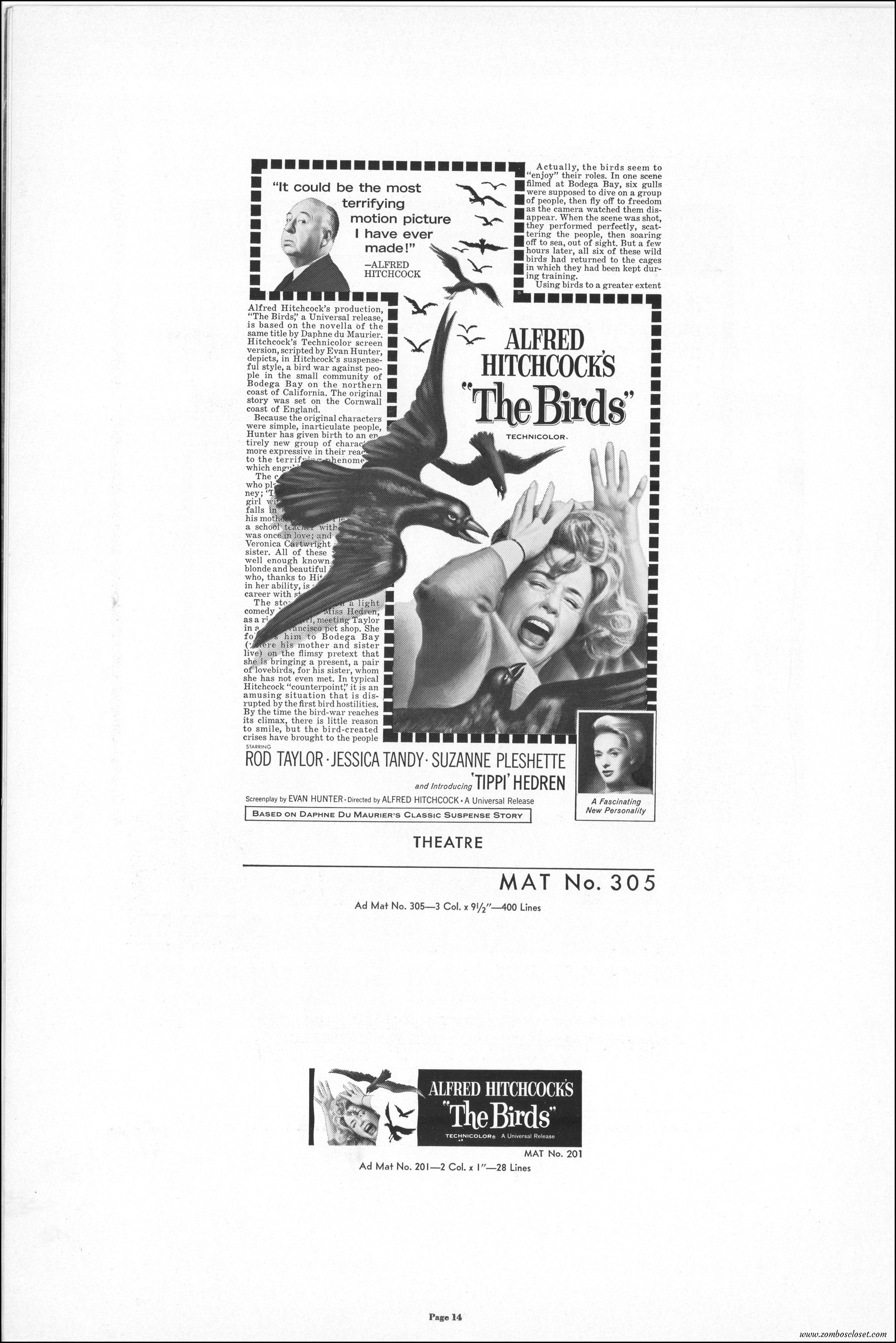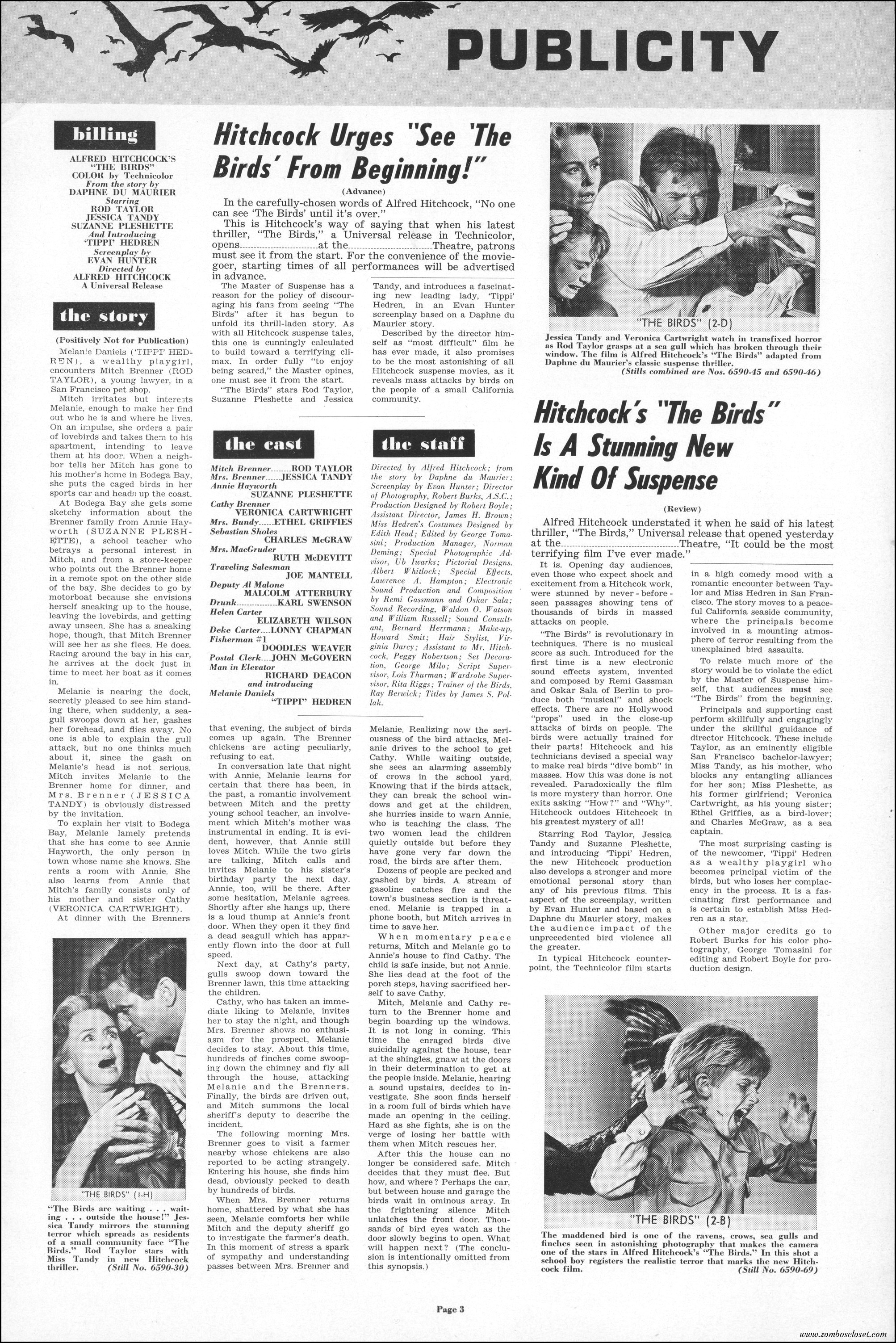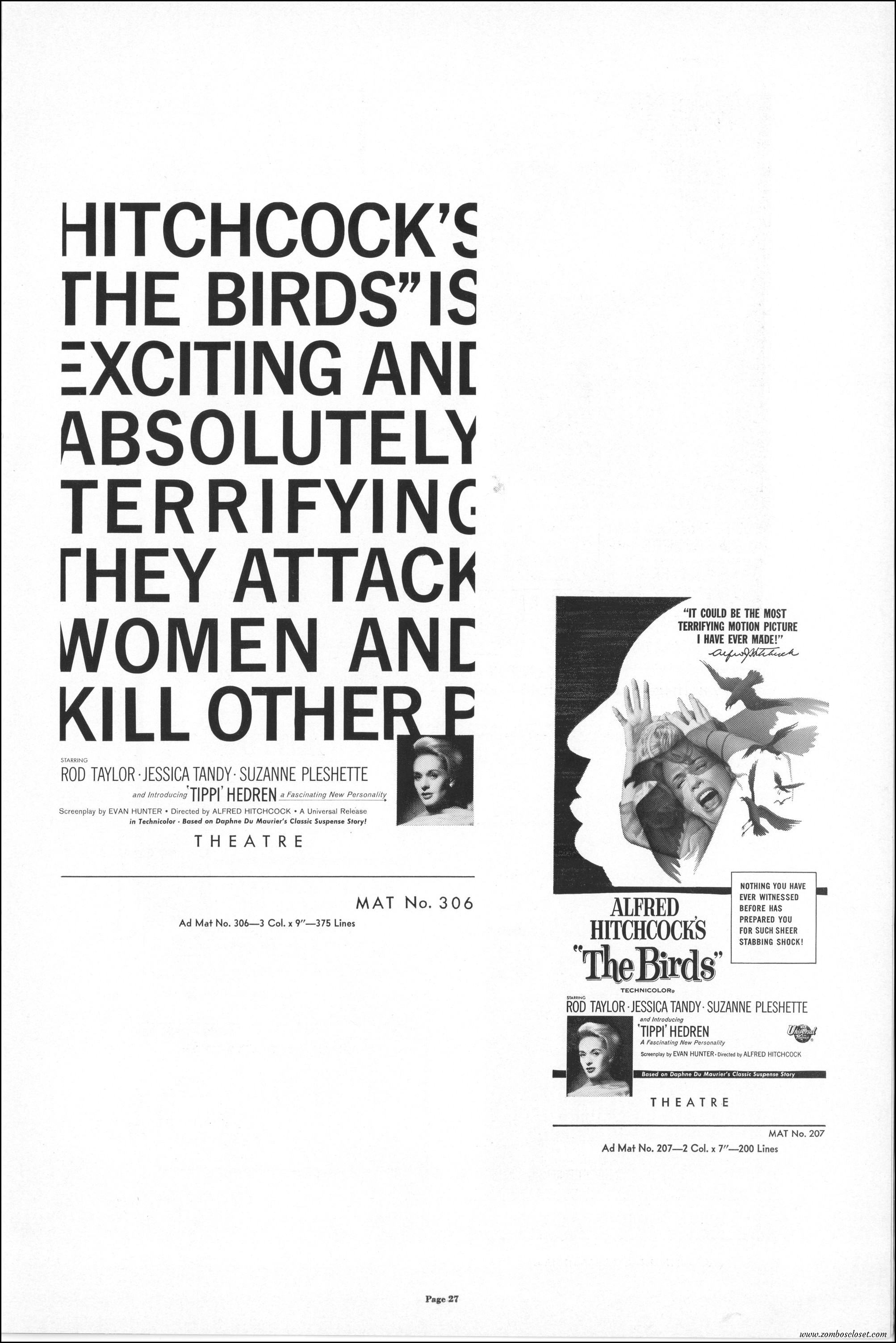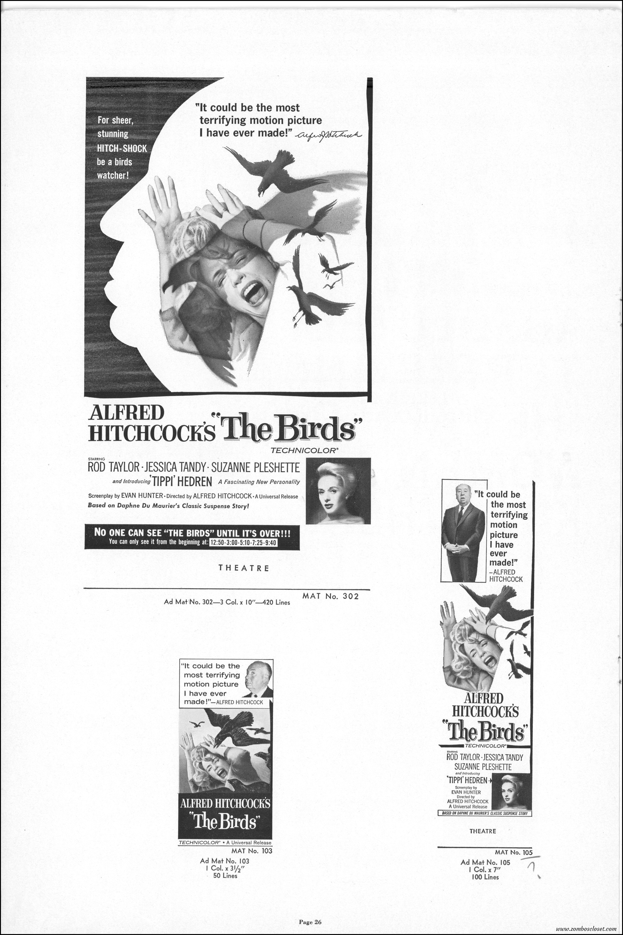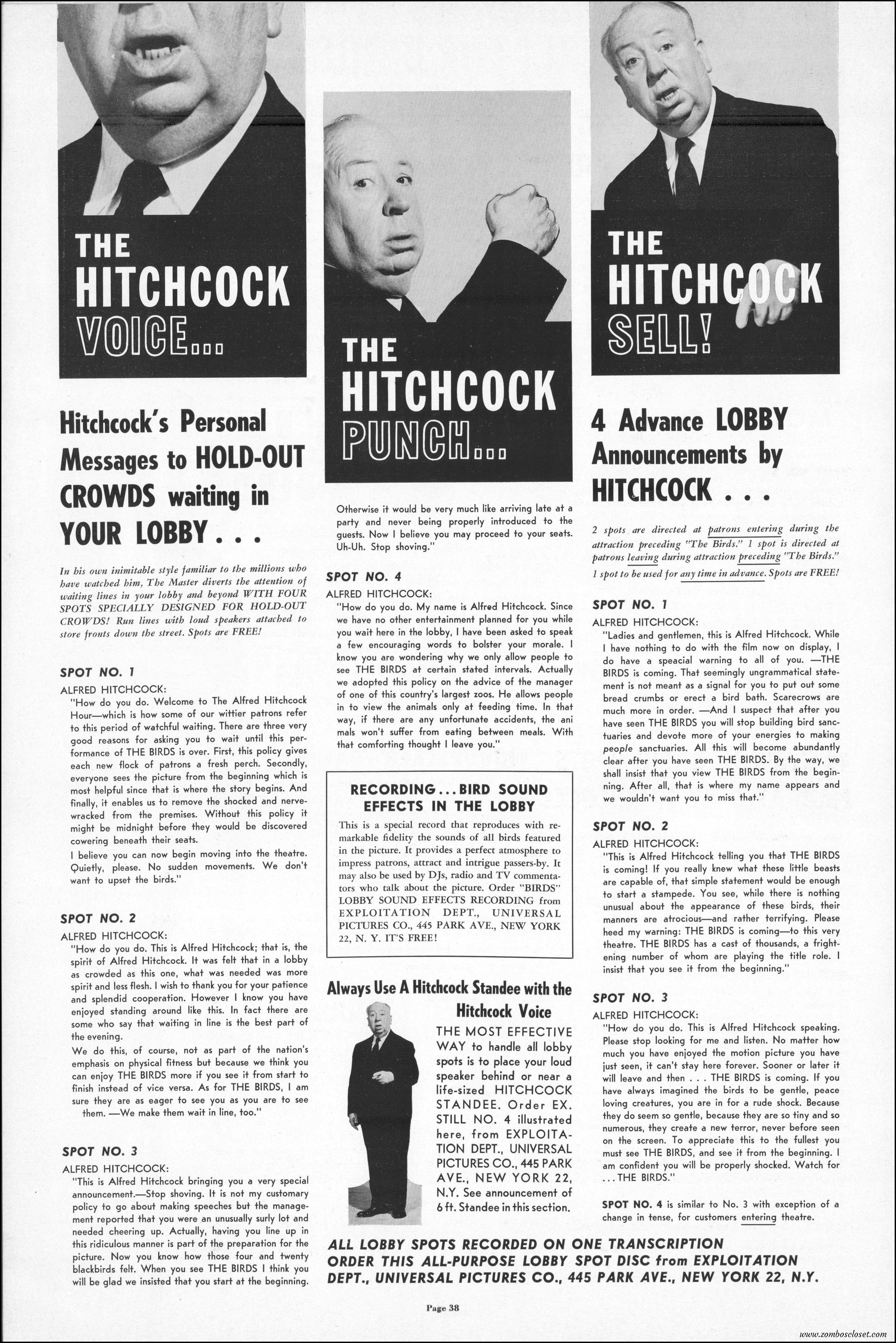 Hitchcock had mentioned the birds rise up against humans because they are fed up with us. Given how badly we’ve messed up the planet, I’m expecting The Birds to become a reality any day now. Much of nature seems to be gunning for us these days. Back in the the 1970s there were a slew of movies depicting how mother nature turned into a mean bitch. From Frogs to Long Weekend to Soylent Green, we’ve been told this story again and again. But Hitchcock makes it pretty terrifying indeed. This 40-plus page pressbook for The Birds is a showman’s dream. Like William Castle, Alfred Hitchcock liked to play pitchman to his movies, and appeared to have fun doing so. The 6 foot standee of Hitchcock in a bird cage is awesome. Now my life won’t be complete until I find one.