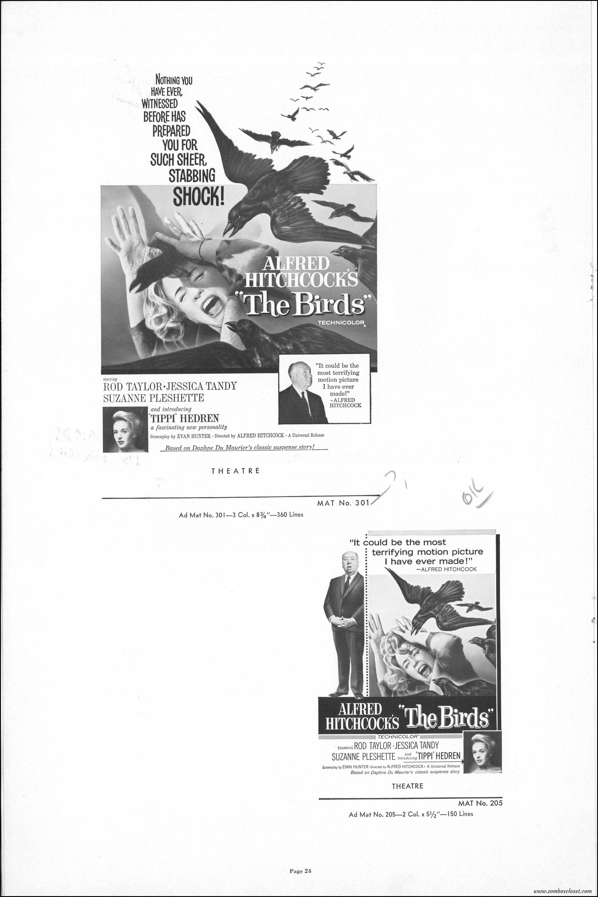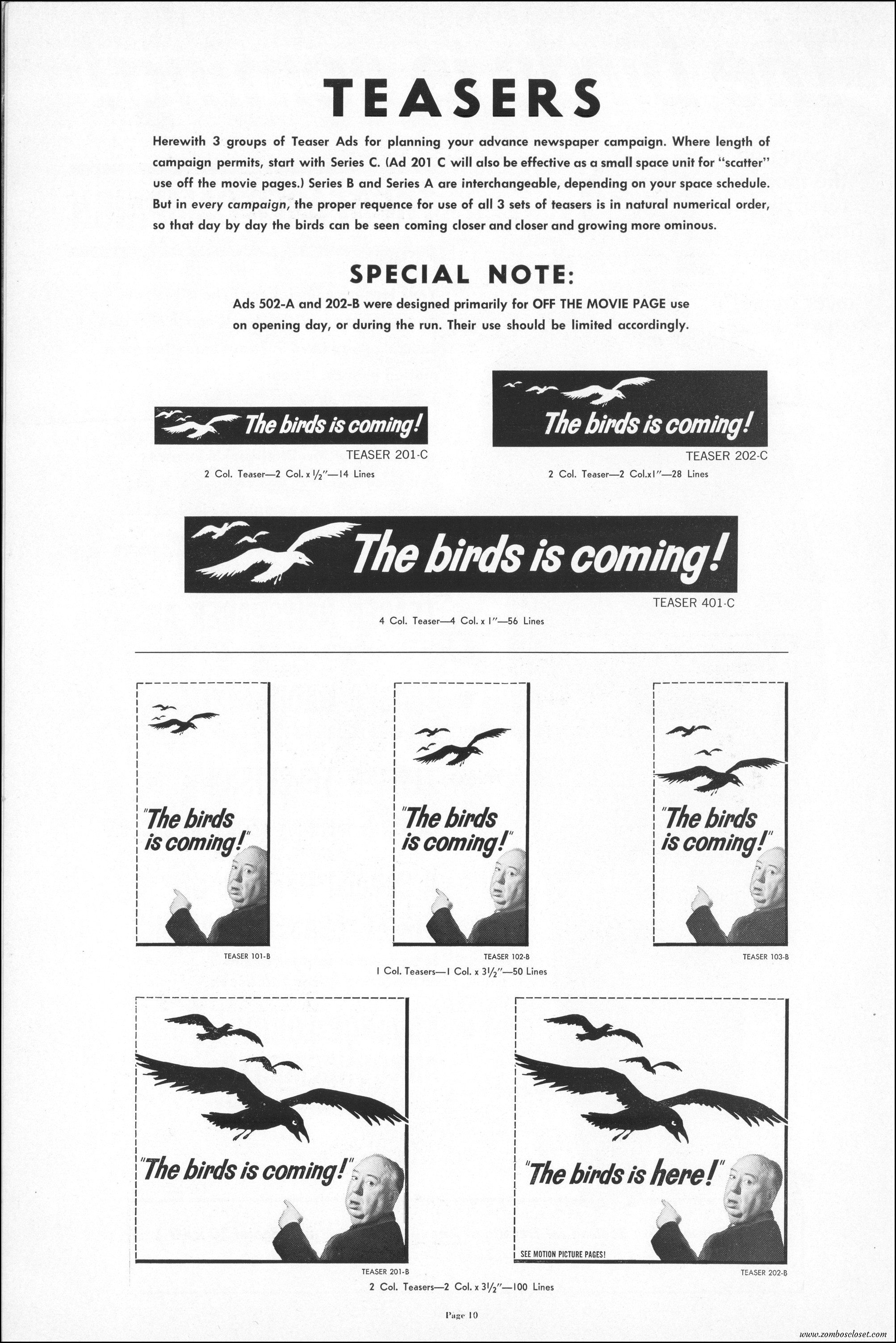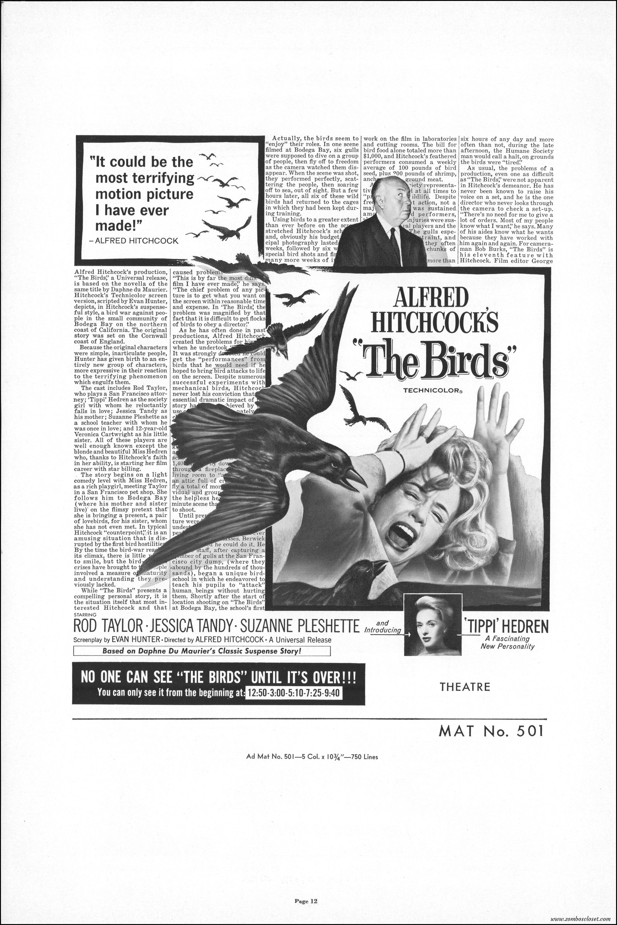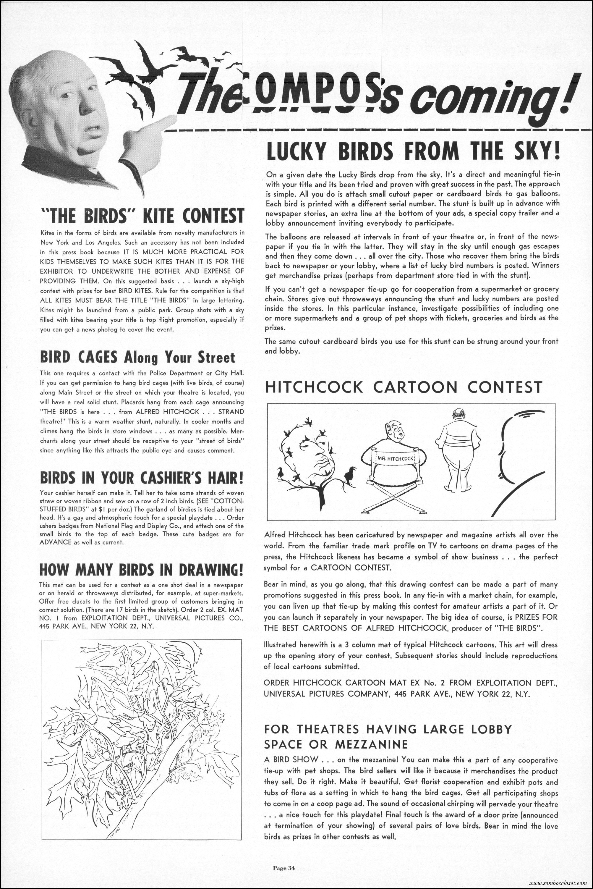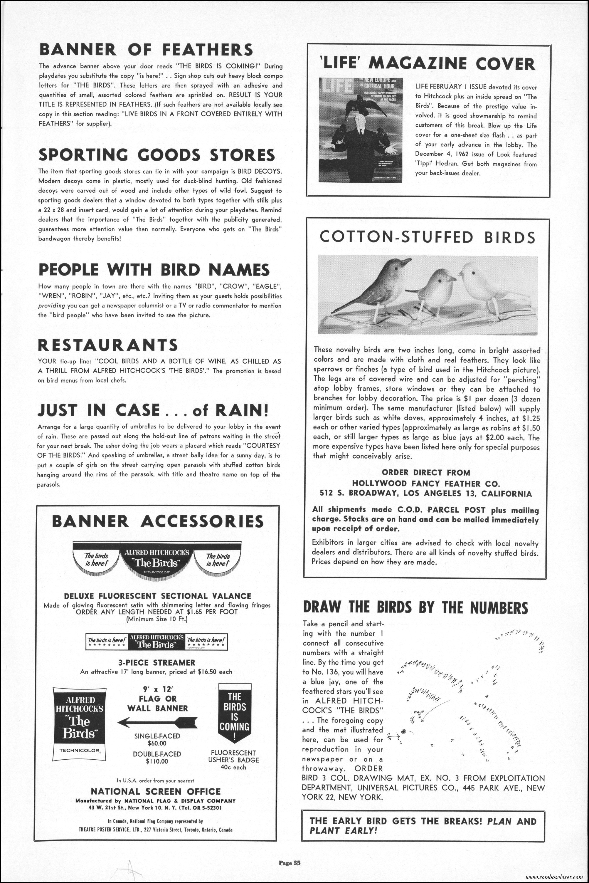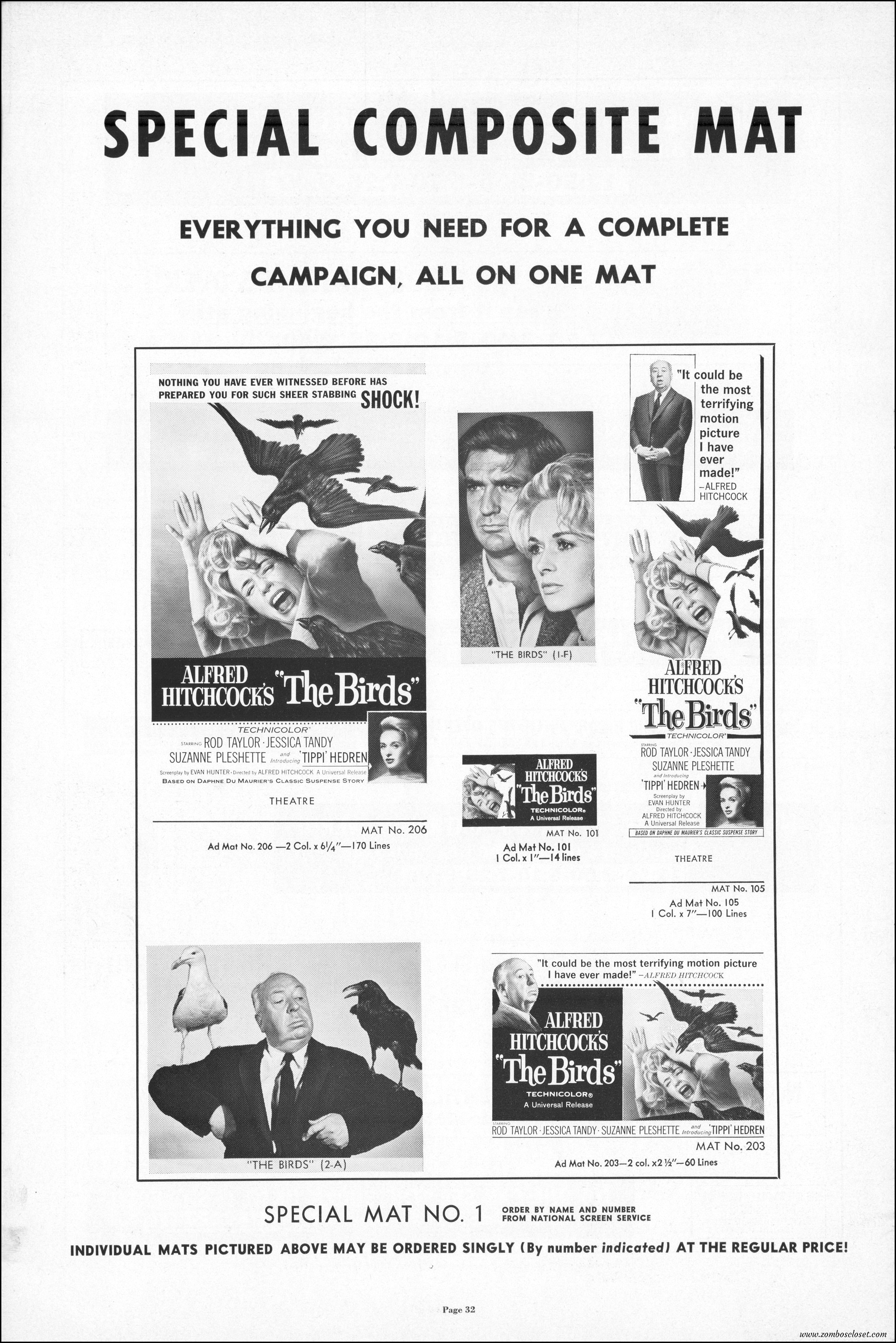 Hitchcock had mentioned the birds rise up against humans because they are fed up with us. Given how badly we’ve messed up the planet, I’m expecting The Birds to become a reality any day now. Much of nature seems to be gunning for us these days. Back in the the 1970s there were a slew of movies depicting how mother nature turned into a mean bitch. From Frogs to Long Weekend to Soylent Green, we’ve been told this story again and again. But Hitchcock makes it pretty terrifying indeed. This 40-plus page pressbook for The Birds is a showman’s dream. Like William Castle, Alfred Hitchcock liked to play pitchman to his movies, and appeared to have fun doing so. The 6 foot standee of Hitchcock in a bird cage is awesome. Now my life won’t be complete until I find one.