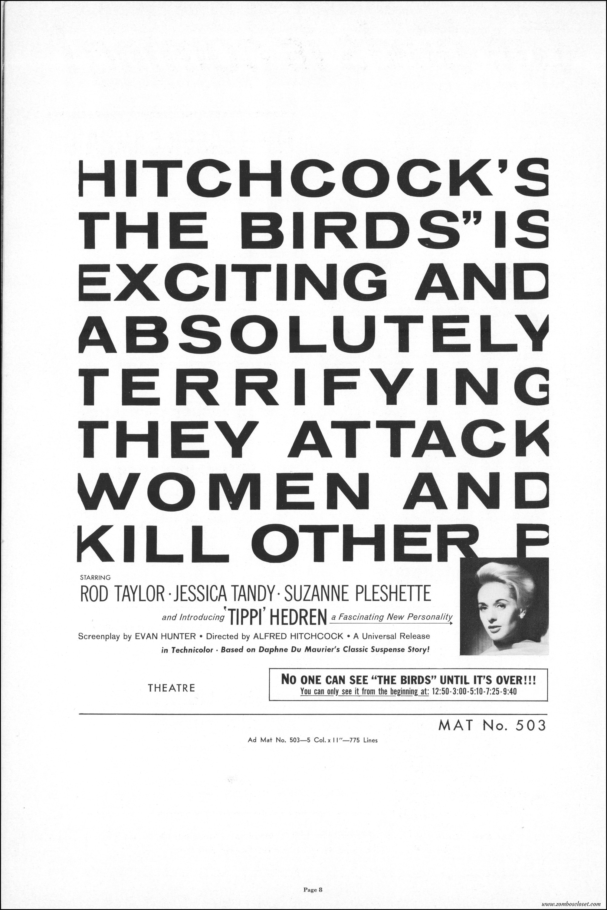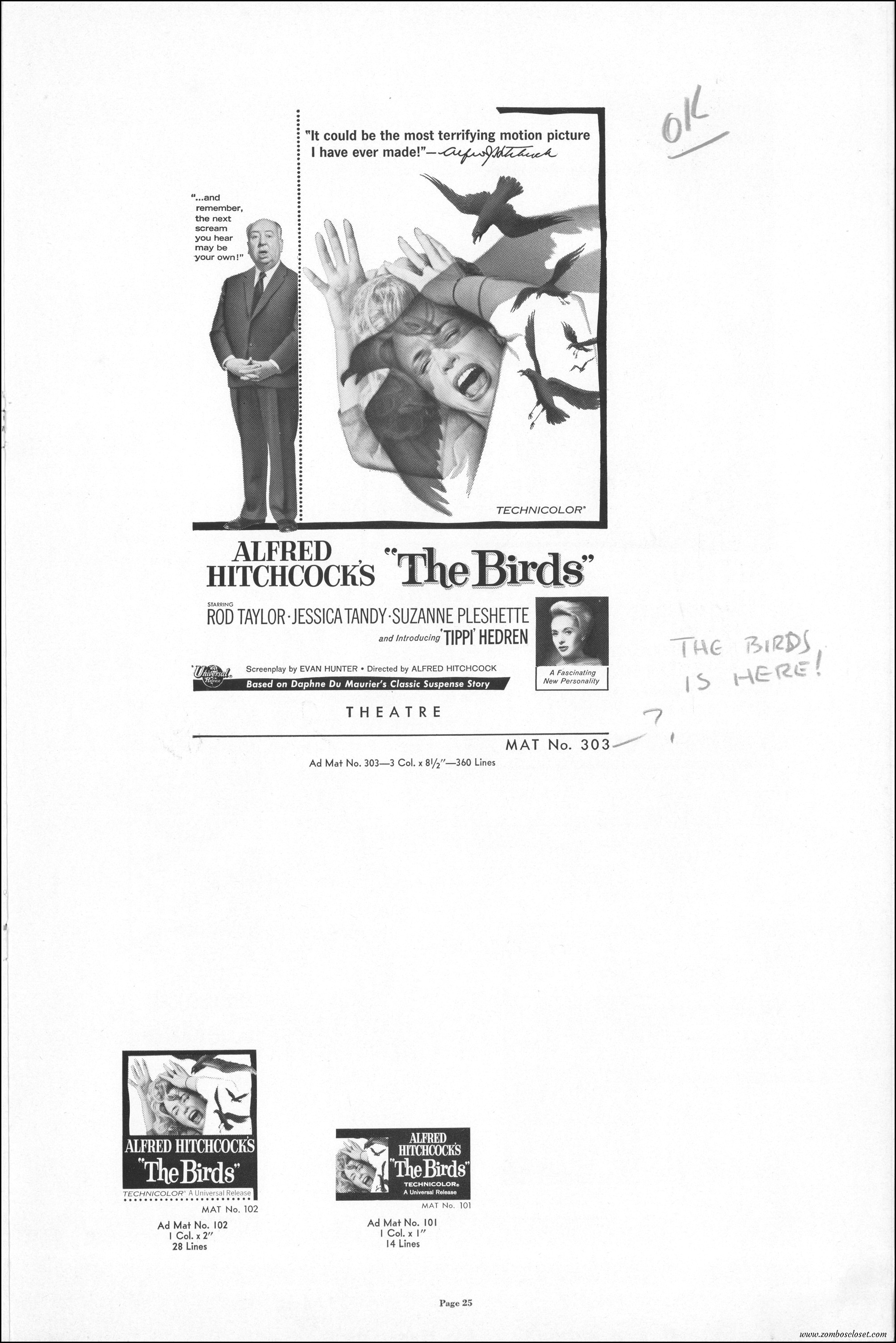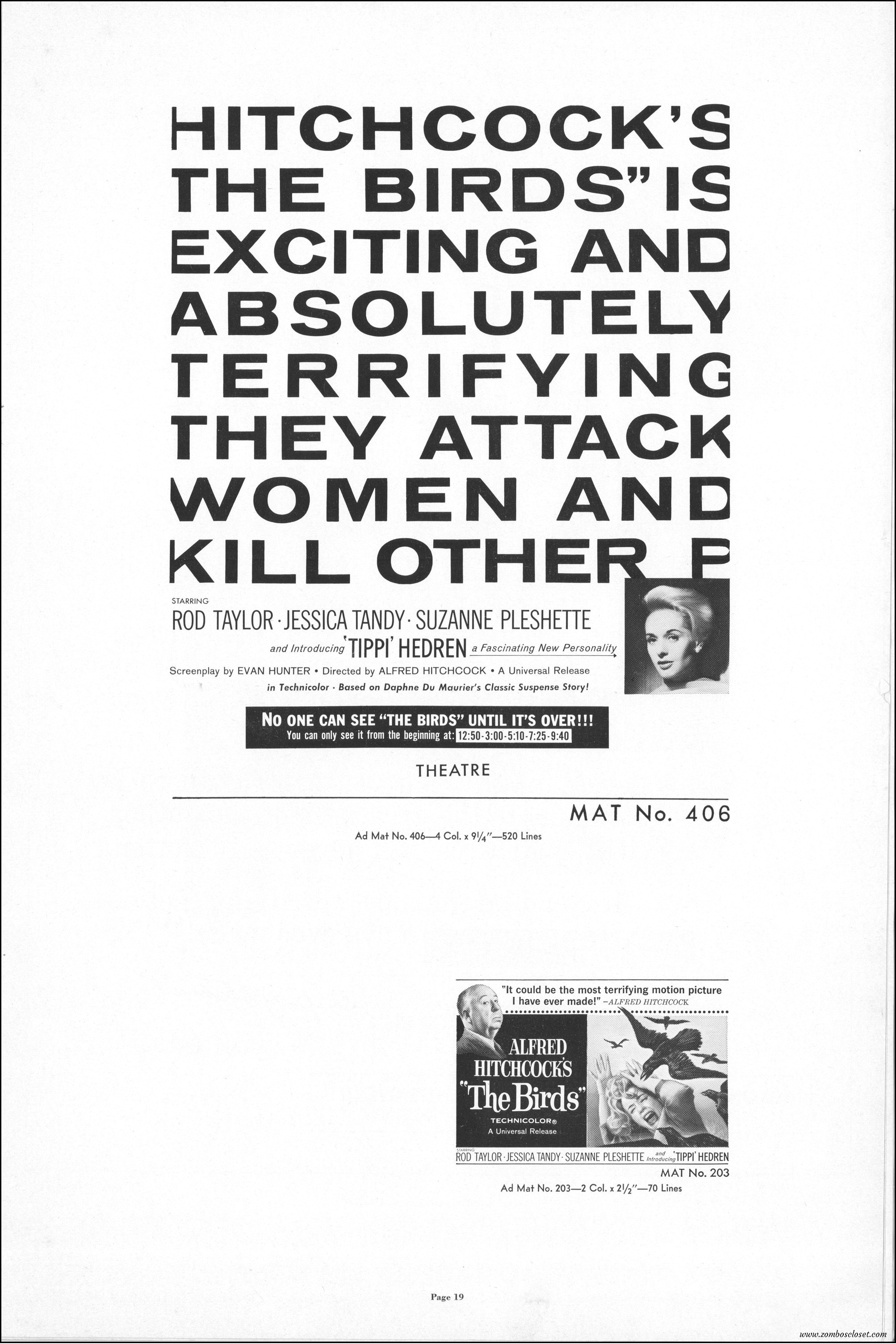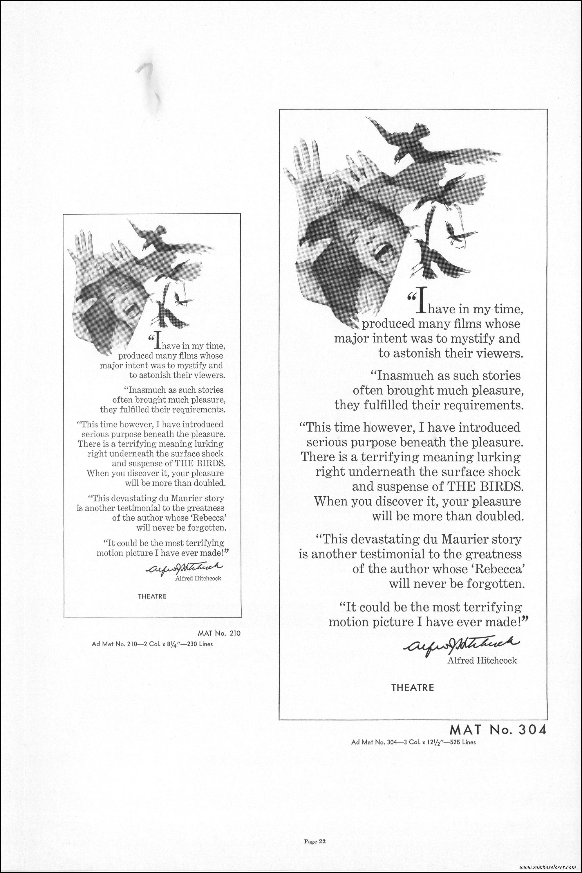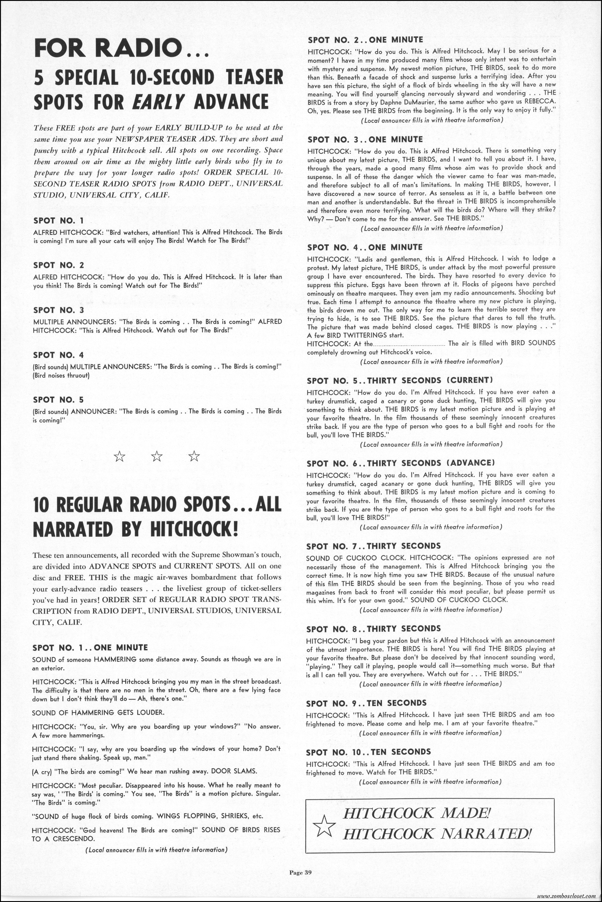 Hitchcock had mentioned the birds rise up against humans because they are fed up with us. Given how badly we’ve messed up the planet, I’m expecting The Birds to become a reality any day now. Much of nature seems to be gunning for us these days. Back in the the 1970s there were a slew of movies depicting how mother nature turned into a mean bitch. From Frogs to Long Weekend to Soylent Green, we’ve been told this story again and again. But Hitchcock makes it pretty terrifying indeed. This 40-plus page pressbook for The Birds is a showman’s dream. Like William Castle, Alfred Hitchcock liked to play pitchman to his movies, and appeared to have fun doing so. The 6 foot standee of Hitchcock in a bird cage is awesome. Now my life won’t be complete until I find one.
