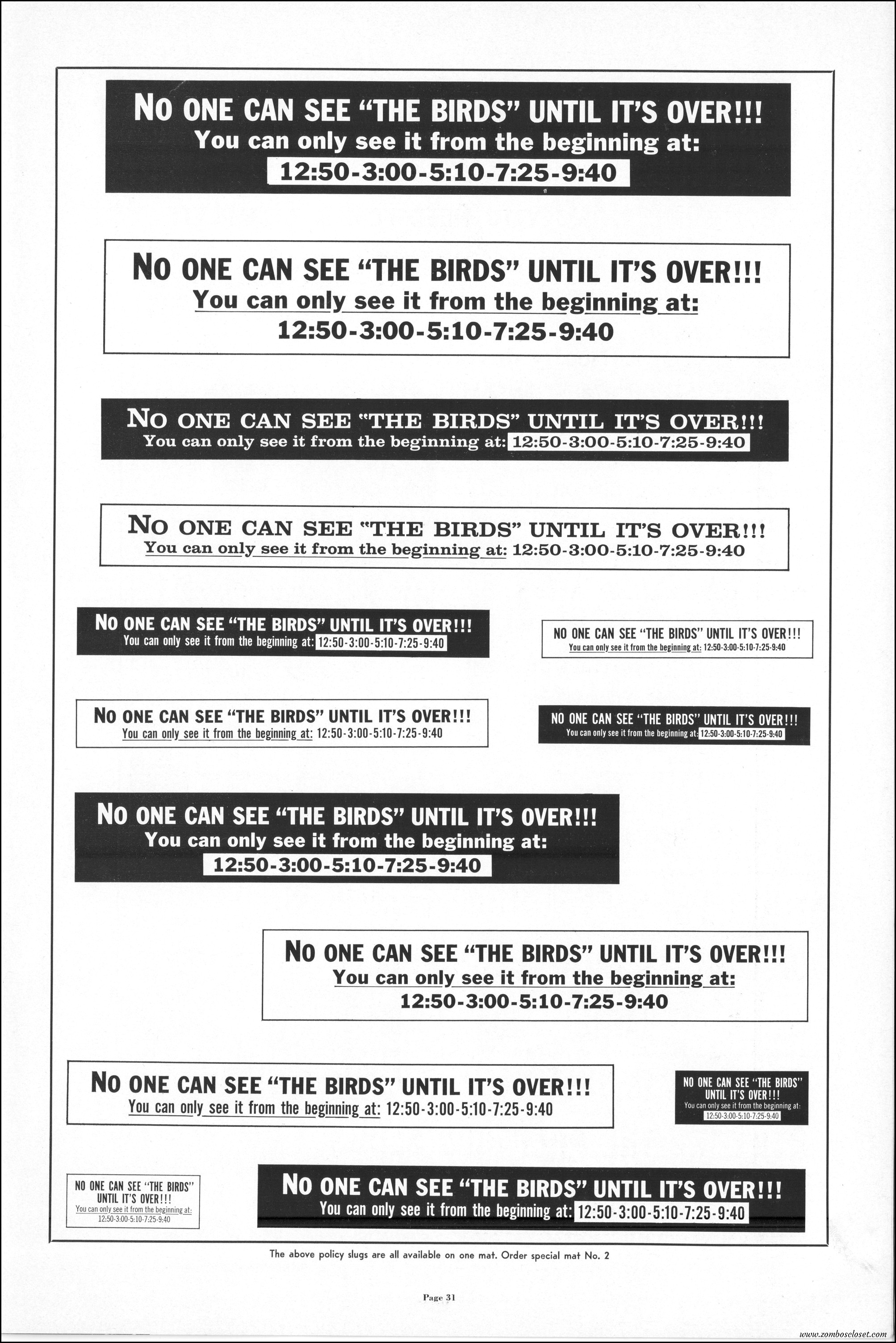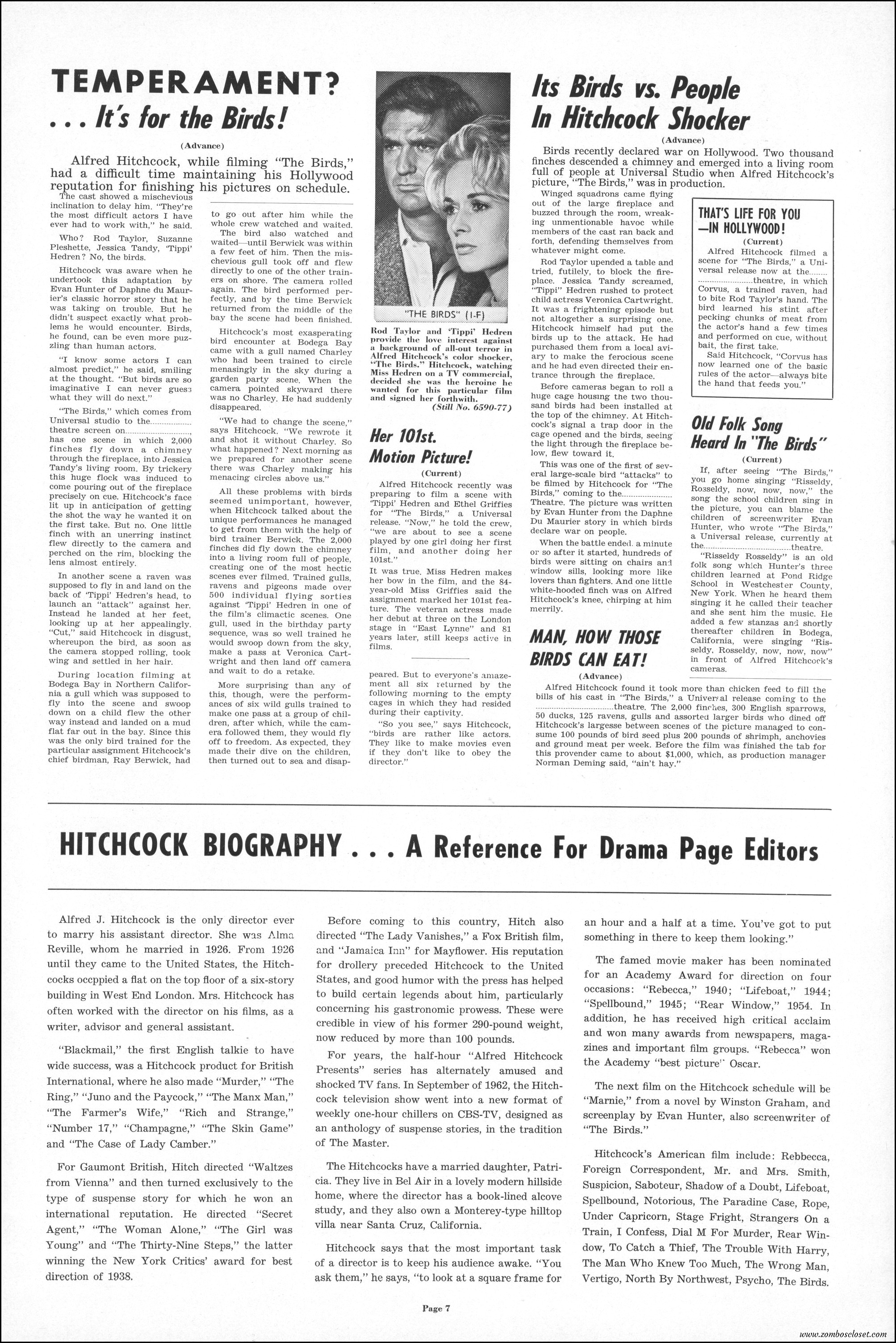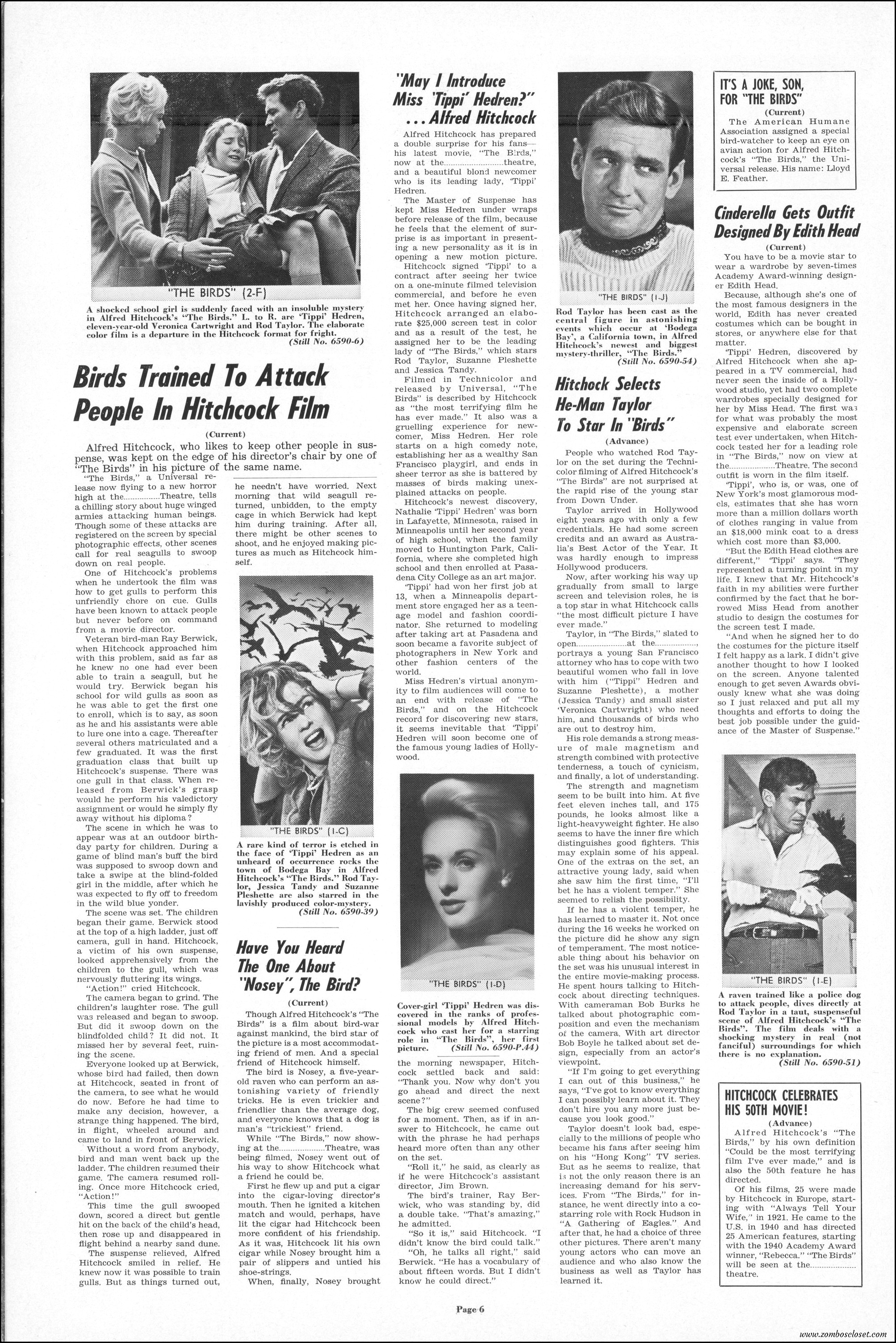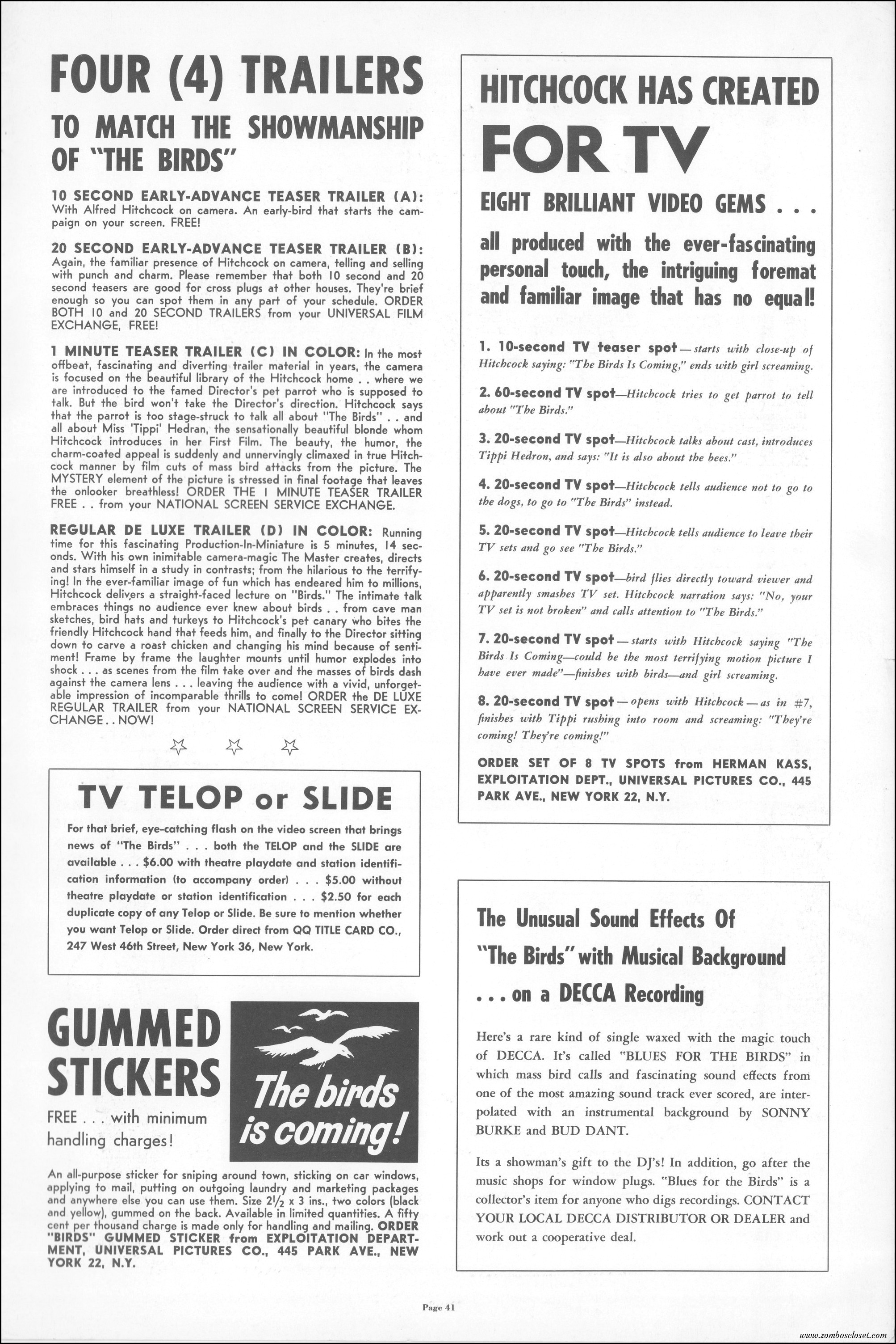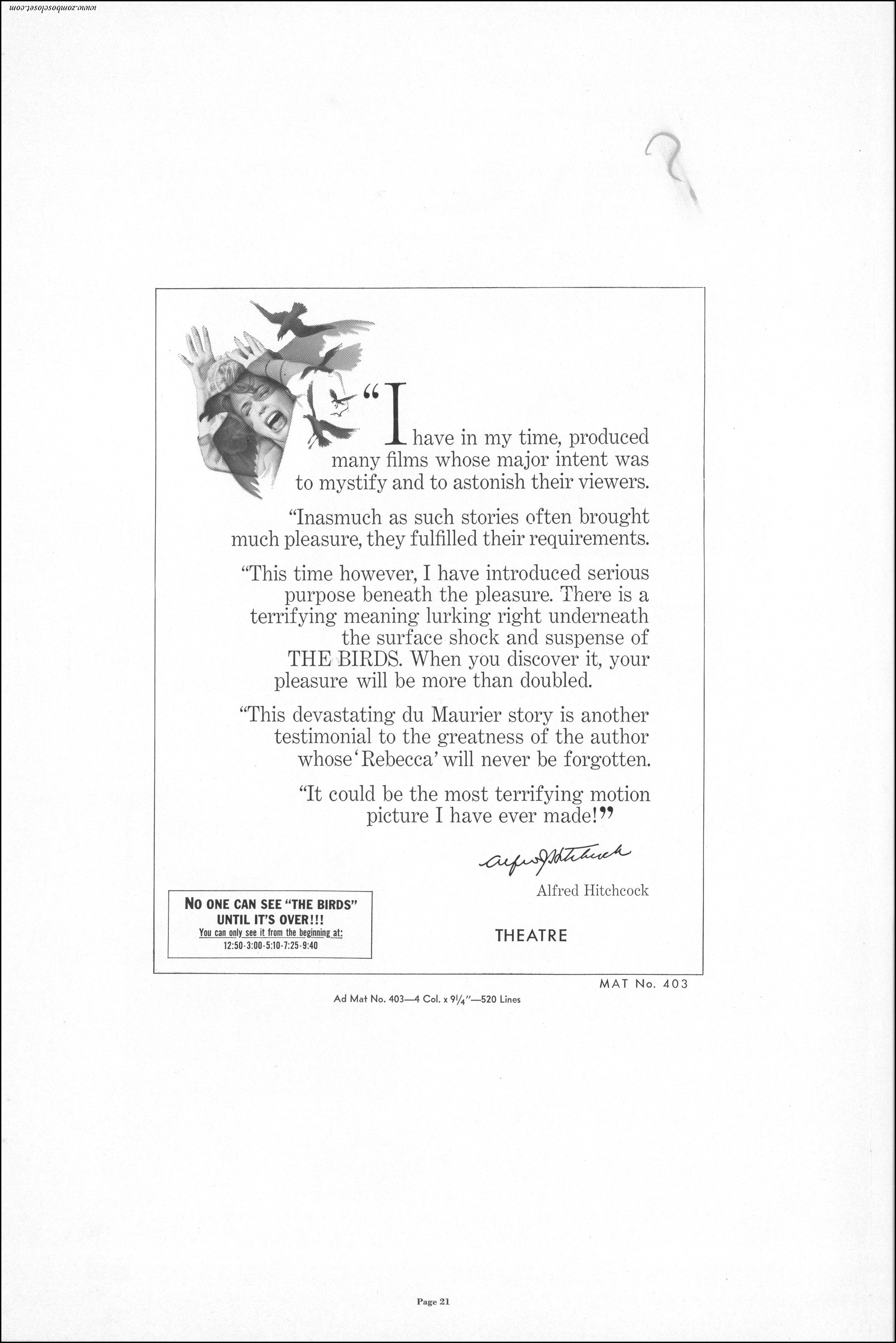 Hitchcock had mentioned the birds rise up against humans because they are fed up with us. Given how badly we’ve messed up the planet, I’m expecting The Birds to become a reality any day now. Much of nature seems to be gunning for us these days. Back in the the 1970s there were a slew of movies depicting how mother nature turned into a mean bitch. From Frogs to Long Weekend to Soylent Green, we’ve been told this story again and again. But Hitchcock makes it pretty terrifying indeed. This 40-plus page pressbook for The Birds is a showman’s dream. Like William Castle, Alfred Hitchcock liked to play pitchman to his movies, and appeared to have fun doing so. The 6 foot standee of Hitchcock in a bird cage is awesome. Now my life won’t be complete until I find one.