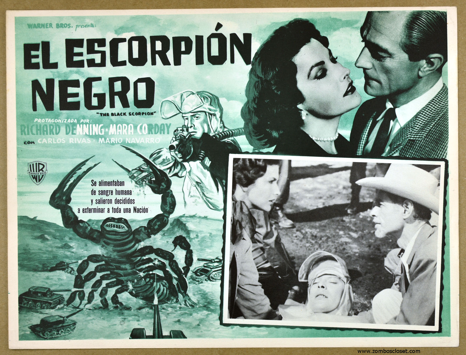 I always find it interesting to see lobby cards that stress a romantic angle for a horror movie. It seems so contrary to the selling point of the movie, which would be terror, scares, or jeers (depending on the quality). Of course, you don't see much romance at all today in horror cinema, but in the 1950s and 1960s it was either the monster wanted the girl or the hero wanted the girl, or the monster just wanted to eat both of them and be done with it. So on this Mexican lobby card for The Black Scorpion, we get a back-grounded monster and some military action, but a lot of romance up front. Go figure. On the plus side, the stop motion work was supervised by Willis O'Brien and Richard Denning is the hero. I like Richard Denning.