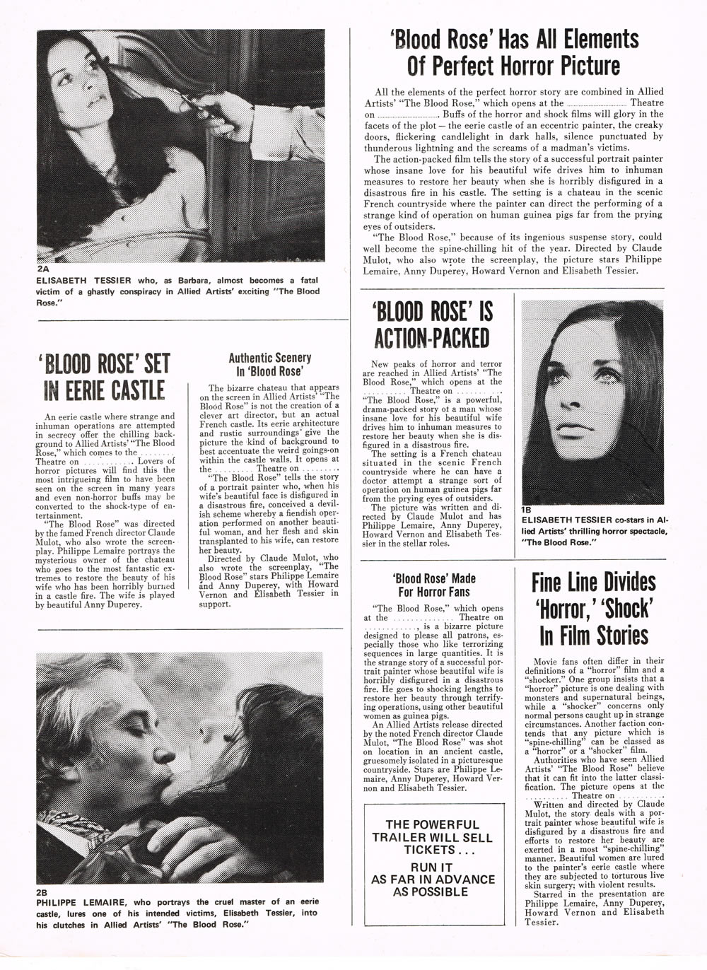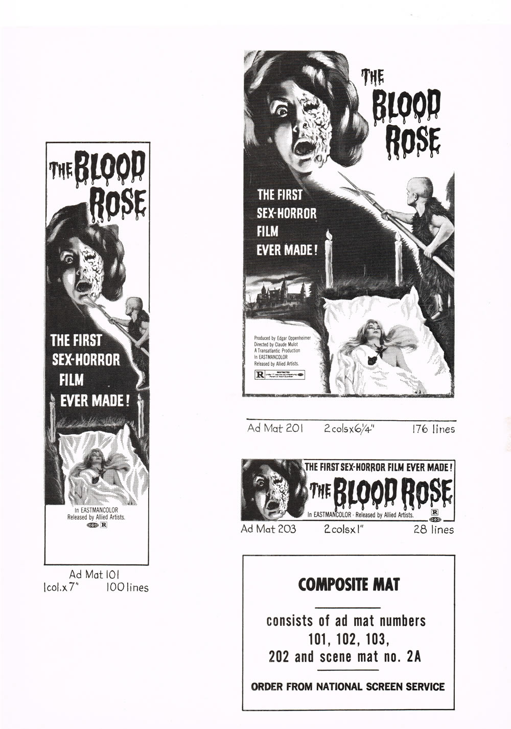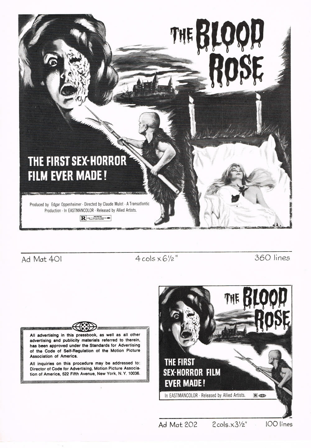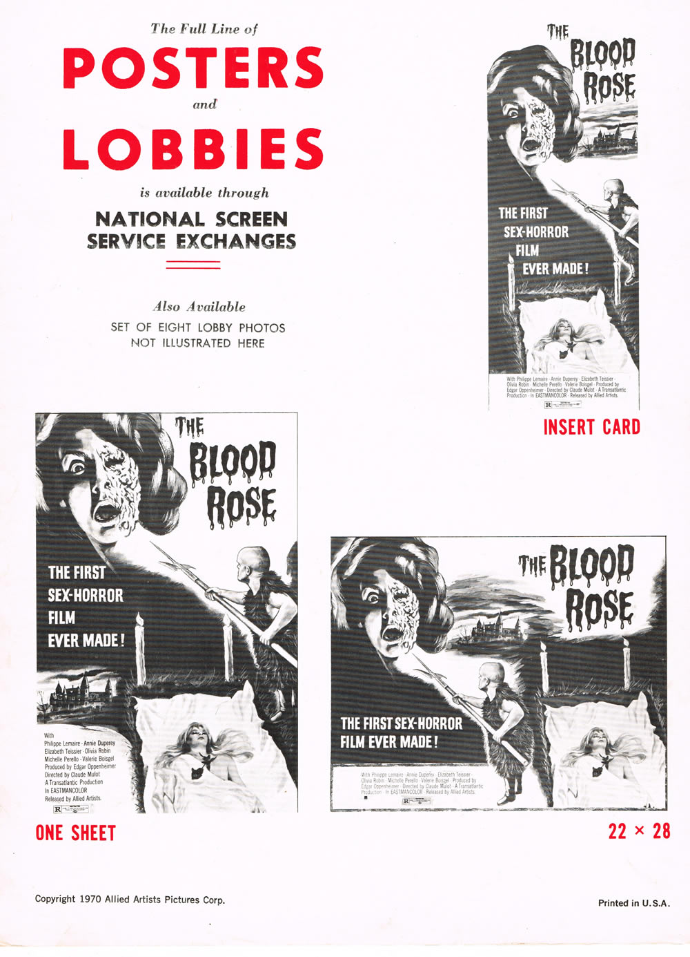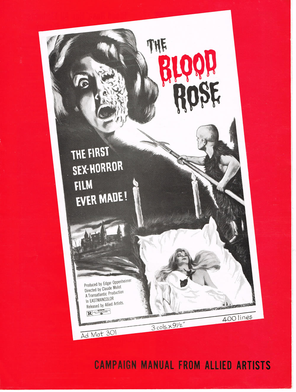 Don’t laugh, this 1970 “first sex-horror” movie (La Rose Ecorchee) has a 6 rating on IMDb. So there. The pressbook is a 6 page foldout, 9 x 12 inches in size. Pretty much the same size as that furry dwarf with the menacing spear.