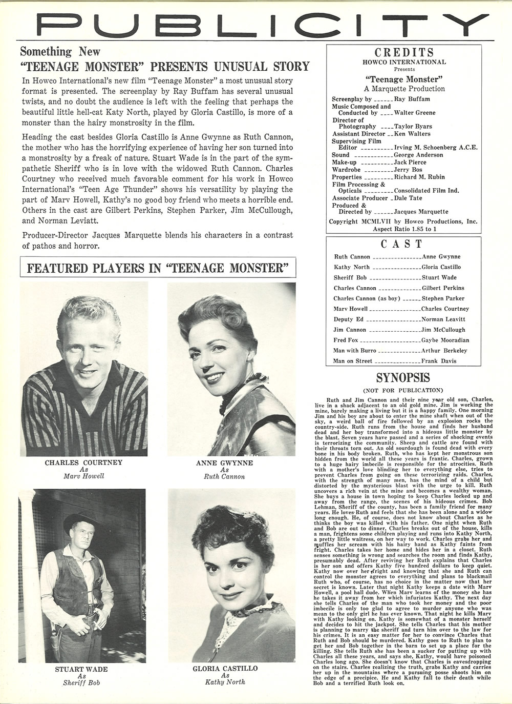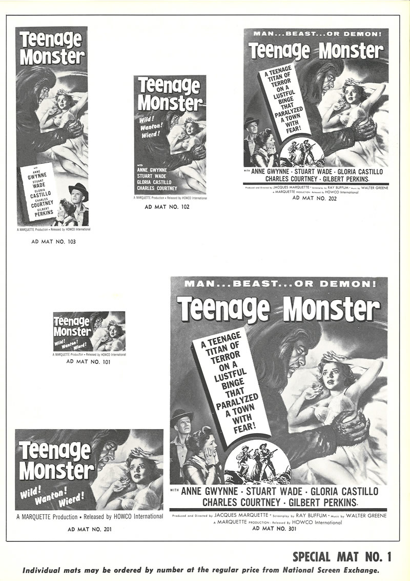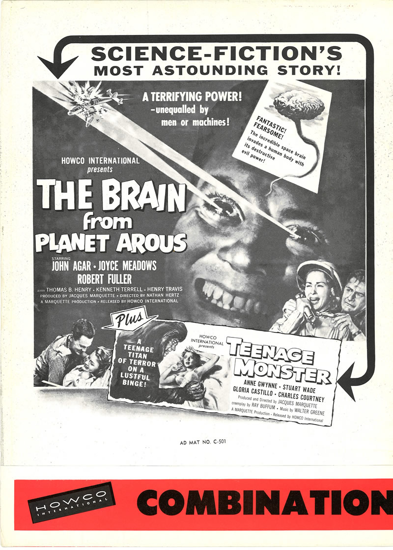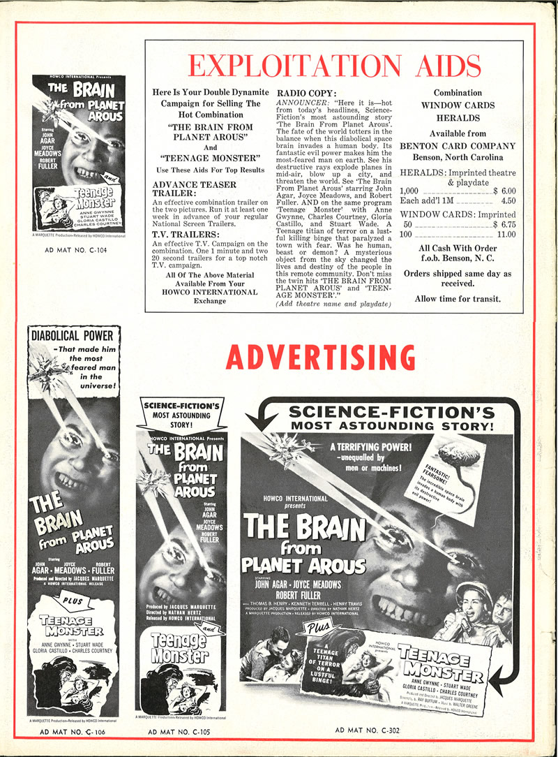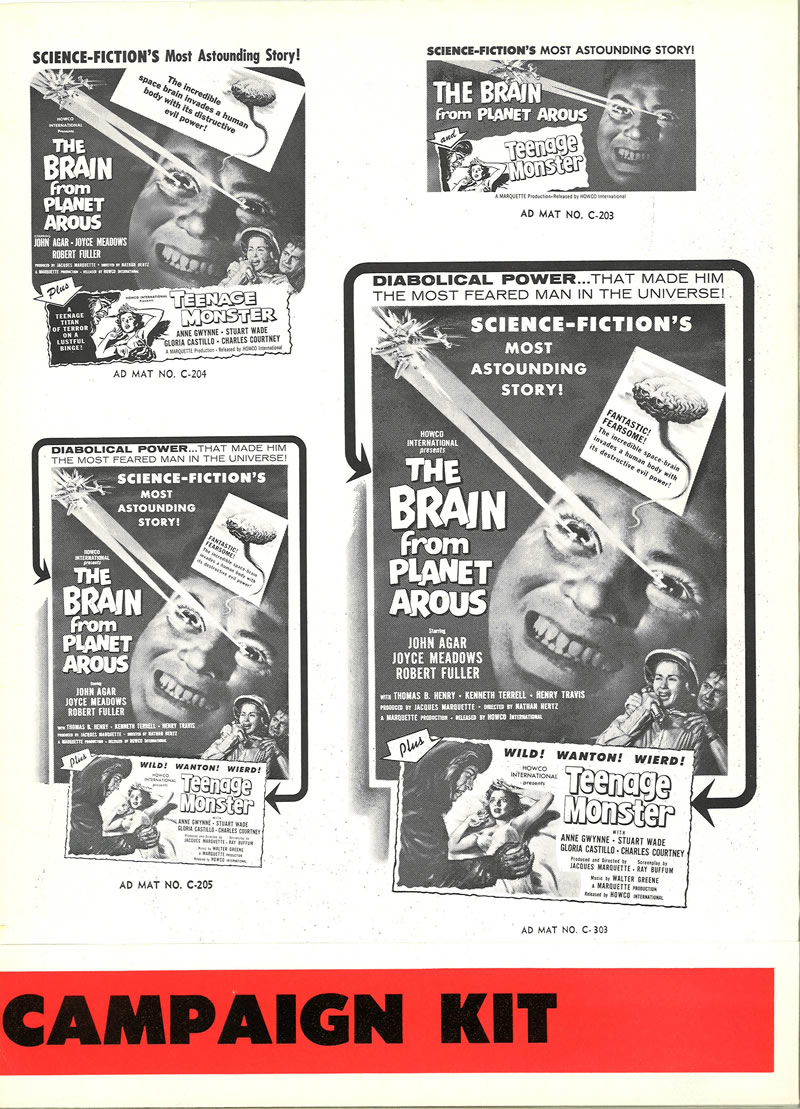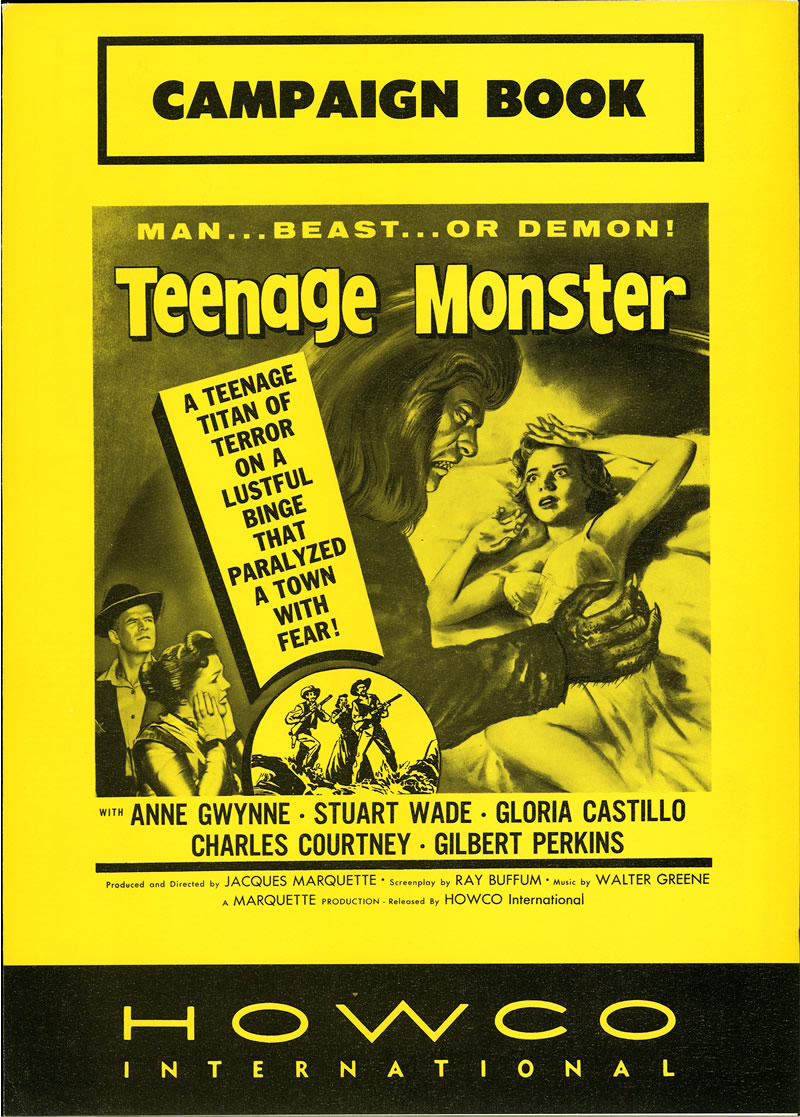 The Howco International Campaign Kits are wonderful examples of high class print marketing for low class movies (hey, I still love them). These folder-styled pressbooks, around 11" x 17" in format, are colorful and simple, but the paper quality is high and the impression of the overall presentation is impeccable, especially when you consider they were targeted to drive-in venues. The main attraction's marketing sheets–poster admats and publicity information–were placed in the left side pocket, and the second attraction's sheets were situated on the right.