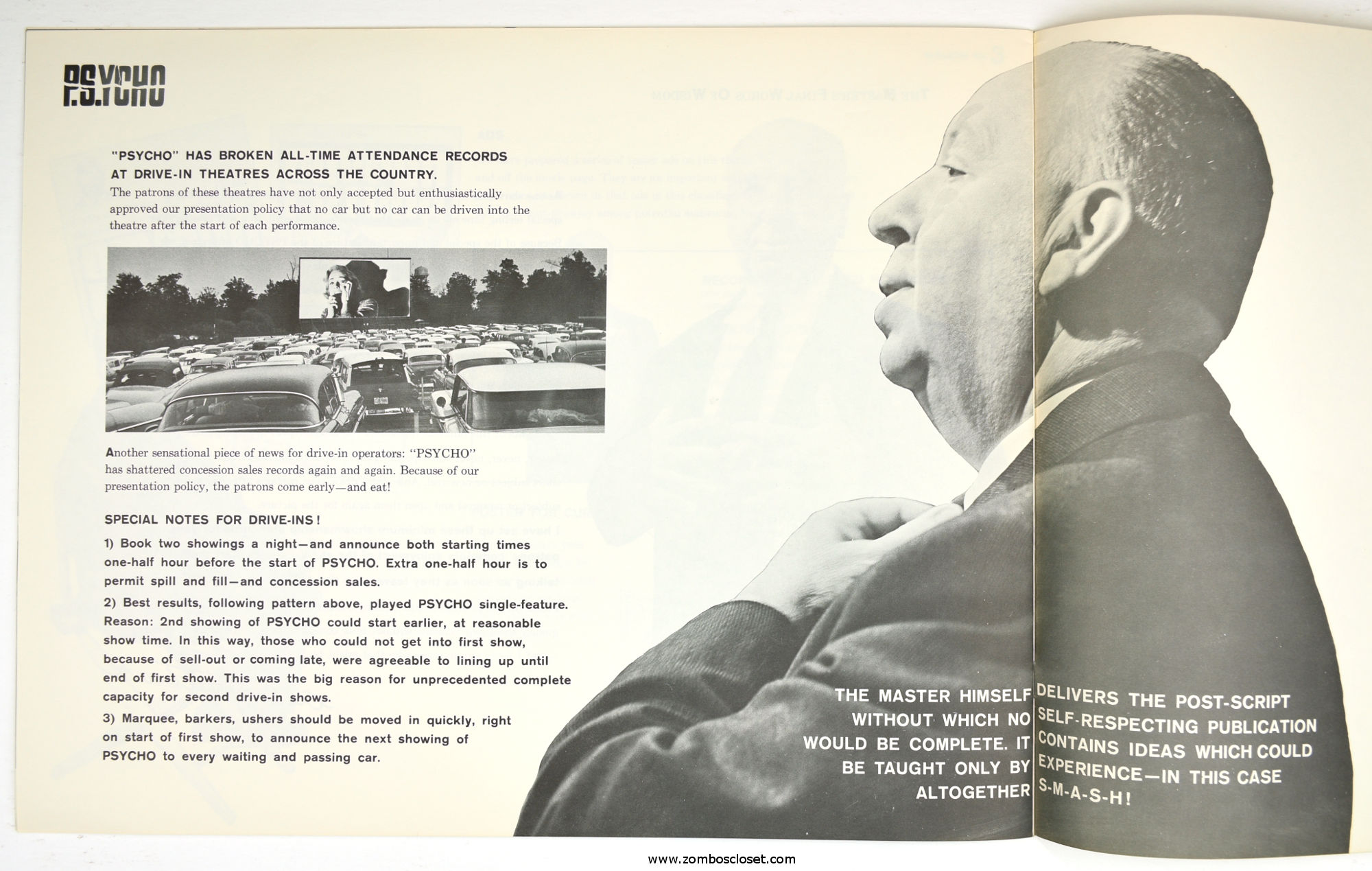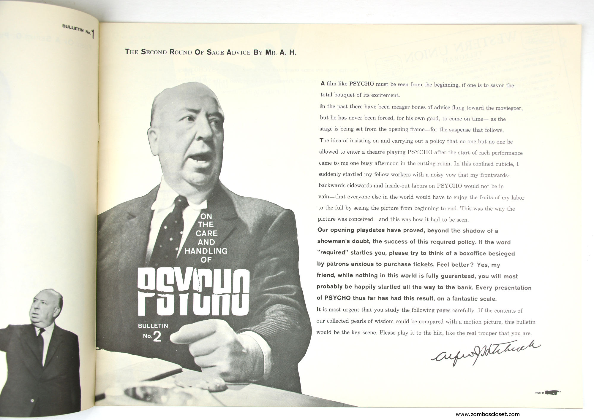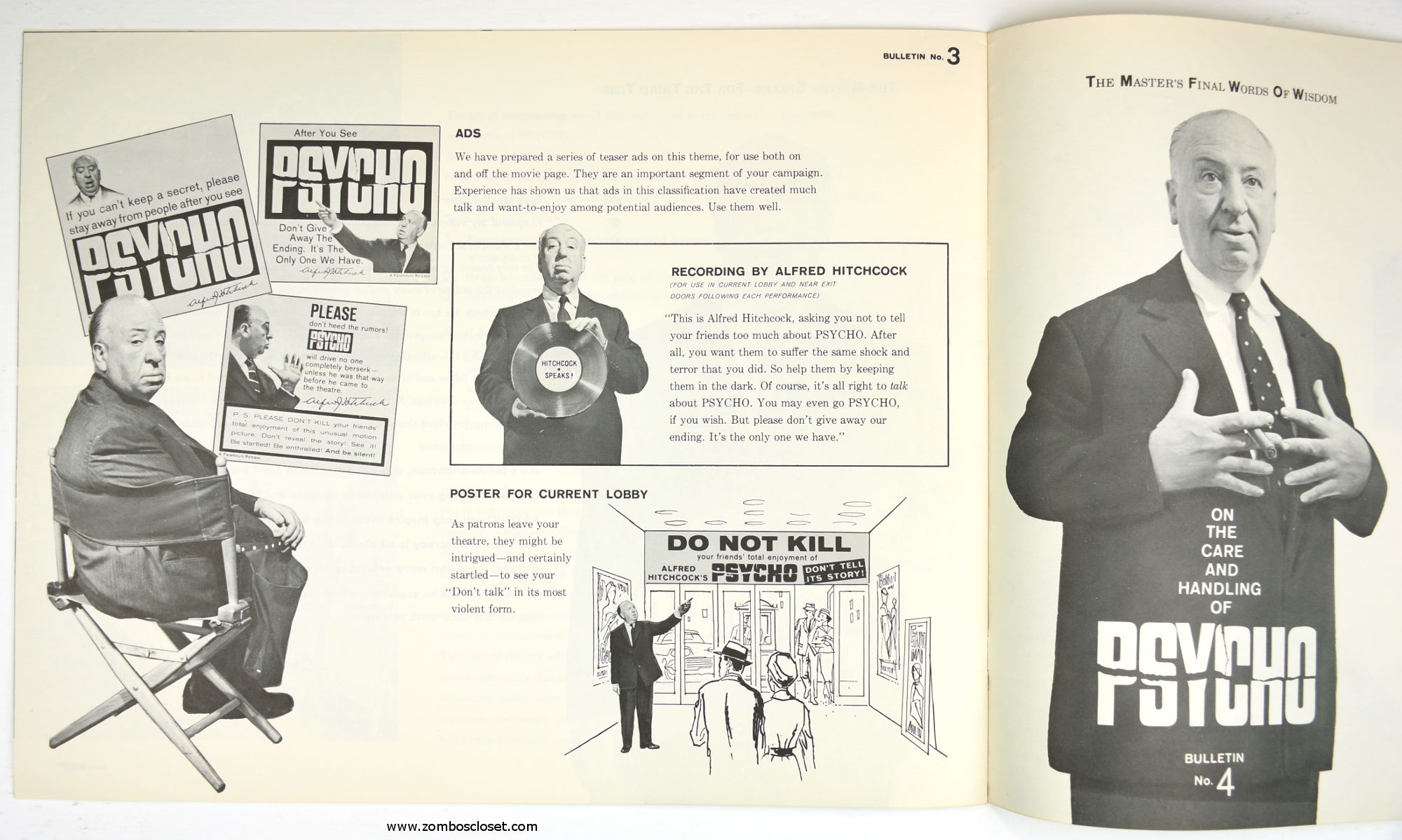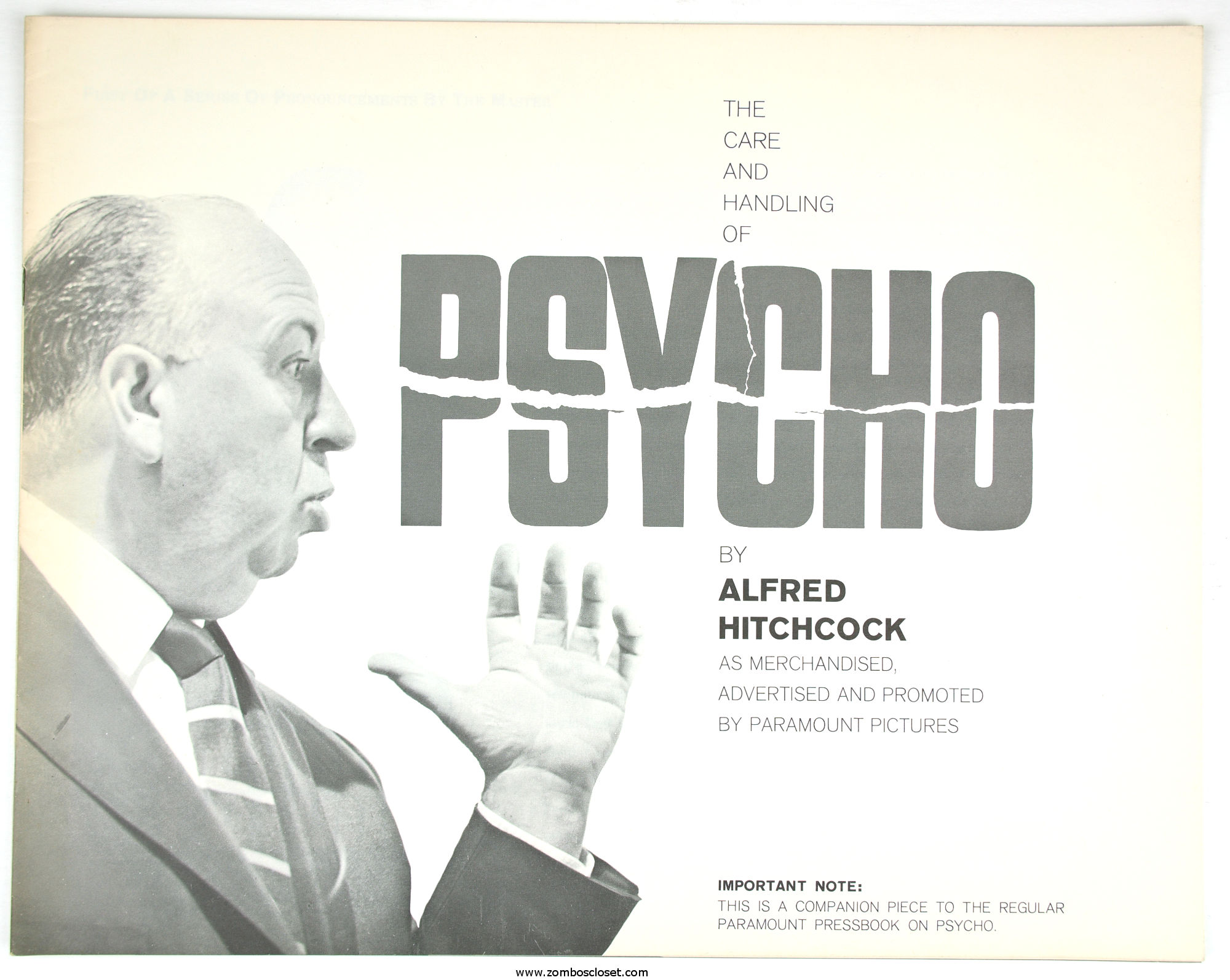 The Care and Handling of Psycho was a supplement to the regular pressbook. In this guide we can see how much William Castle's impresario and huckster driven movie promotion was embraced by Alfred Hitchcock, who also had a natural and unabashed gift for playing up the terror with his dry humor and physical presence.