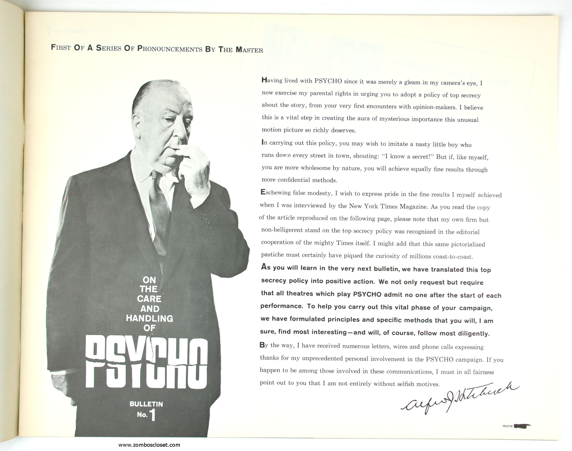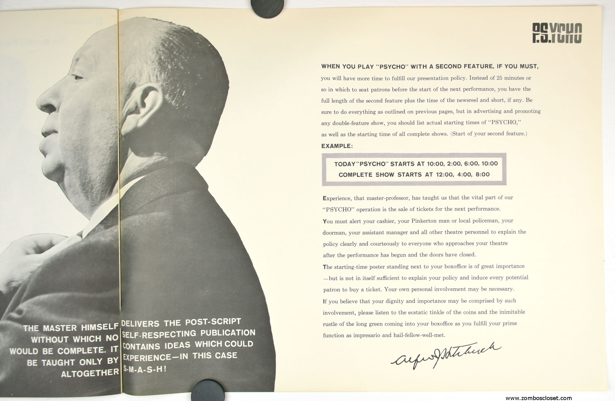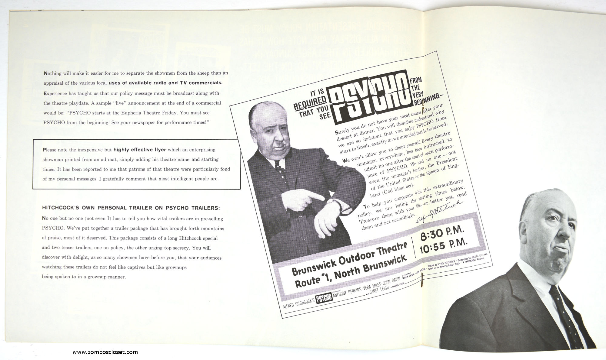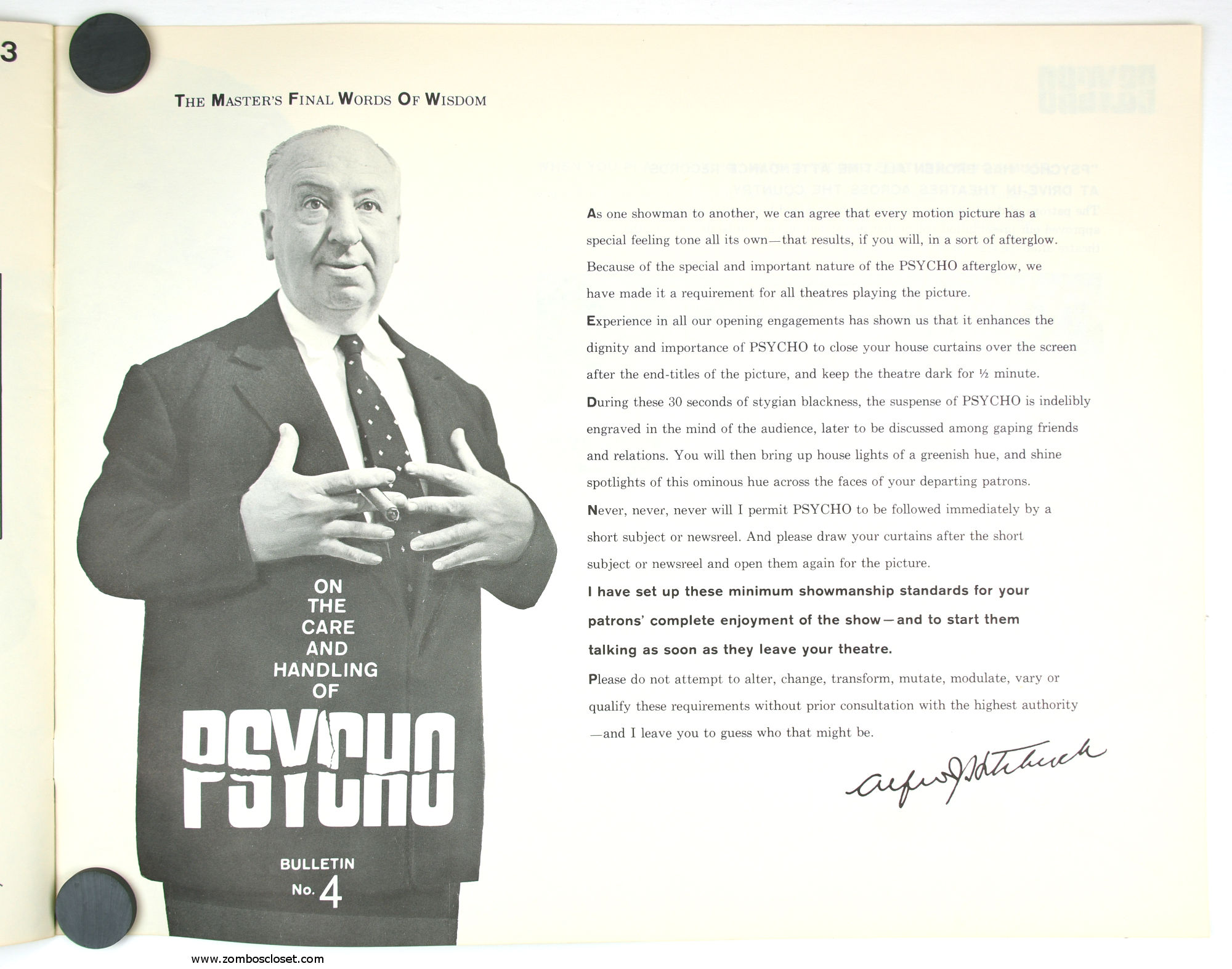 The Care and Handling of Psycho was a supplement to the regular pressbook. In this guide we can see how much William Castle's impresario and huckster driven movie promotion was embraced by Alfred Hitchcock, who also had a natural and unabashed gift for playing up the terror with his dry humor and physical presence.