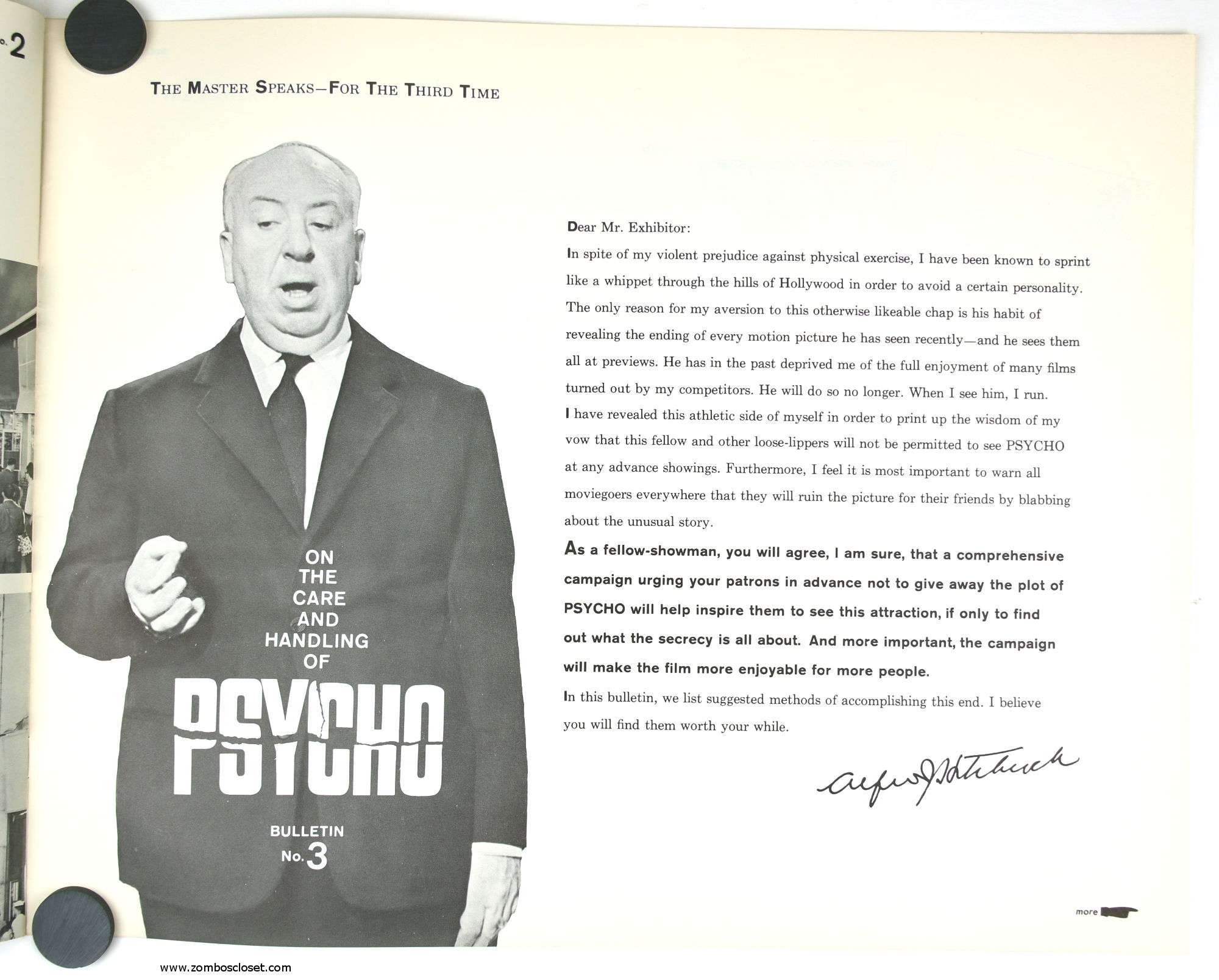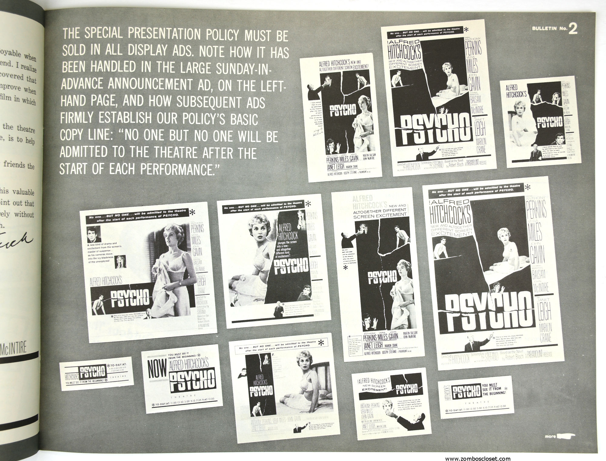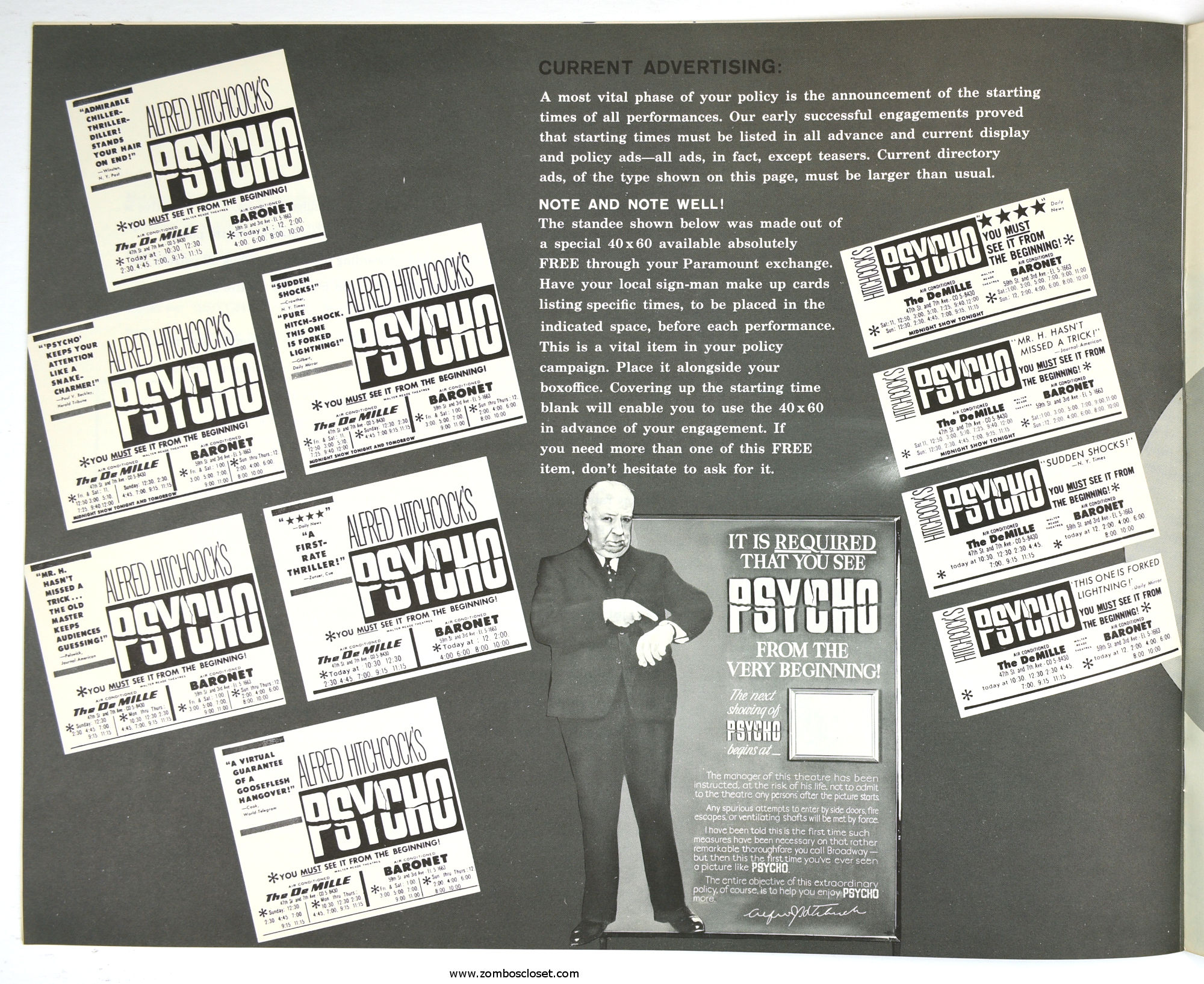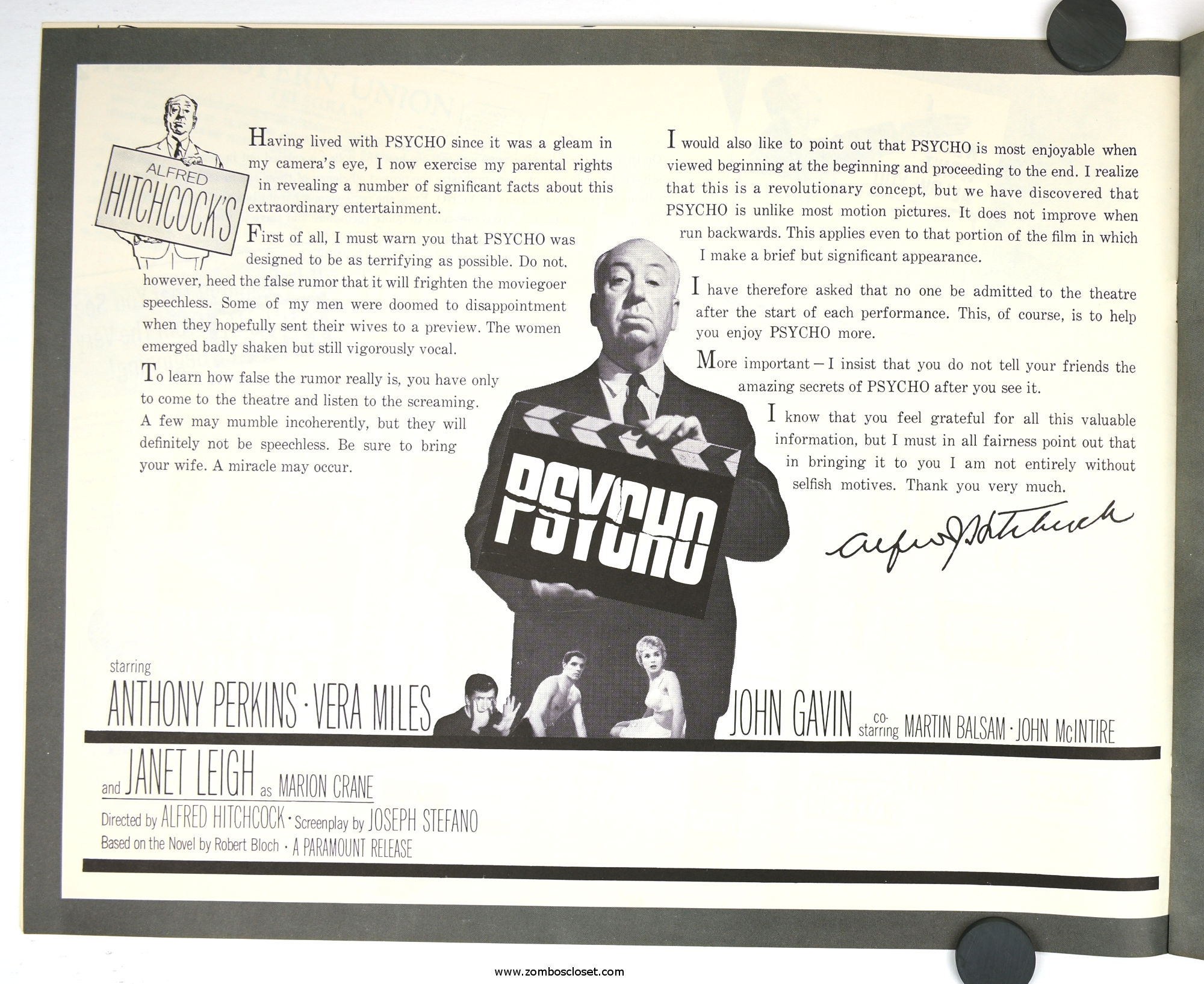 The Care and Handling of Psycho was a supplement to the regular pressbook. In this guide we can see how much William Castle's impresario and huckster driven movie promotion was embraced by Alfred Hitchcock, who also had a natural and unabashed gift for playing up the terror with his dry humor and physical presence.