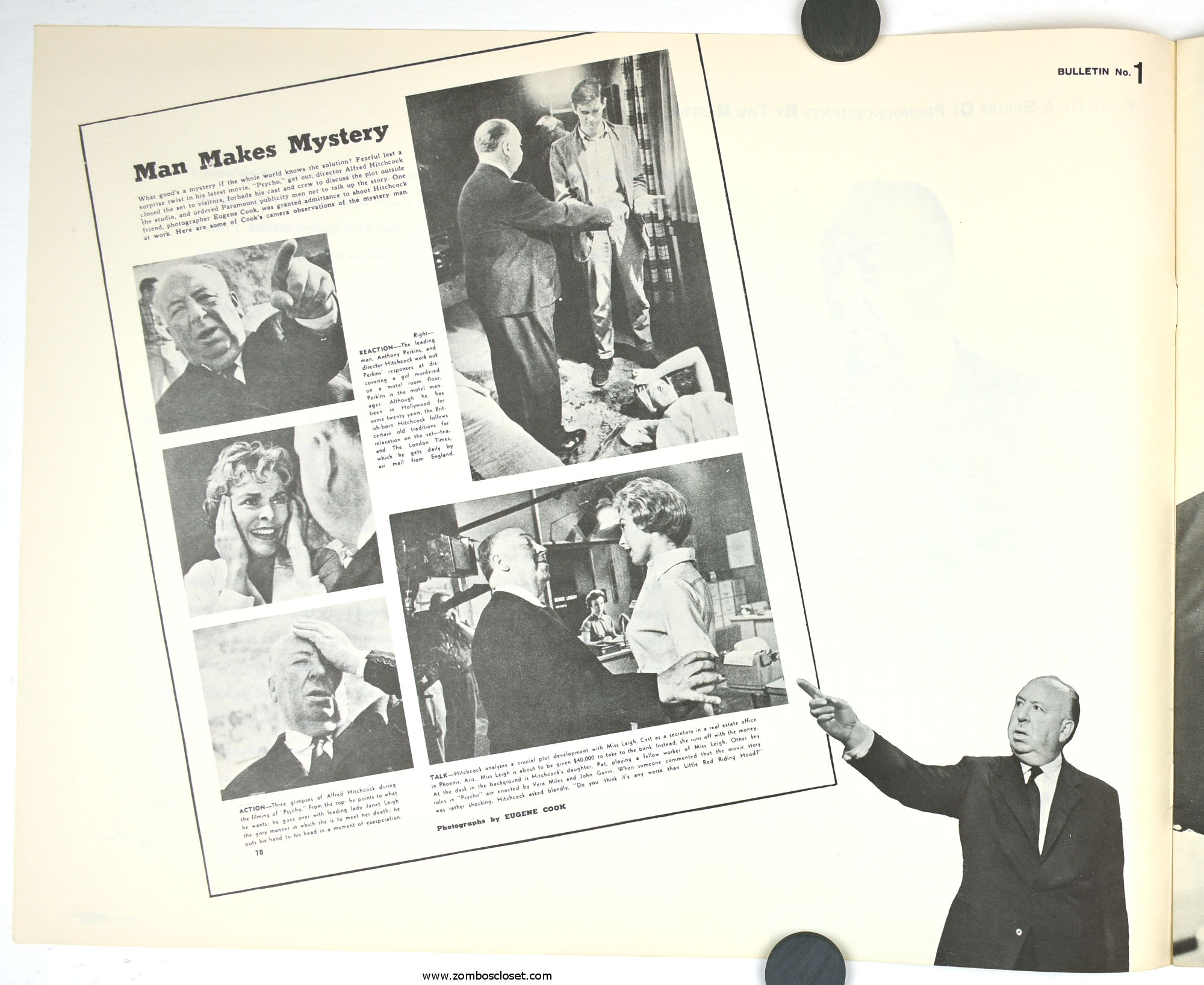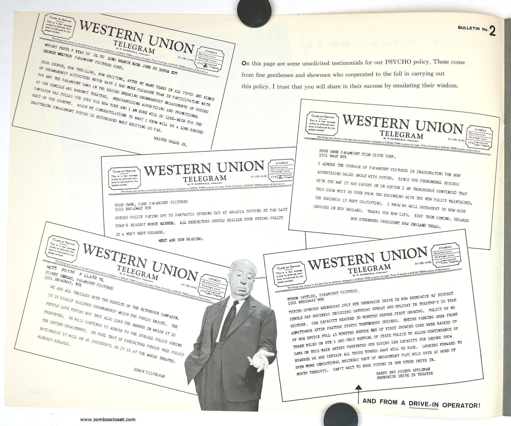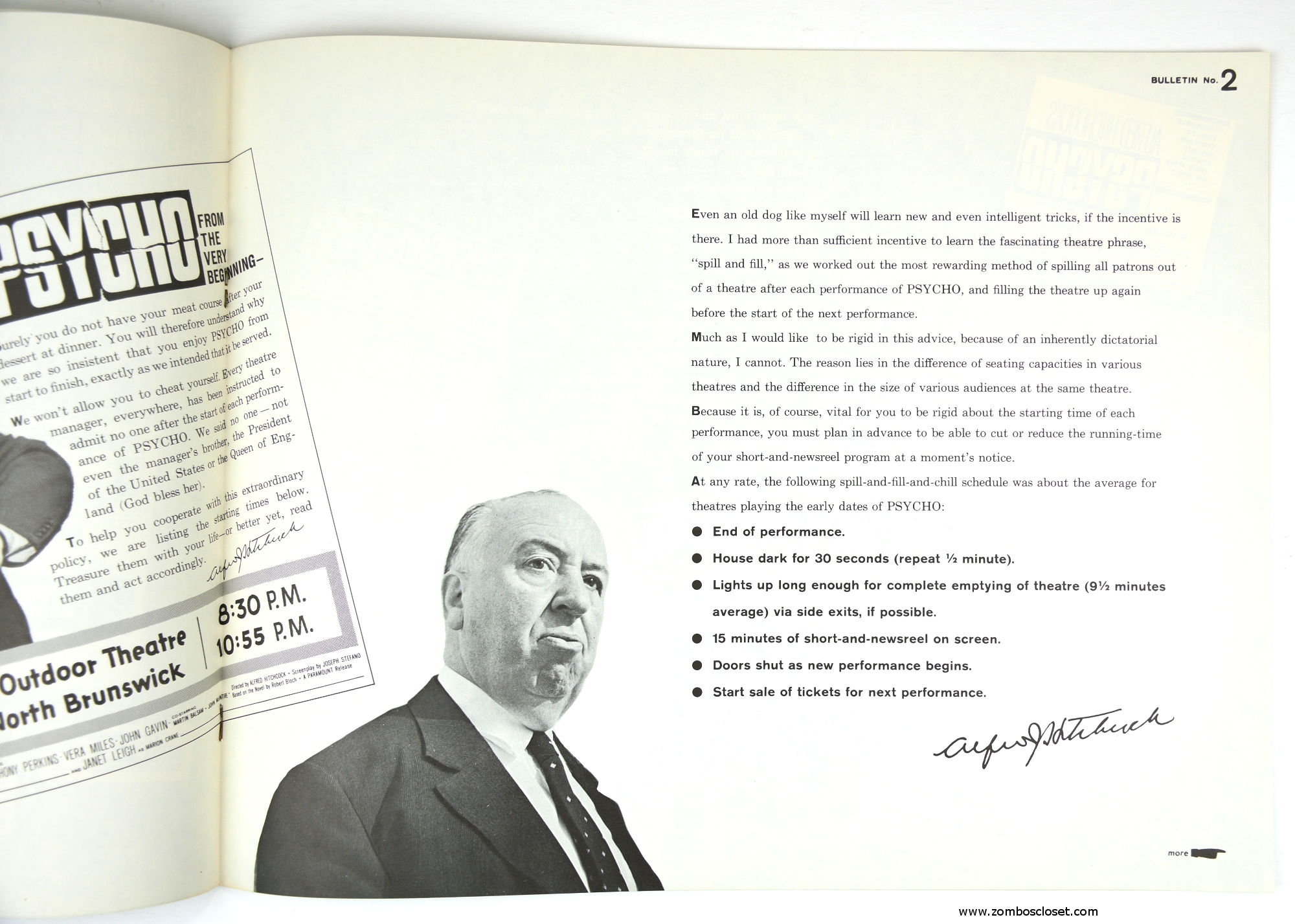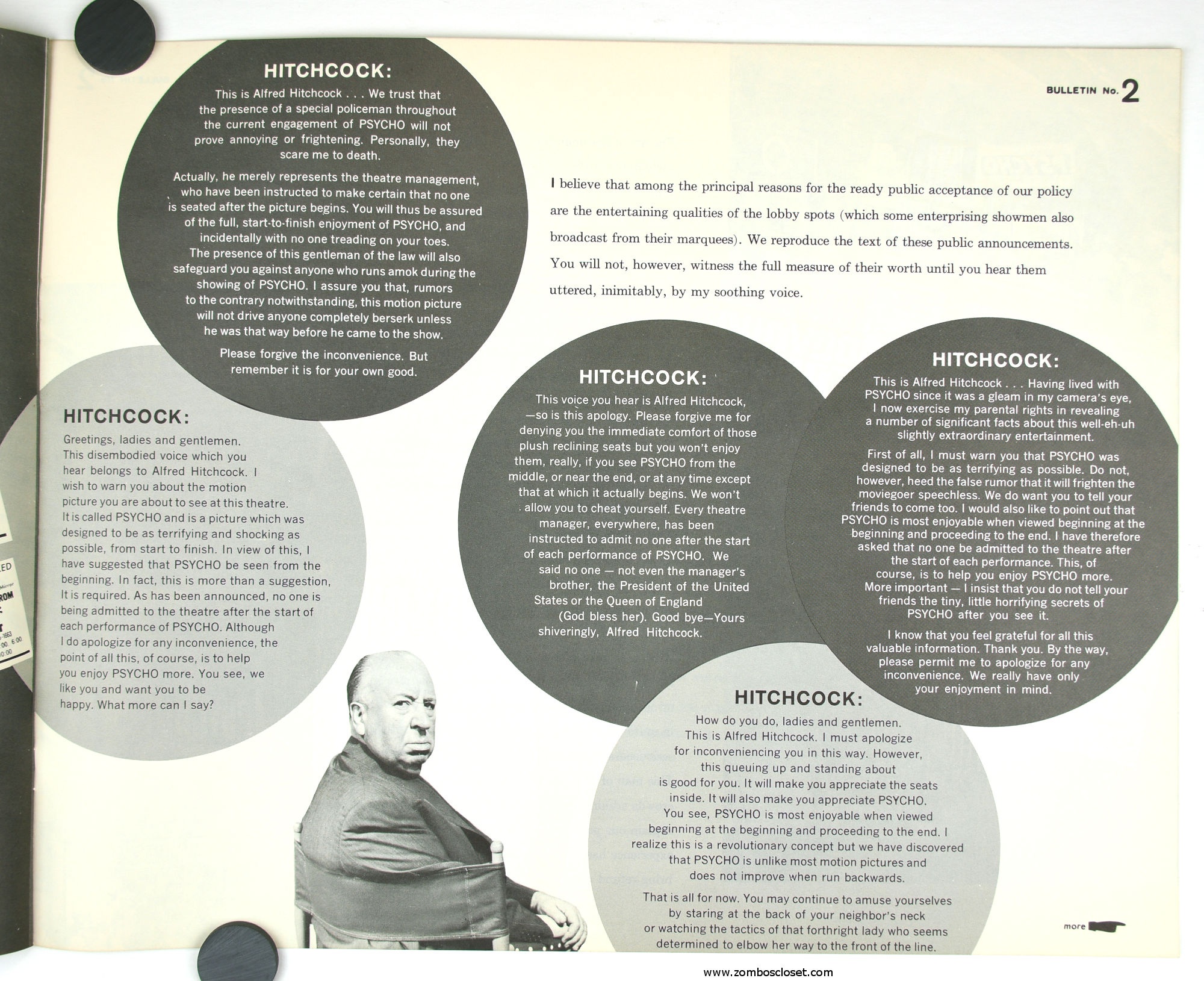 The Care and Handling of Psycho was a supplement to the regular pressbook. In this guide we can see how much William Castle's impresario and huckster driven movie promotion was embraced by Alfred Hitchcock, who also had a natural and unabashed gift for playing up the terror with his dry humor and physical presence.