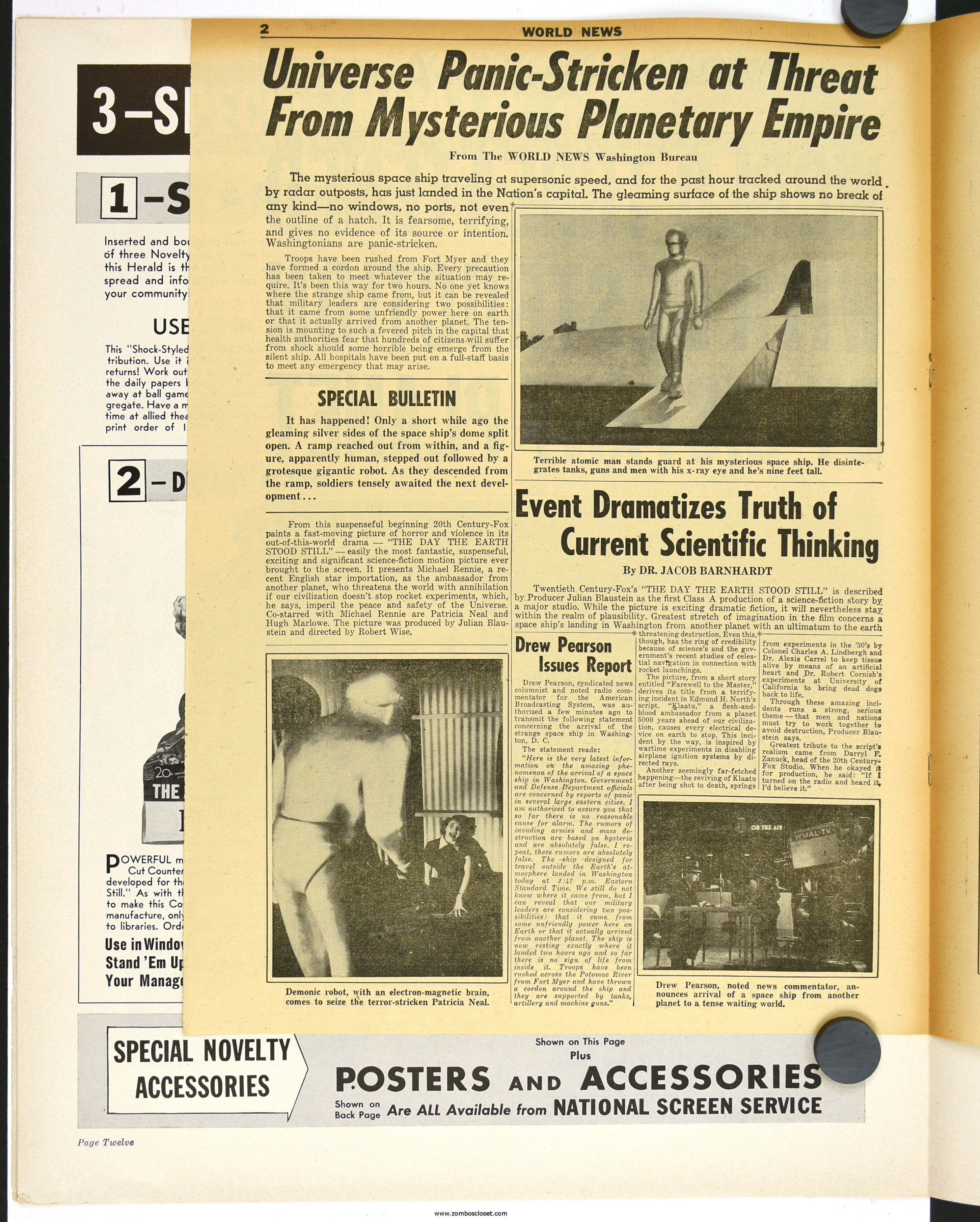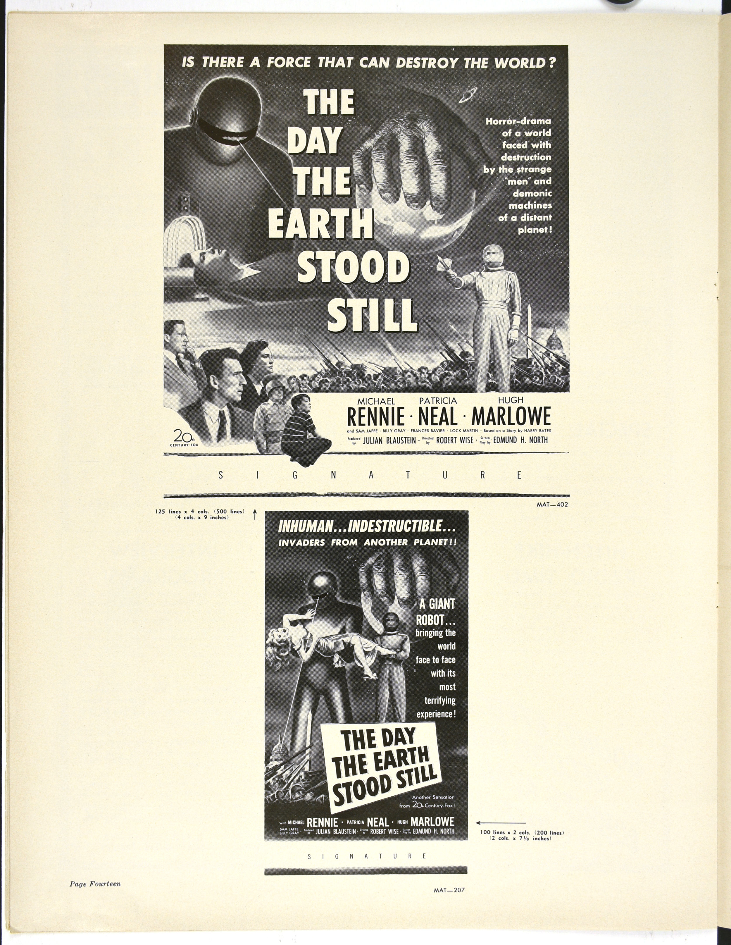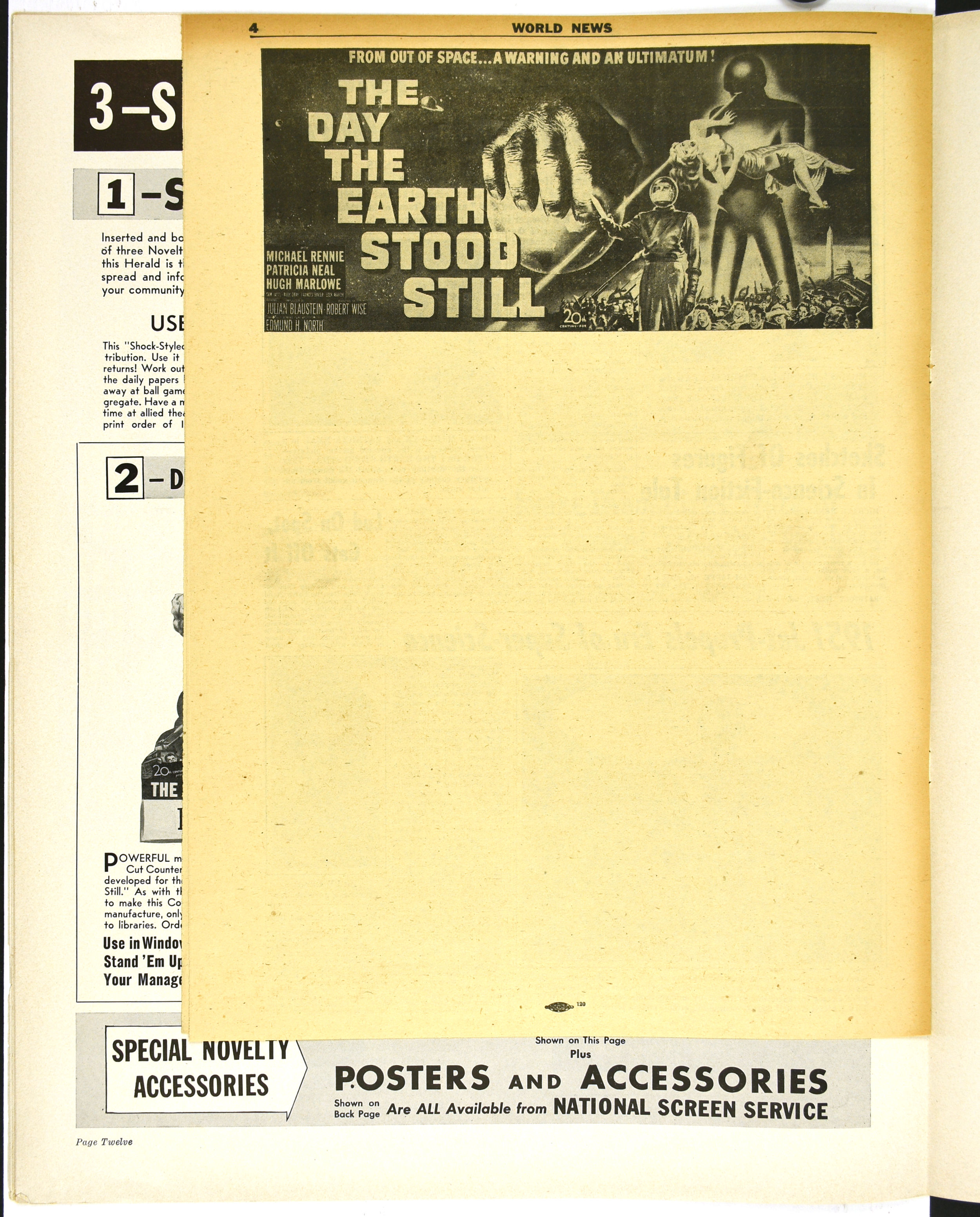 One of the more impressive classic movie pressbooks in my collection is The Day the Earth Stood Still. Large format, 24 pages, and with a newspaper-styled herald attached. A great pressbook for a great movie. Enjoy.