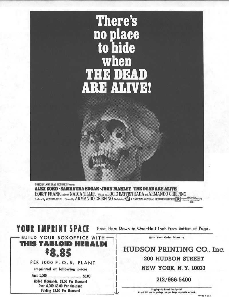 Movie Herald: The Dead Are Alive Leave a Comment / Pressbooks (Horror, Sci Fi, Fantasy) / By JM Cozzoli Here's 1972's The Dead are Alive herald theater giveaway to promote the movie; one sheet folded to create four pages. The Italian movie title is L'etrusco uccide ancora. Like this:Like Loading... Share this post Facebook Twitter Pinterest Linkedin