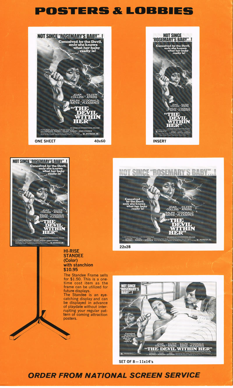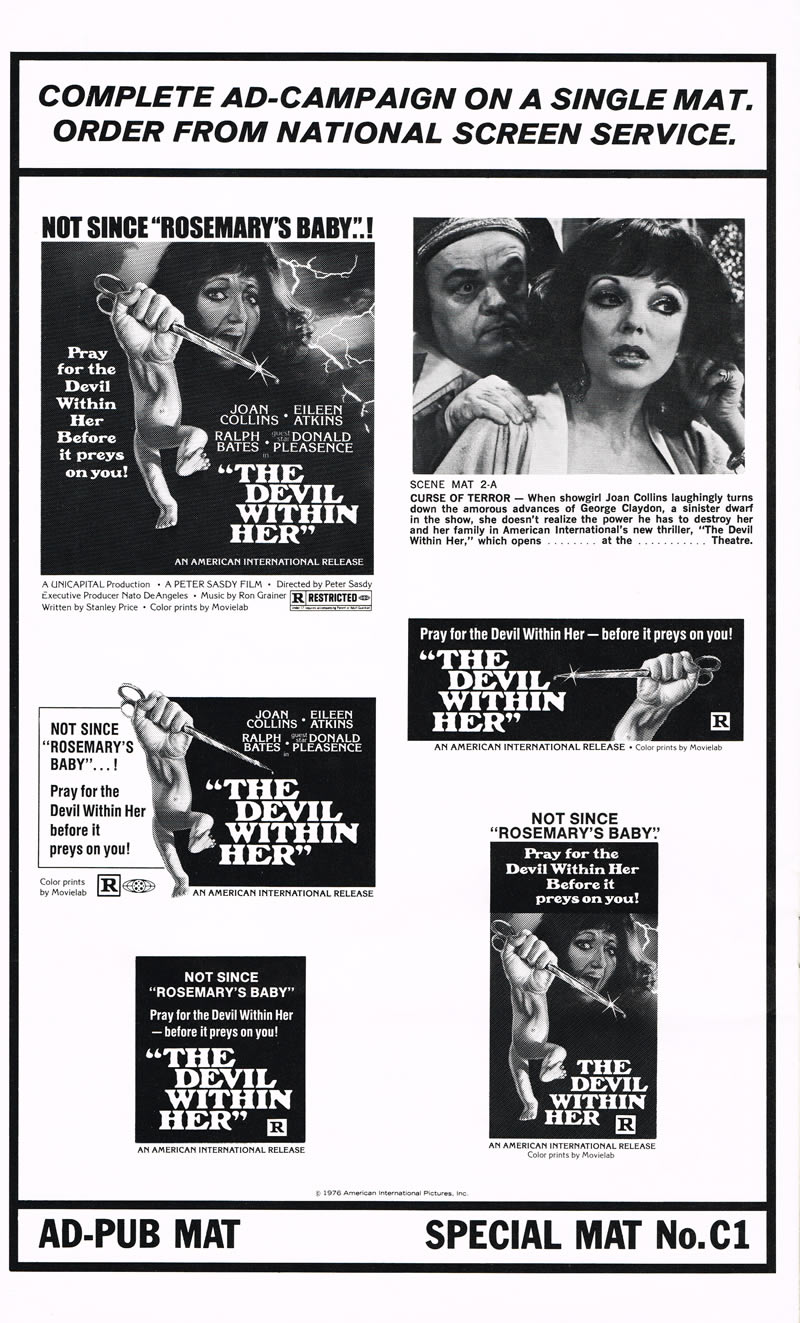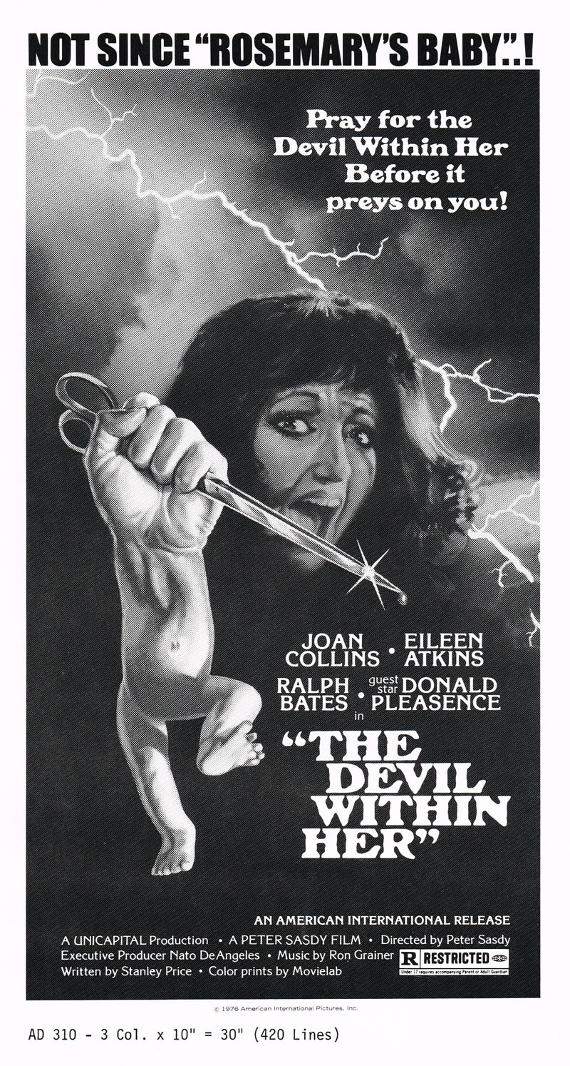 Movie Pressbook: The Devil Within Her (1975) Leave a Comment / Pressbooks (Horror, Sci Fi, Fantasy) / By JM Cozzoli This one has my vote for silliest poster artwork in a horror movie. The Devil Within Her movie itself has some unintended, but very silly moments. Joan Collins is a trooper for sure. Like this:Like Loading... Share this post Facebook Twitter Pinterest Linkedin