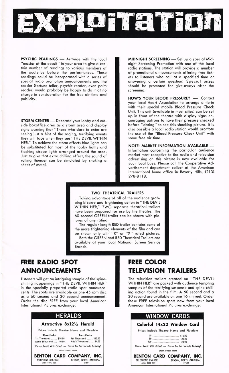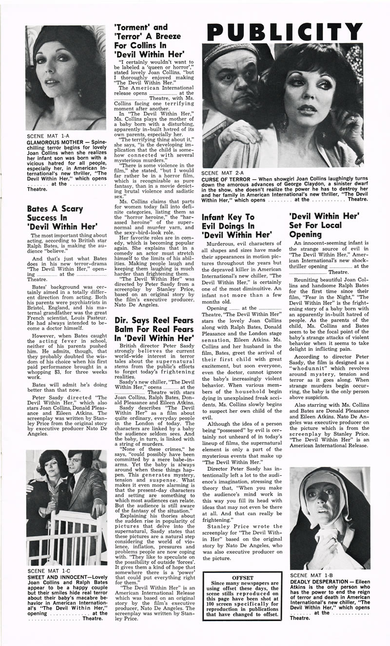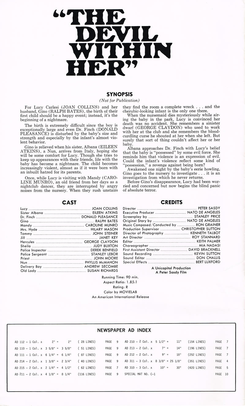 Movie Pressbook: The Devil Within Her (1975) Leave a Comment / Pressbooks (Horror, Sci Fi, Fantasy) / By JM Cozzoli This one has my vote for silliest poster artwork in a horror movie. The Devil Within Her movie itself has some unintended, but very silly moments. Joan Collins is a trooper for sure. Like this:Like Loading... Share this post Facebook Twitter Pinterest Linkedin