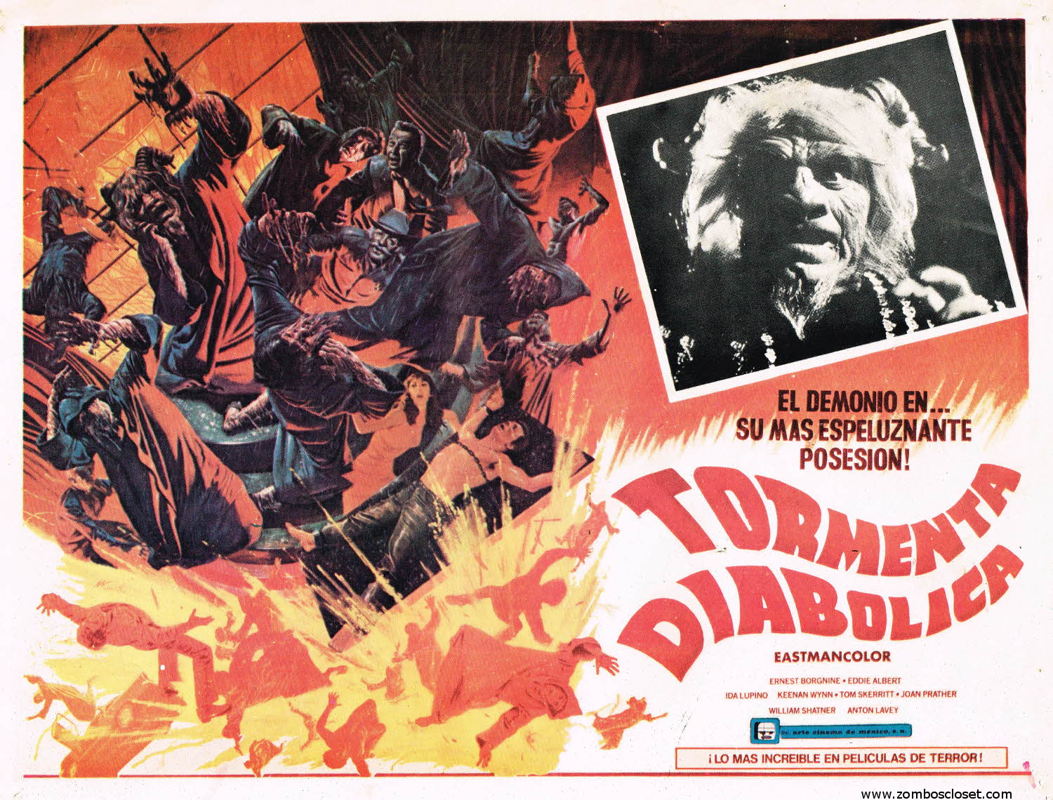 Here's the Mexican lobby card for The Devil's Rain. You can see the pressbook here. I can best sum it up by saying a lot of people melt at the end. So either fast forward or plan on spending little quality time until the end. Great poster art, though. And the makeup effects are good. A lot of movies came out in the 1970's, on television and in the theater, with stories about satanists and witchcraft and all that. Not sure why. This is one of those movies. Now, if we were talking Race with the Devil (1975), of which you can see the pressbook here, that's worth your while.