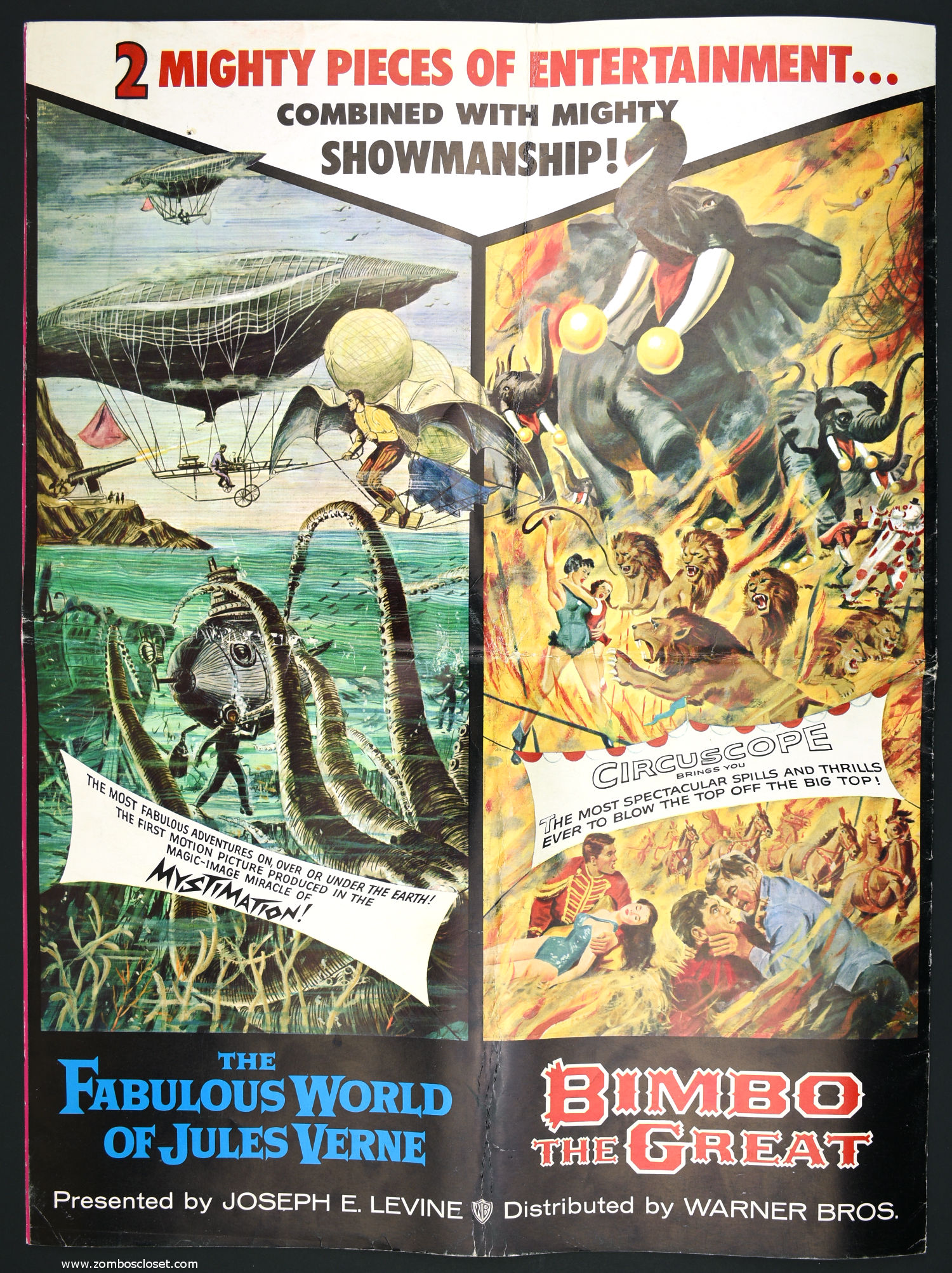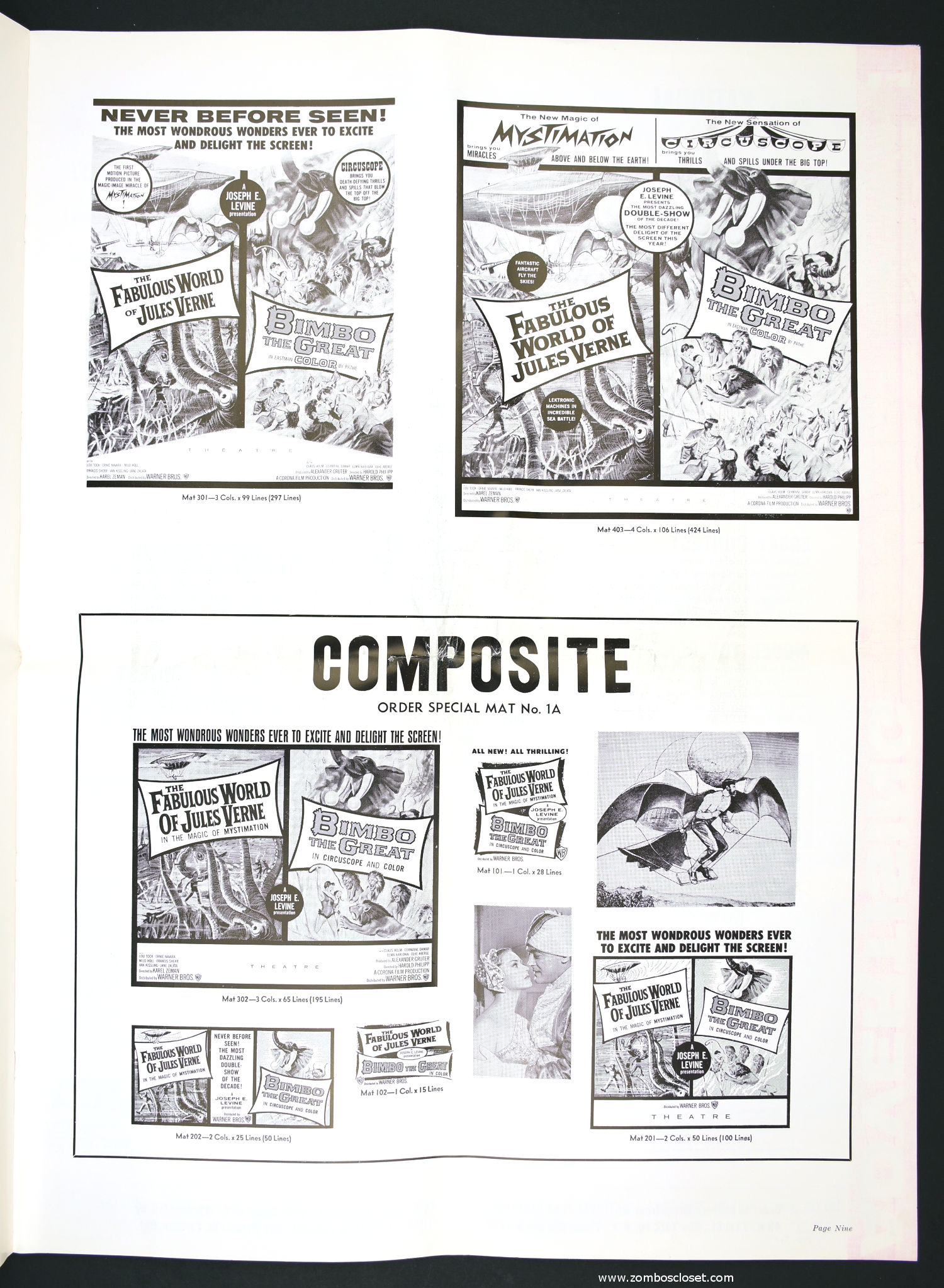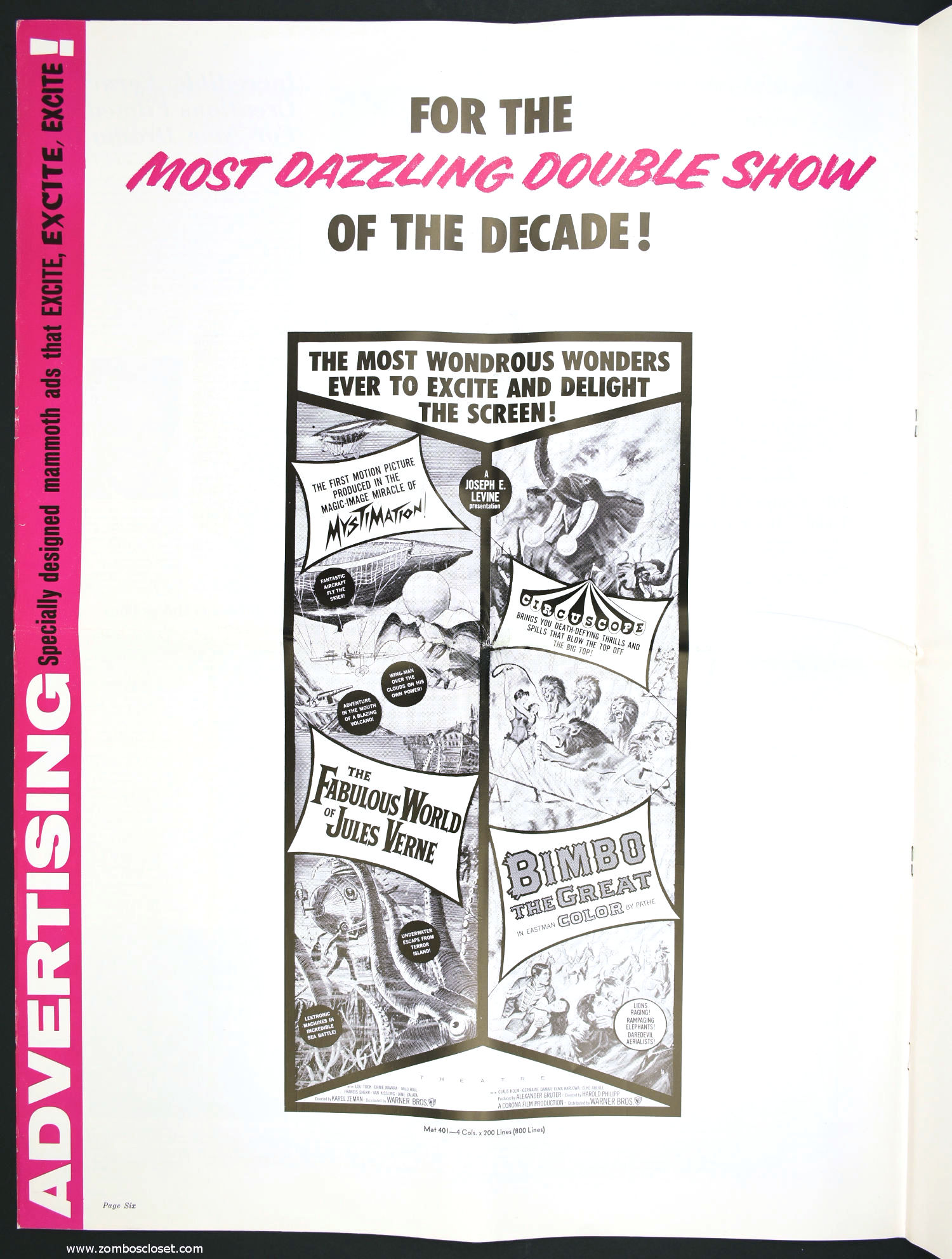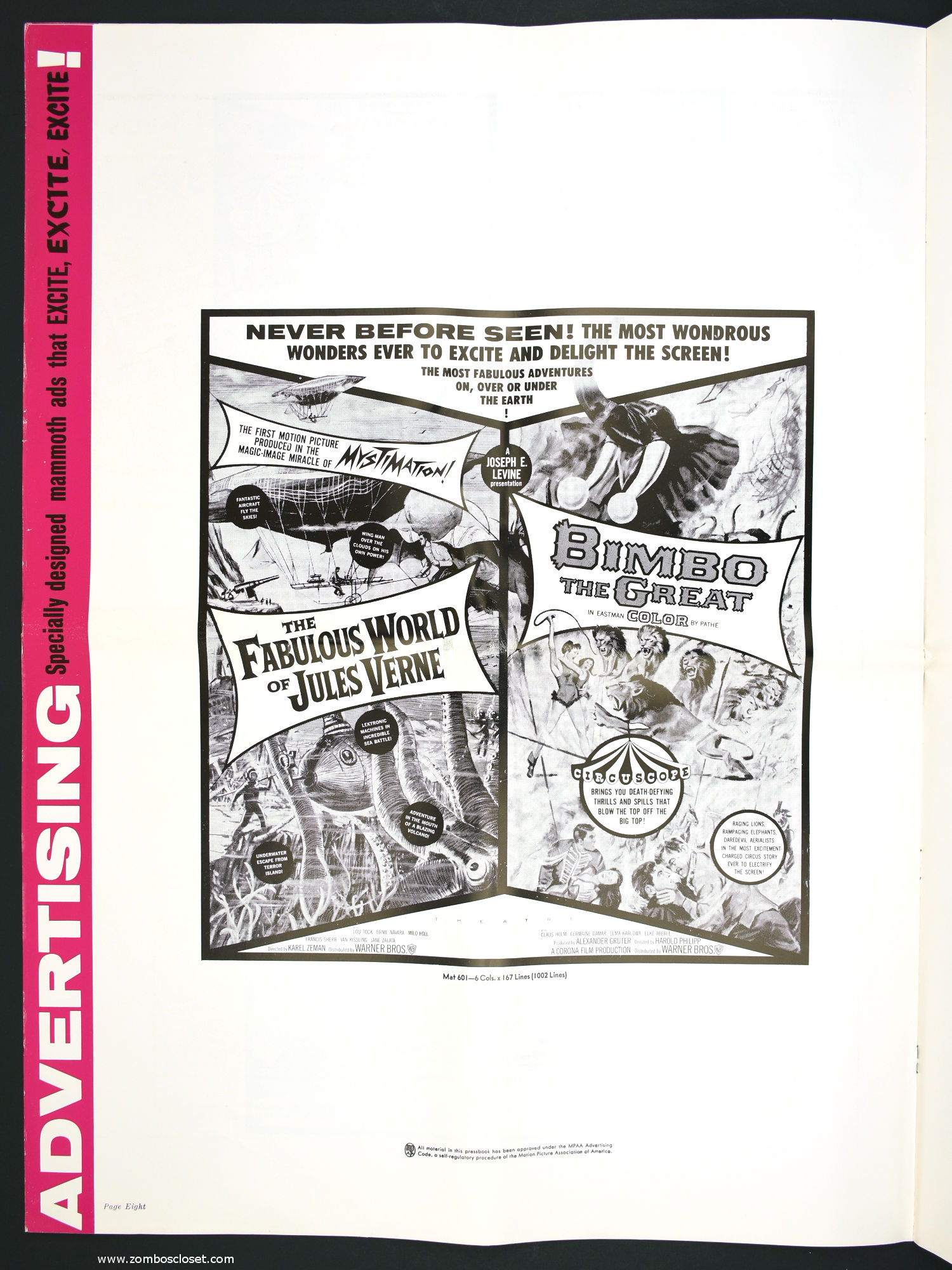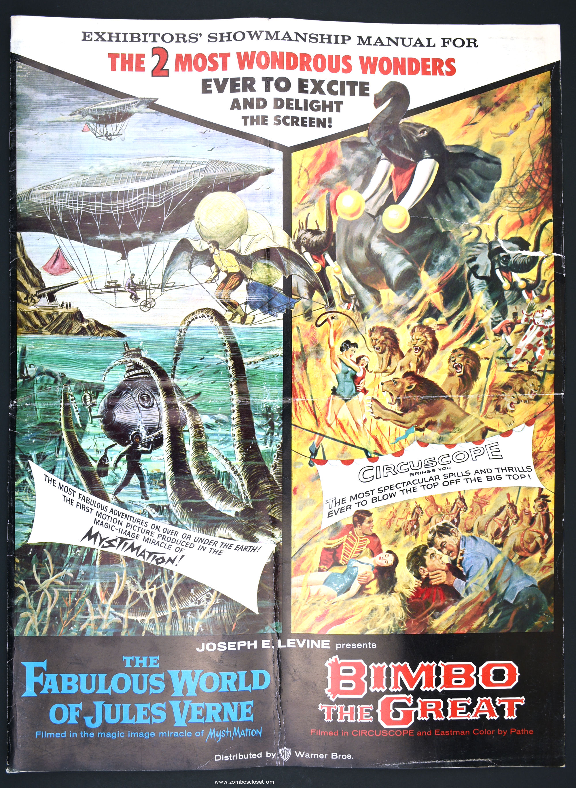 Not trusting in their own fabulous promotion for The Fabulous World of Jules Verne, I suppose they paired it with Bimbo the Great to bolster ticket sales. This double bill pressbook is almost as big as Bimbo. So, you got mystimation (a fabulous animation technique that's quite enjoyable to watch) paired with circuscope (basically European widescreen, I believe) for the single price to "excite and delight."