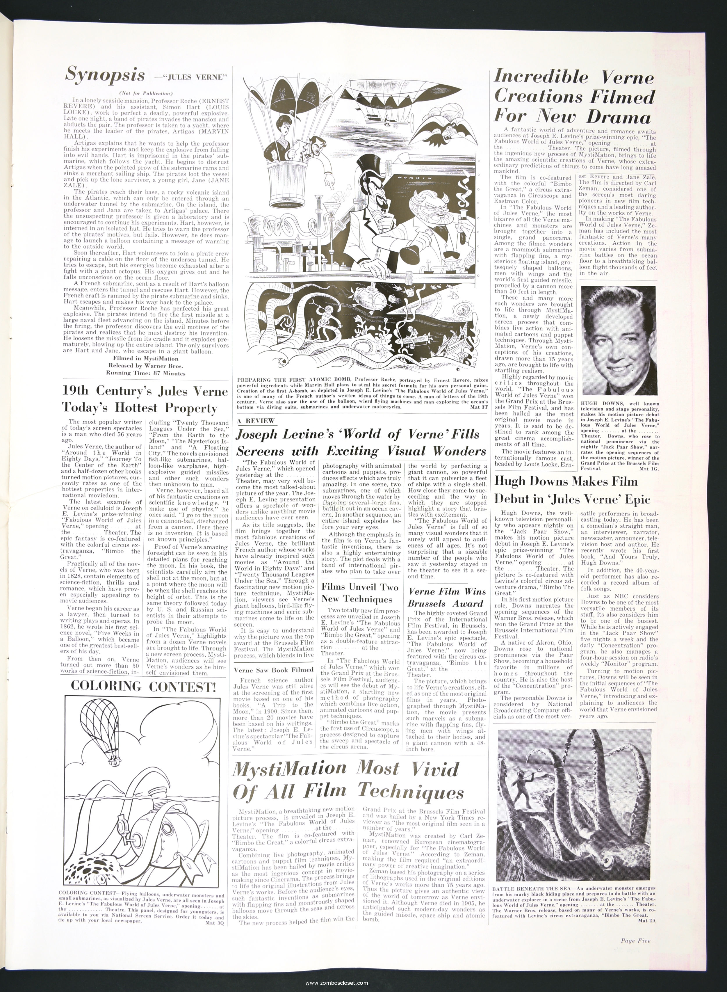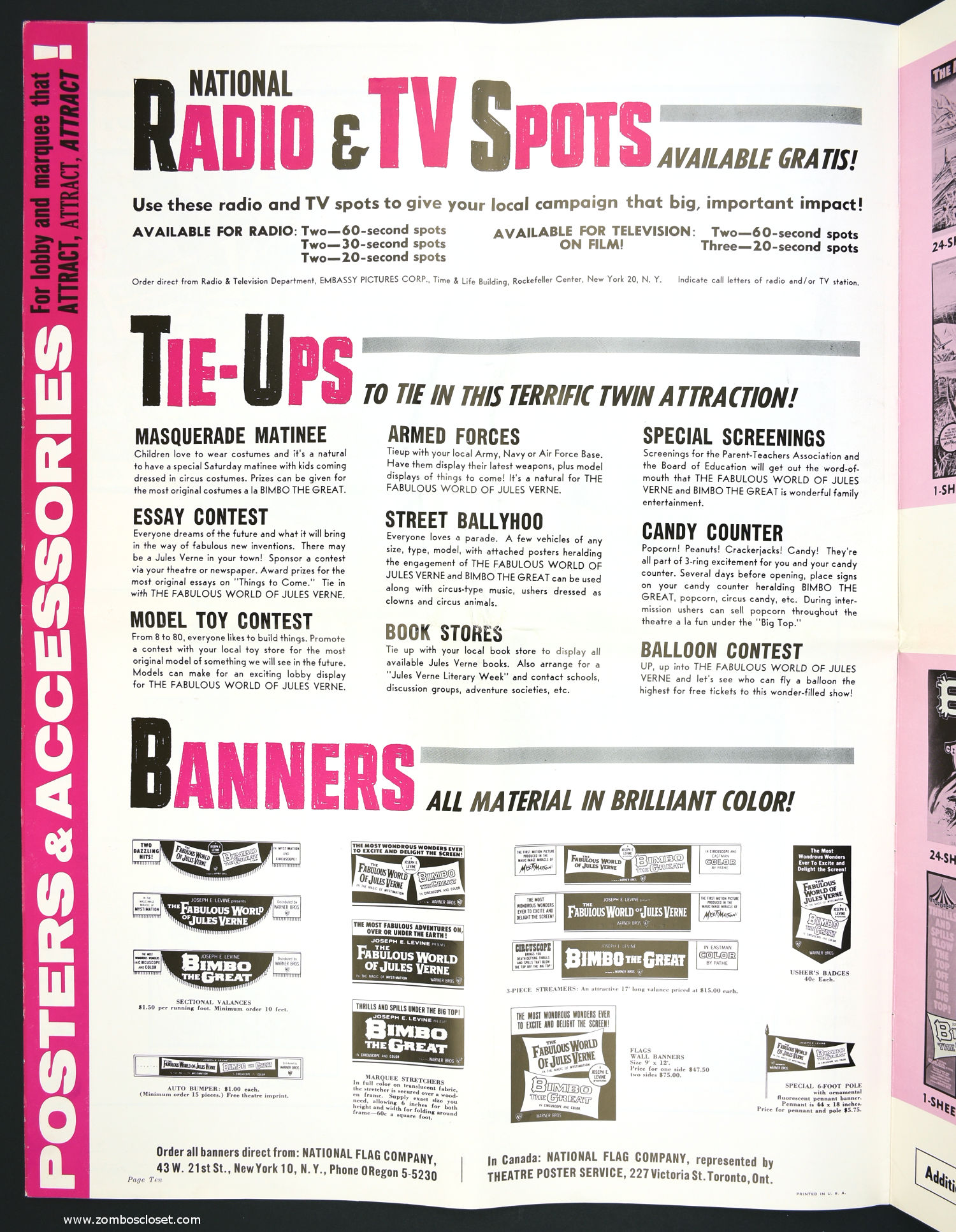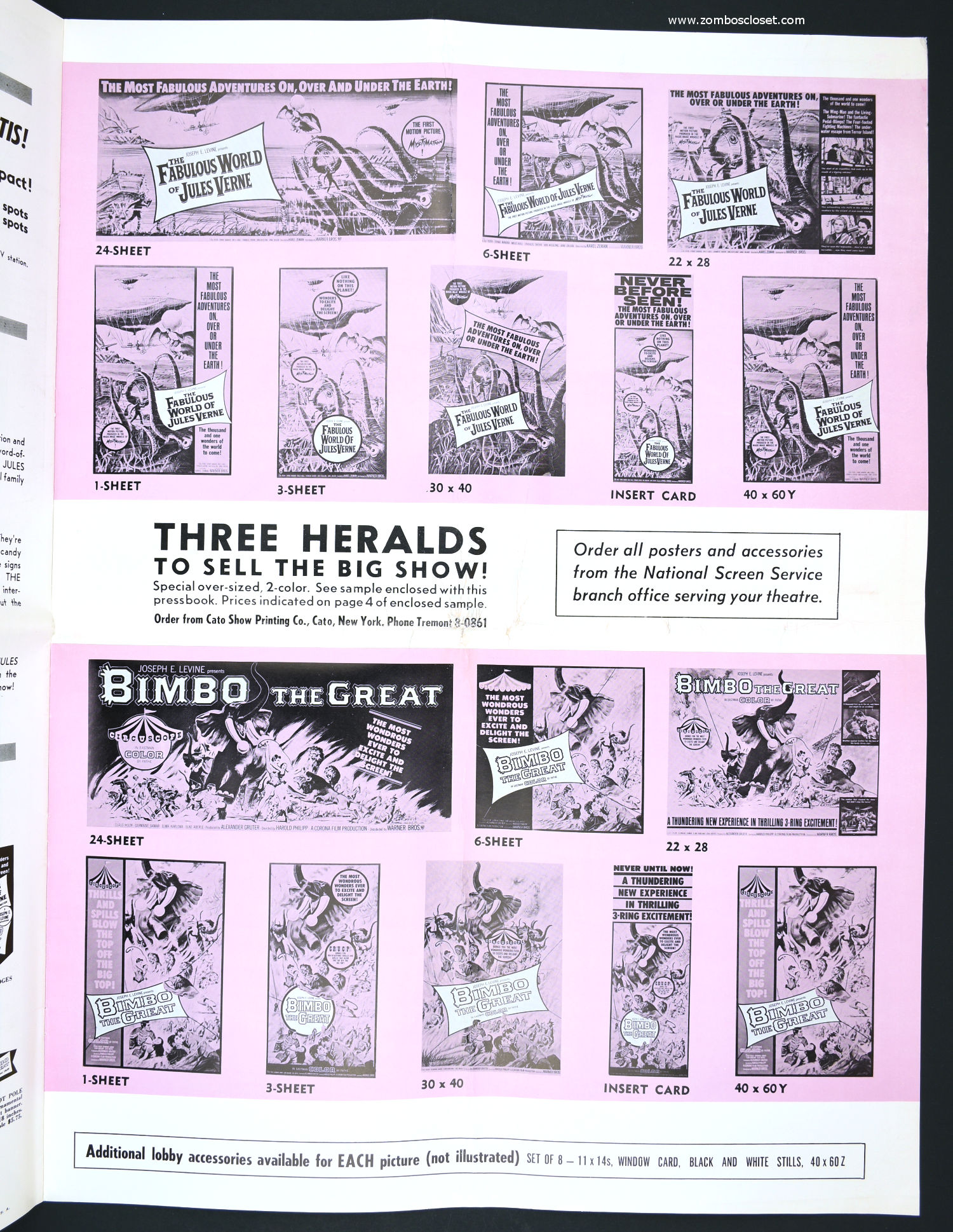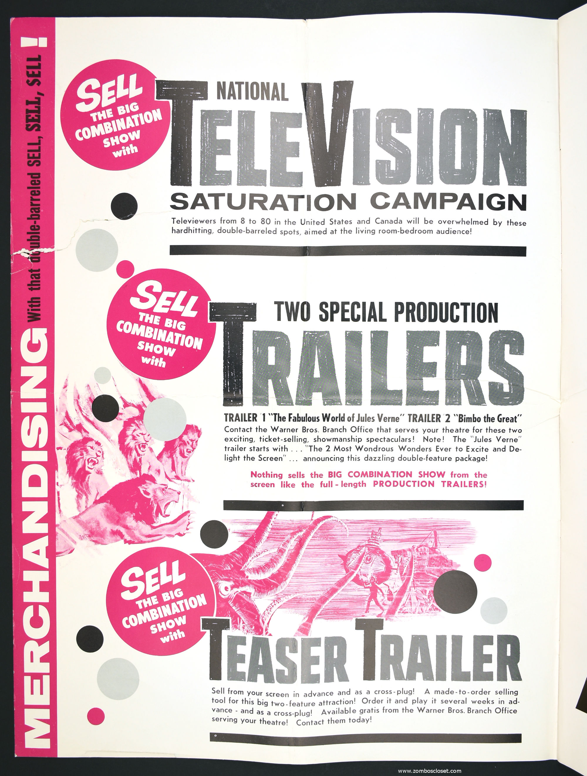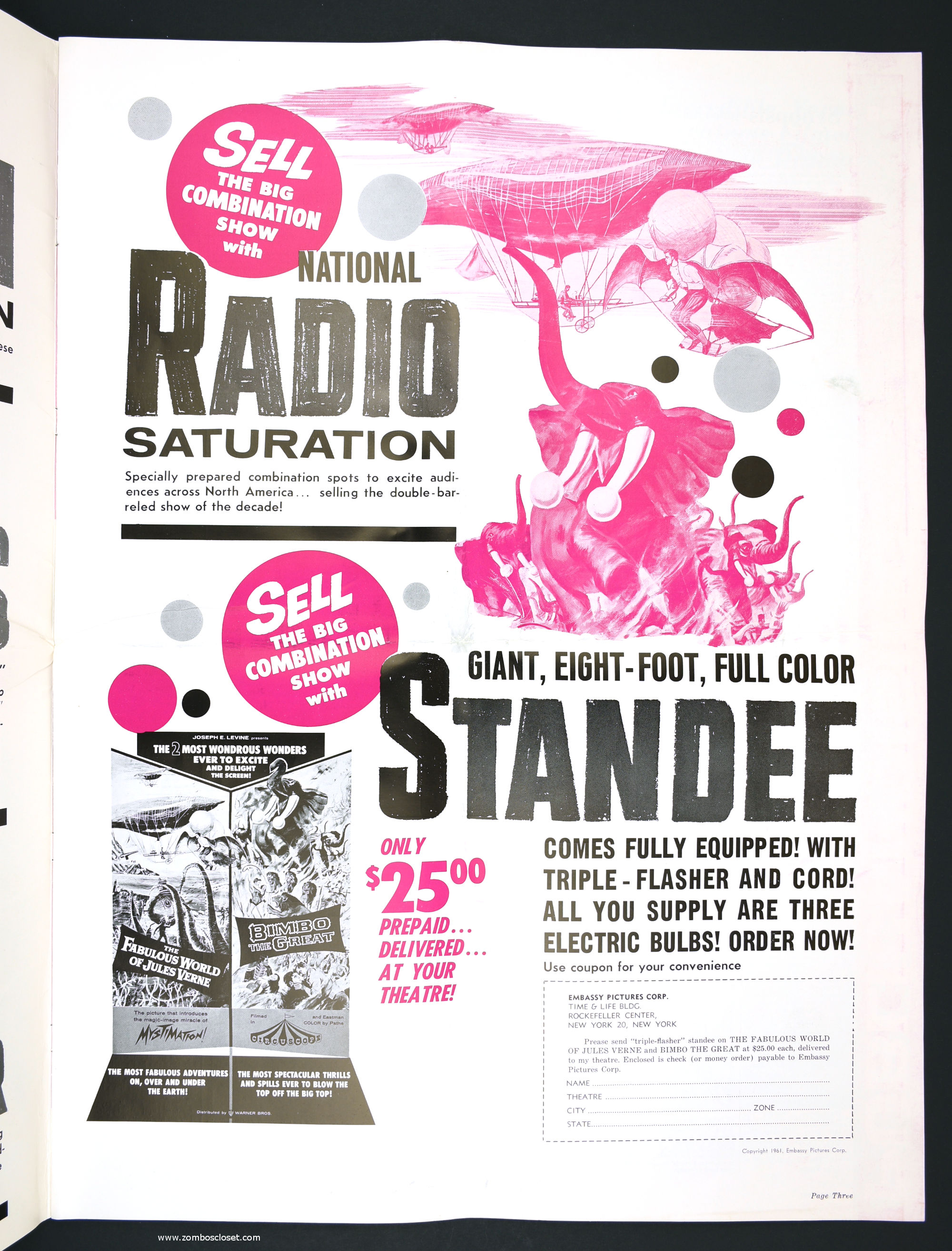 Not trusting in their own fabulous promotion for The Fabulous World of Jules Verne, I suppose they paired it with Bimbo the Great to bolster ticket sales. This double bill pressbook is almost as big as Bimbo. So, you got mystimation (a fabulous animation technique that's quite enjoyable to watch) paired with circuscope (basically European widescreen, I believe) for the single price to "excite and delight."