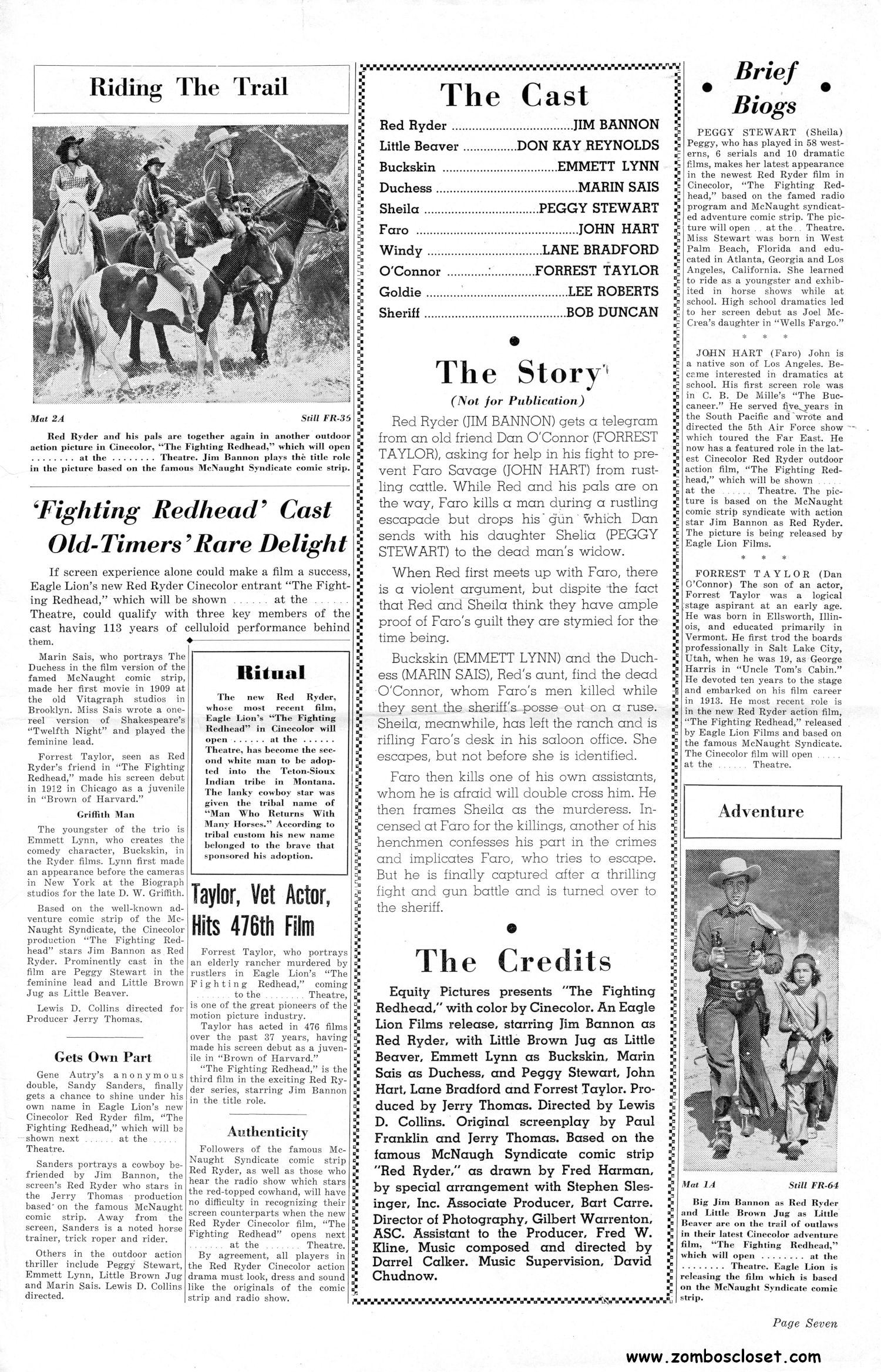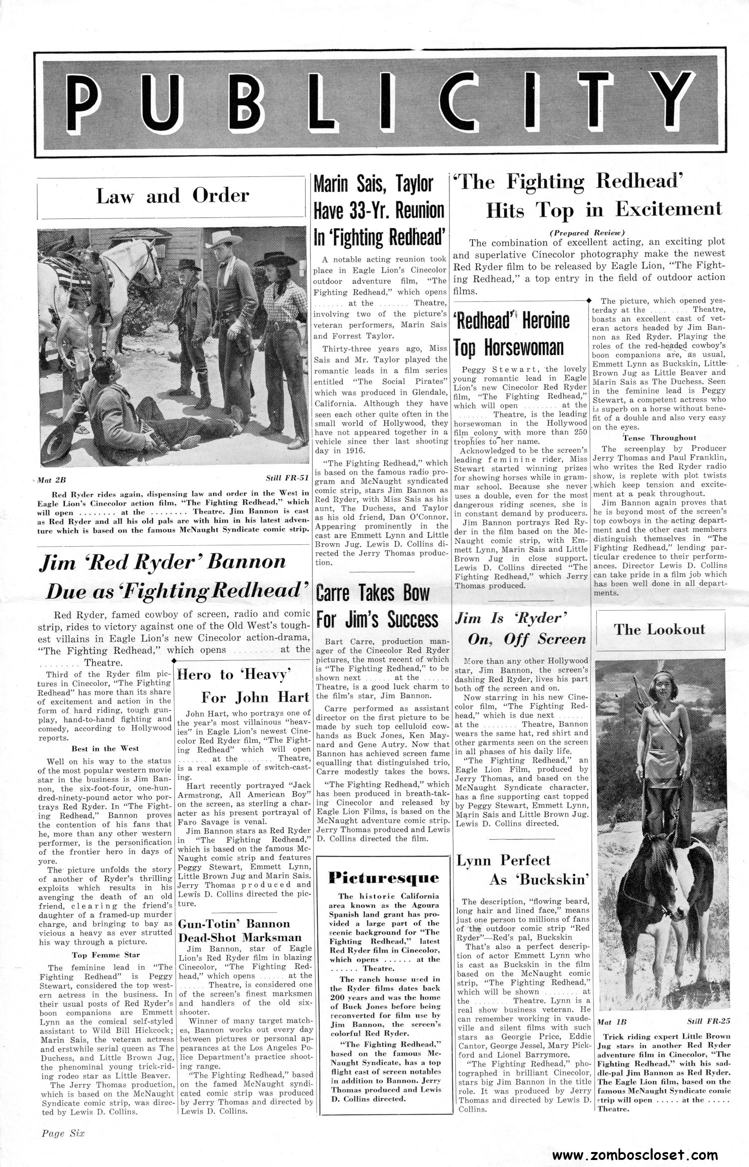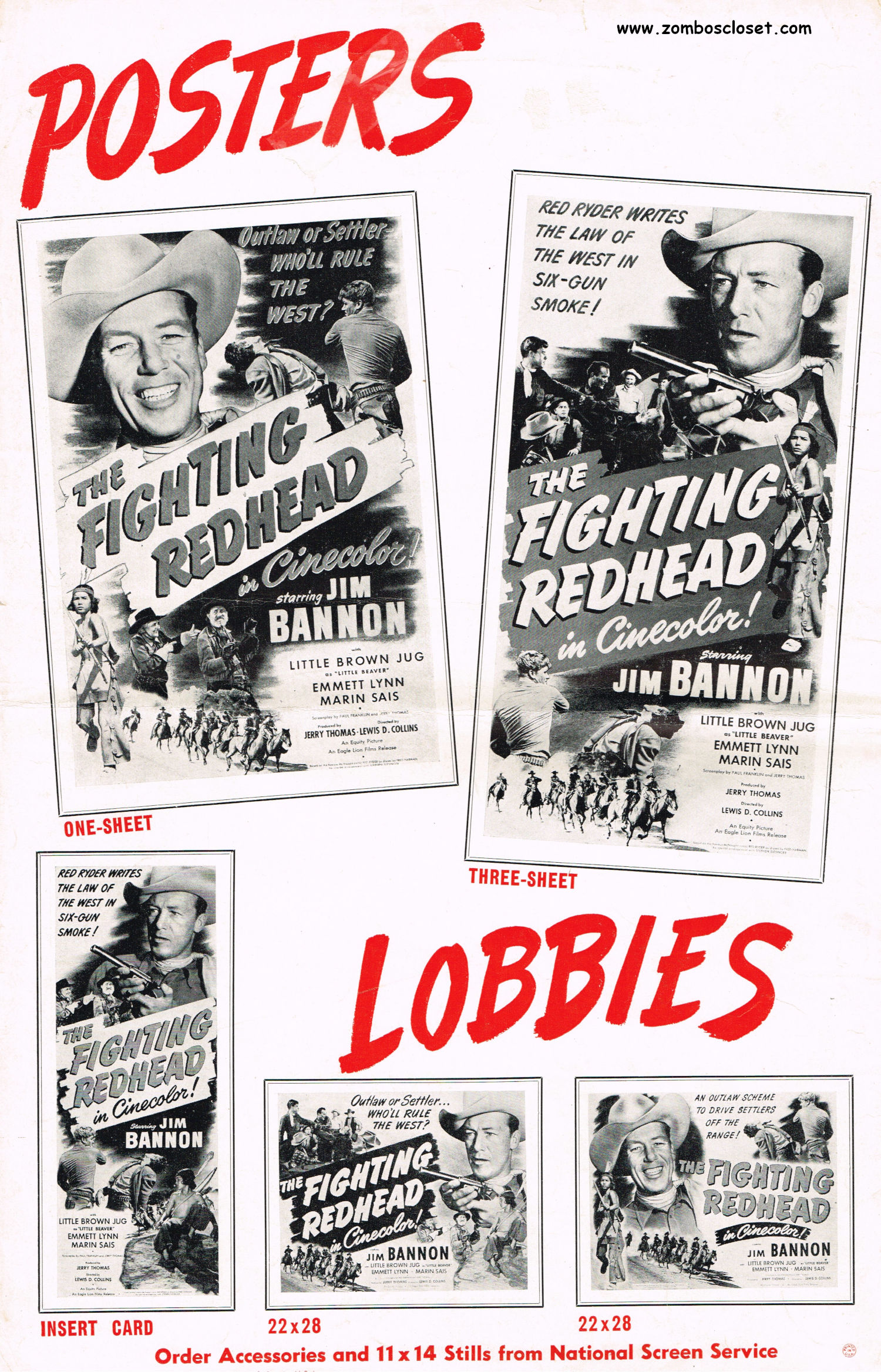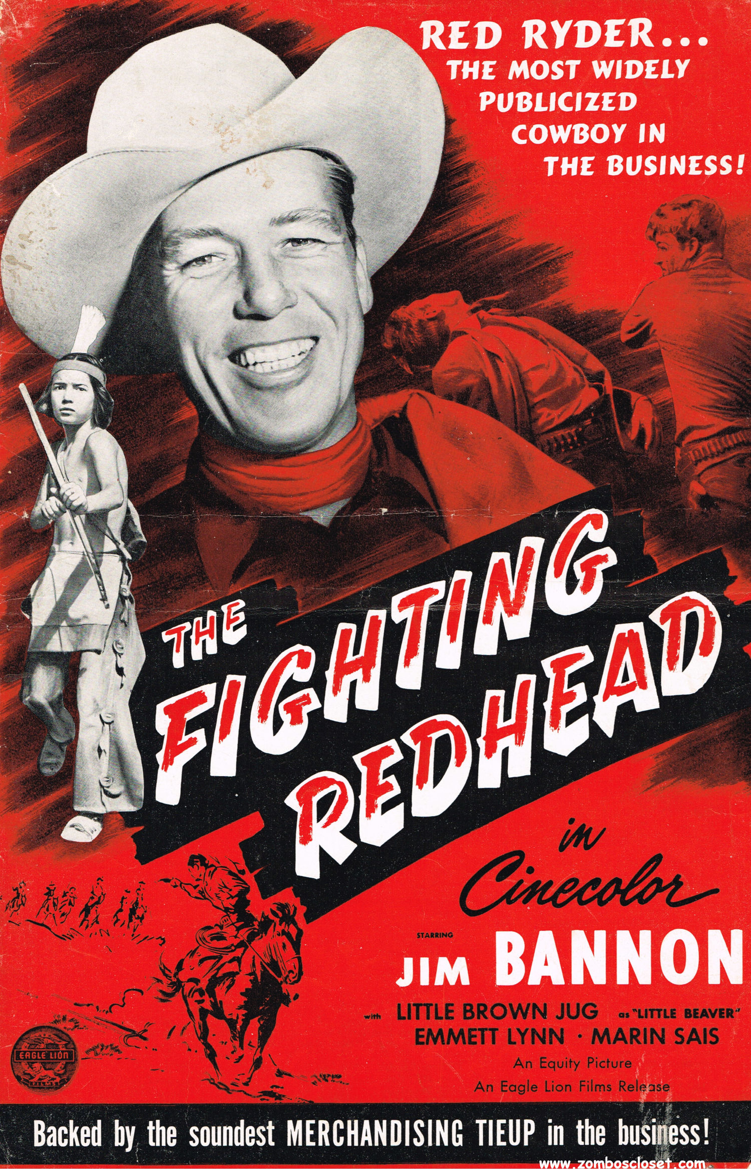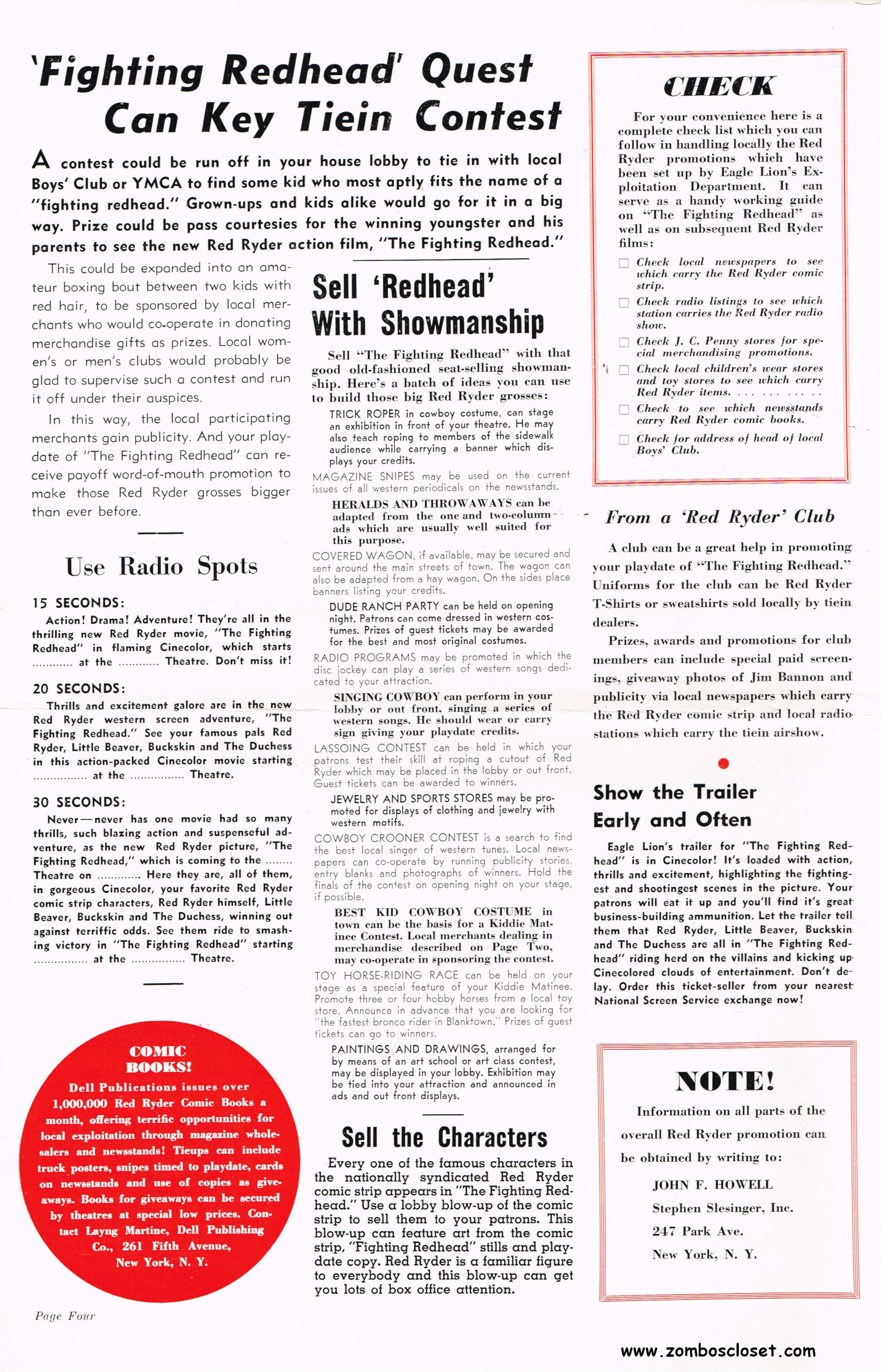 Red Ryder, appearing in the comic strip running from 1938 to 1965, was a merchandising juggernaut. This pressbook for Eagle-Lion Film’s The Fighting Redhead makes sure exhibitors knew that. On another note, here’s an interesting article on Red Ryder’s movie saddle.