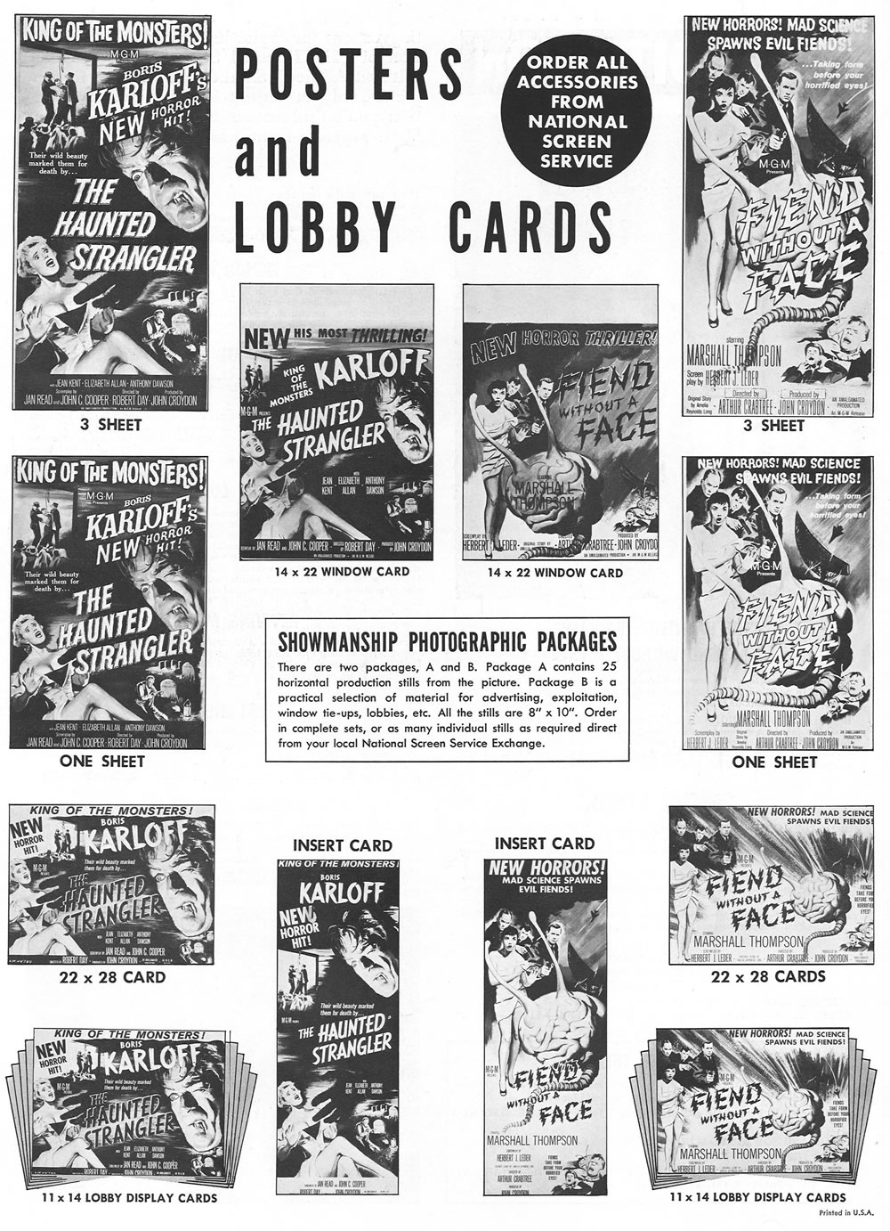 Here's the double bill pressbook for The Haunted Strangler and Fiend Without A Face. The lip-biting Boris Karloff photo is priceless. I left out some of the pages as they contained assorted poster sizes for ordering. This oversized pressbook is approximately 12" x 17".  (To make reading easier, some of these pages will open in the same window, where you can click on them to enlarge. Use your browser's back button to return to the main post.)