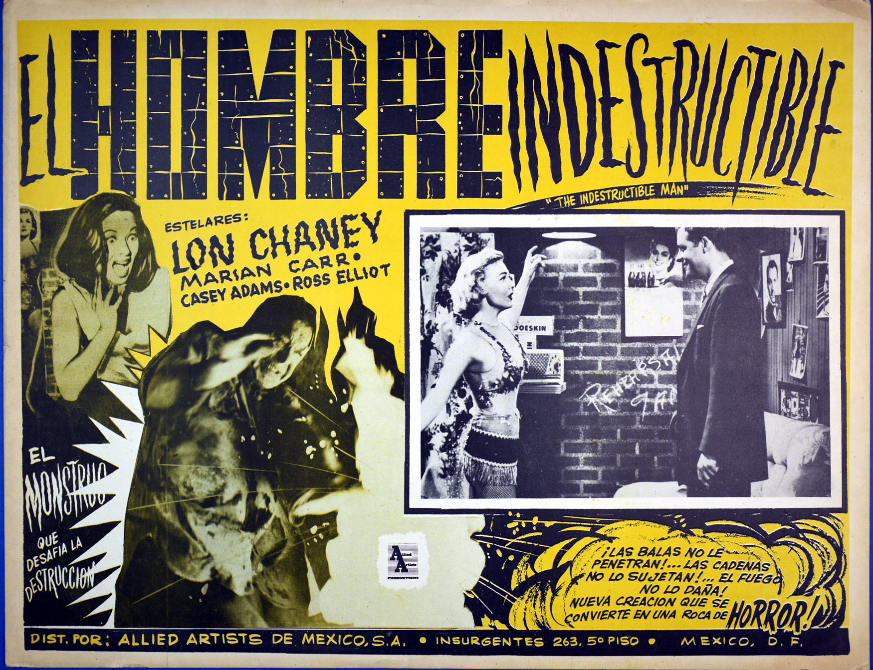 I have another Mexican lobby card for El Hombre Indestructible (1956), the blue version. Here's the yellow version, which is more vivid. There are so many movies about men and women victimized by mad scientists, aliens, and themselves, where to start? Lon Chaney Jr. was electrified twice: first in 1941's Man-Made Monster, then in this movie. A great all-around actor, he's the only one to portray all founding-father Universal Monsters: Dracula (or his son, still not sure), Wolf Man, Mummy, and Frankenstein (okay, the Monster, for you purists).