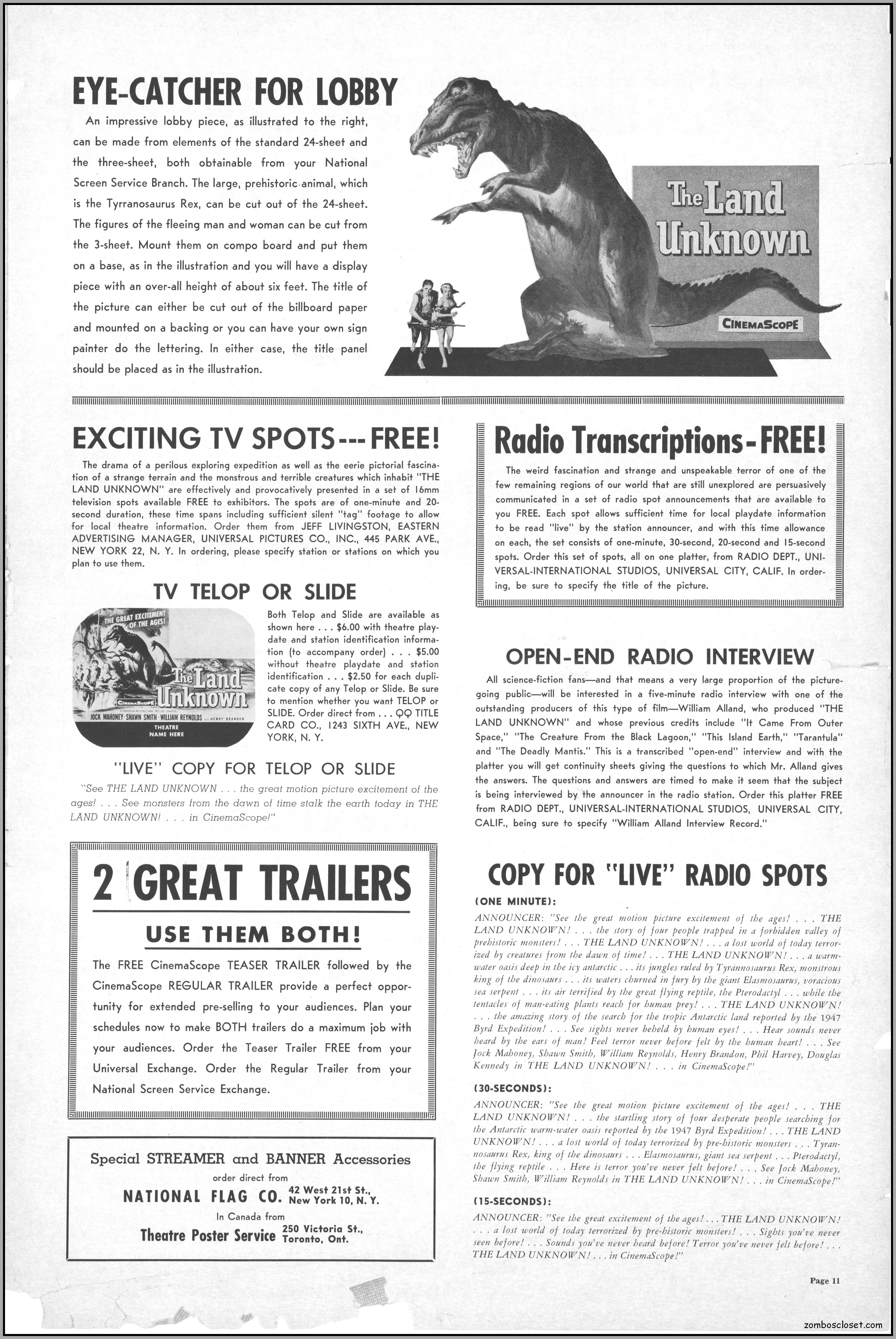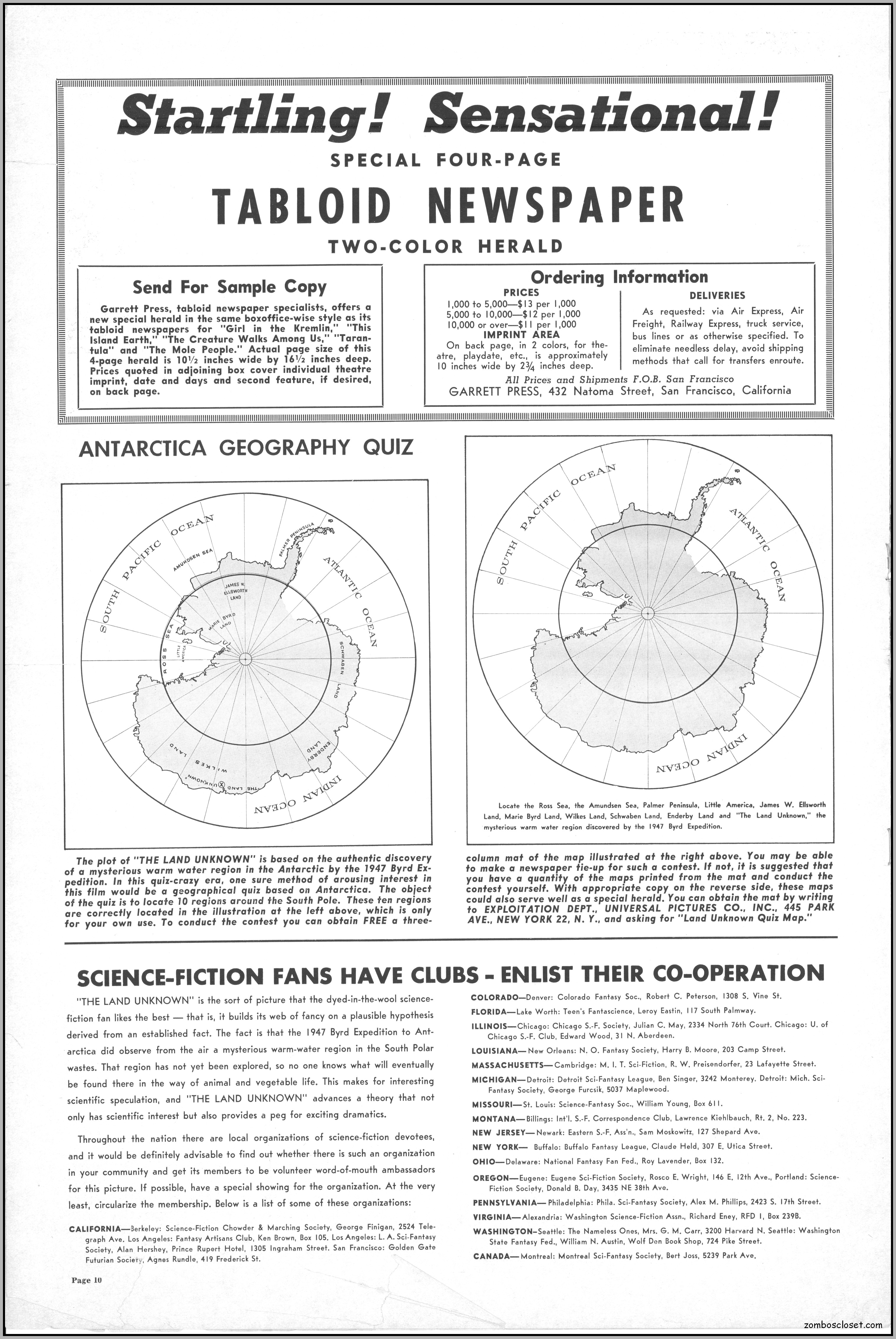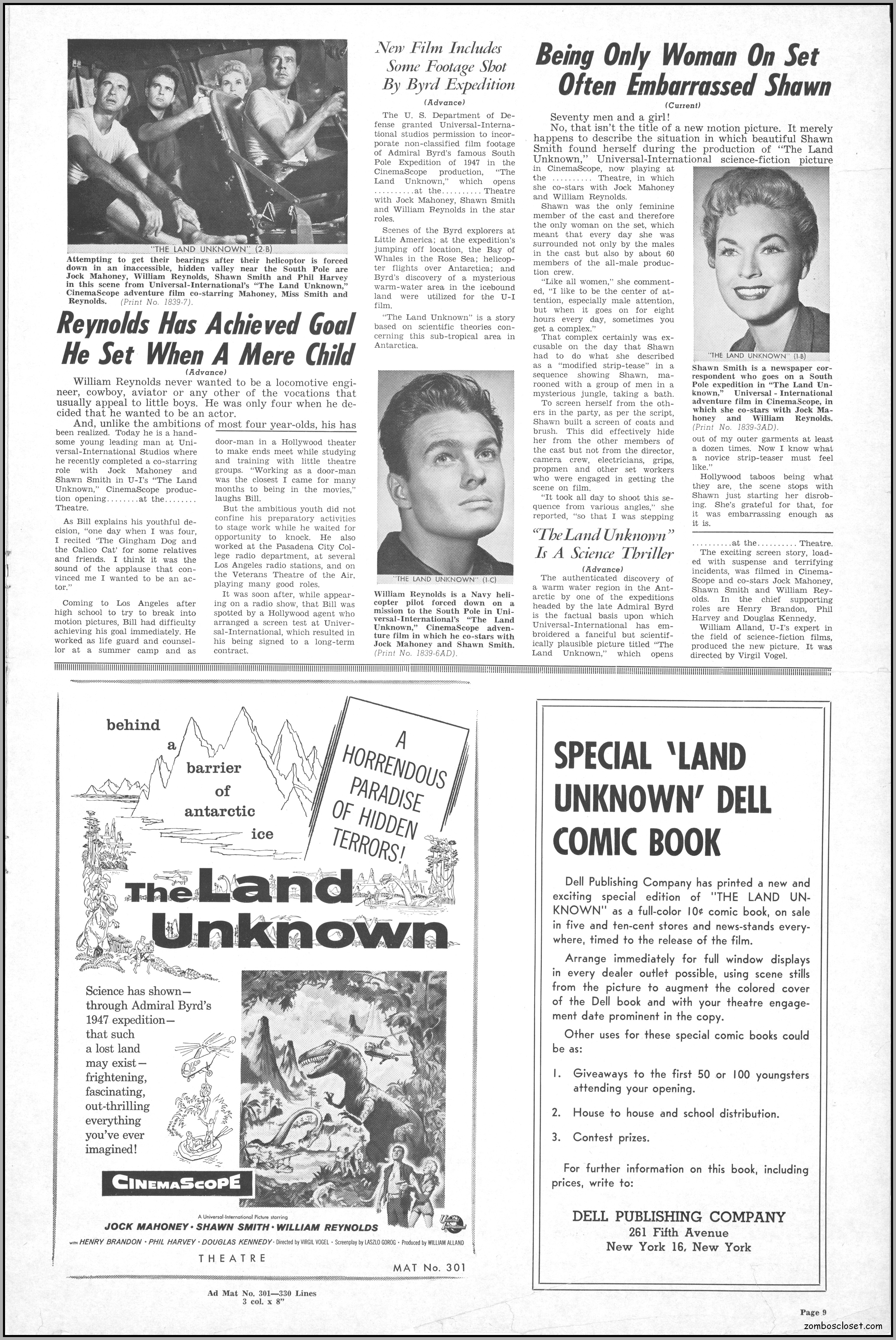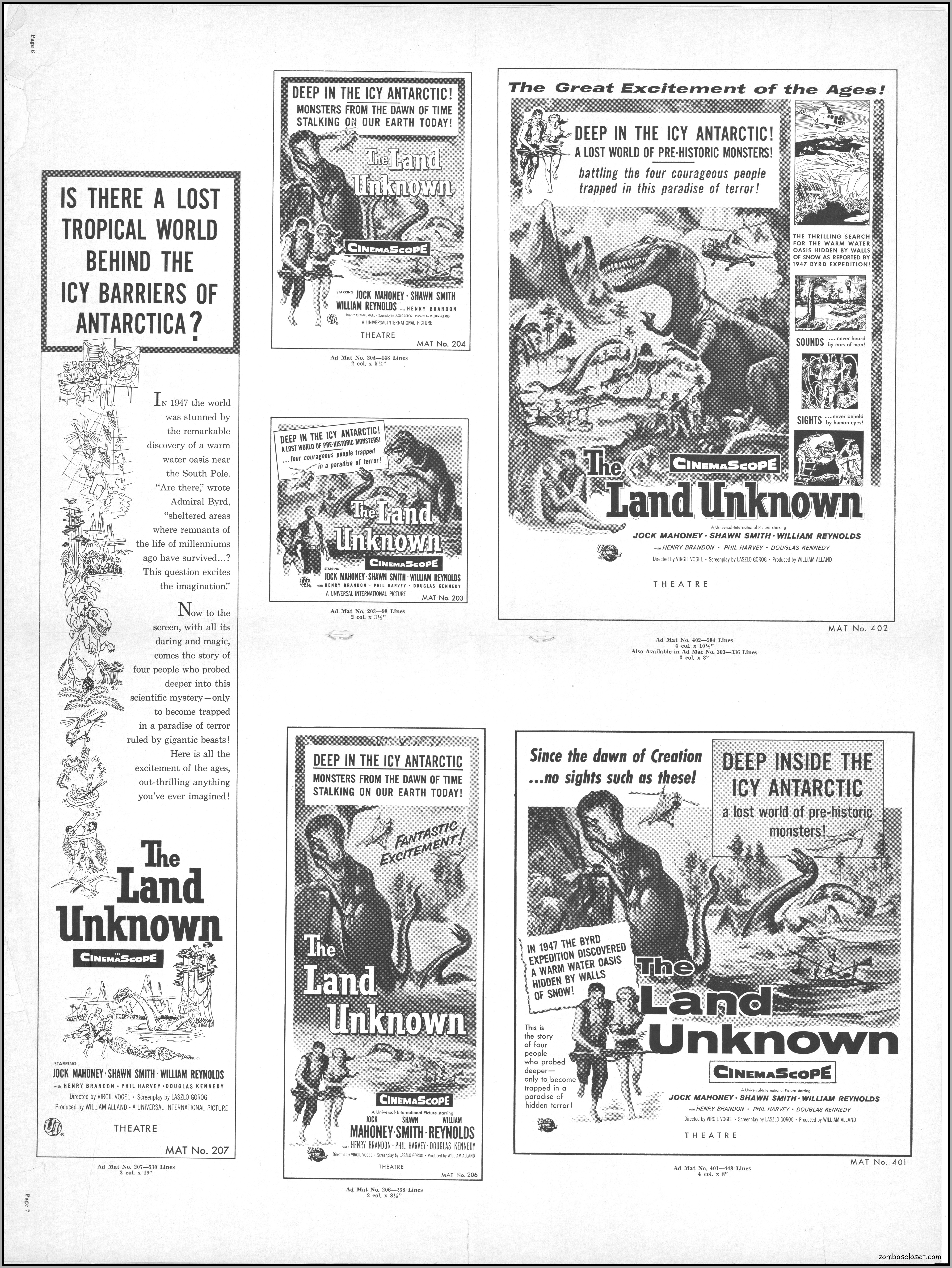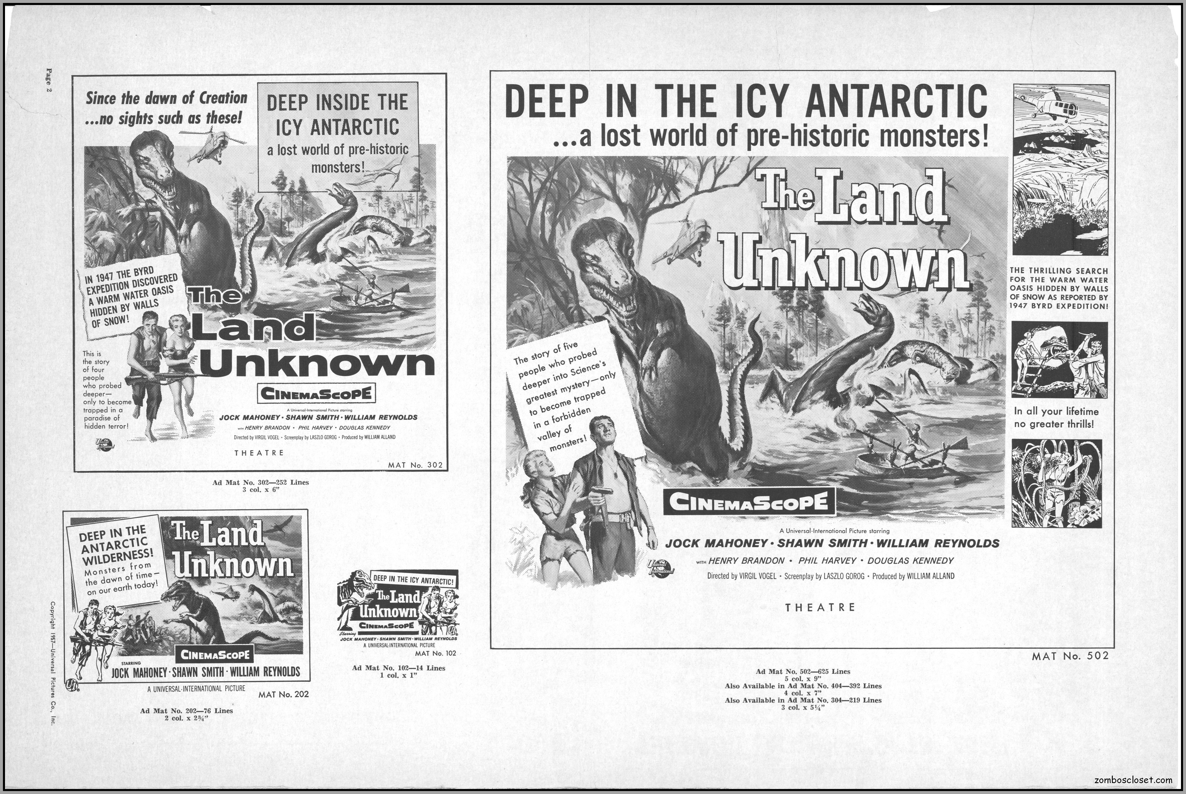 Almost a fun movie, but the special effects, which included a guy in a really ill-designed dinosaur suit, take away the being-there aspect quite a bit. The set itself is beautiful and, were this in color, may not have been as effective; but the matte paintings and whole diorama effect is foreboding and filled with danger in black and white. Bill Warren, in his Keep Watching the Skies!, lambasted this one pretty good. Not one of Universal's best from the 1950s, but they all couldn't be winners like Creature From the Black Lagoon. There was a real fascination, at least where cinema was concerned, with ancient or alien landscapes, ancient or alien cultures, and dinosaurs, when it came to jungle and horror movies of the 50s and 60s. And often there was always a man-eating plant stuffed in there, somewhere. You won't see newspapers running Antarctica Geography Quizzes for a movie anymore, either.