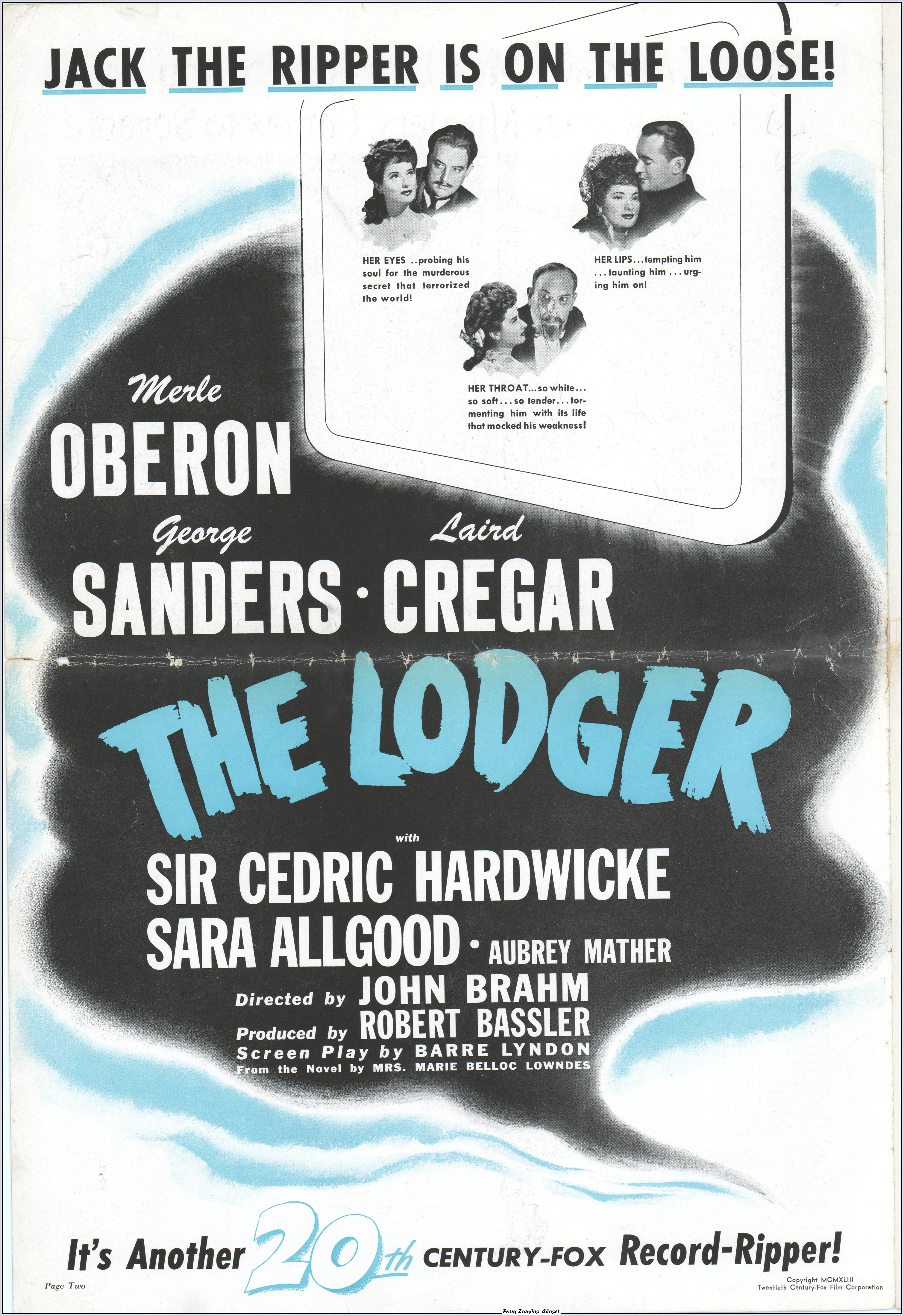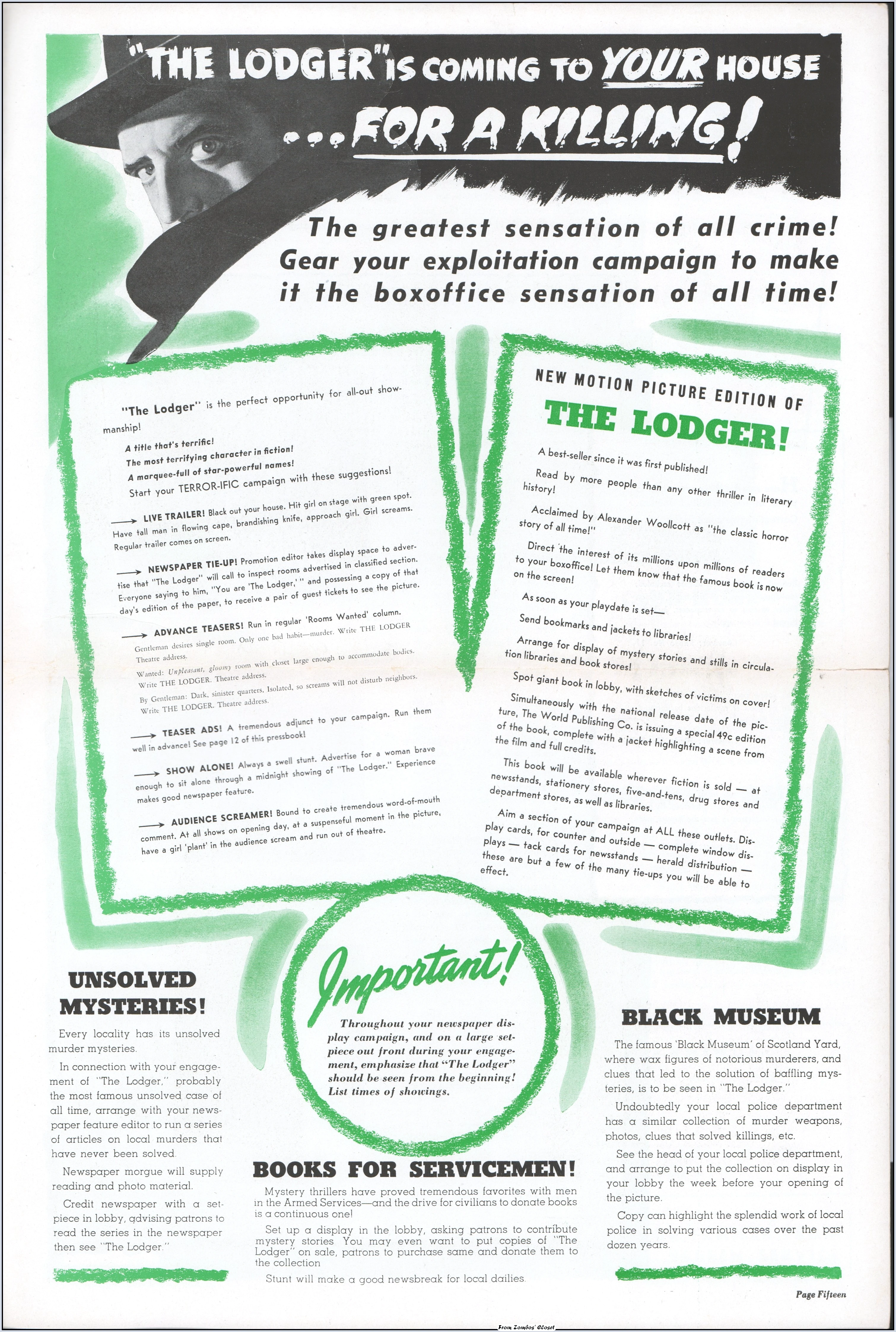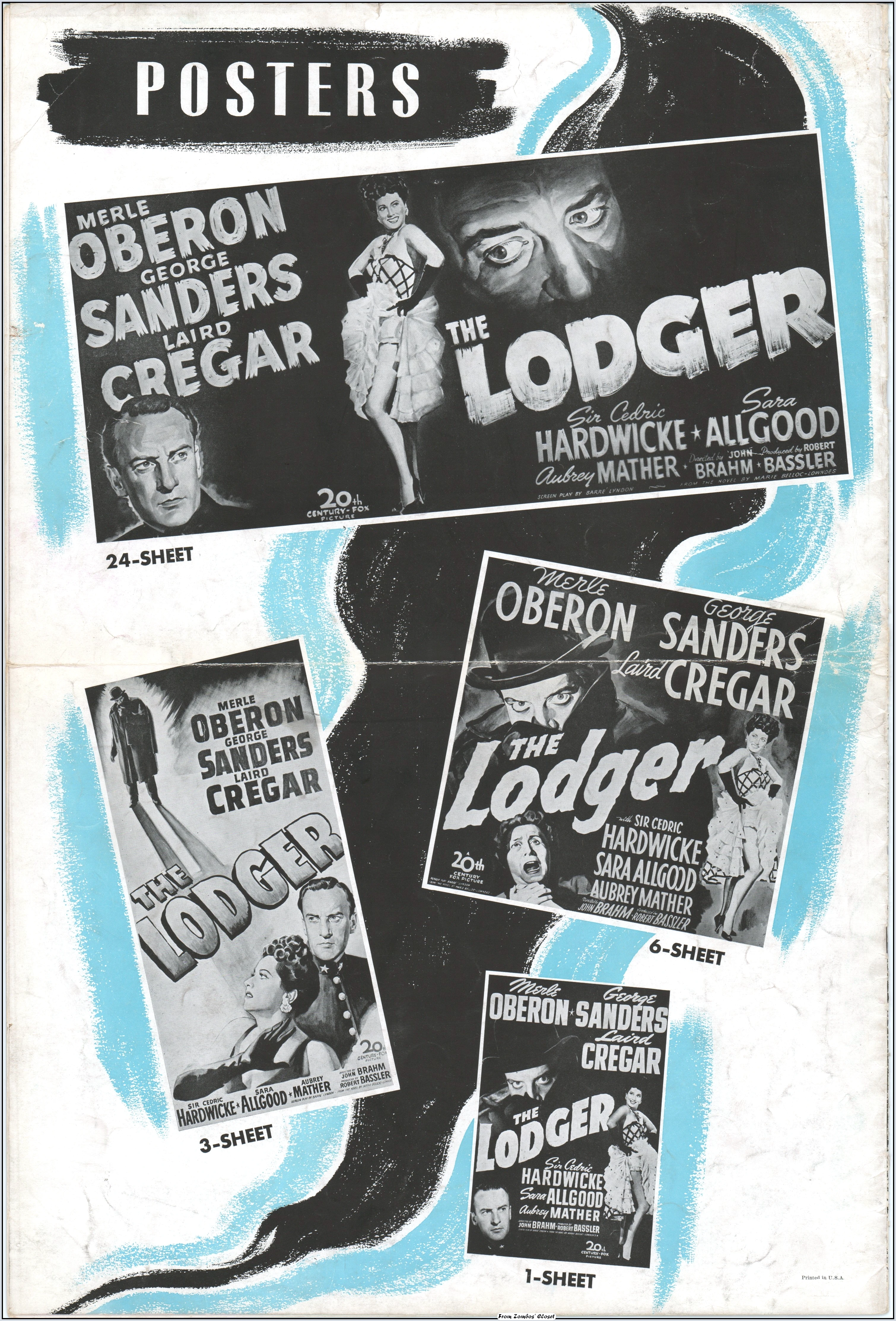 Here’s the exciting pressbook for The Lodger (1944) with Laird Cregar. It’s almost as big as he was. As David J. Hogan in his Film Noir FAQ notes, while some consider this a remake of Hitchcock’s The Lodger (1927), only the name and the Jack the Ripper storyline match to the previous film. Both, however, are based on the 1913 novel of the same name by Marie Belloc Lowndes. In this one, Cregar uses his immense stage presence (both figuratively and literally), and his piercing eyes, to create a multi-dimensional character that vacillates between sinister and innocuous, innocent and guilty, with a definitely male-gaze problem toward women and his dead brother. The last minutes of the chase through the catwalks of a theater provide a thrilling noir backdrop and pace. The fog-bound streets, darkly lit byways, and confined spaces filmed entirely on the Fox backlot give this noir a classic status. Unfortunately, Cregar’s body size kept him from being a leading man and he died from trying to lose enough weight to open up those roles for him. He was 31.