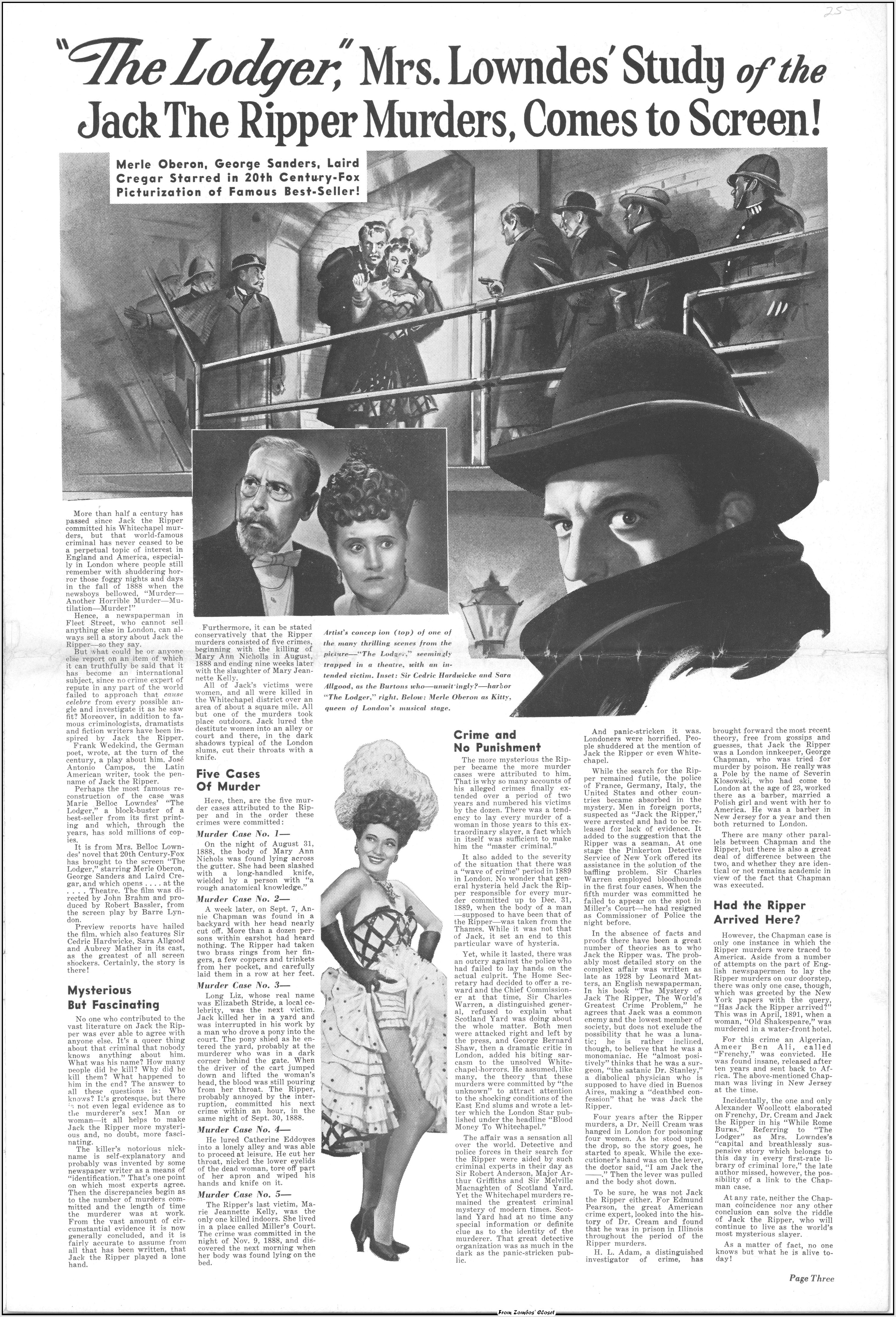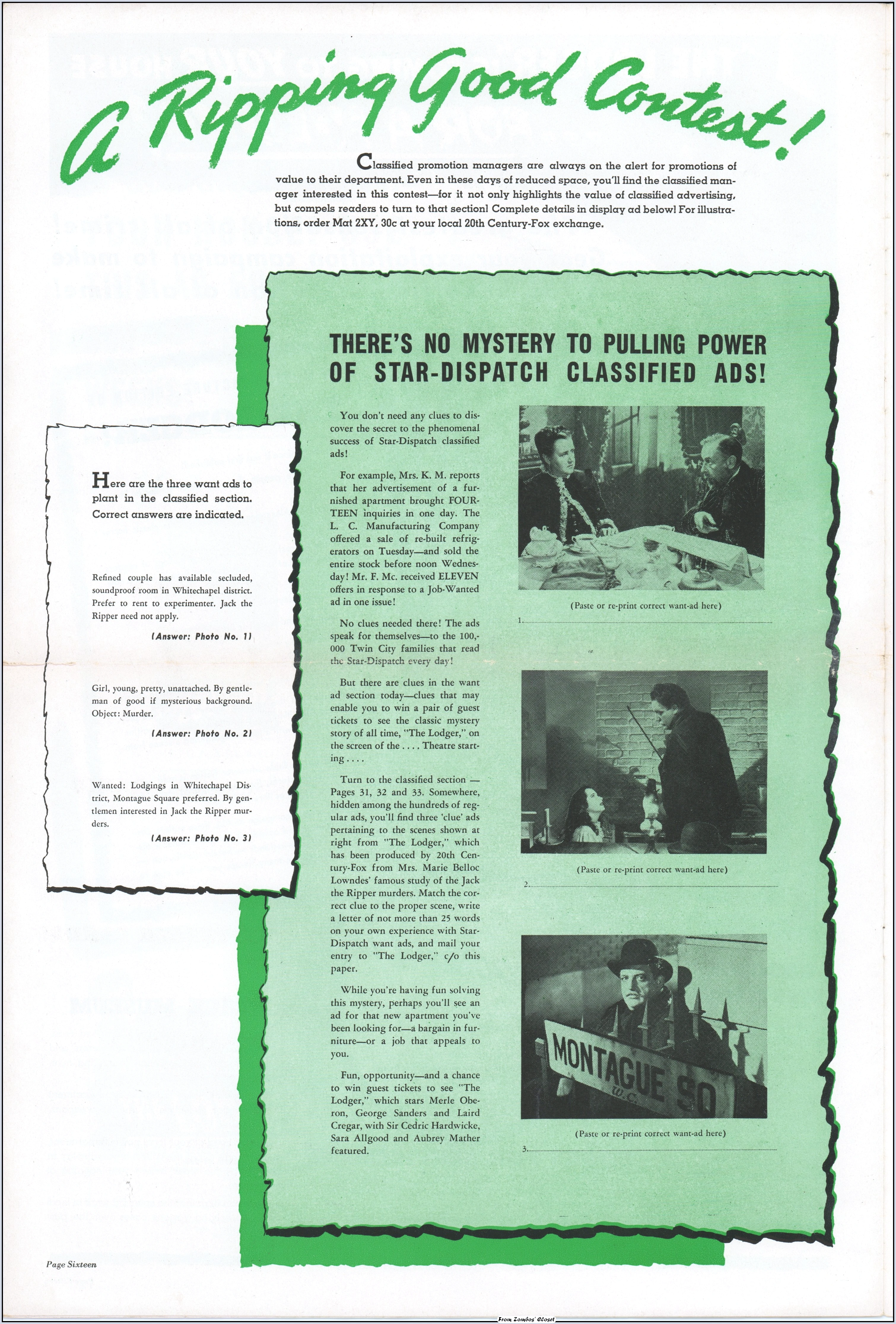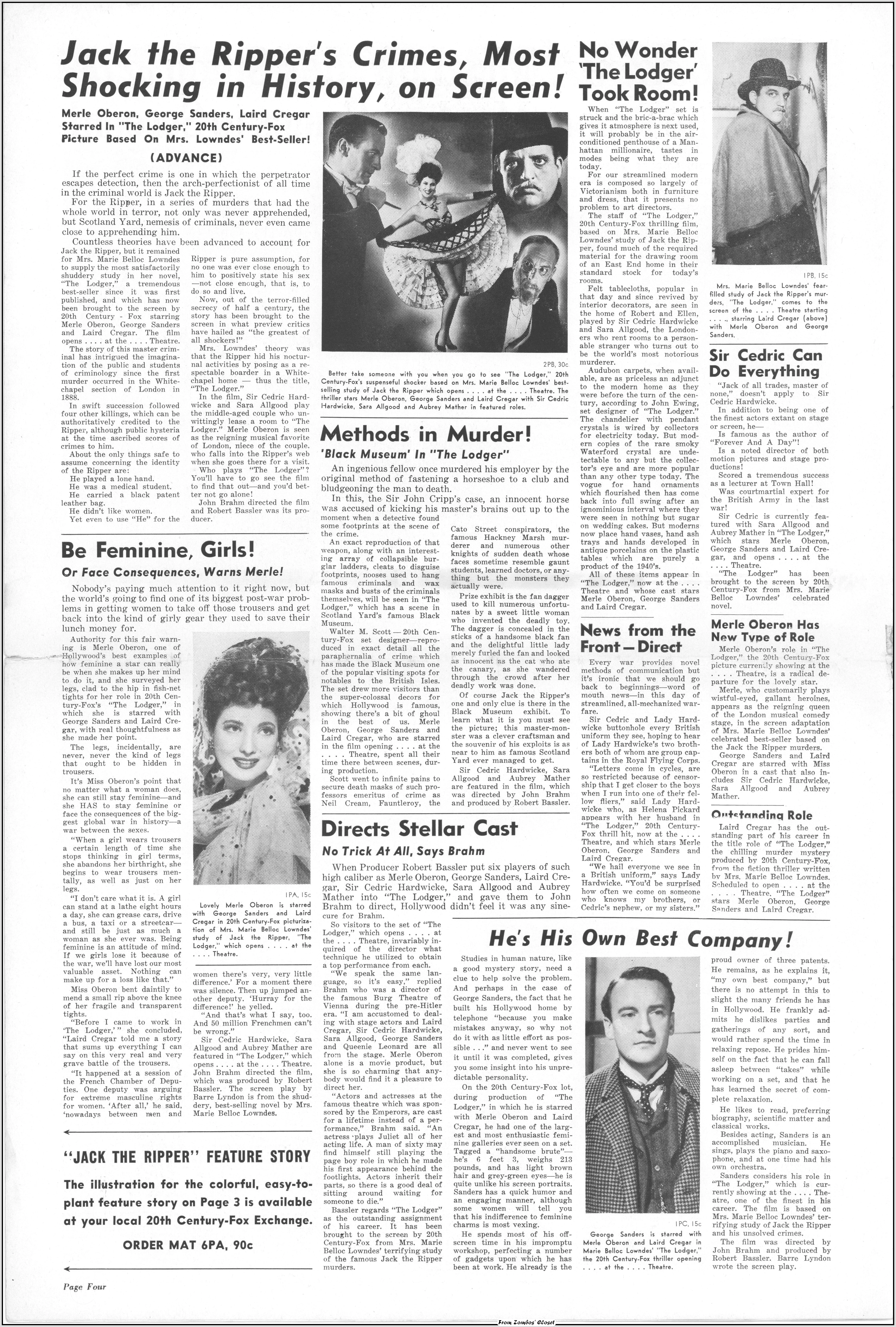 Here’s the exciting pressbook for The Lodger (1944) with Laird Cregar. It’s almost as big as he was. As David J. Hogan in his Film Noir FAQ notes, while some consider this a remake of Hitchcock’s The Lodger (1927), only the name and the Jack the Ripper storyline match to the previous film. Both, however, are based on the 1913 novel of the same name by Marie Belloc Lowndes. In this one, Cregar uses his immense stage presence (both figuratively and literally), and his piercing eyes, to create a multi-dimensional character that vacillates between sinister and innocuous, innocent and guilty, with a definitely male-gaze problem toward women and his dead brother. The last minutes of the chase through the catwalks of a theater provide a thrilling noir backdrop and pace. The fog-bound streets, darkly lit byways, and confined spaces filmed entirely on the Fox backlot give this noir a classic status. Unfortunately, Cregar’s body size kept him from being a leading man and he died from trying to lose enough weight to open up those roles for him. He was 31.