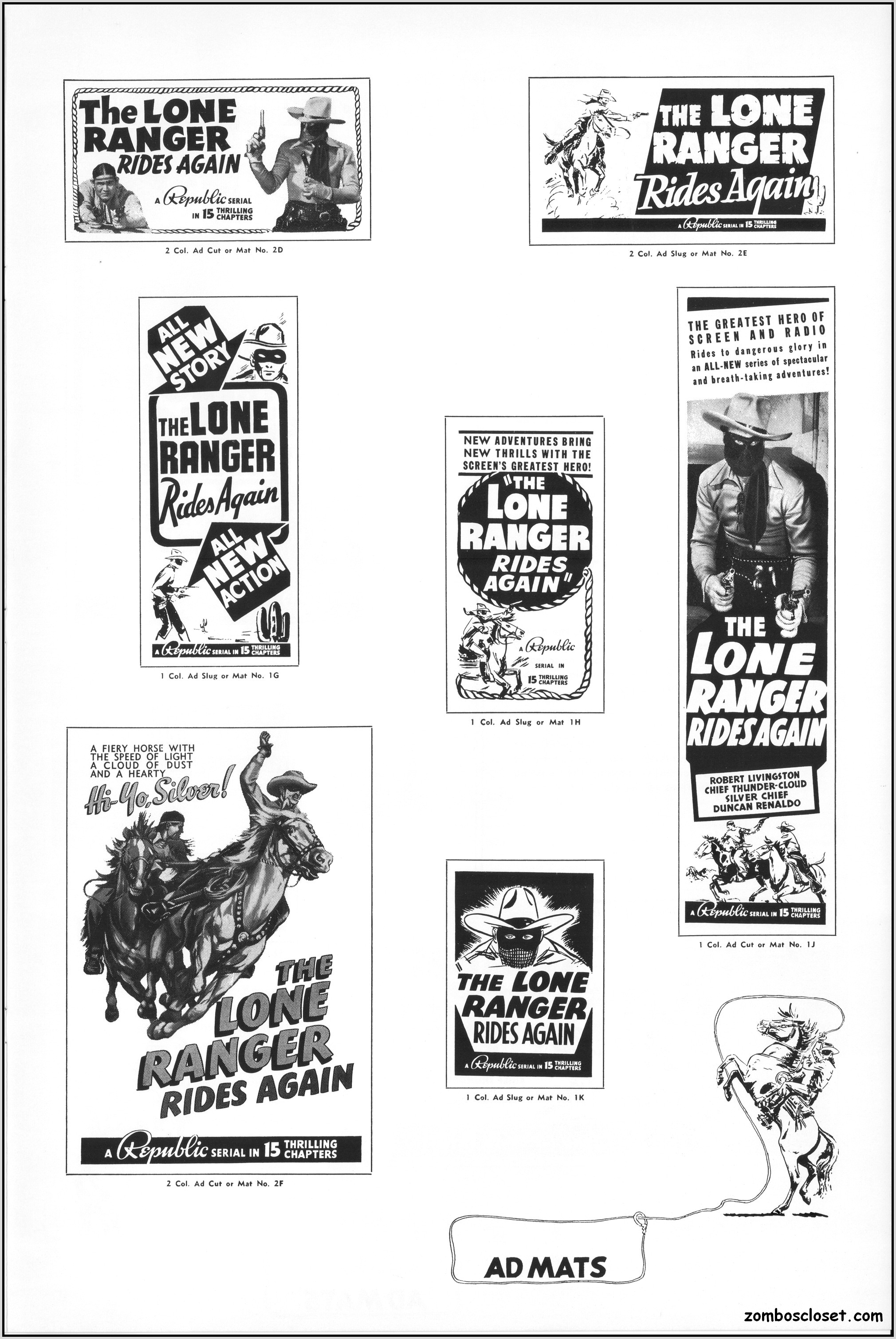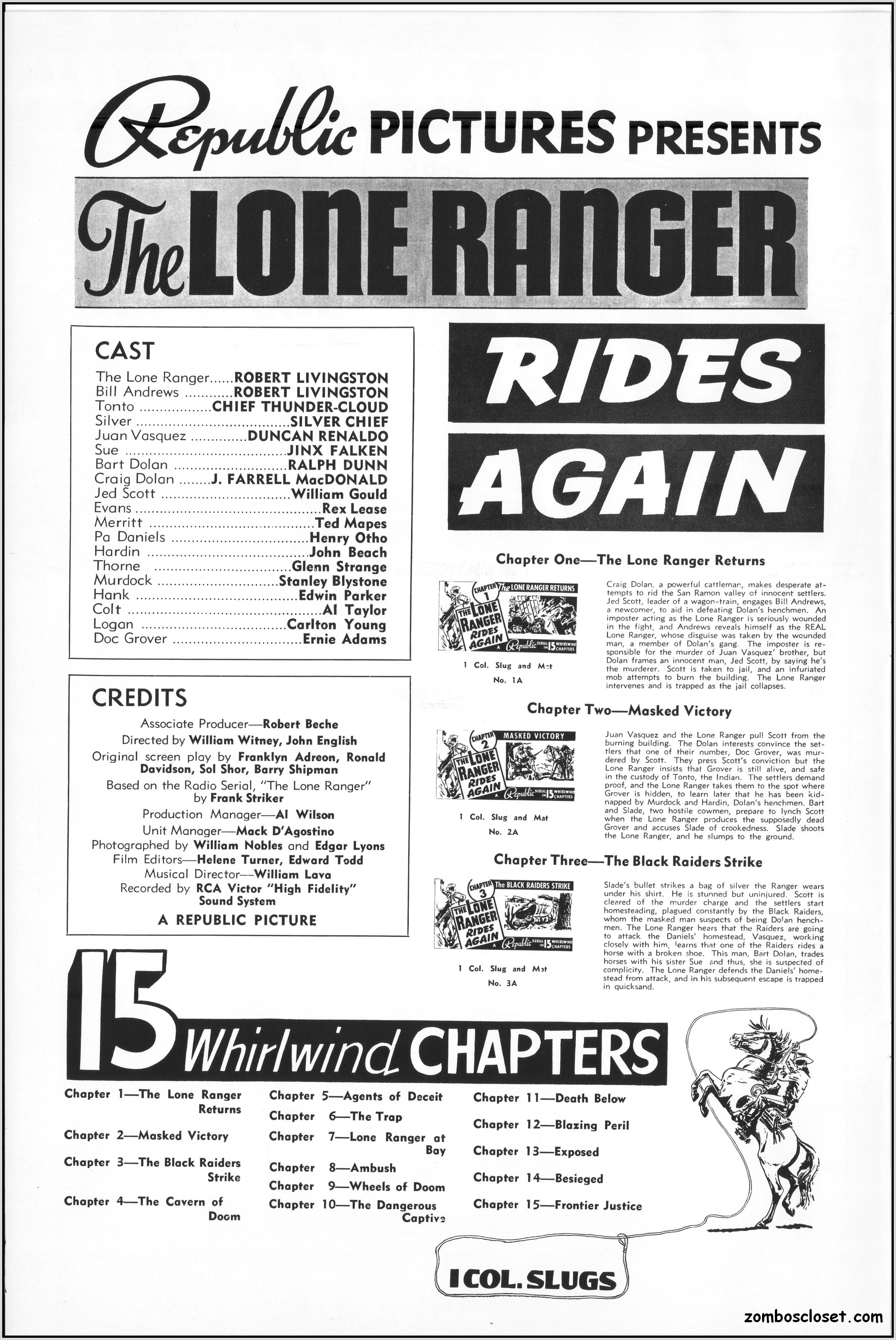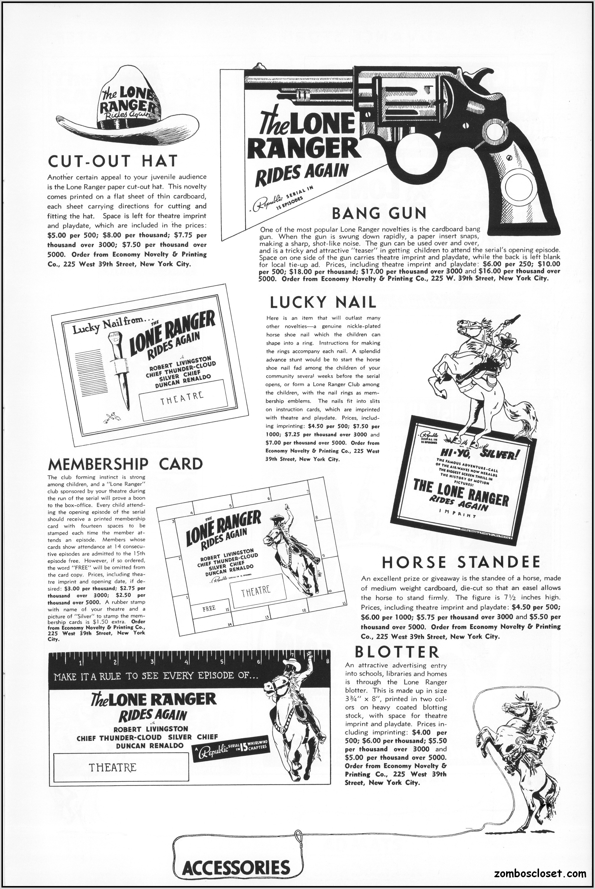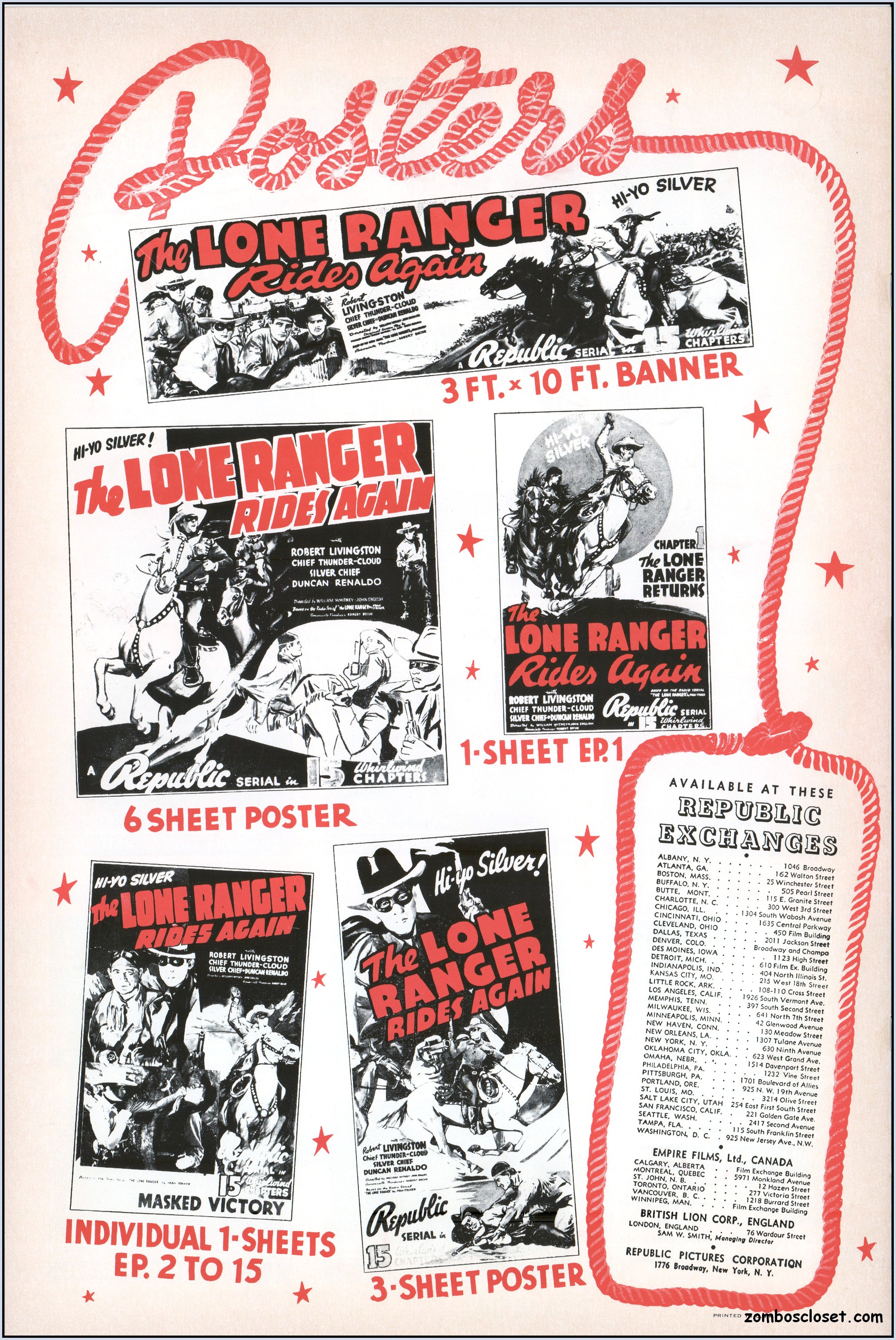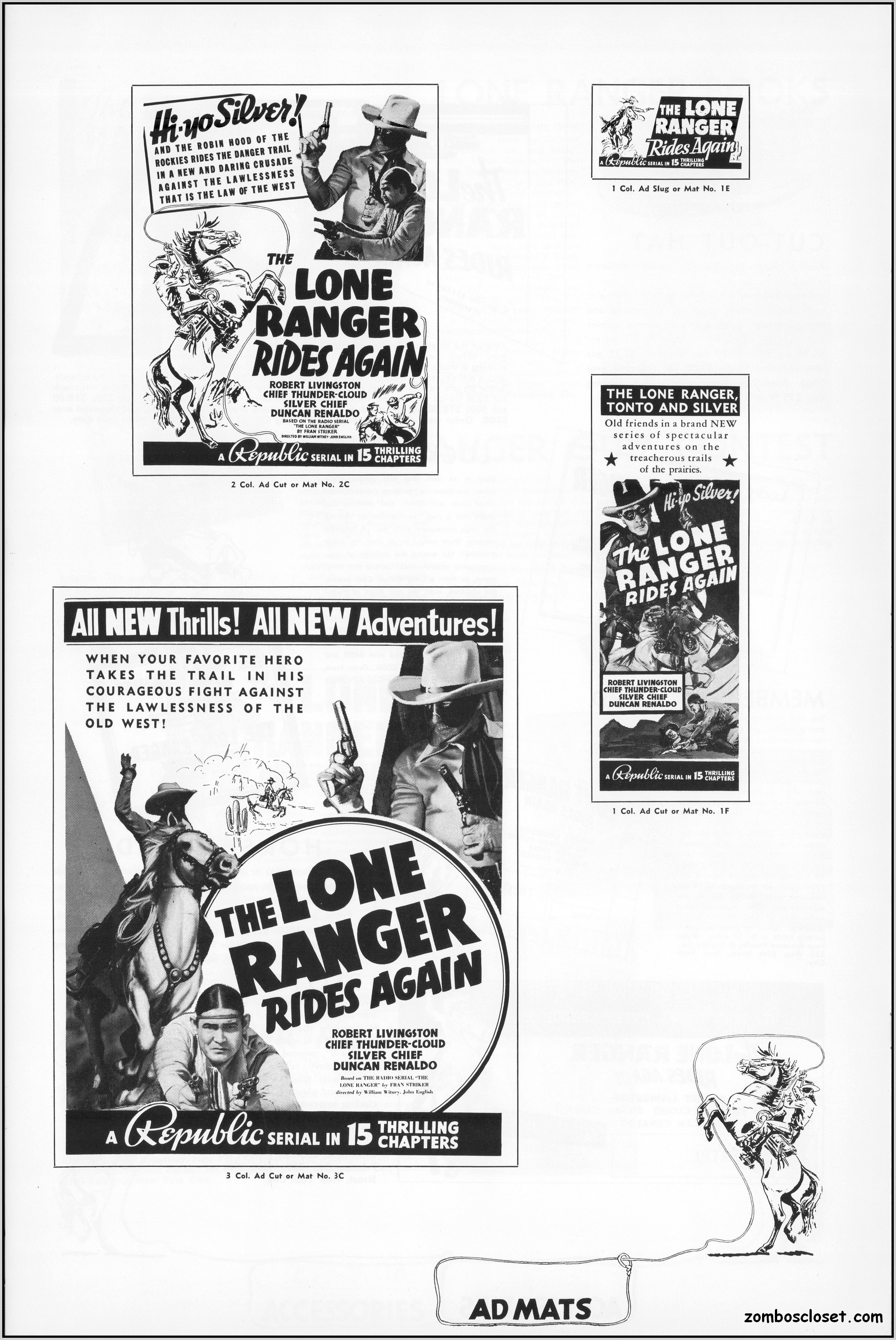 Here's is the tribute reproduction pressbook for The Lone Ranger Rides Again, produced by Jack Mathis in the 1970s. His tribute pressbooks pop up now and then in auctions that list them as the originals (he really did a good job), but his produced versions have slight differences. In this one, the inside covers are not in color, whereas the 1939 pressbook's are. I came to the Lone Ranger through the television show with Clayton Moore as the masked ranger and Jay Silverheels as Tonto. If you've seen the awful 2013 mess of a movie with Johnny Depp as Tonto, you haven't seen the real thing. While the television series was aimed at a young audience, they kept the relationship between the Lone Ranger and Tonto on a fairly equal footing, with both men relying on each other through trust and a strong ethical code. Funny, but the other important duo from television, Jim West and Artemis Gordon from The Wild Wild West also got screwed on the big screen with poor casting, poor scripting, and yet another cantankerous relationship that never existed in the original. What's it with Hollywood thinking friction-filled relationships are the only way to go big screen with characters like these?