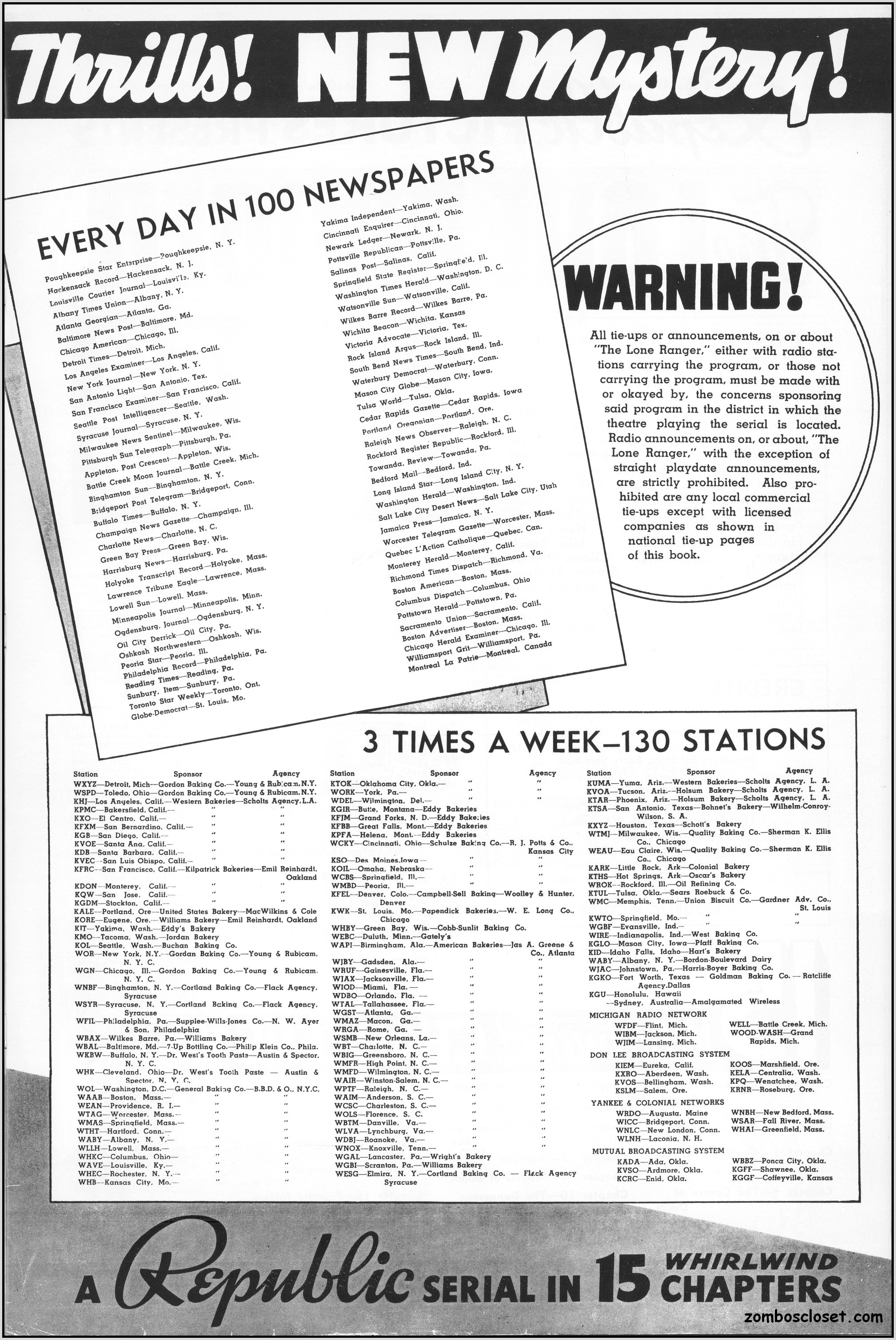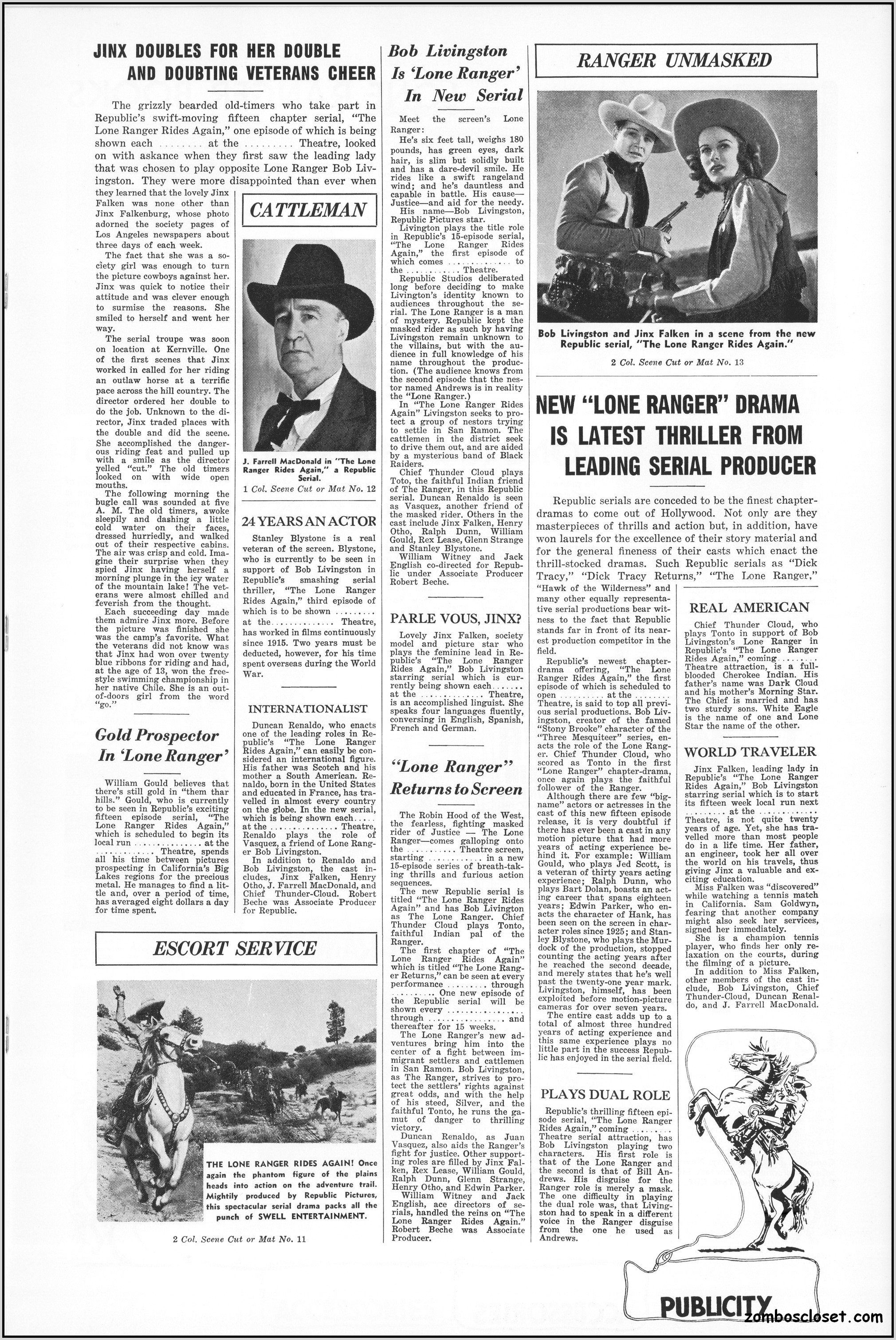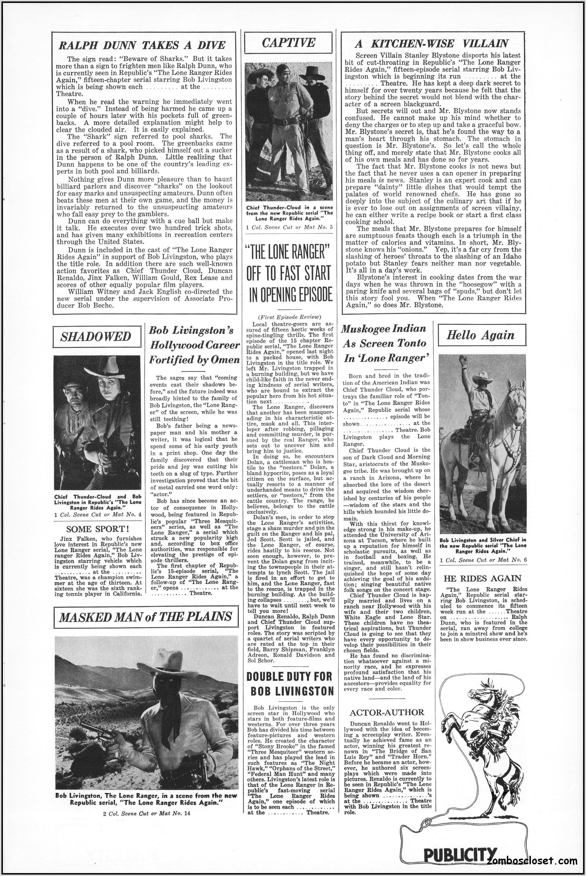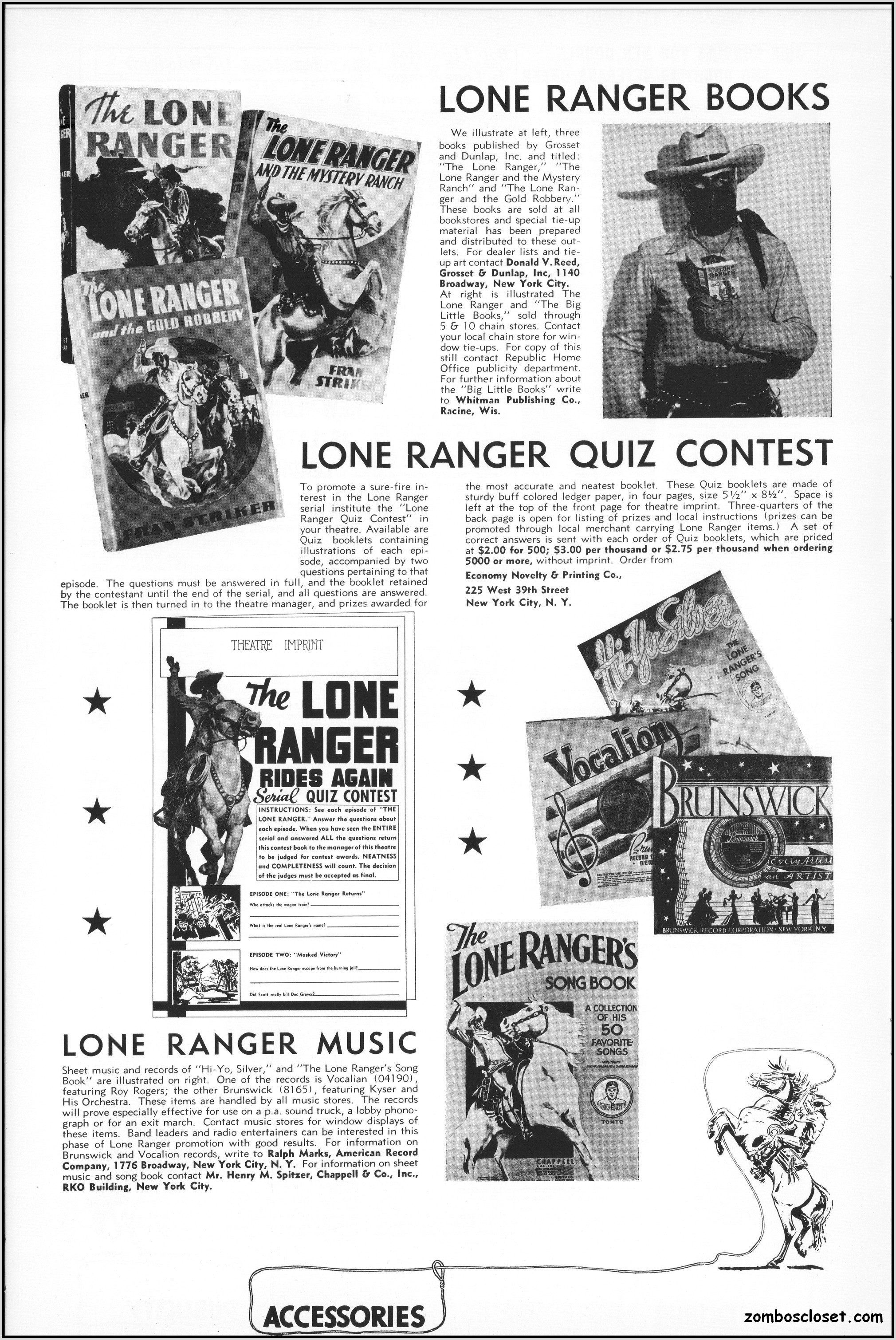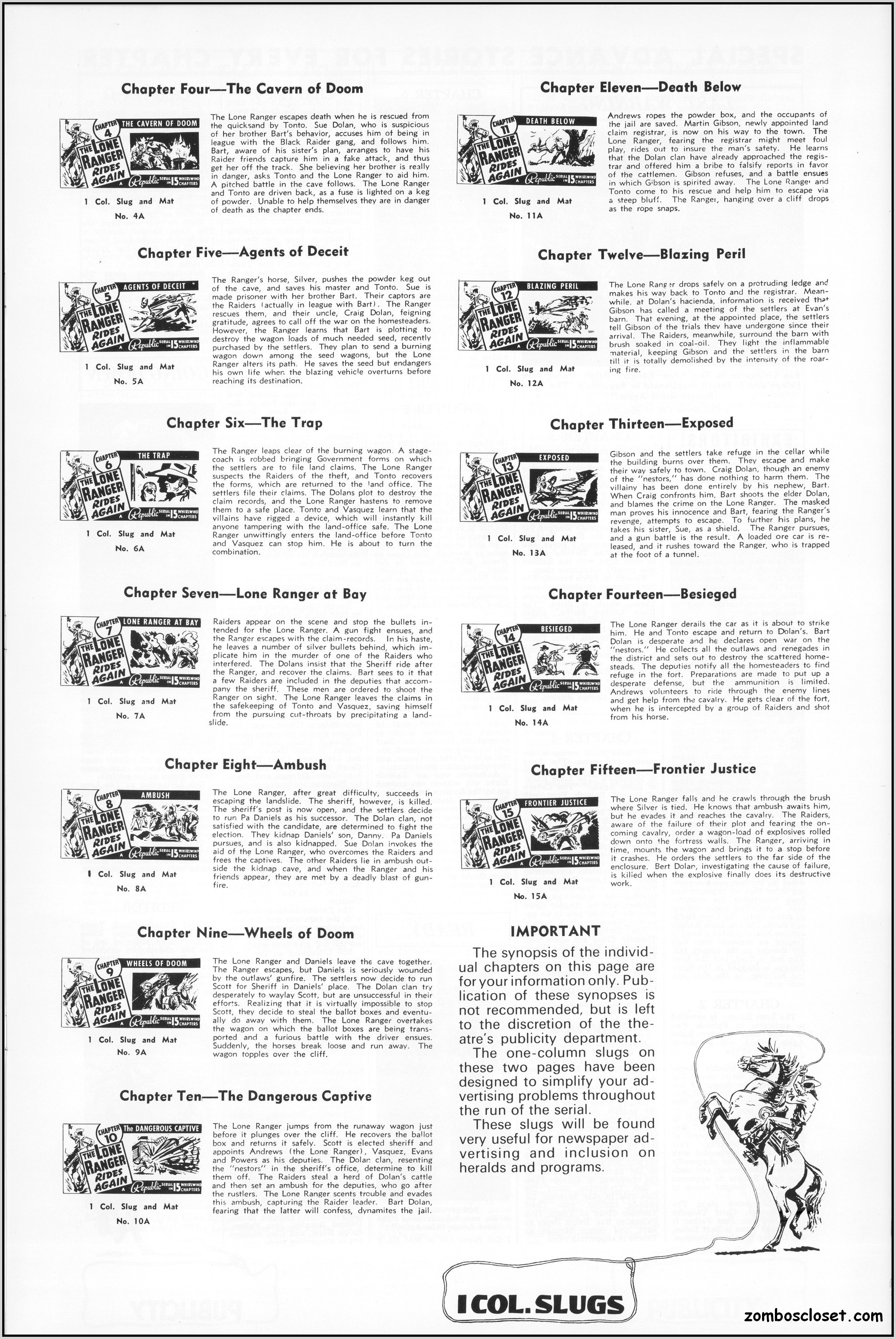 Here's is the tribute reproduction pressbook for The Lone Ranger Rides Again, produced by Jack Mathis in the 1970s. His tribute pressbooks pop up now and then in auctions that list them as the originals (he really did a good job), but his produced versions have slight differences. In this one, the inside covers are not in color, whereas the 1939 pressbook's are. I came to the Lone Ranger through the television show with Clayton Moore as the masked ranger and Jay Silverheels as Tonto. If you've seen the awful 2013 mess of a movie with Johnny Depp as Tonto, you haven't seen the real thing. While the television series was aimed at a young audience, they kept the relationship between the Lone Ranger and Tonto on a fairly equal footing, with both men relying on each other through trust and a strong ethical code. Funny, but the other important duo from television, Jim West and Artemis Gordon from The Wild Wild West also got screwed on the big screen with poor casting, poor scripting, and yet another cantankerous relationship that never existed in the original. What's it with Hollywood thinking friction-filled relationships are the only way to go big screen with characters like these?