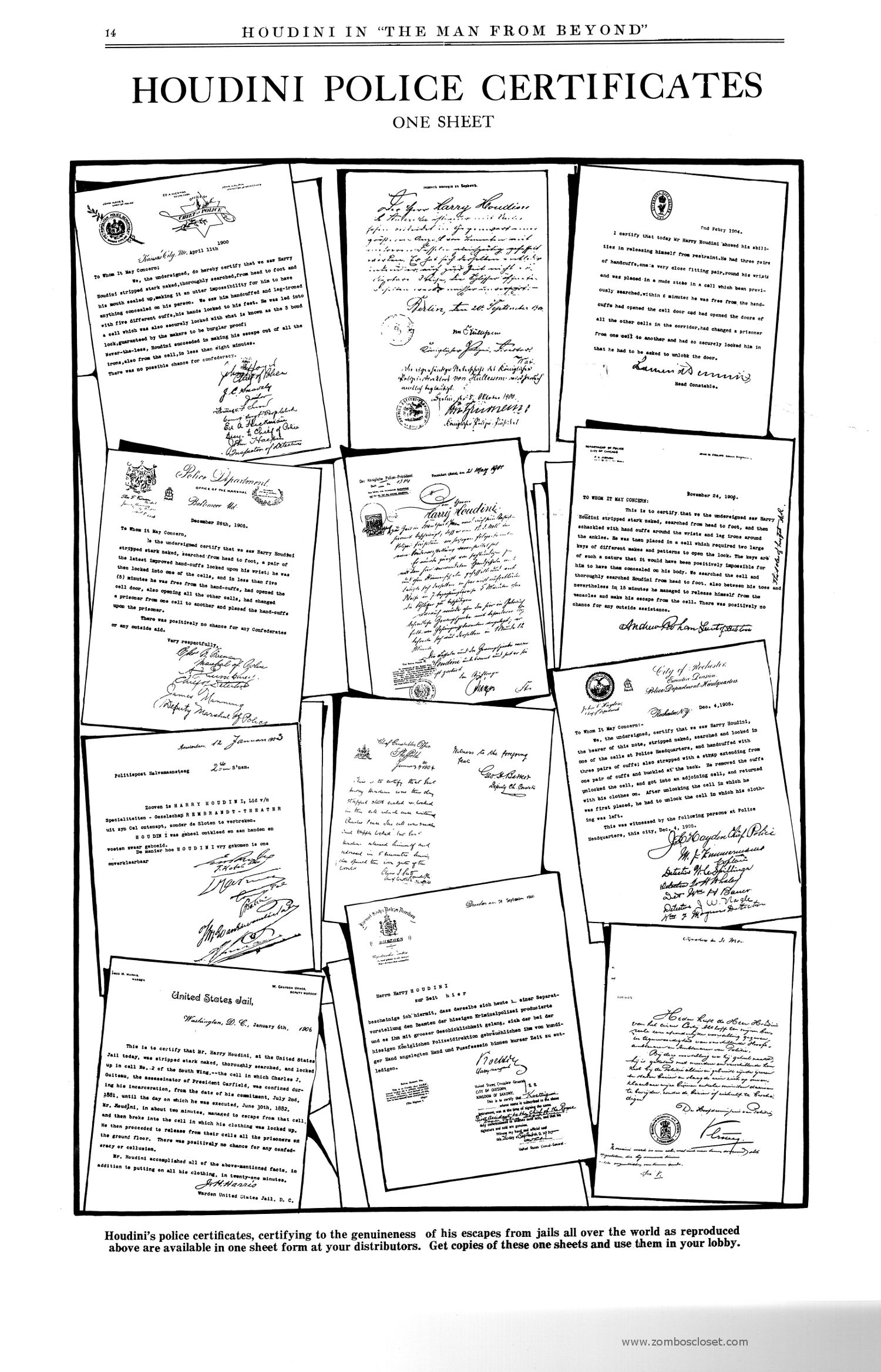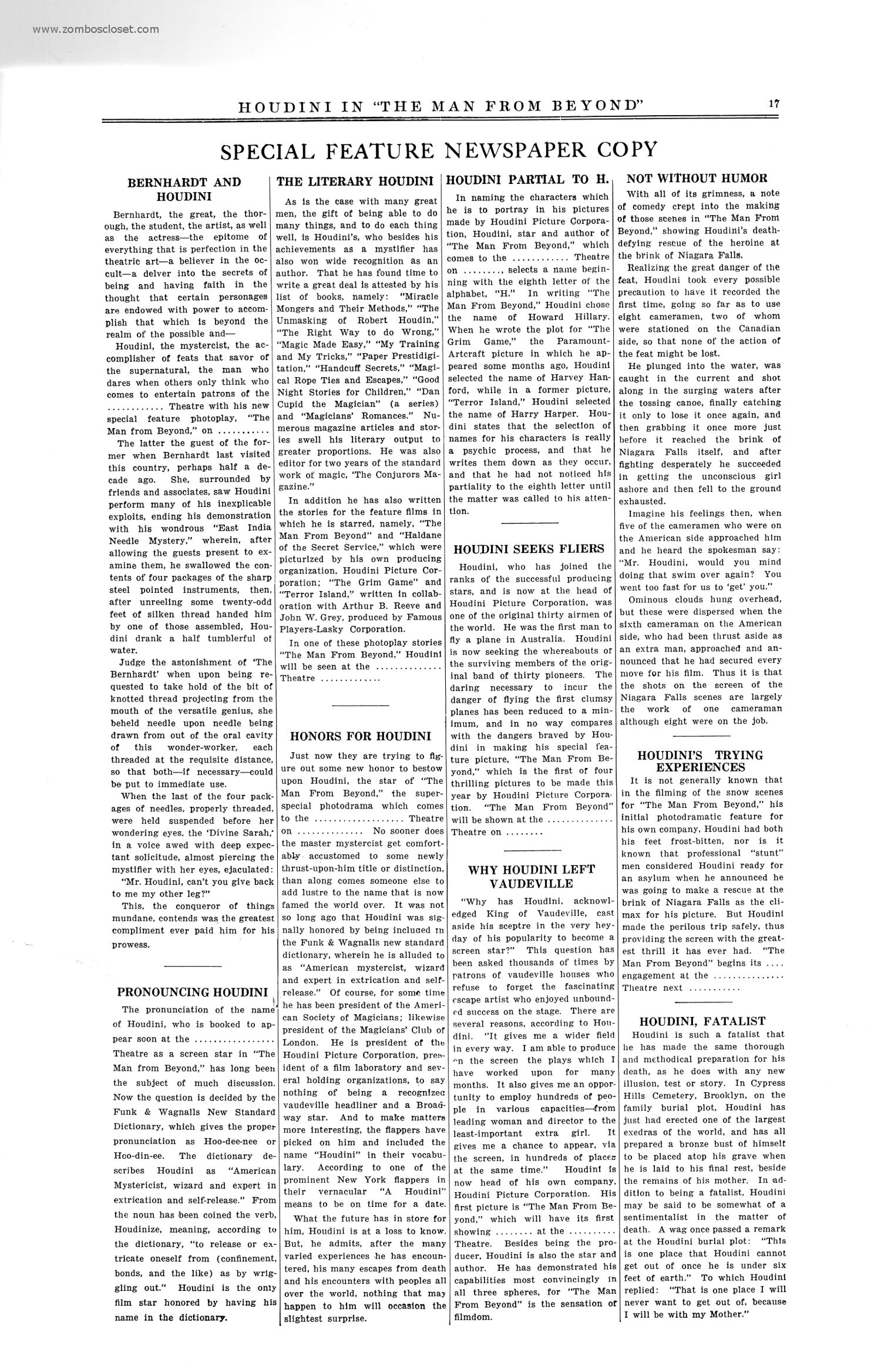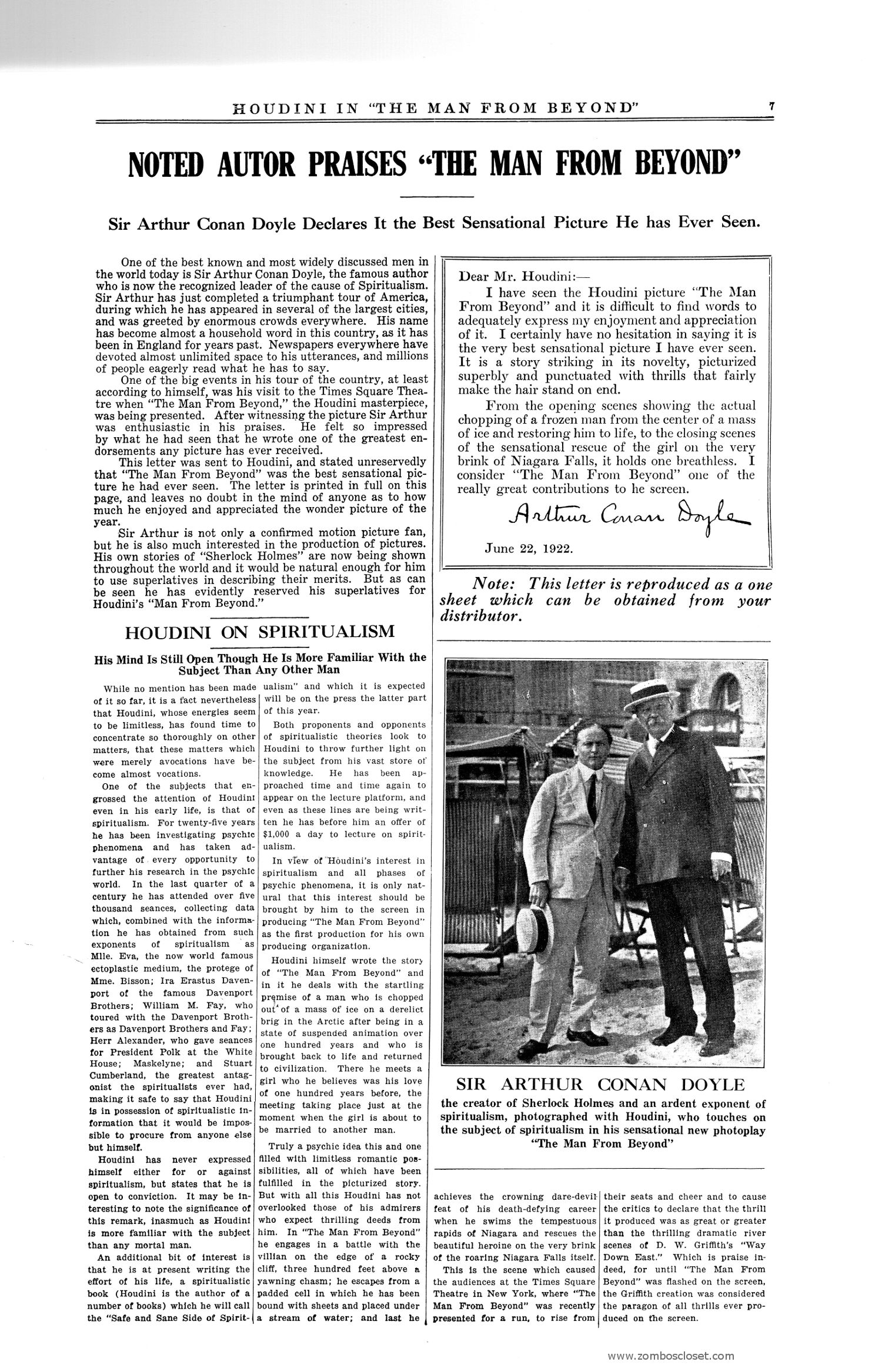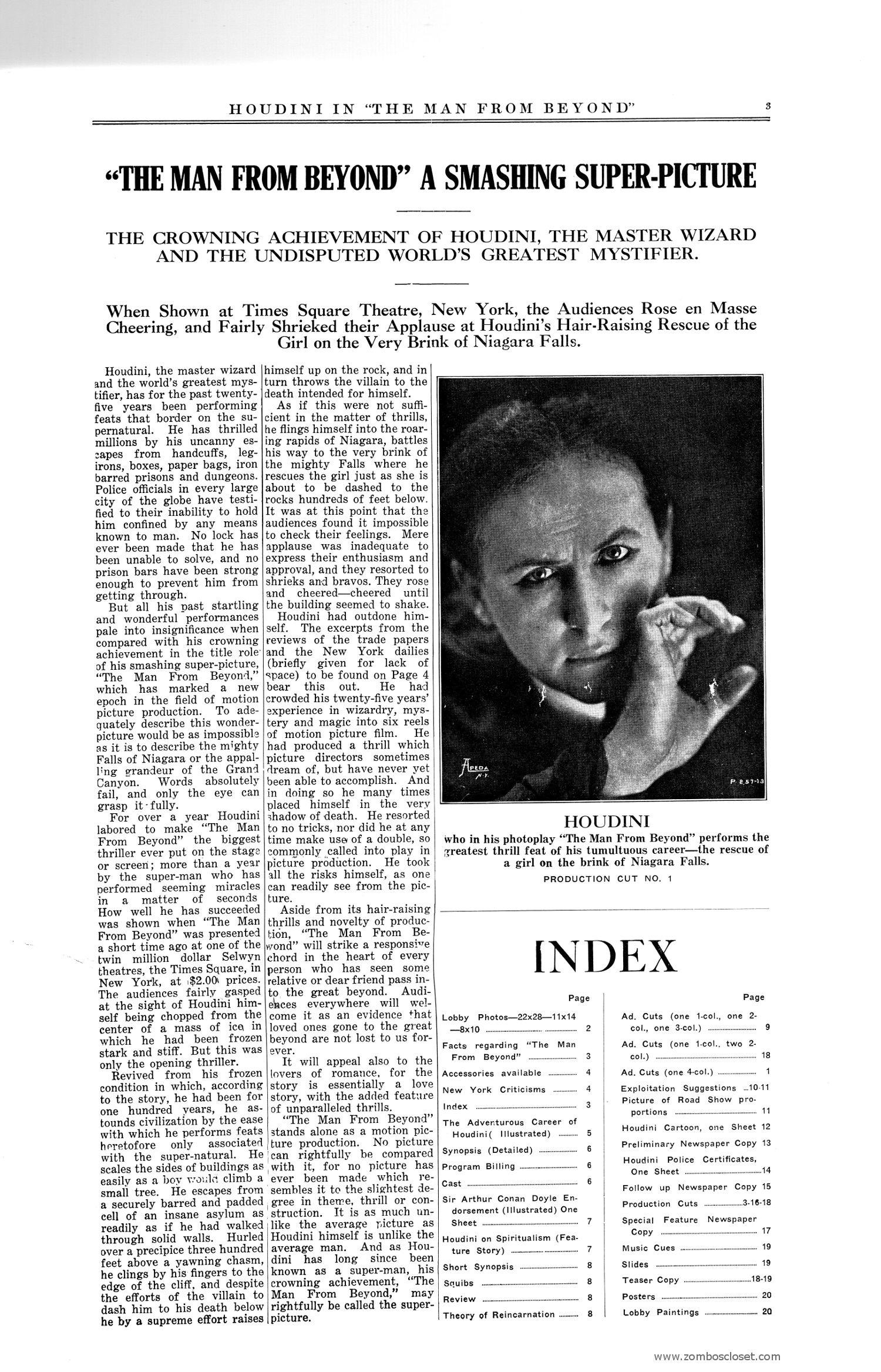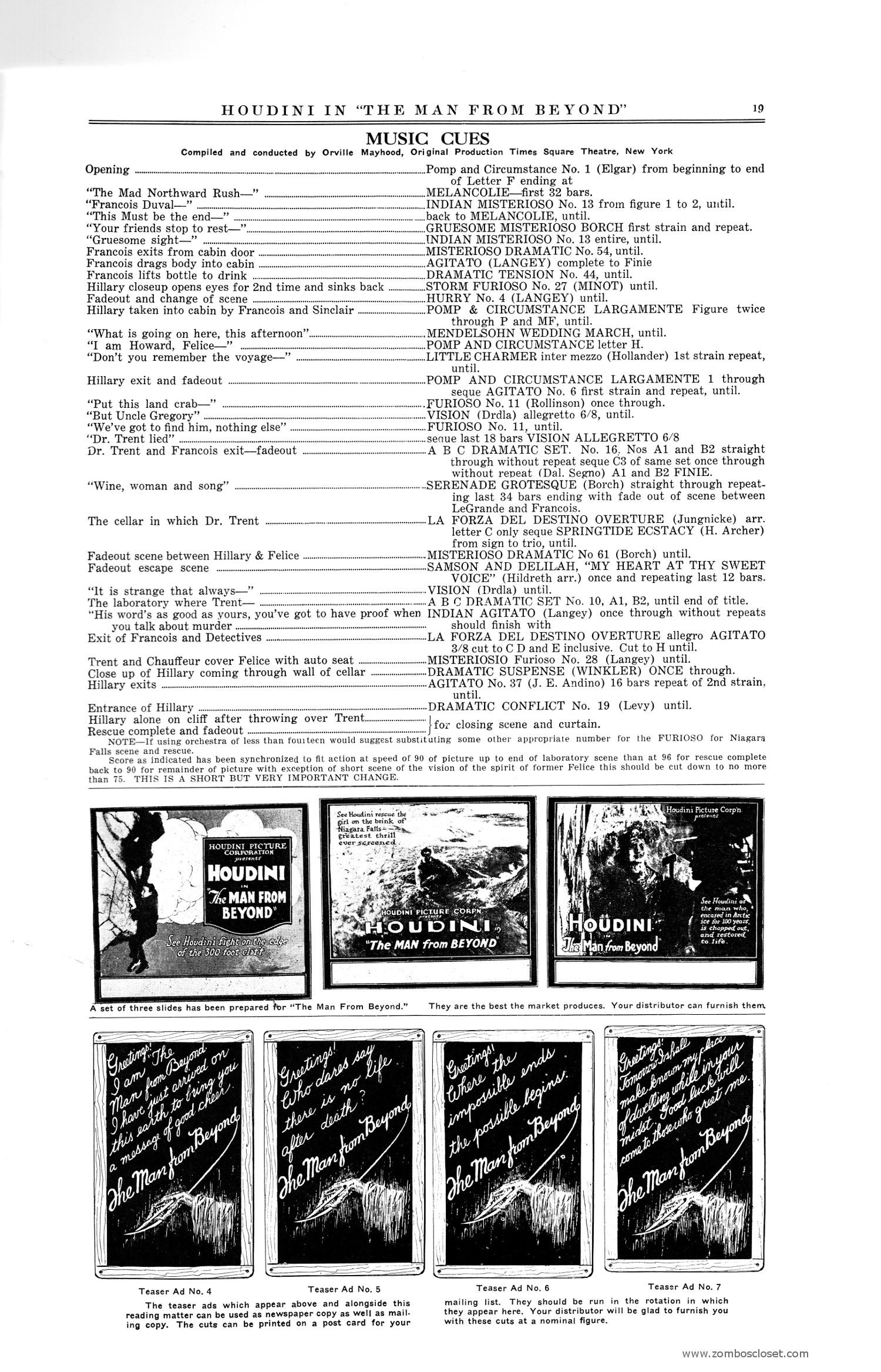 Being an amateur magician, it's only natural I'd take a strong liking to Houdini and his exploits. Among his many accomplishments as a showman was his interest in early cinema. Unfortunately, while he excelled in the exciting escapes, he did have a problem with showing romance and kissing on camera. So as a leading man he fell short in that department. Here's a reproduction of the pressbook for Houdini in The Man From Beyond. Of particular interest is the testimonial by Sir Arthur Conan Doyle on page 7 and the music cues on page 19. Since this was a silent picture, music accompaniment would have been essential.