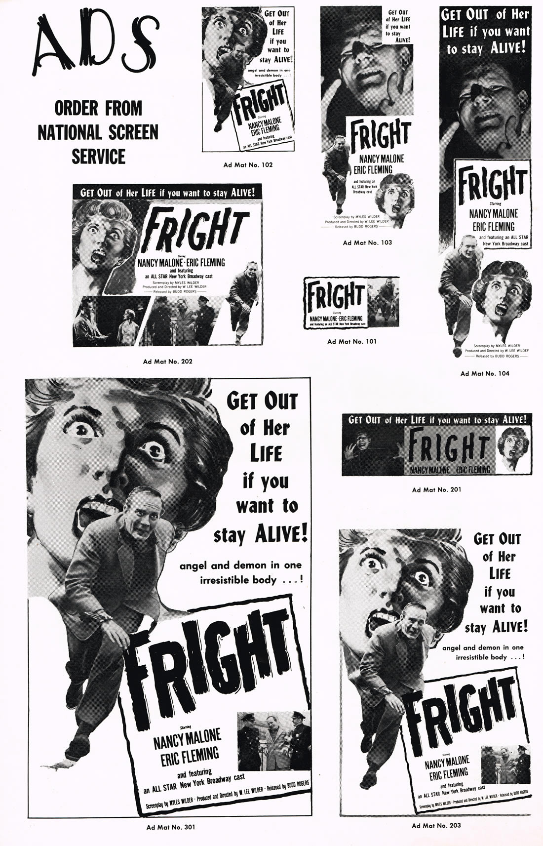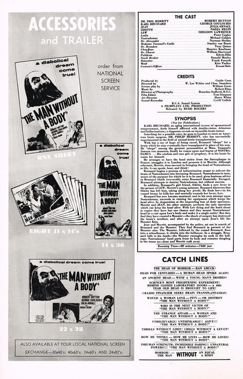 An interesting pressbook for The Man Without a Body (1957) and Fright (1956), "the twin terror show that tops them all." The cover is a quick cut and past job, but it does the trick, and there are two 4-page inserts, one for each movie, and each 11 x 17 inches in size.
