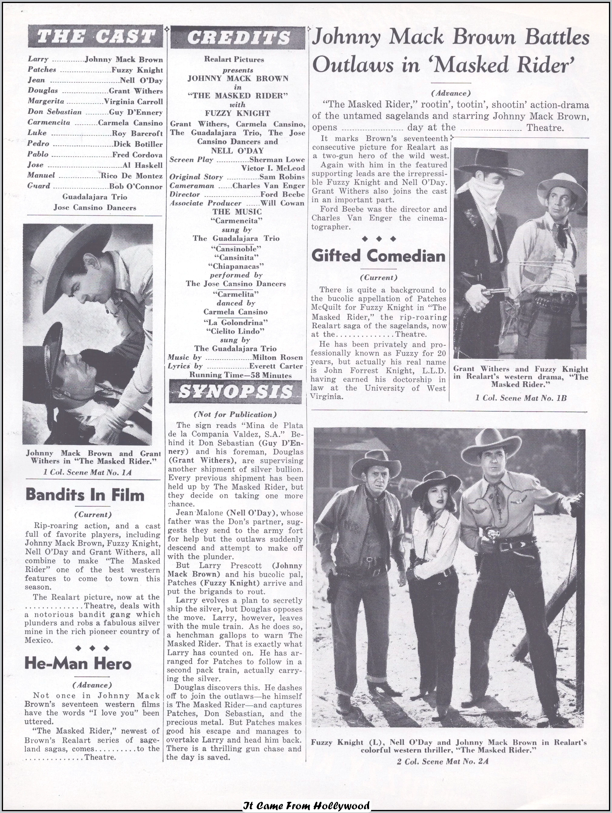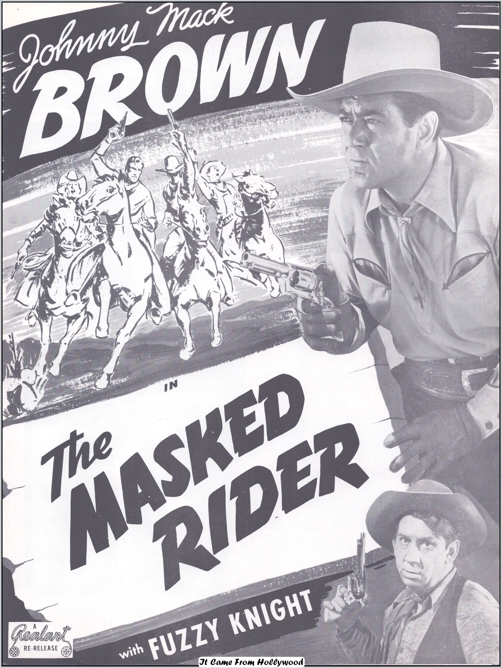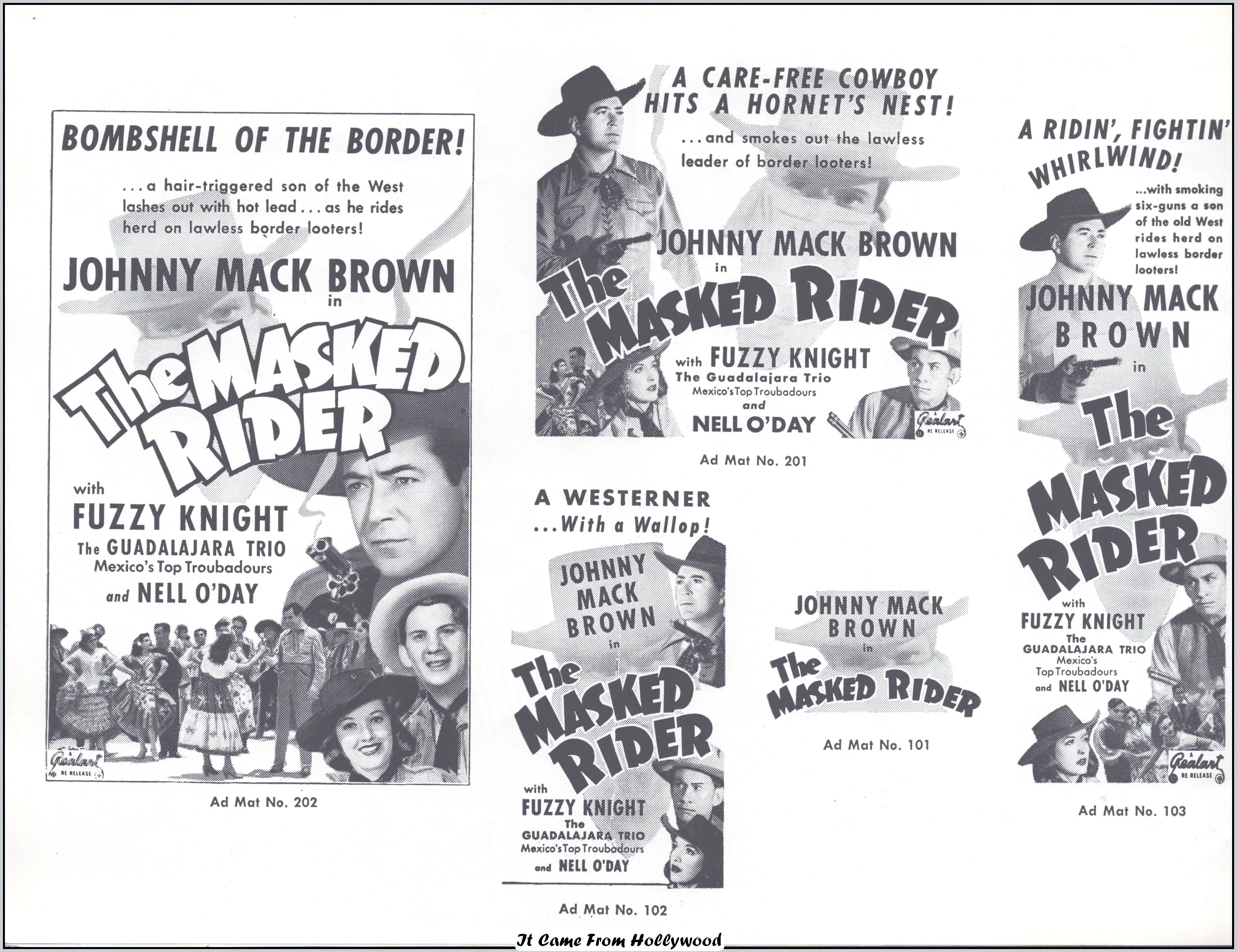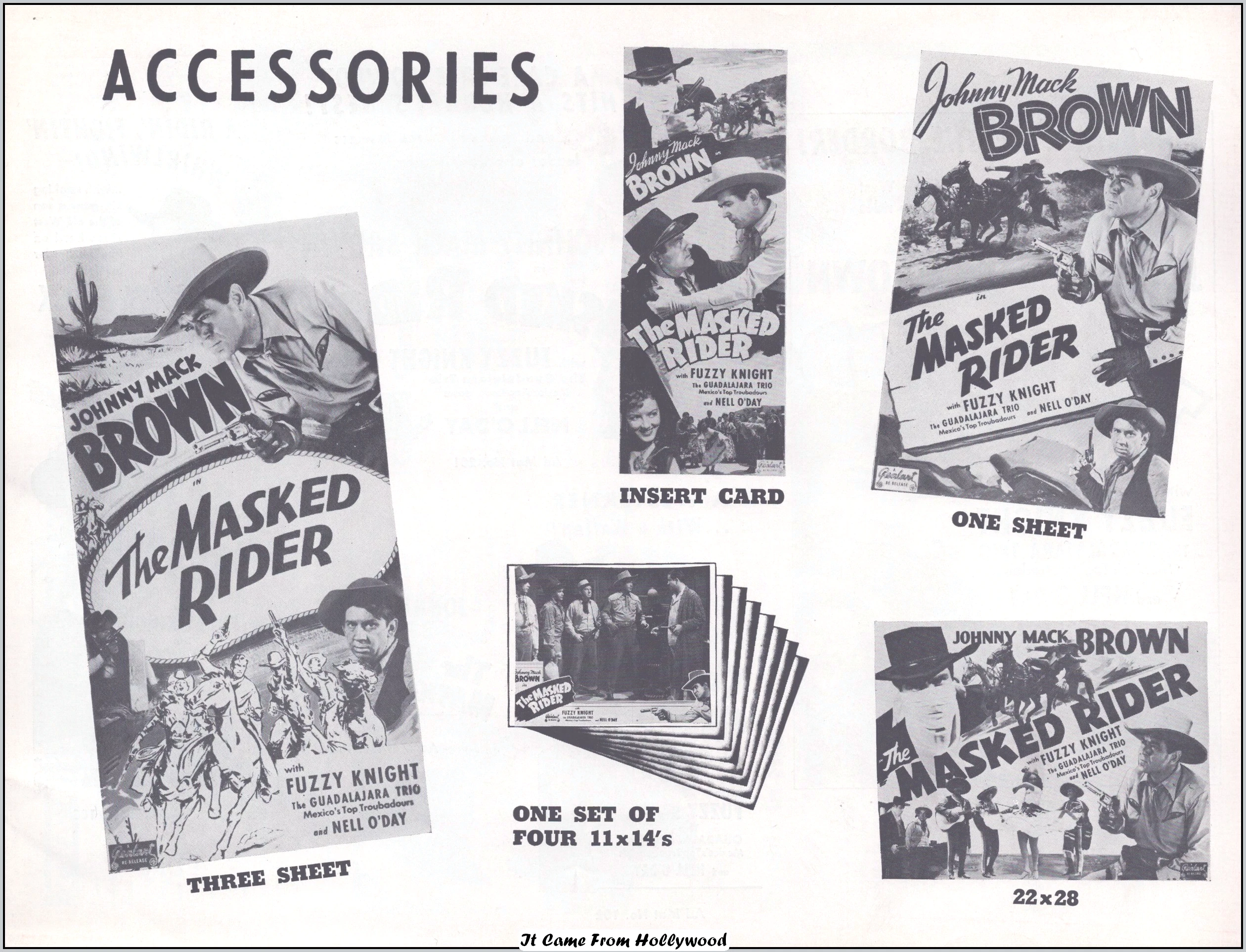It Came From Hollywood sends along this pressbook for Johnny Mack Brown’s The Masked Rider. Ford Beebe directed (Night Monster, Flash Gordon Conquers the Universe). Beebe preferred directing westerns, which were the staple movies for many studios at the time. Then the 1950s rolled around and science fiction took over (just like Woody getting sidelined by Buzz Lightyear in Toy Story). John Brown played in many westerns. His handsome mug got a choice spot on Wheaties cereal boxes in 1927, leading to Hollywood and a string of casting in top-liners until he was suddenly replaced during a 1931 movie, Laughing Sinners. According to b-westerns.com “Apparently Brown’s slow, southern drawl caused some problems when talkies arrived, and MGM opted not to renew his contract.” His career nose-dived and he changed his name to Johnny Mack Brown and starred in B-movie westerns, which made him quite popular.