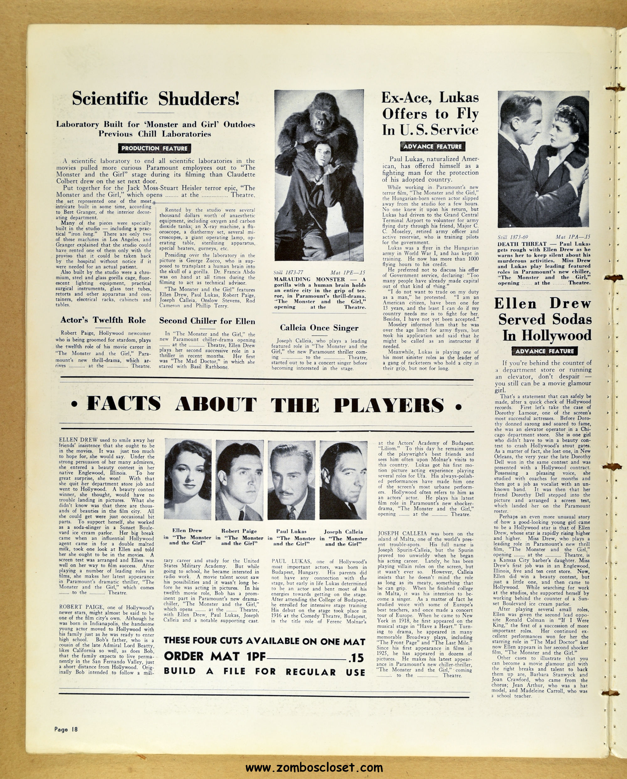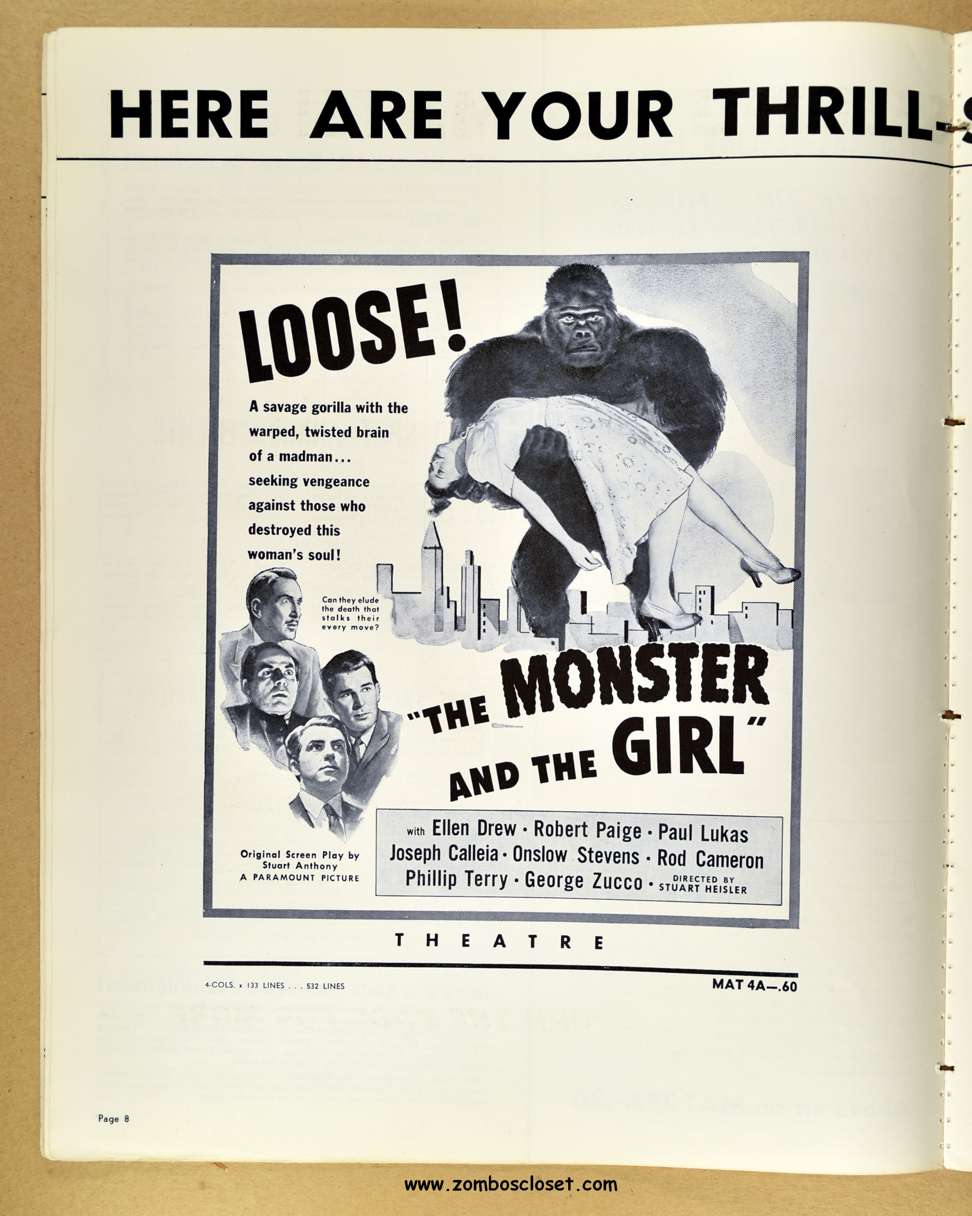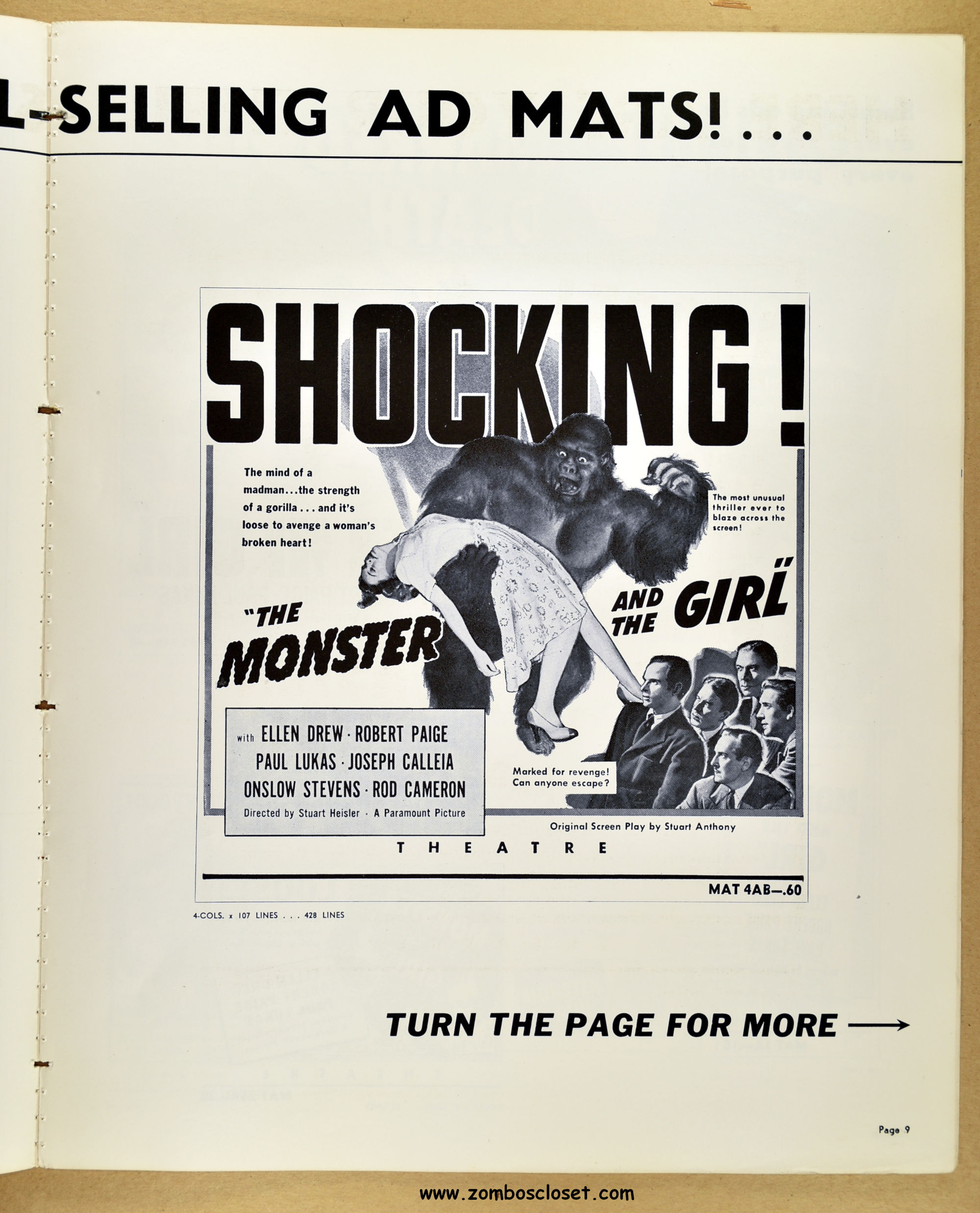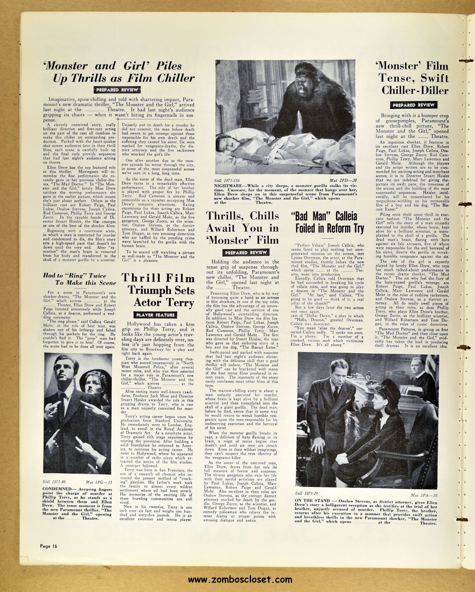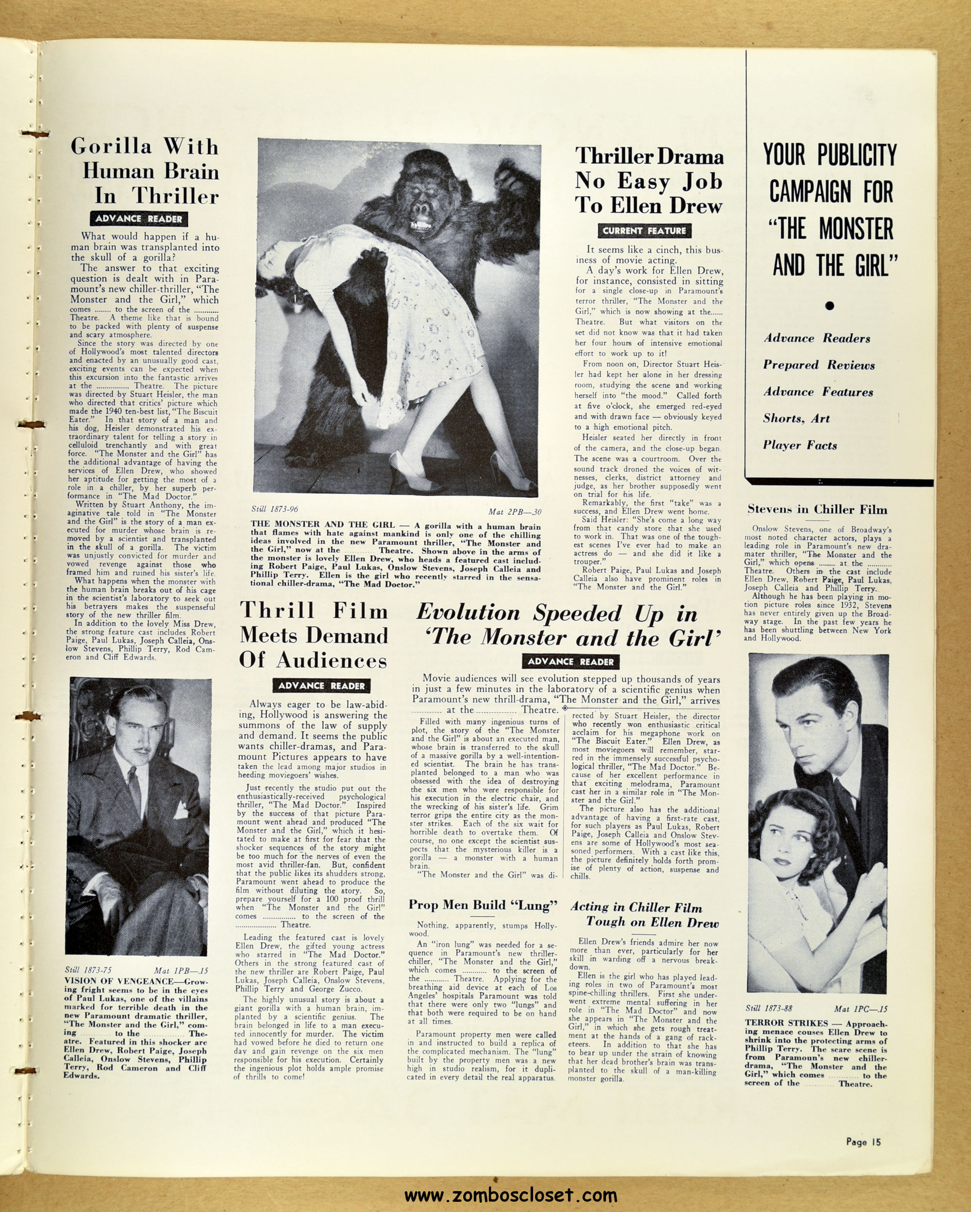A fascinating and entertaining blend of crime, noir, gorilla, and horror. Paramount's The Monster and the Girl starts off as a noir in tone and camerawork, but then ignores that and moves on to an ape-murdering-for-vengeance storyline. It gets my vote for the best man-in-gorilla-suit movie produced in the 1940s and possible the best, period. The story plays all the emotional angles, and tosses in a faithful dog for good measure (like in Man-Mad Monster, also released in 1941). There's something simply mesmerizing, odd, and sometimes head-scratching with the mad-scientist and gorilla cycle of horror movies, but this movie works it's magic and makes it, well, work! I highly recommend it. As for this pressbook, my word, it's amazing! The amount of promotion and article coverage reaches twenty packed pages.