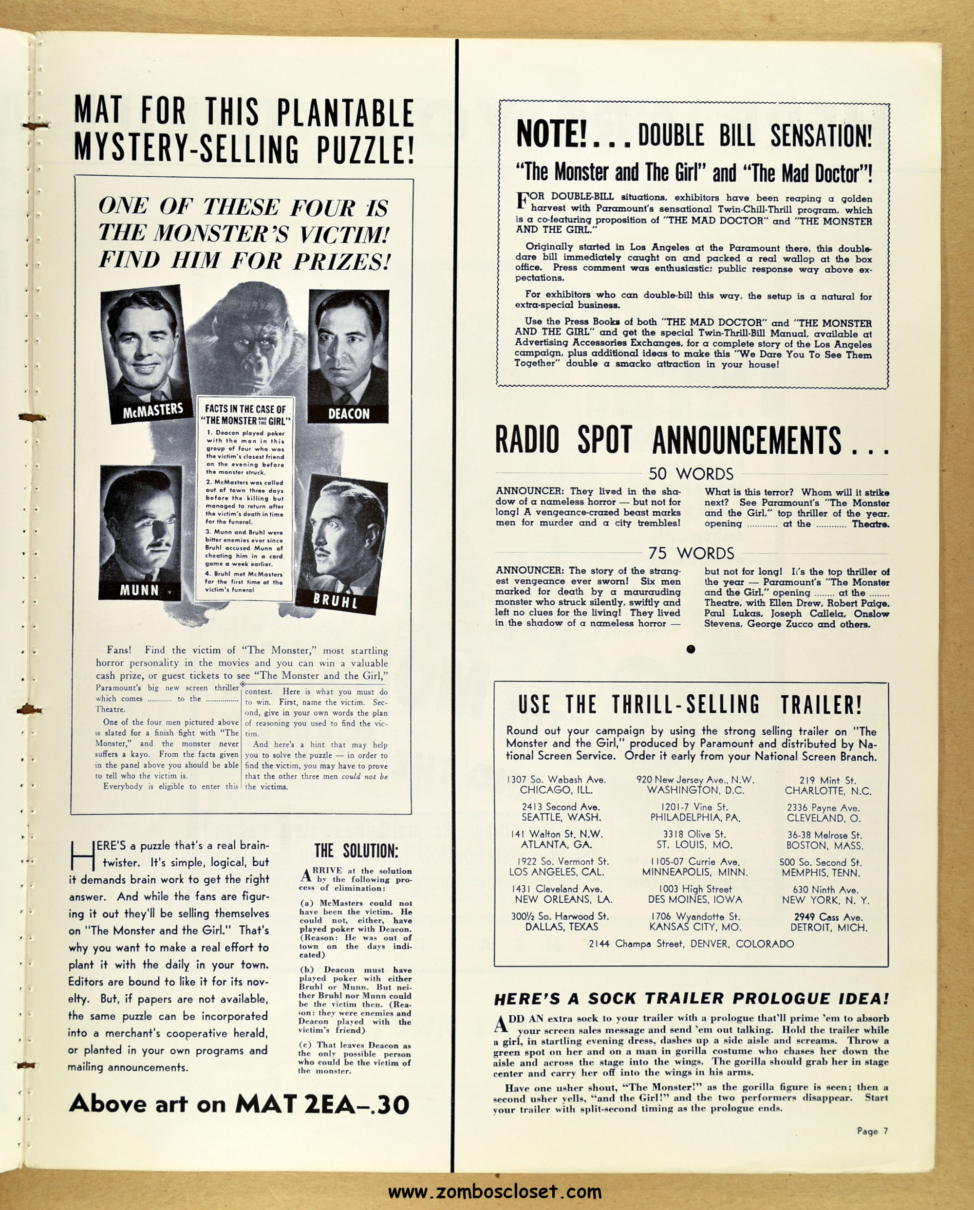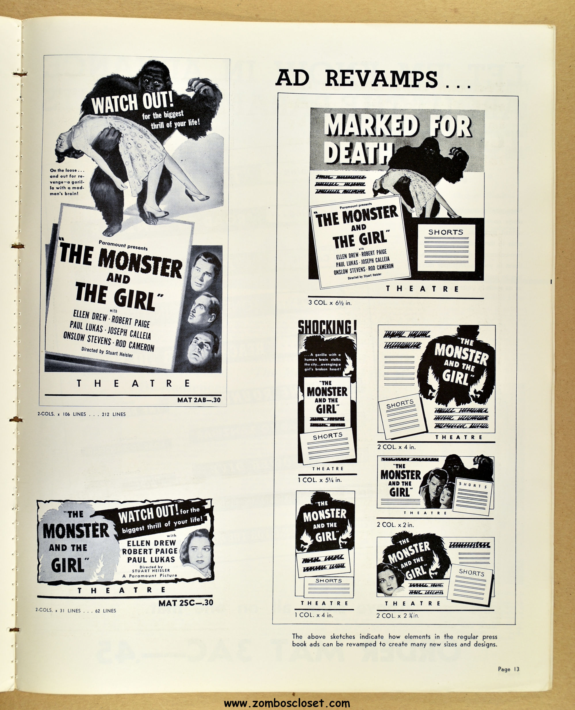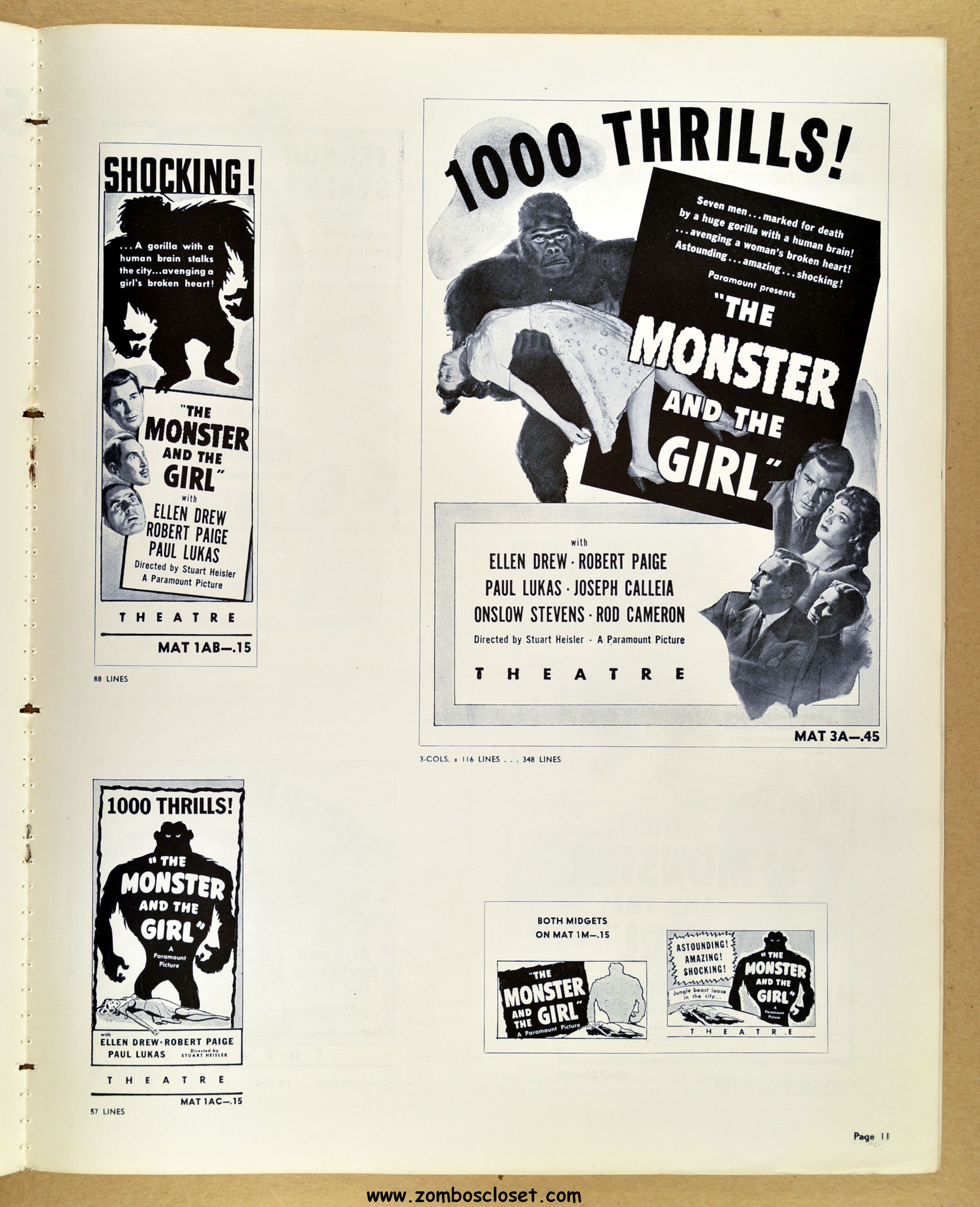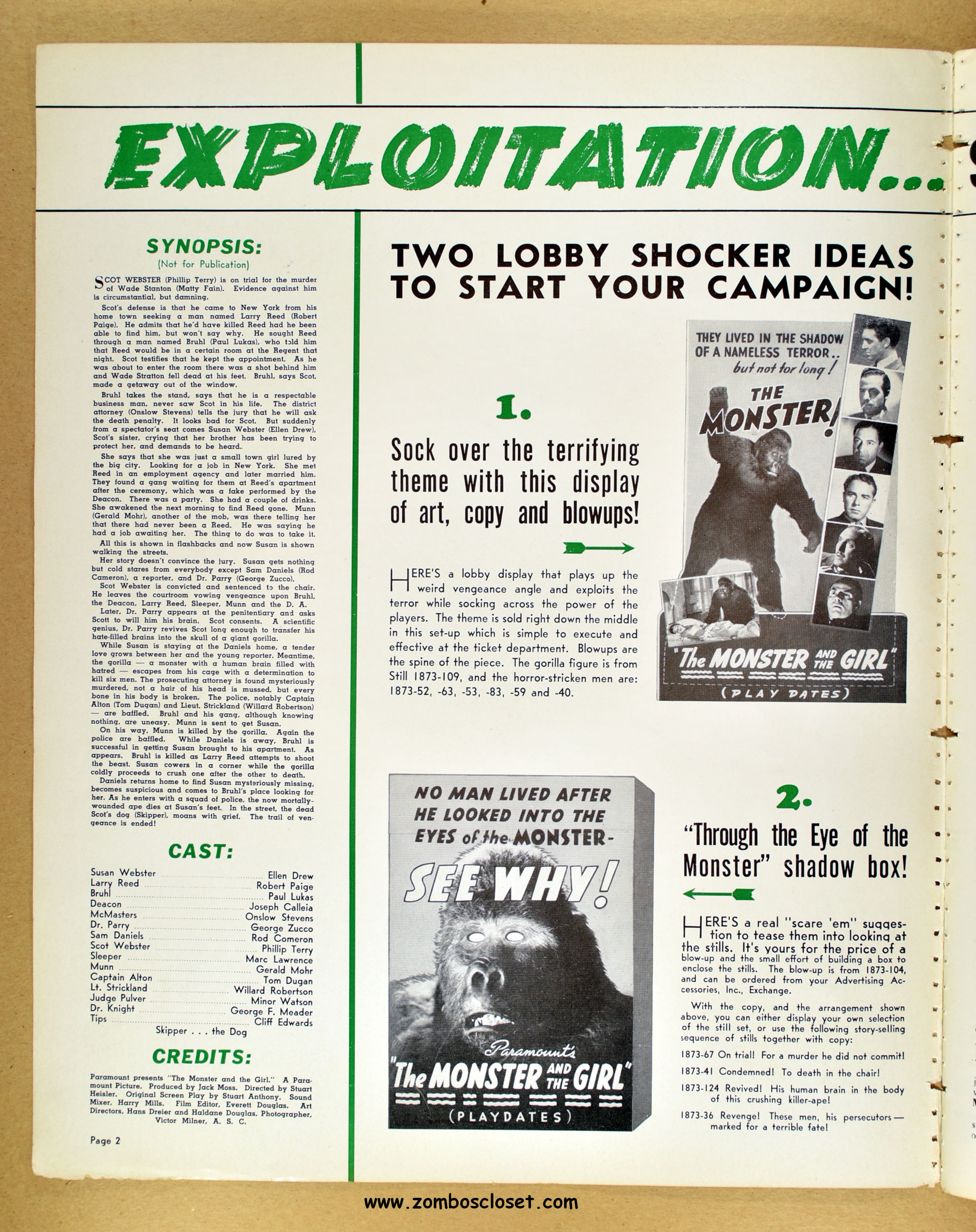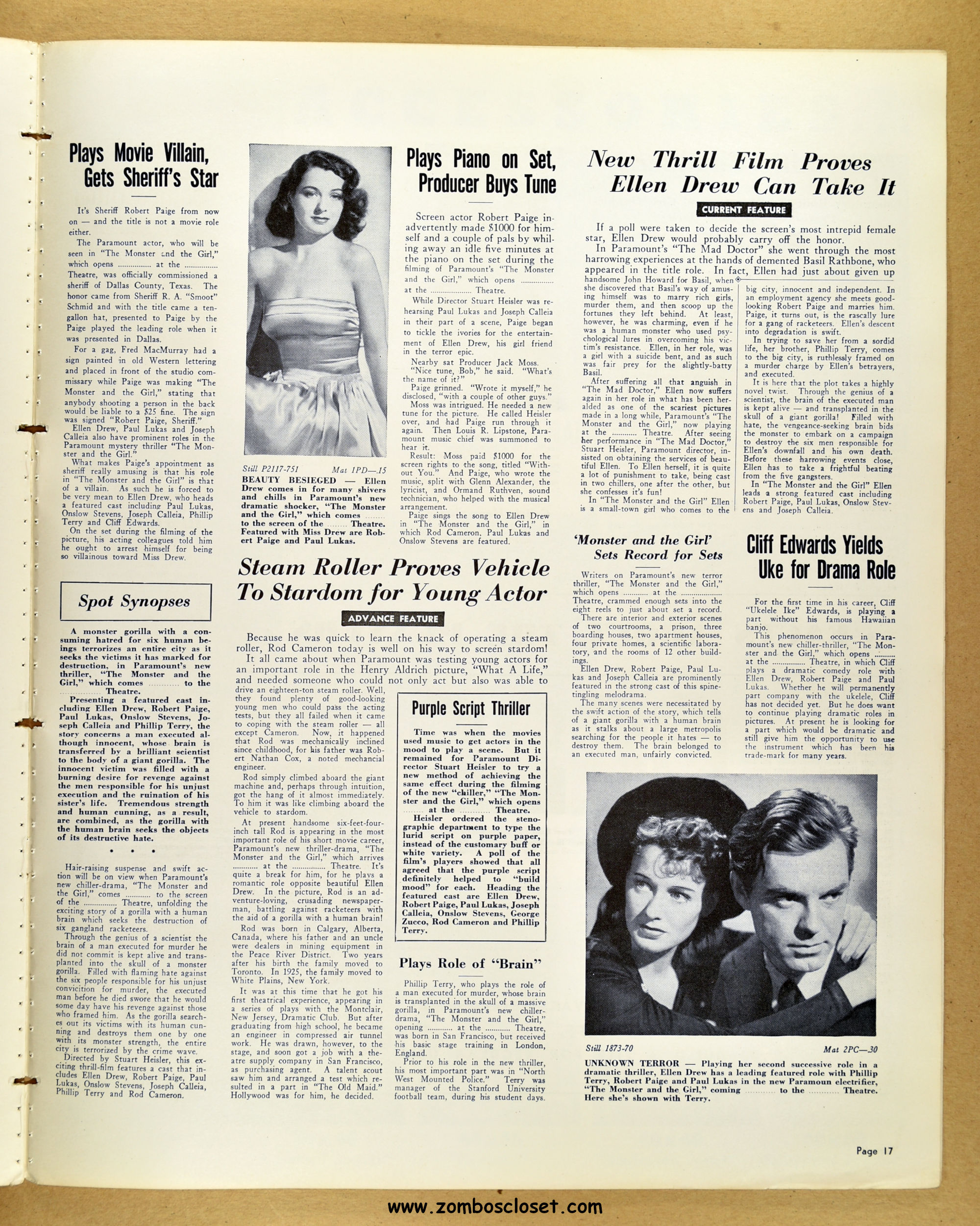 A fascinating and entertaining blend of crime, noir, gorilla, and horror. Paramount's The Monster and the Girl starts off as a noir in tone and camerawork, but then ignores that and moves on to an ape-murdering-for-vengeance storyline. It gets my vote for the best man-in-gorilla-suit movie produced in the 1940s and possible the best, period. The story plays all the emotional angles, and tosses in a faithful dog for good measure (like in Man-Mad Monster, also released in 1941). There's something simply mesmerizing, odd, and sometimes head-scratching with the mad-scientist and gorilla cycle of horror movies, but this movie works it's magic and makes it, well, work! I highly recommend it. As for this pressbook, my word, it's amazing! The amount of promotion and article coverage reaches twenty packed pages.