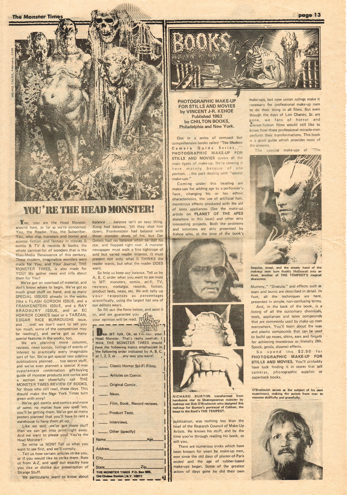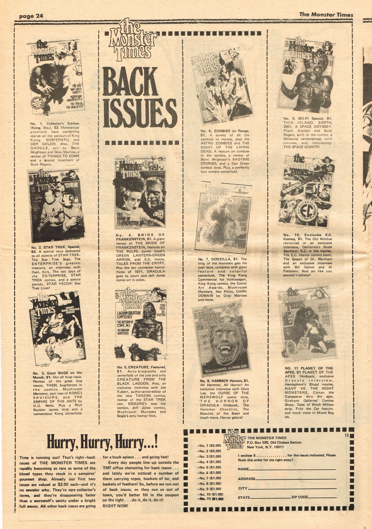 In this issue more Apes coverage with a behind the scenes look at Planet of the Apes, Gorgo discovers The Monster Times, The Steranko History of Comics is reviewed, TMT apologizes for screwing up ownership of the naughty I Drink Your Blood and I Eat Your Skin (while continuing to go rabid over both movies), and horror host Seymour appears again.