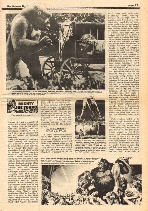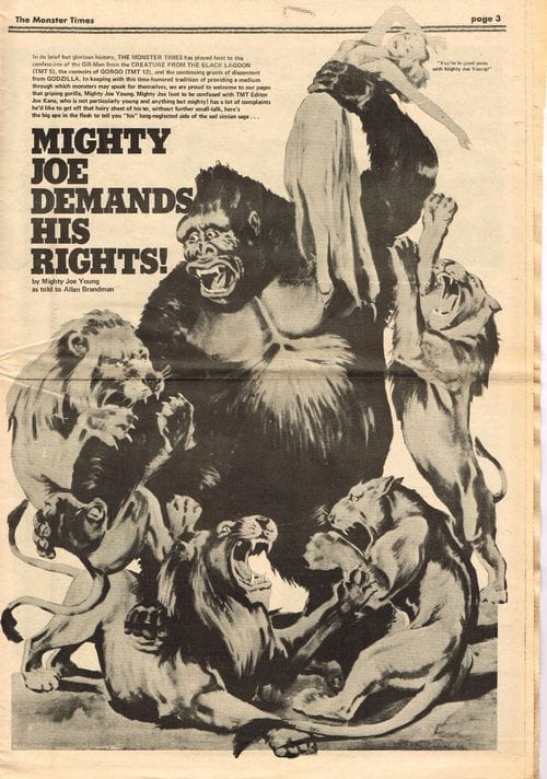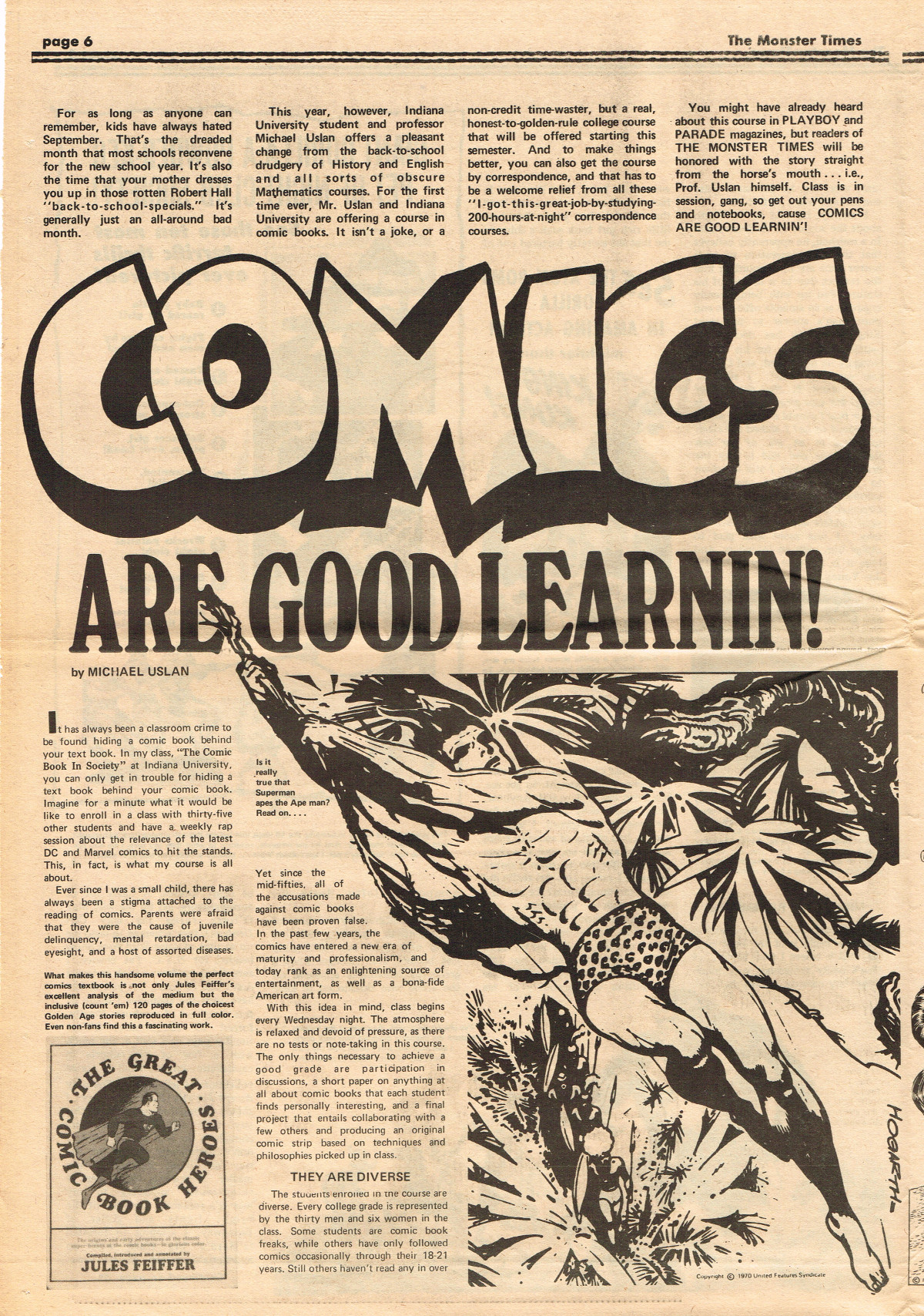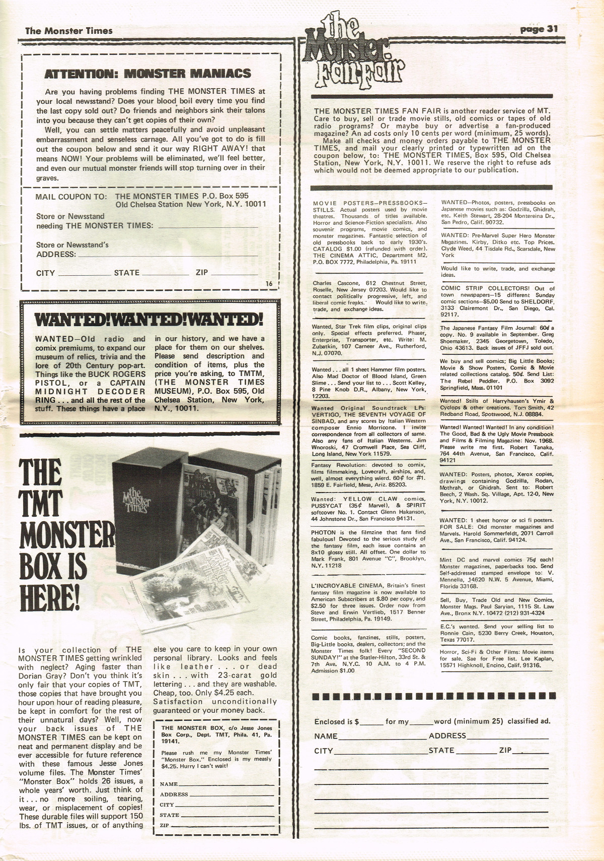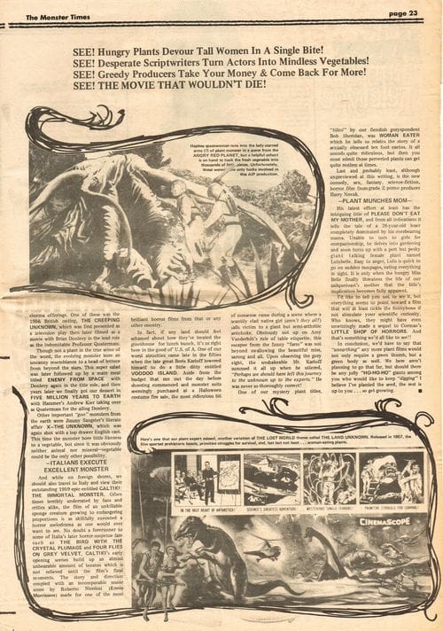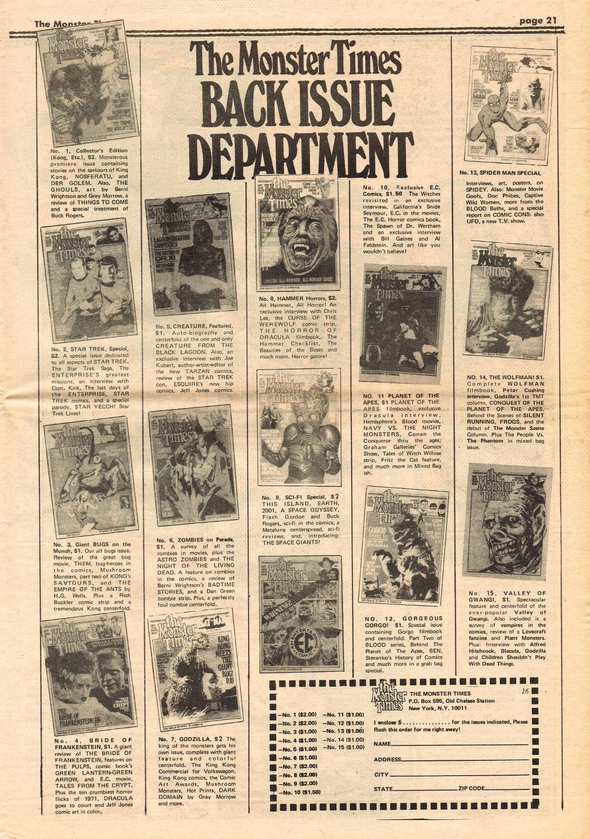 By issue 16 of The Monster Times it was fairly apparent that this tabloid-sized monster magazine was well executed and keeping pace with the monsterkid-now-popular-culture-junkie that prowled the movie theaters and comic book conventions in the 1970s. Showing more editorial and article prowess than most of its brethren on the magazine racks, the first-person articles–written by the monster or pivotal movie character himself (or herself)–took a little getting used to, but it was different. In this issue Mighty Joe Young demands his rights while Godzilla makes it perfectly clear that he's announcing his candidacy for President of the United States. Keeping things a little more traditional is Jim Wnorski, writing on plant-based menaces in The Roots of Evil, and R. Allen Leider satisfying the country's need for a good old-fashioned horror film in Dr. Phibes Rises Again. On the comics front, Michael Uslan convinces us that Comics are Good Learnin! and there's a report on the 3rd San Diego Comic Convention. Highlights were an electrical failure that darkened the dealer's room, and some prankster dumped shark repellent into the swimming pool, turning it bright yellow. Those crazy fanboys!
