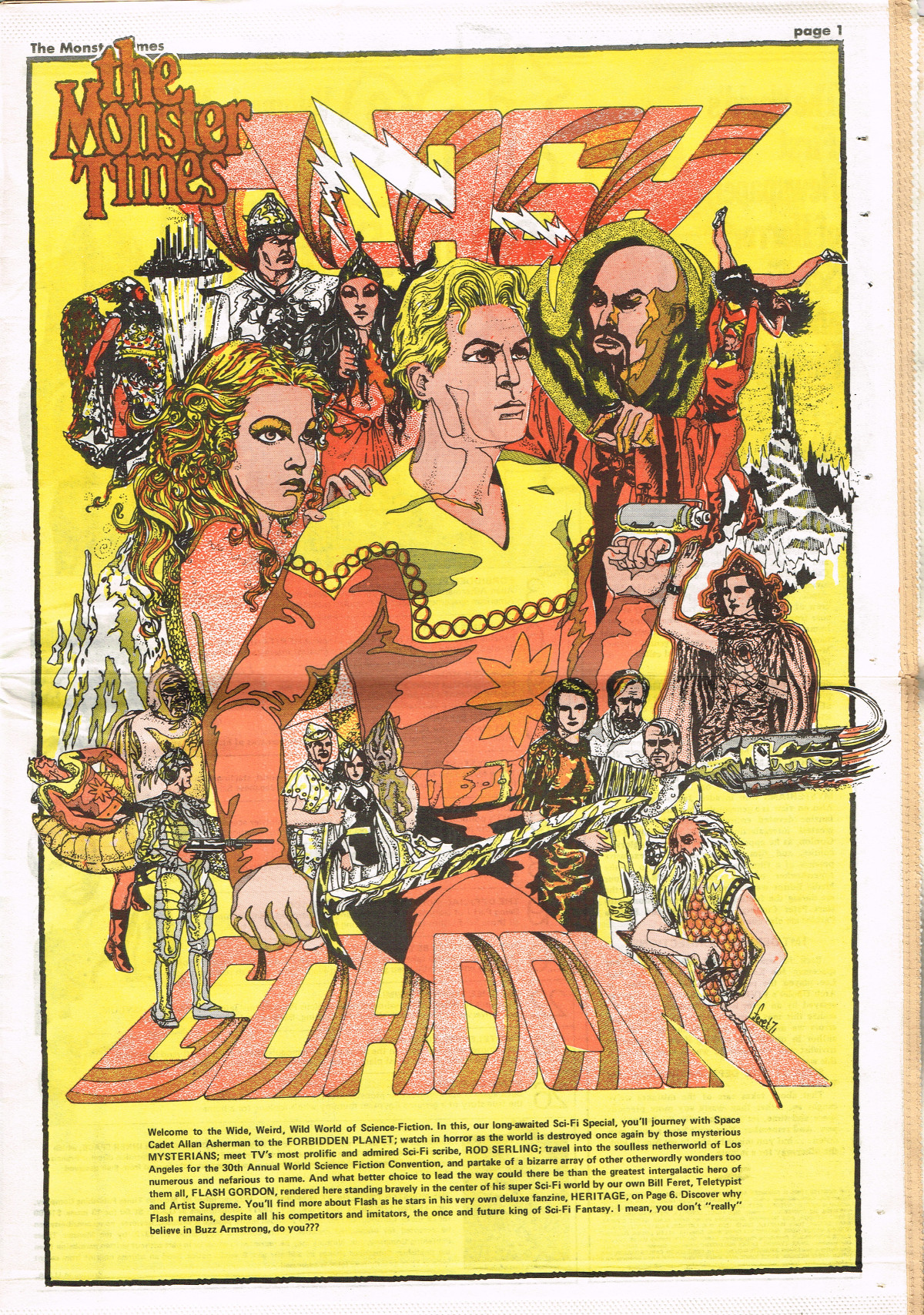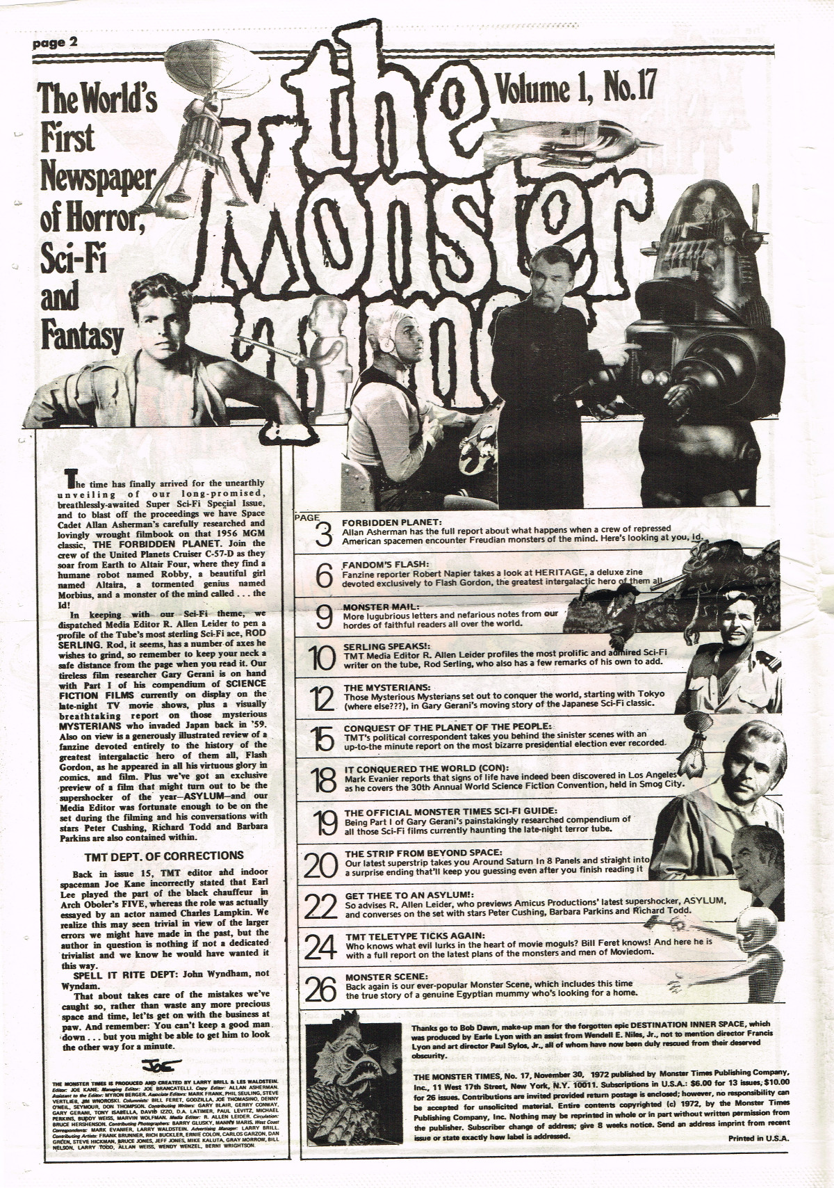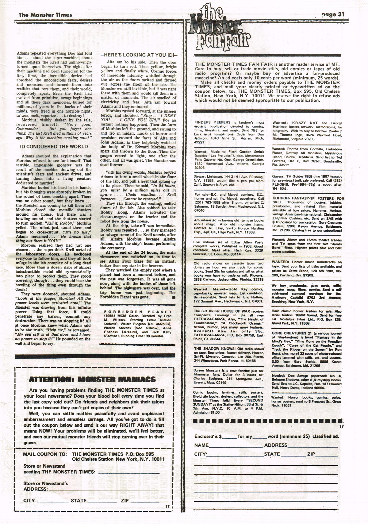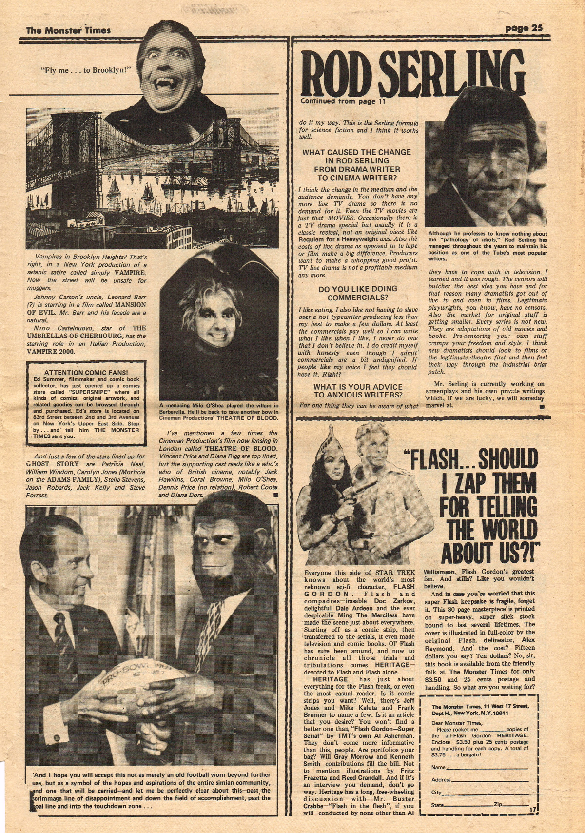 For The Monster Times issue 17, coverage of Forbidden Planet, Flash Gordon, and science fiction on television joins Amicus Productions' Asylum and the influence of Rod Serling's work for the cinema fantastic on the small and large screens. The 3oth World Science Fiction Convention in Los Angeles is reported on (seems McDonald's provided cheaper and better food than the banquet event), and Bill Feret's Monster Times Teletype gives the skinny on upcoming and ongoing newsy stuff (something we take for granted today, given the Internet's over abundance of newsy stuff).
