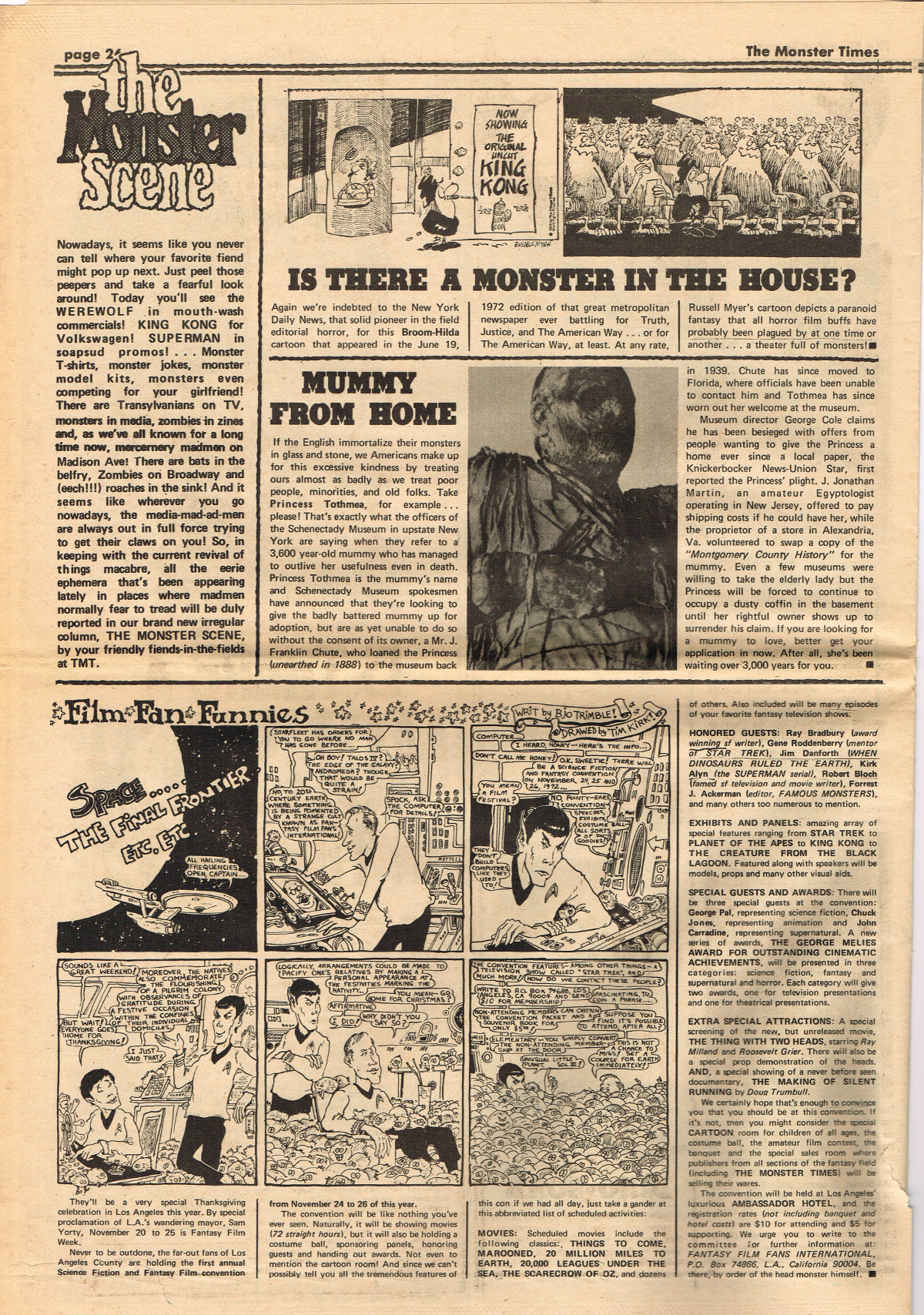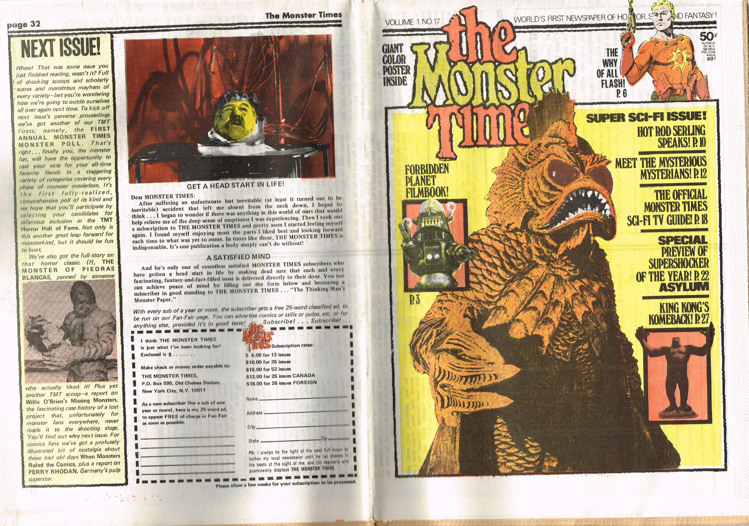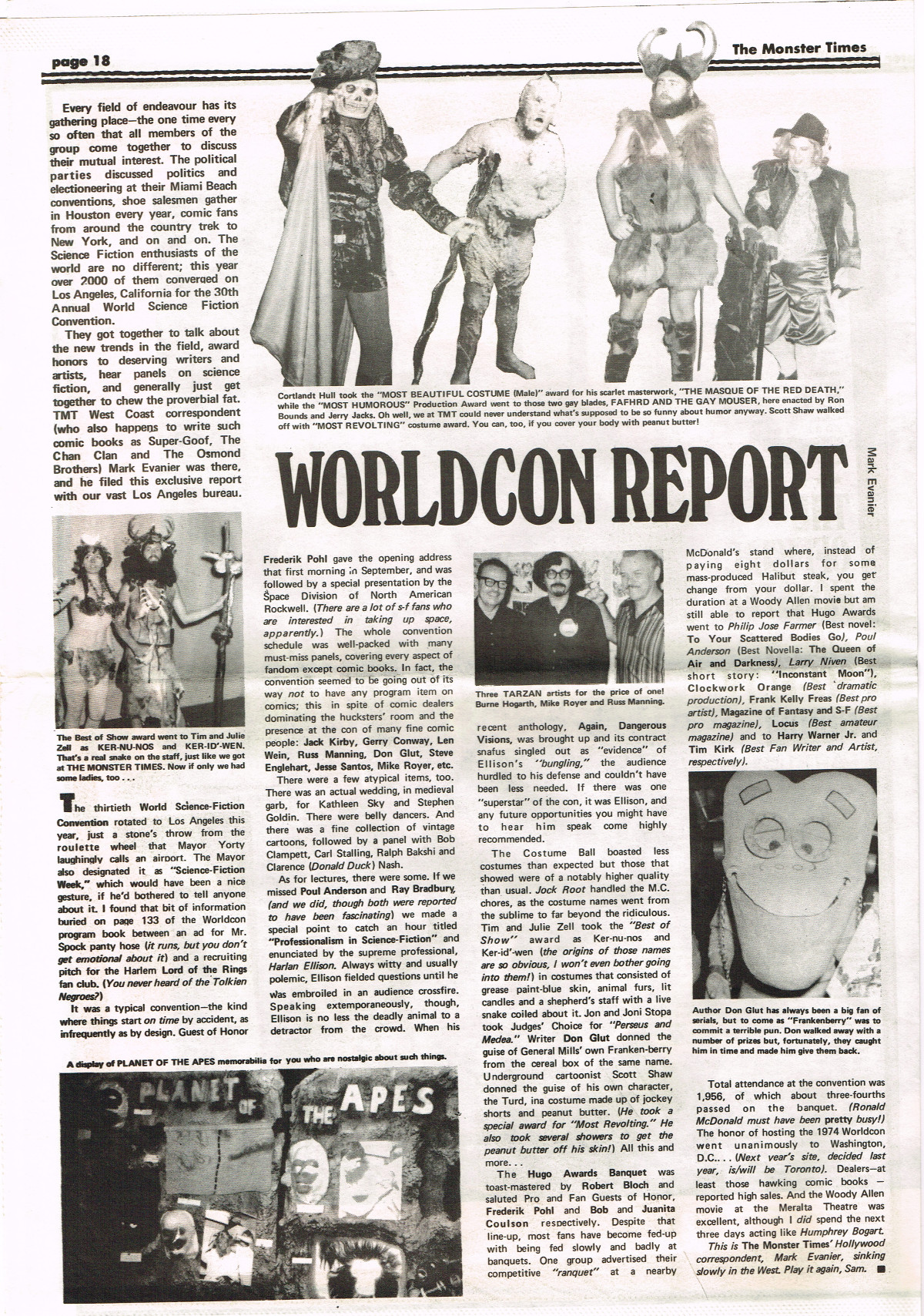 For The Monster Times issue 17, coverage of Forbidden Planet, Flash Gordon, and science fiction on television joins Amicus Productions' Asylum and the influence of Rod Serling's work for the cinema fantastic on the small and large screens. The 3oth World Science Fiction Convention in Los Angeles is reported on (seems McDonald's provided cheaper and better food than the banquet event), and Bill Feret's Monster Times Teletype gives the skinny on upcoming and ongoing newsy stuff (something we take for granted today, given the Internet's over abundance of newsy stuff).