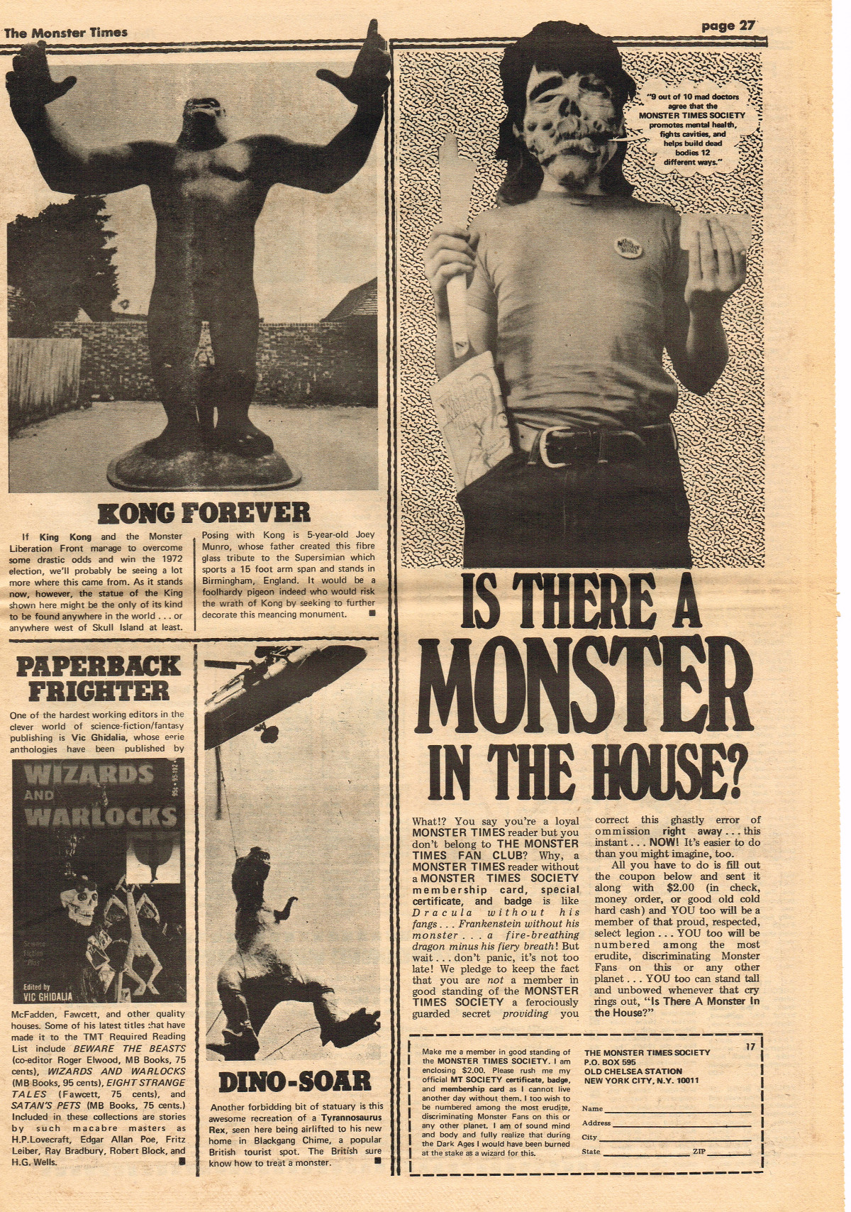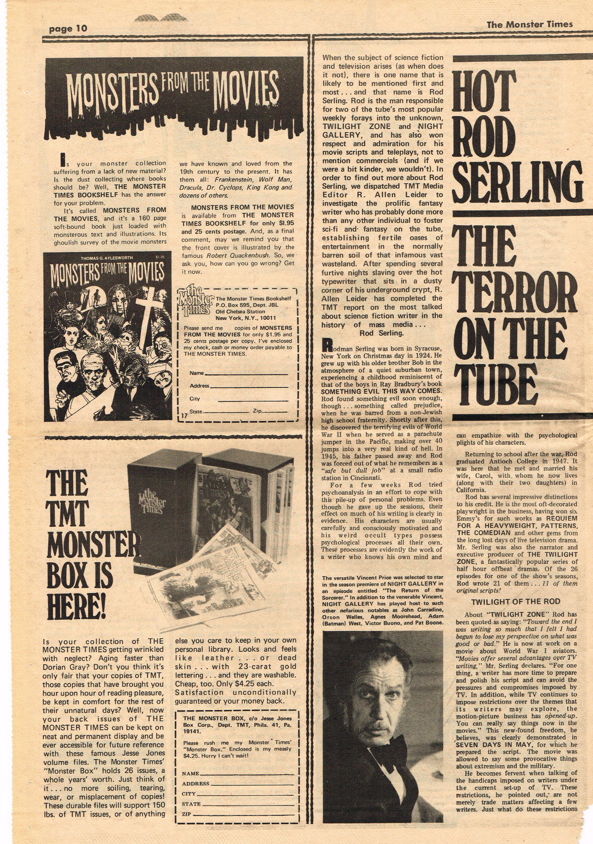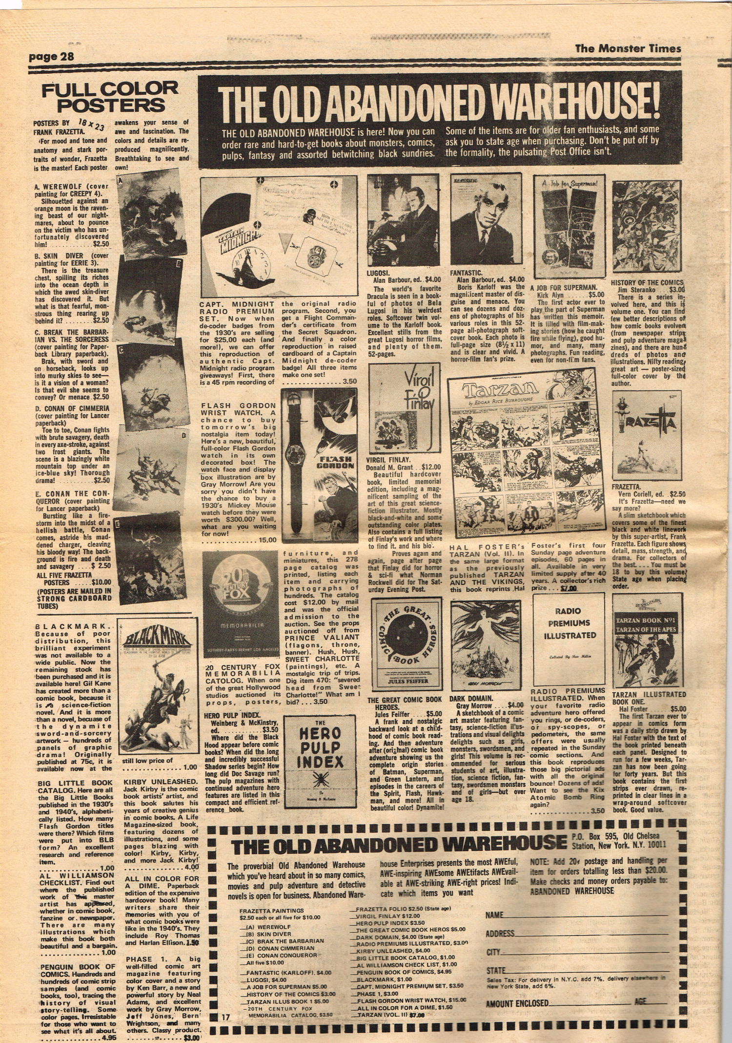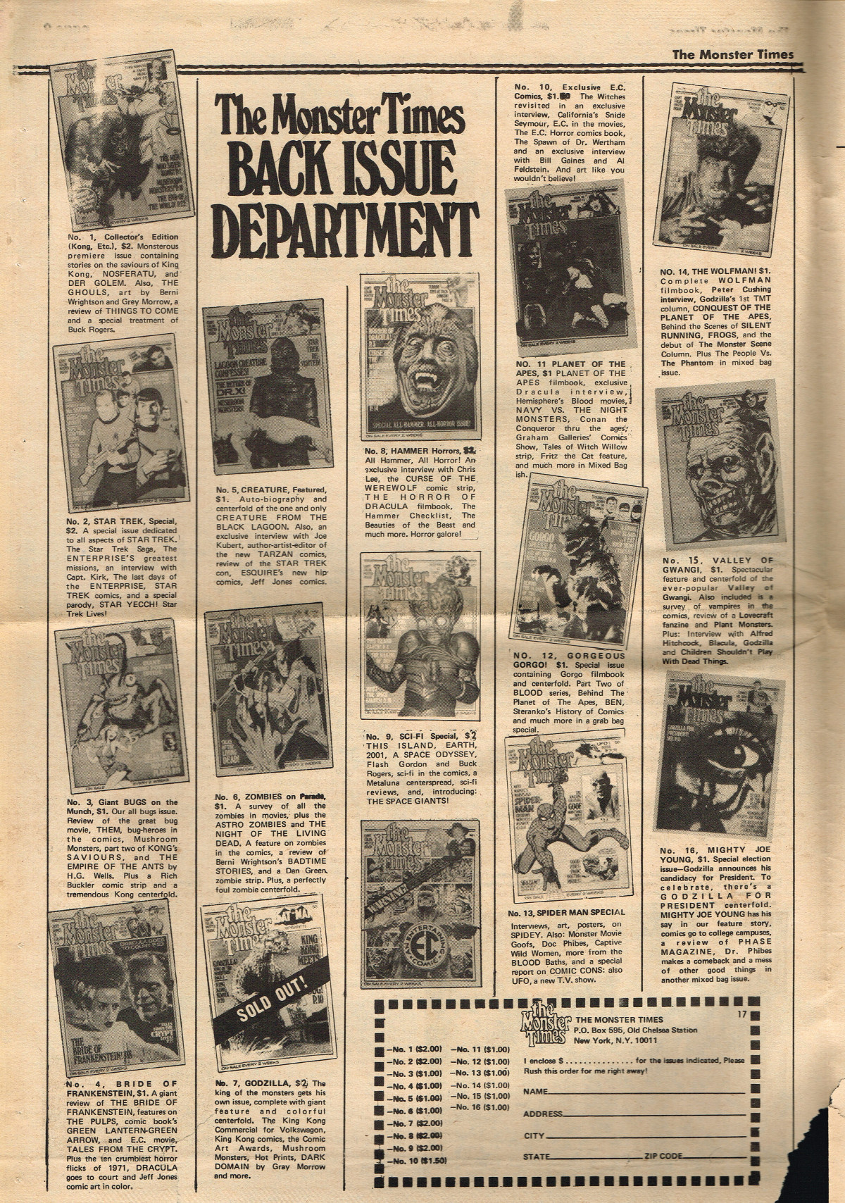 For The Monster Times issue 17, coverage of Forbidden Planet, Flash Gordon, and science fiction on television joins Amicus Productions' Asylum and the influence of Rod Serling's work for the cinema fantastic on the small and large screens. The 3oth World Science Fiction Convention in Los Angeles is reported on (seems McDonald's provided cheaper and better food than the banquet event), and Bill Feret's Monster Times Teletype gives the skinny on upcoming and ongoing newsy stuff (something we take for granted today, given the Internet's over abundance of newsy stuff).