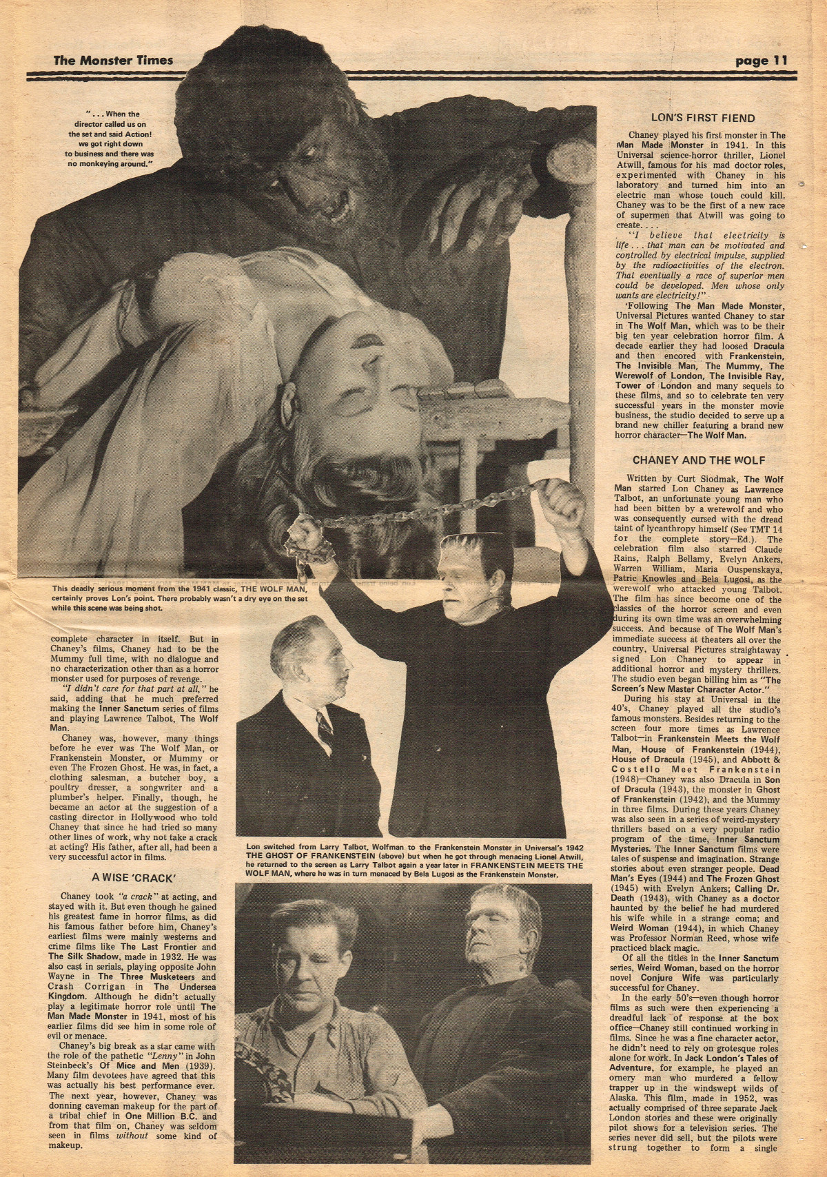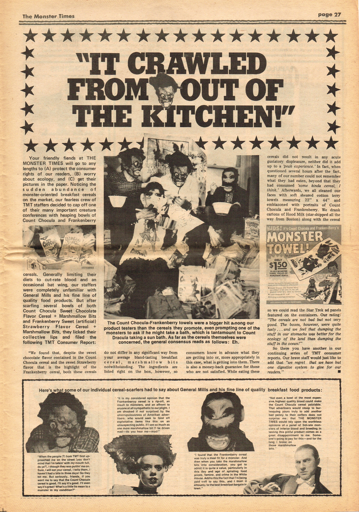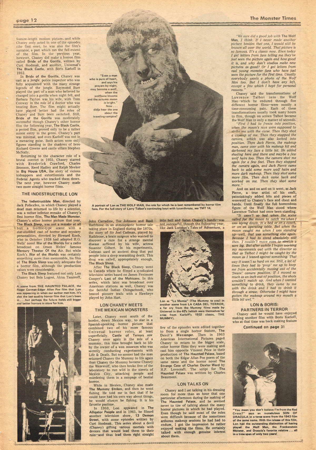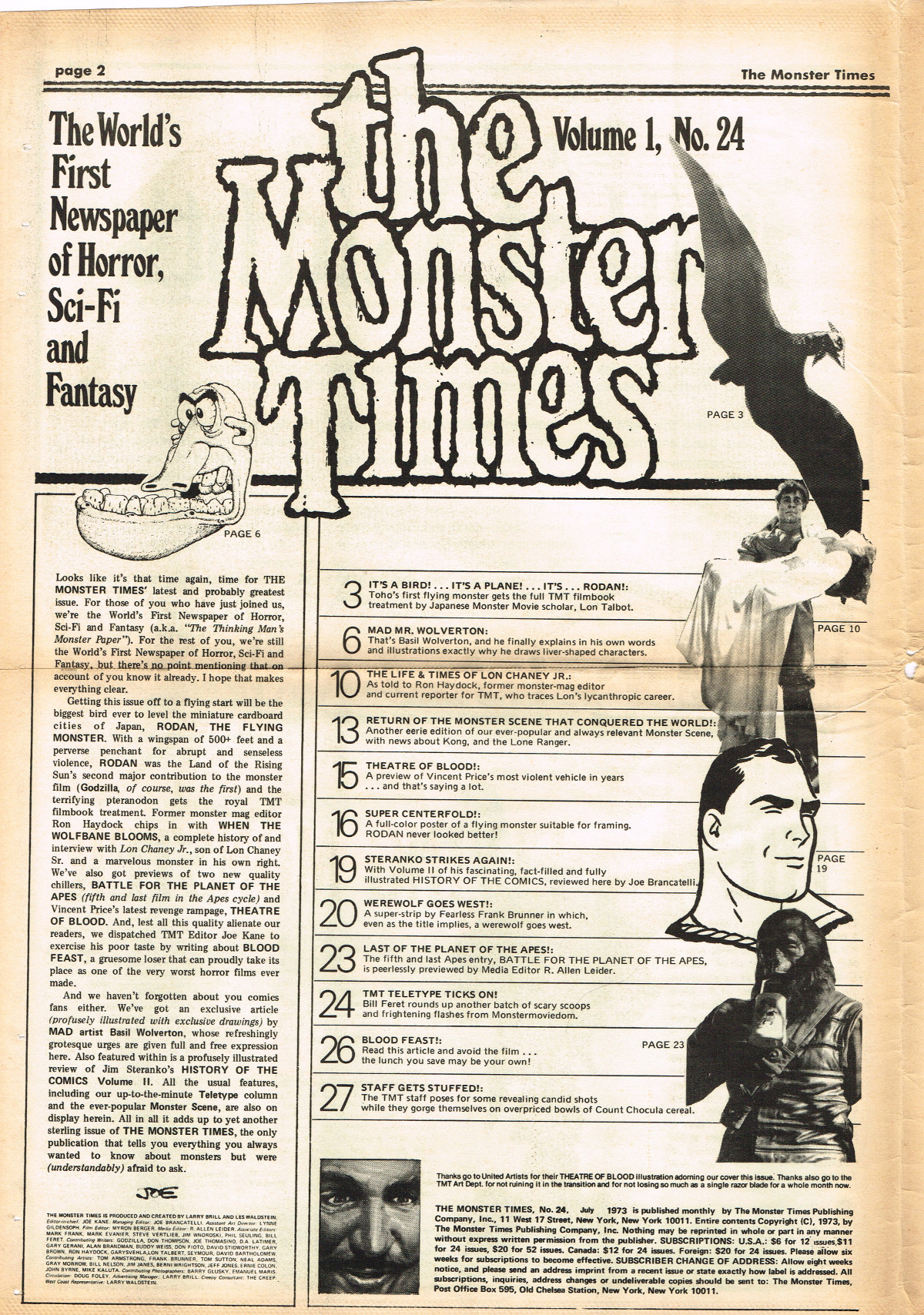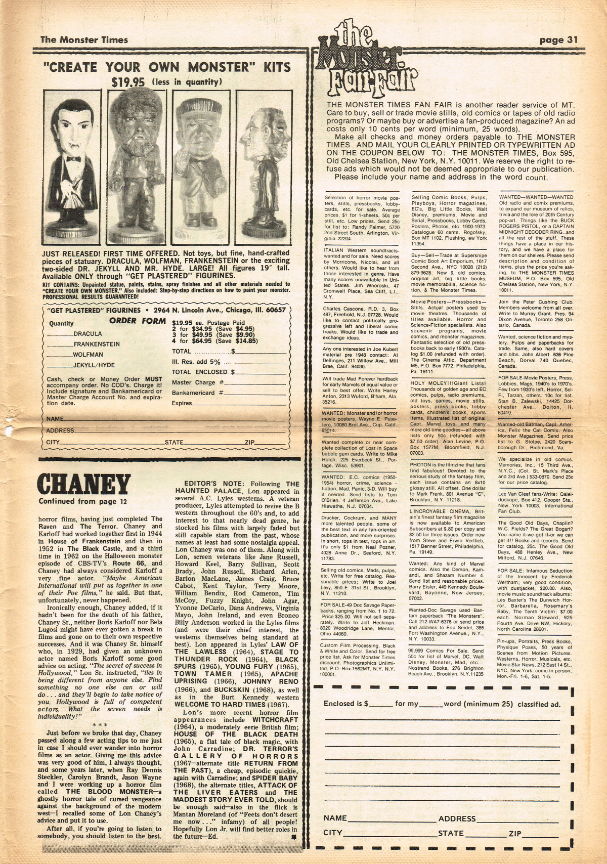 Jumping ahead this time to issue 24 of The Monster Times. Of course publishing is no longer bi-weekly but monthly, and the cover price is now 60 cents. Steranko's History of the Comics Volume Two is reviewed, Rodan spreads his wings, and monster towels clean up for $1.50 each. Caesar takes a stand with the Battle for the Planet of the Apes and the plot sickens in Blood Feast with a "bad movie roasting." Of particular note (aside from the cool monster towels, that is) are coverage of Basil Wolverton's weird-tastic art, the nifty Create Your Own Monster Kits ad on page 31, and Lon Chaney Jr's life and times howls. (Read issue 24 of The Monster Times)