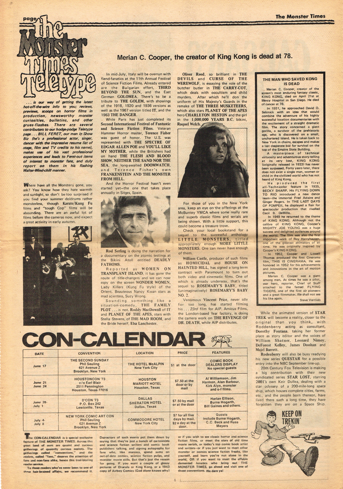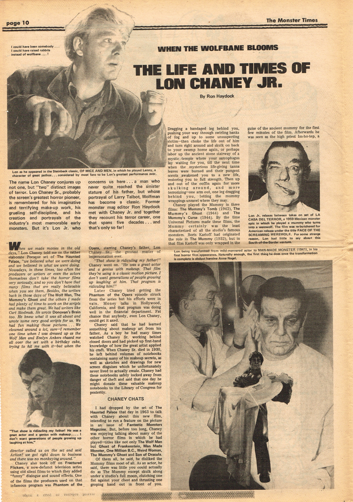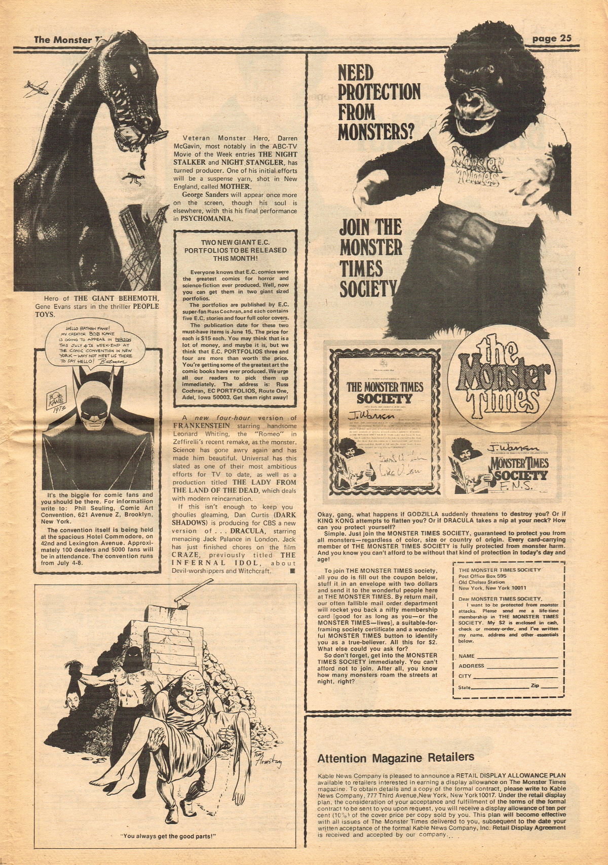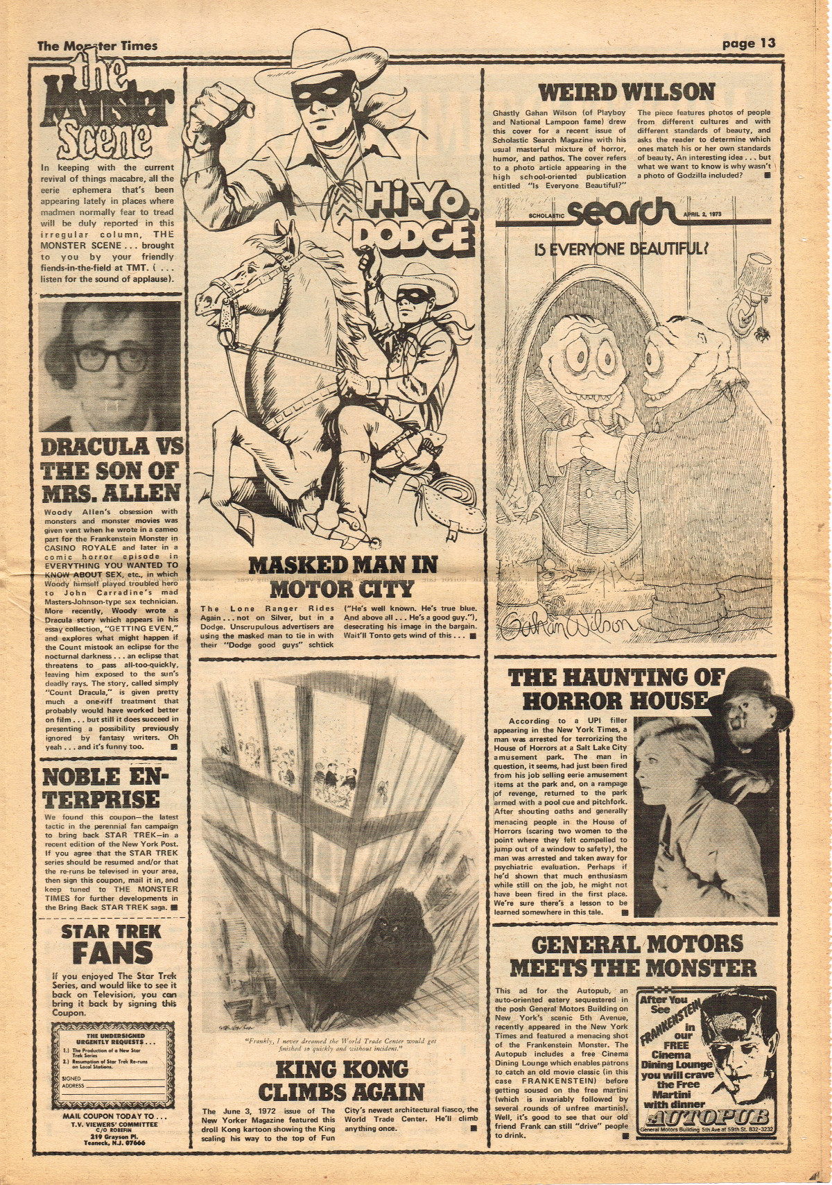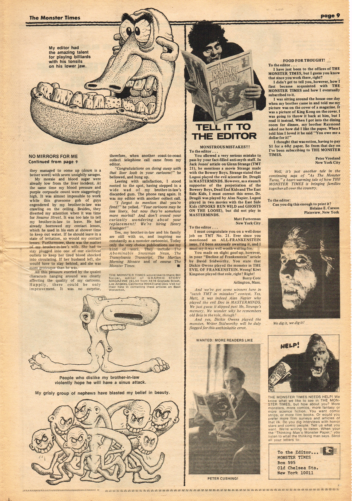 Jumping ahead this time to issue 24 of The Monster Times. Of course publishing is no longer bi-weekly but monthly, and the cover price is now 60 cents. Steranko's History of the Comics Volume Two is reviewed, Rodan spreads his wings, and monster towels clean up for $1.50 each. Caesar takes a stand with the Battle for the Planet of the Apes and the plot sickens in Blood Feast with a "bad movie roasting." Of particular note (aside from the cool monster towels, that is) are coverage of Basil Wolverton's weird-tastic art, the nifty Create Your Own Monster Kits ad on page 31, and Lon Chaney Jr's life and times howls. (Read issue 24 of The Monster Times)