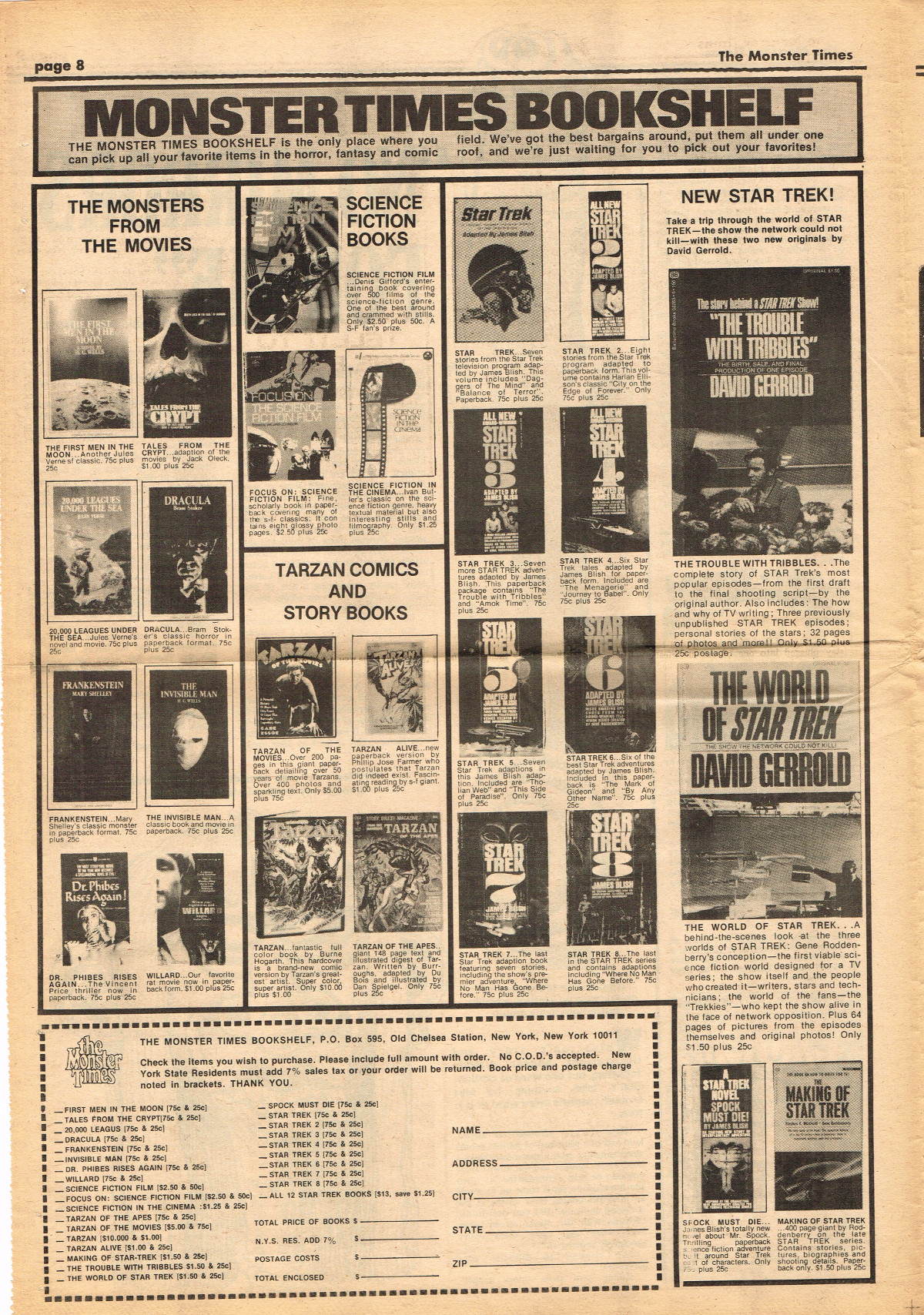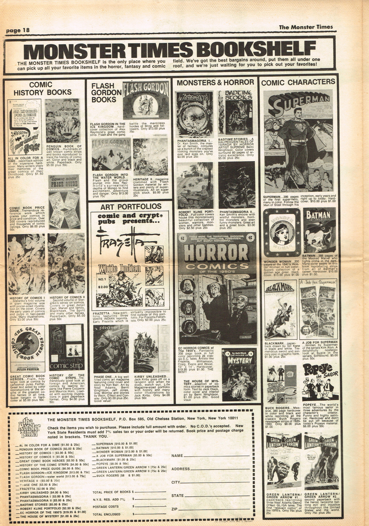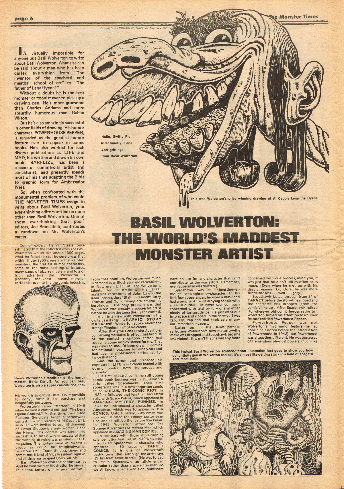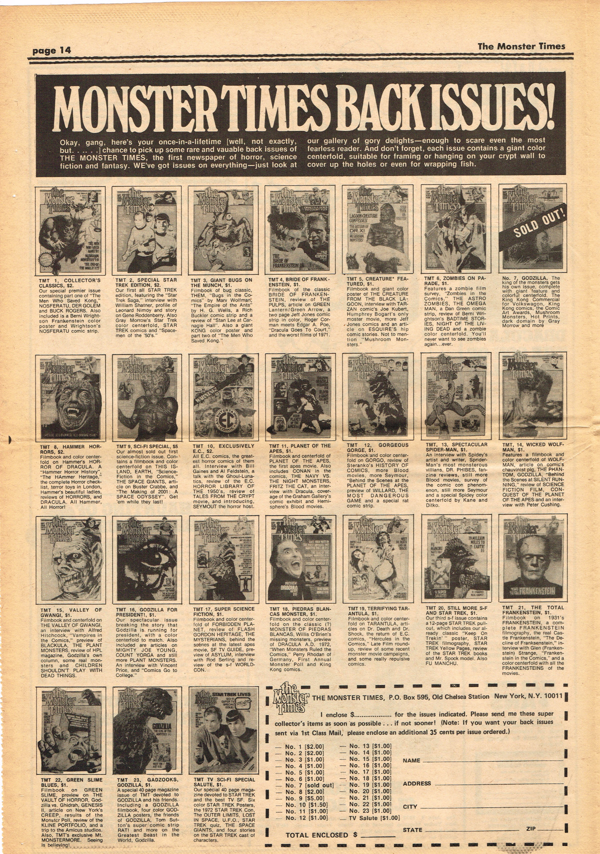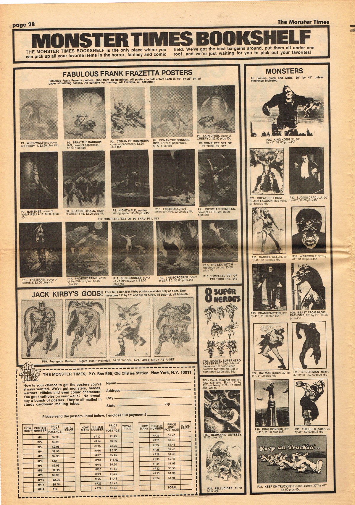 Jumping ahead this time to issue 24 of The Monster Times. Of course publishing is no longer bi-weekly but monthly, and the cover price is now 60 cents. Steranko's History of the Comics Volume Two is reviewed, Rodan spreads his wings, and monster towels clean up for $1.50 each. Caesar takes a stand with the Battle for the Planet of the Apes and the plot sickens in Blood Feast with a "bad movie roasting." Of particular note (aside from the cool monster towels, that is) are coverage of Basil Wolverton's weird-tastic art, the nifty Create Your Own Monster Kits ad on page 31, and Lon Chaney Jr's life and times howls. (Read issue 24 of The Monster Times)