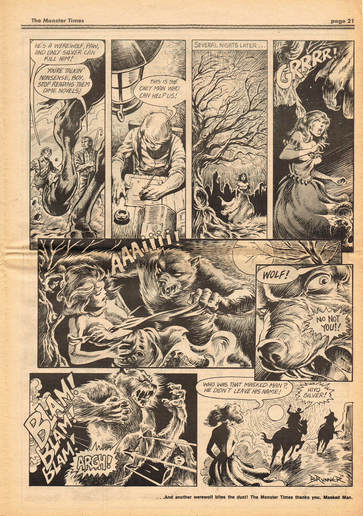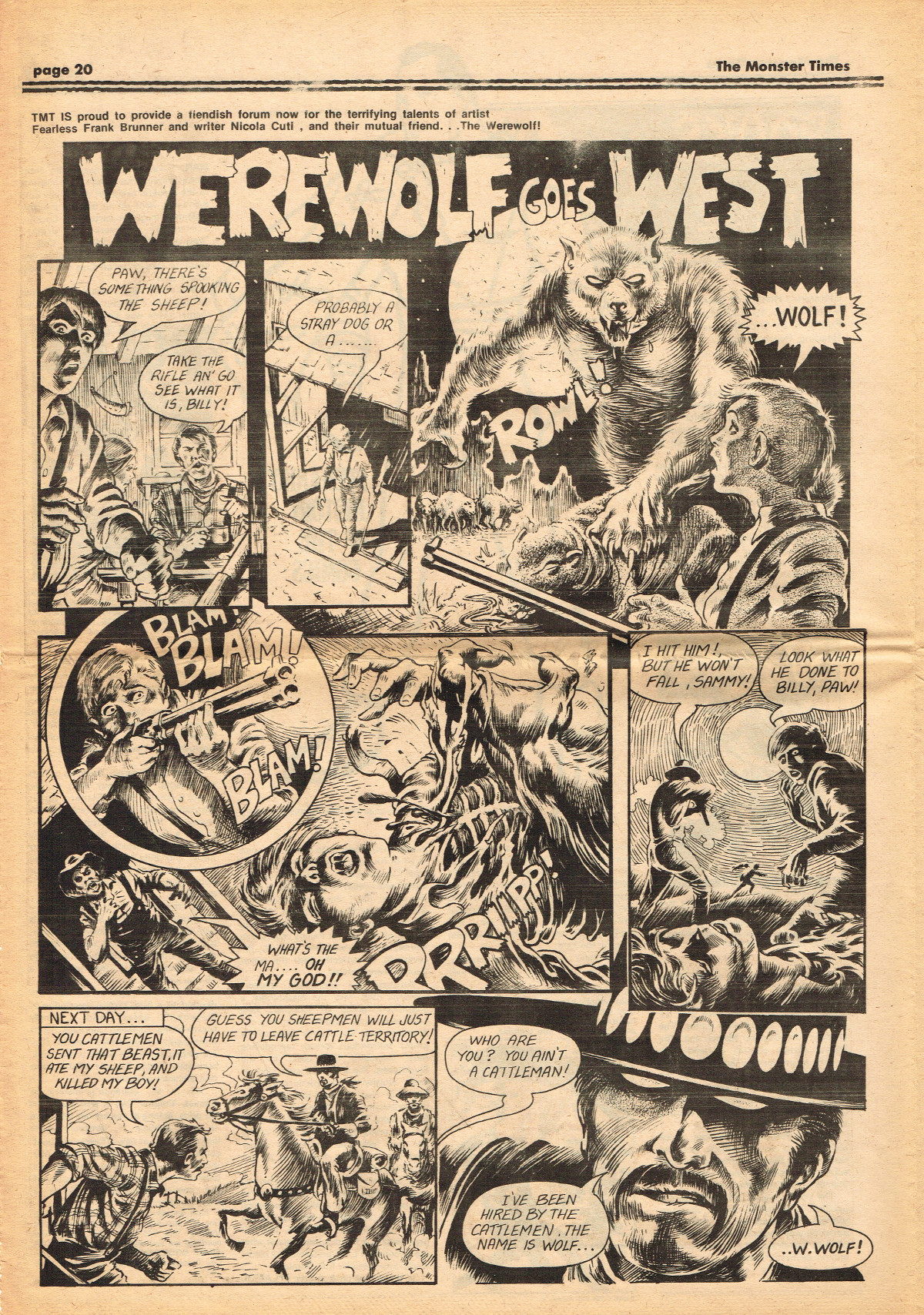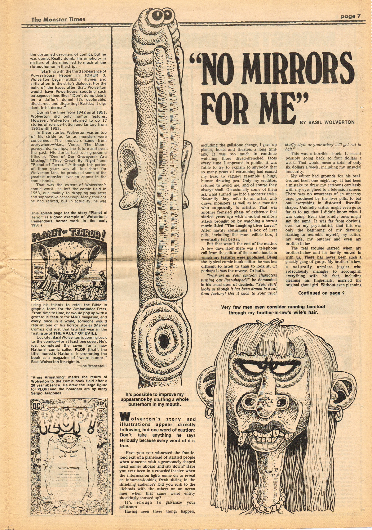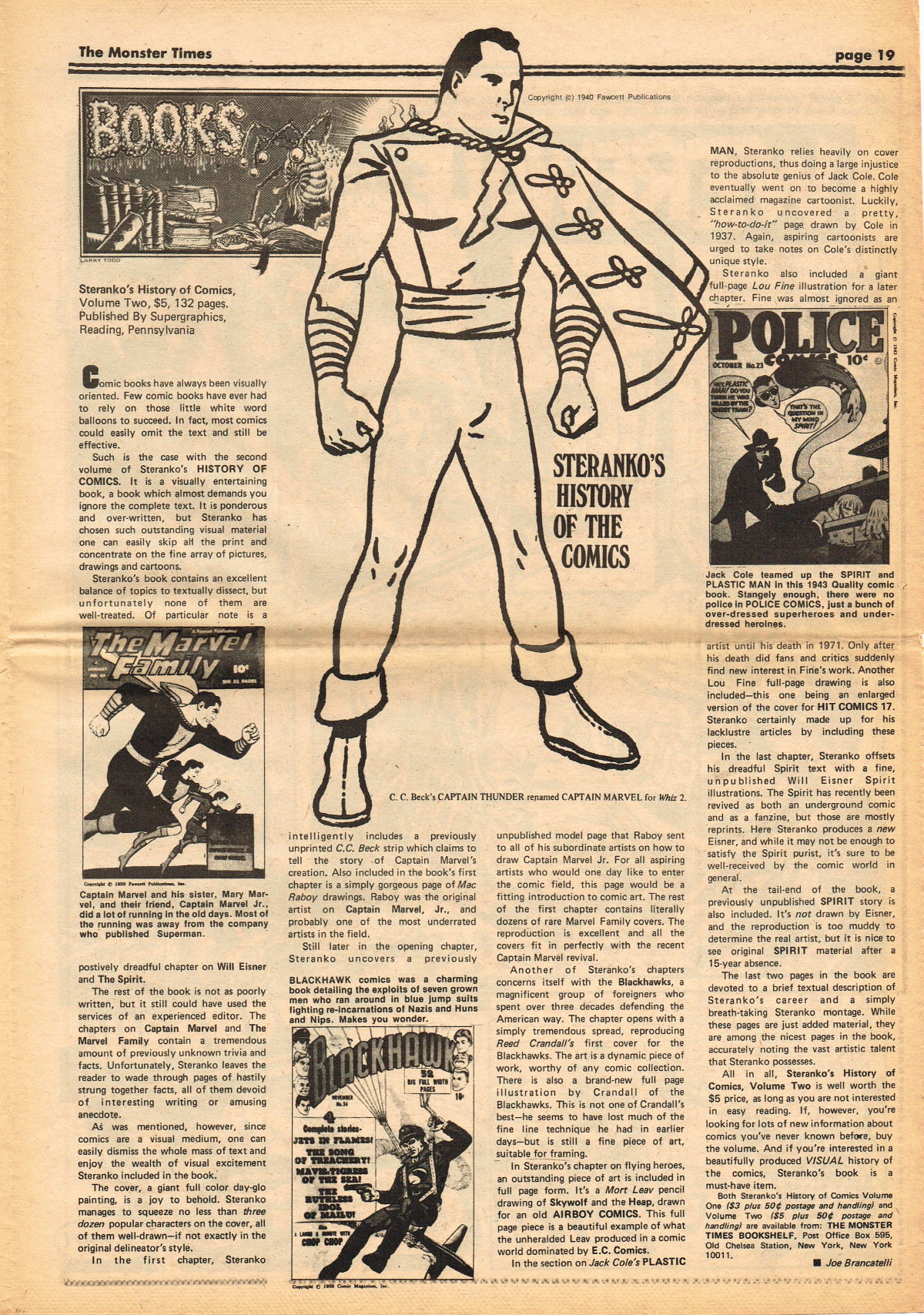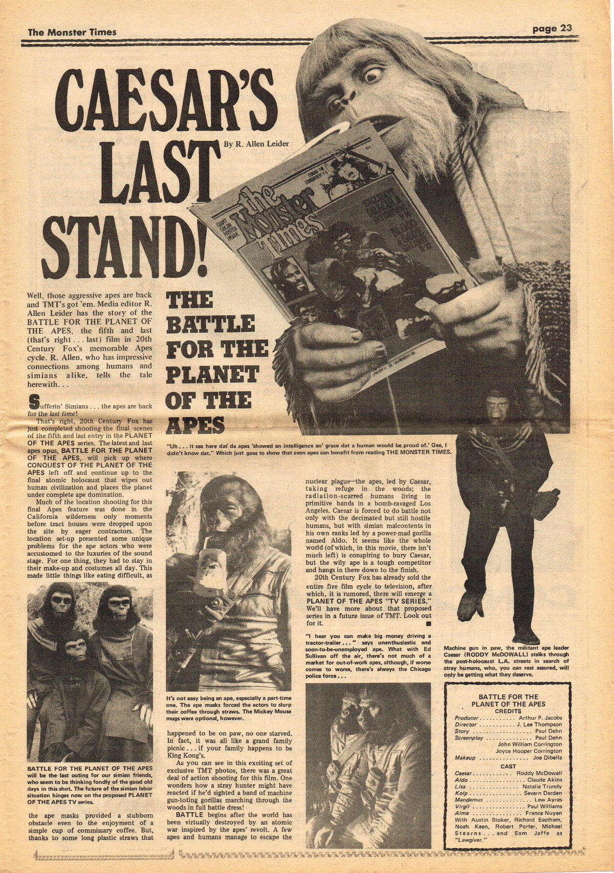 Jumping ahead this time to issue 24 of The Monster Times. Of course publishing is no longer bi-weekly but monthly, and the cover price is now 60 cents. Steranko's History of the Comics Volume Two is reviewed, Rodan spreads his wings, and monster towels clean up for $1.50 each. Caesar takes a stand with the Battle for the Planet of the Apes and the plot sickens in Blood Feast with a "bad movie roasting." Of particular note (aside from the cool monster towels, that is) are coverage of Basil Wolverton's weird-tastic art, the nifty Create Your Own Monster Kits ad on page 31, and Lon Chaney Jr's life and times howls. (Read issue 24 of The Monster Times)