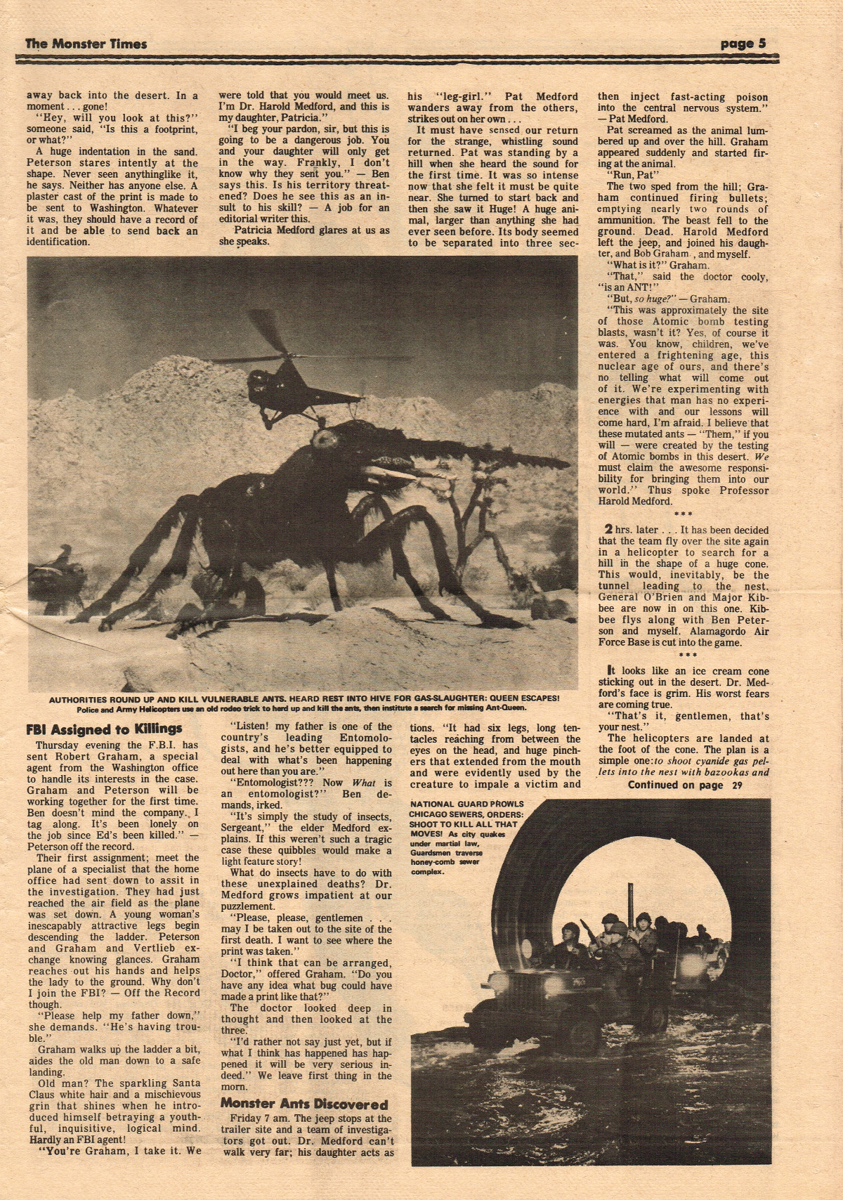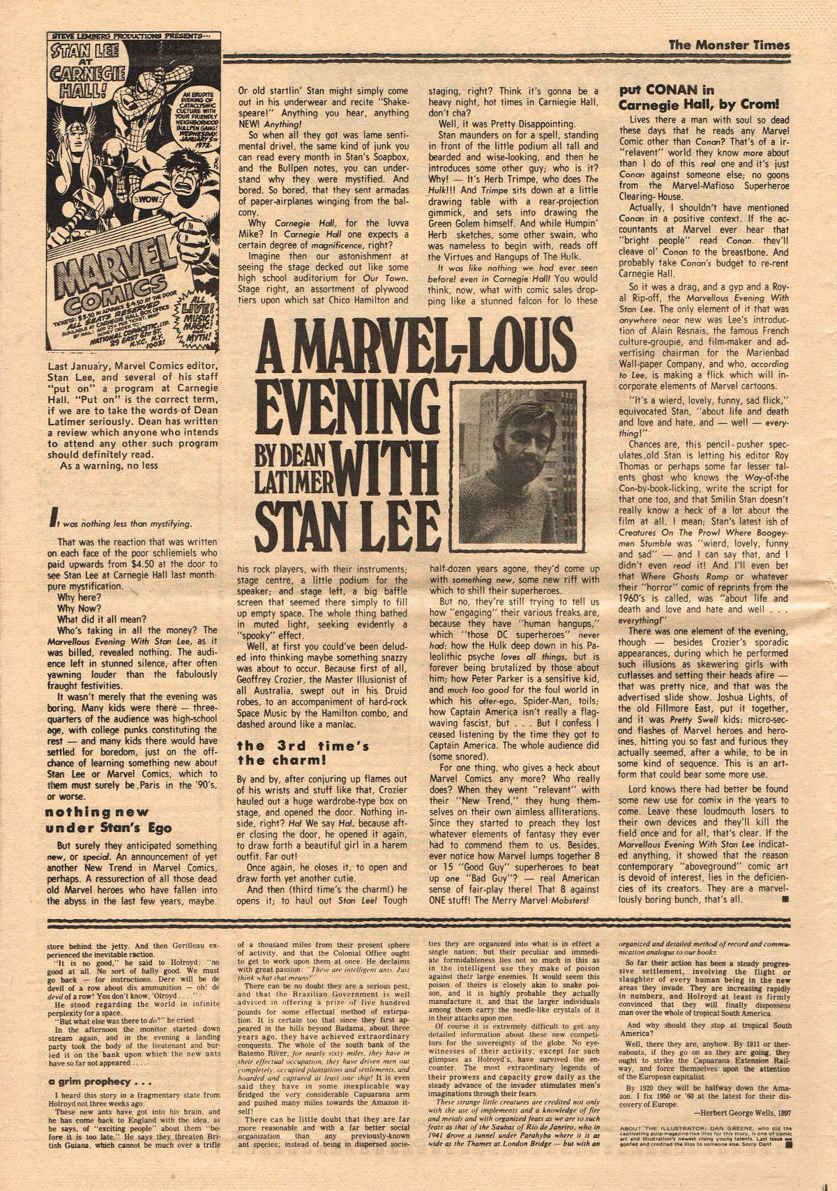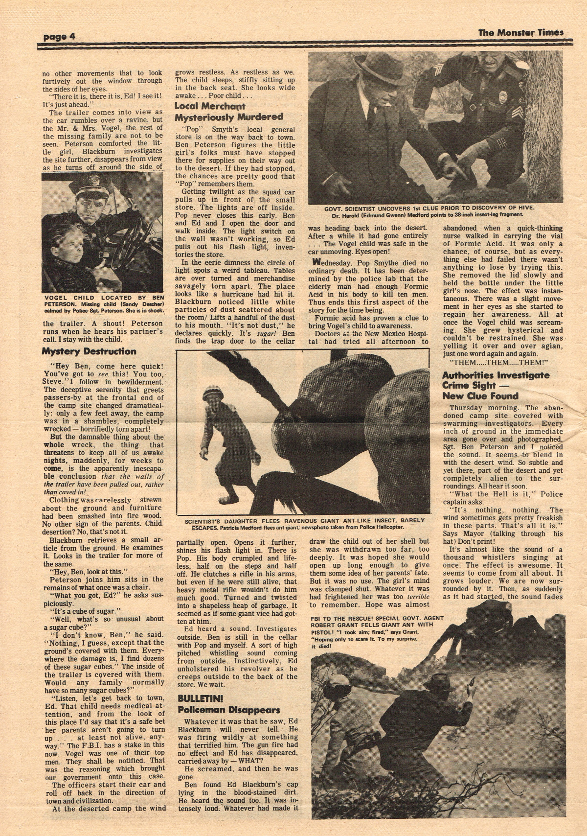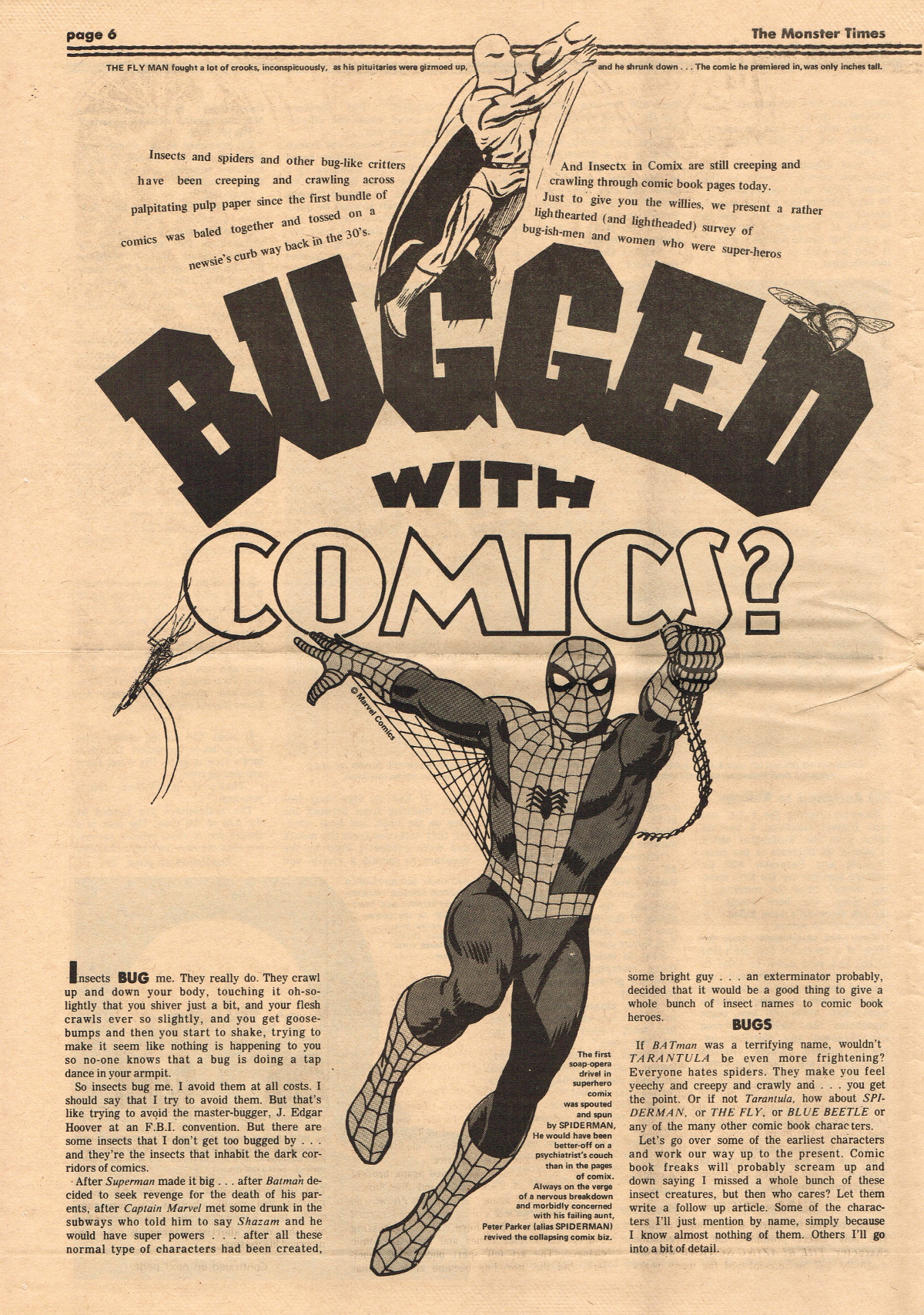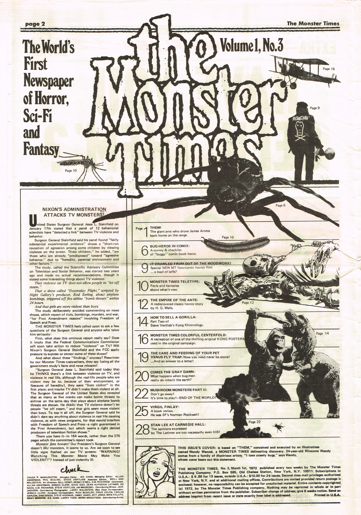 With issue 3 of The Monster Times (March 1972), bugs in movies and buggy superheroes in comic books get the magnifying glass treatment. So does King Kong with part 2 of The Men Who Saved Kong. Them gets a lengthy article. It's not a review but more like a storyline of the movie, including the dialog and events, all very literary–and boring if you've seen the movie. H.G. Wells Empire of the Ants also gets this treatment; the book, not the movie. Dare see the movie only if you want your brain to turn to jelly as Joan Collins screams in terror from the awful special effects. On another note, of particular interest is Dean Latimer's lambasting of A Marvelous Evening with Stan Lee, which took place at Carnegie Hall, 4 dollars and fifty cents a ticket. "The audience left in stunned silence, after often yawning louder than the fabulously fraught festivities."