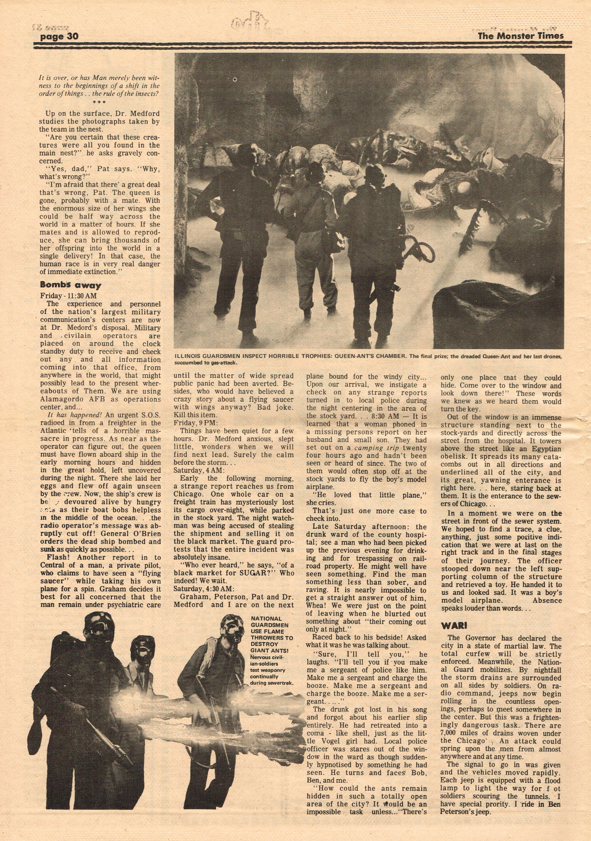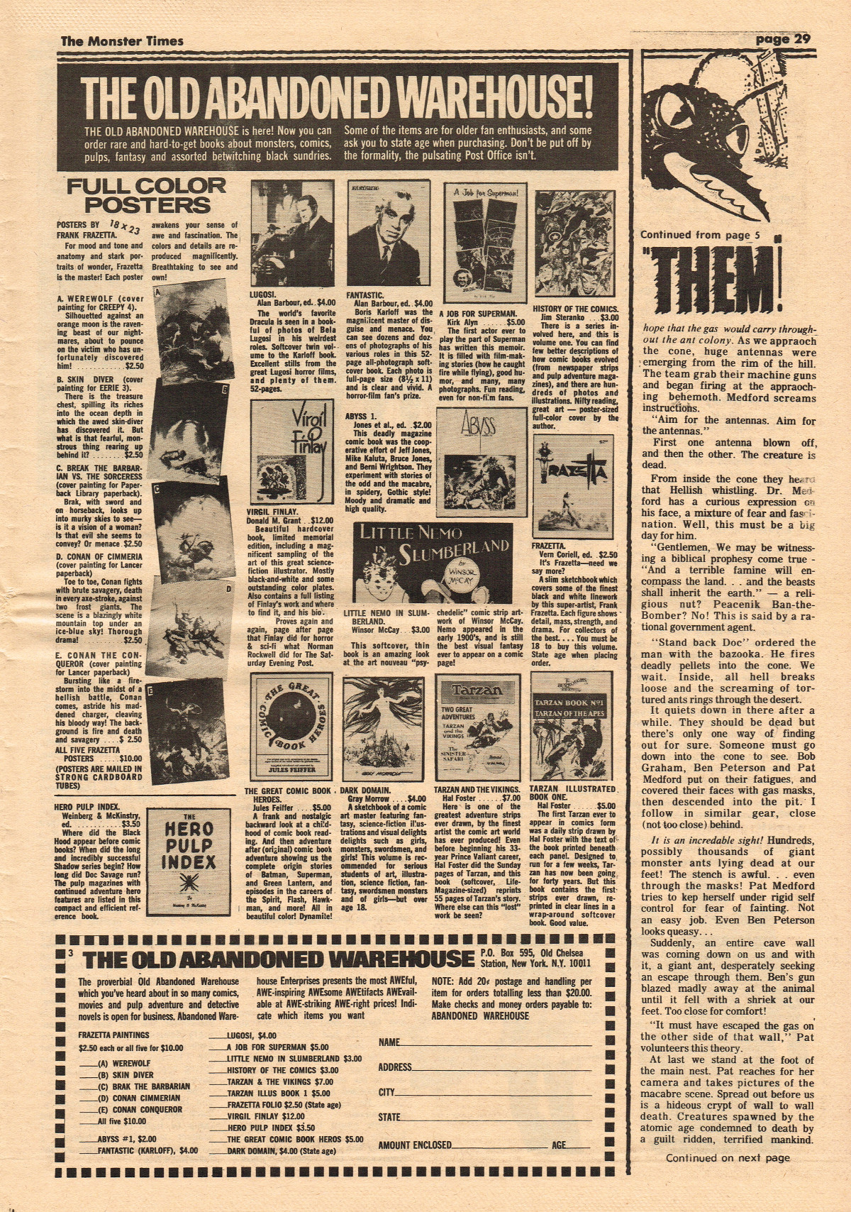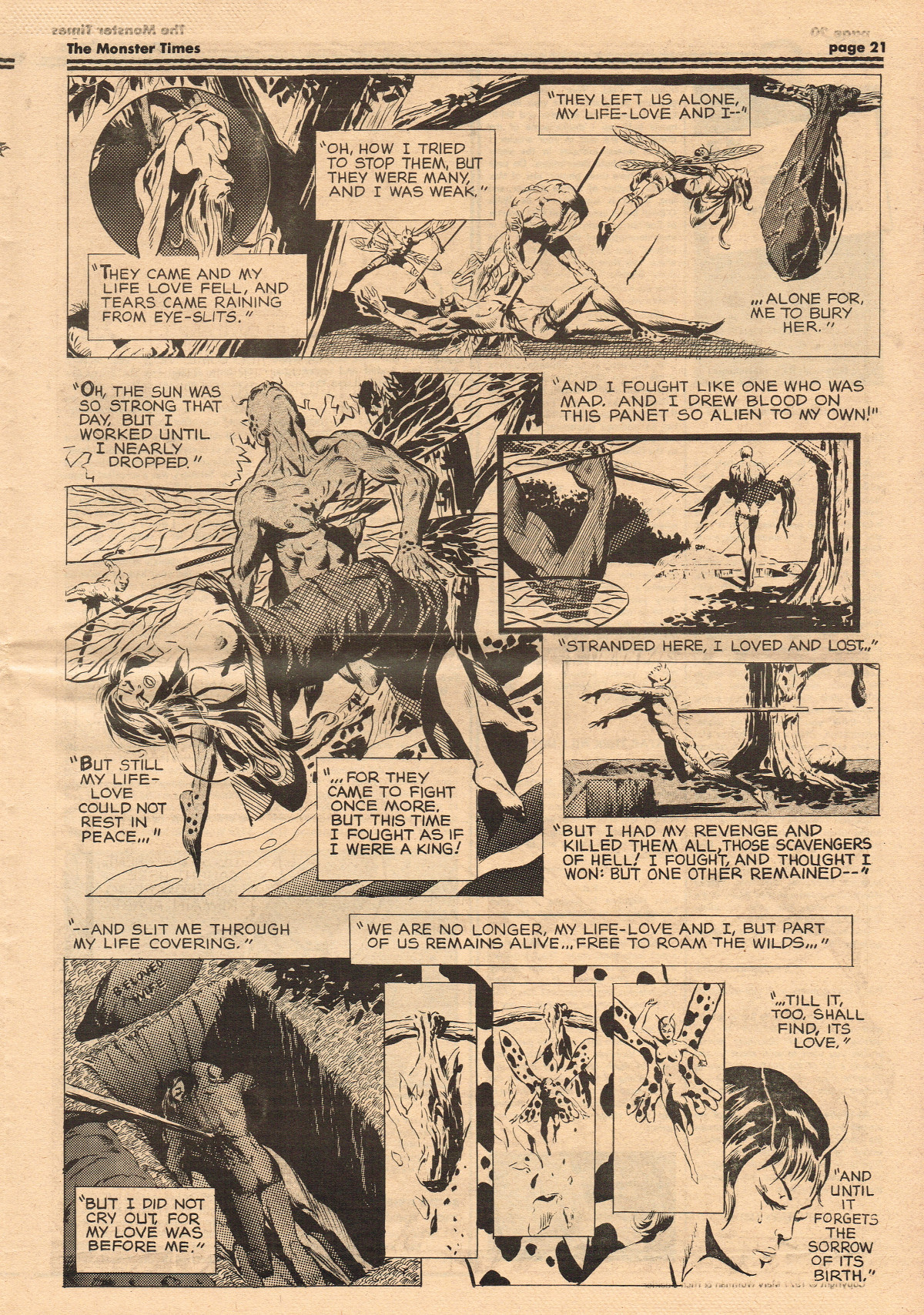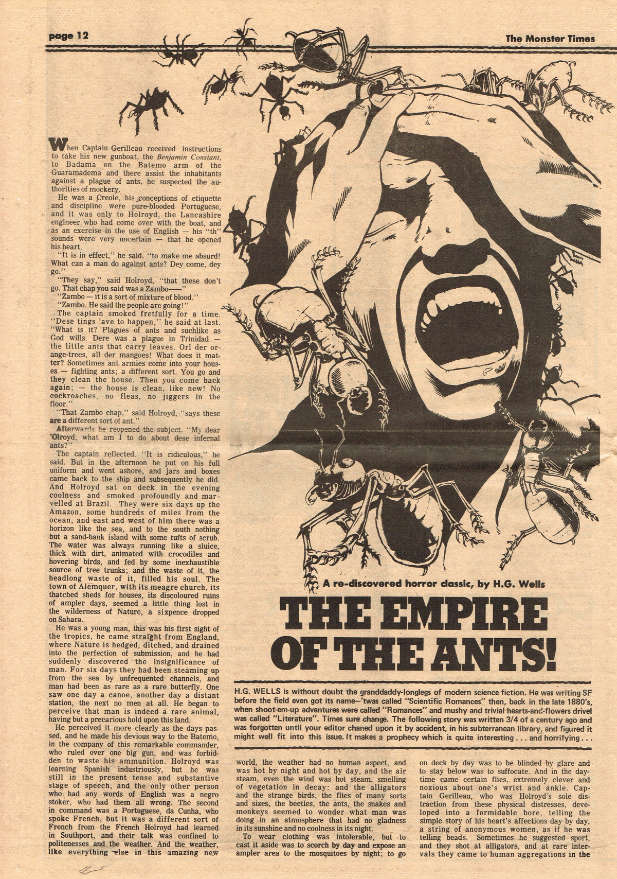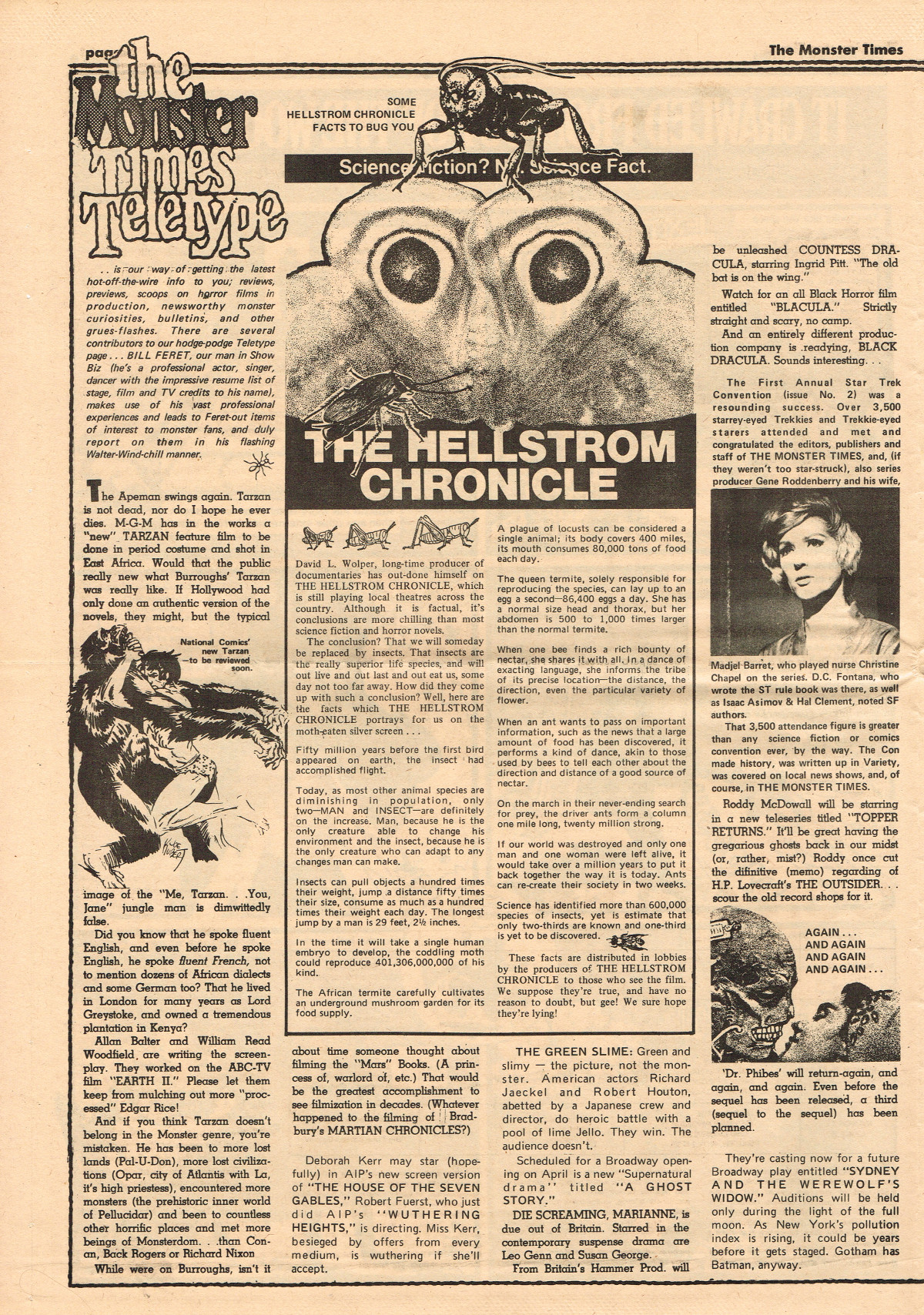 With issue 3 of The Monster Times (March 1972), bugs in movies and buggy superheroes in comic books get the magnifying glass treatment. So does King Kong with part 2 of The Men Who Saved Kong. Them gets a lengthy article. It's not a review but more like a storyline of the movie, including the dialog and events, all very literary–and boring if you've seen the movie. H.G. Wells Empire of the Ants also gets this treatment; the book, not the movie. Dare see the movie only if you want your brain to turn to jelly as Joan Collins screams in terror from the awful special effects. On another note, of particular interest is Dean Latimer's lambasting of A Marvelous Evening with Stan Lee, which took place at Carnegie Hall, 4 dollars and fifty cents a ticket. "The audience left in stunned silence, after often yawning louder than the fabulously fraught festivities."