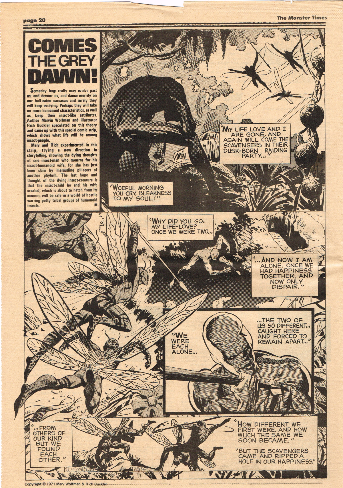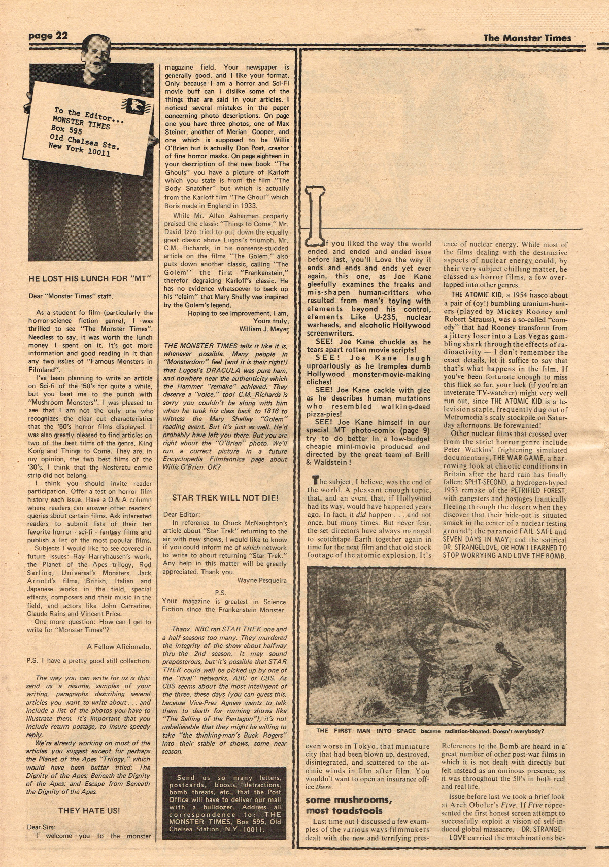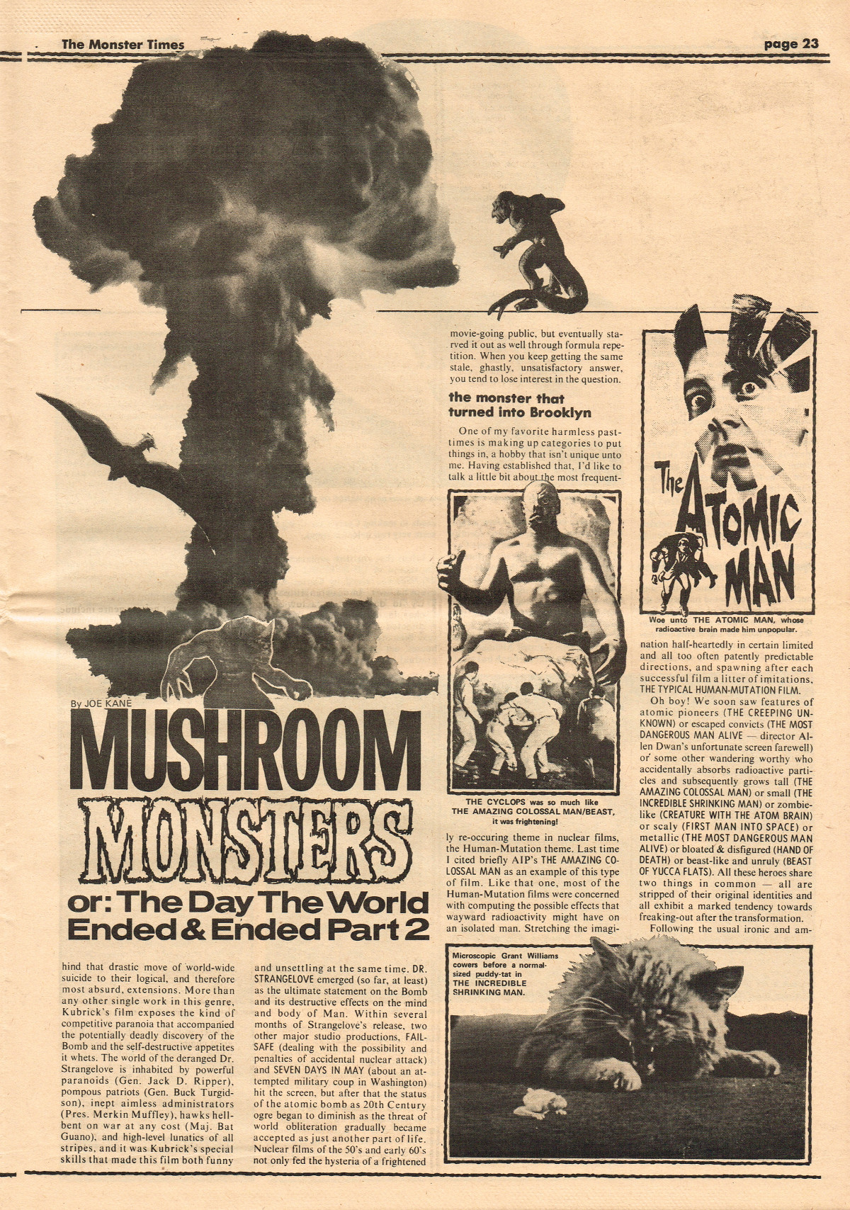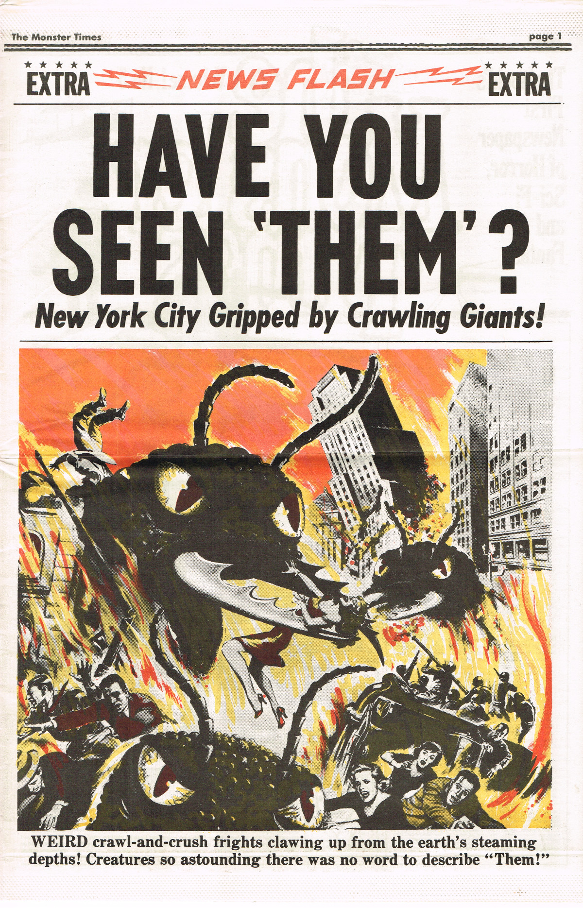 With issue 3 of The Monster Times (March 1972), bugs in movies and buggy superheroes in comic books get the magnifying glass treatment. So does King Kong with part 2 of The Men Who Saved Kong. Them gets a lengthy article. It's not a review but more like a storyline of the movie, including the dialog and events, all very literary–and boring if you've seen the movie. H.G. Wells Empire of the Ants also gets this treatment; the book, not the movie. Dare see the movie only if you want your brain to turn to jelly as Joan Collins screams in terror from the awful special effects. On another note, of particular interest is Dean Latimer's lambasting of A Marvelous Evening with Stan Lee, which took place at Carnegie Hall, 4 dollars and fifty cents a ticket. "The audience left in stunned silence, after often yawning louder than the fabulously fraught festivities."