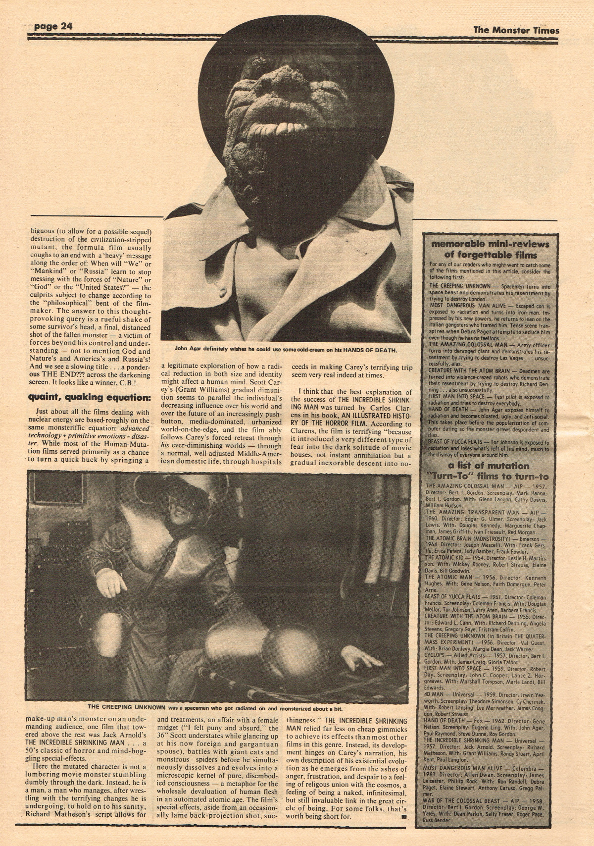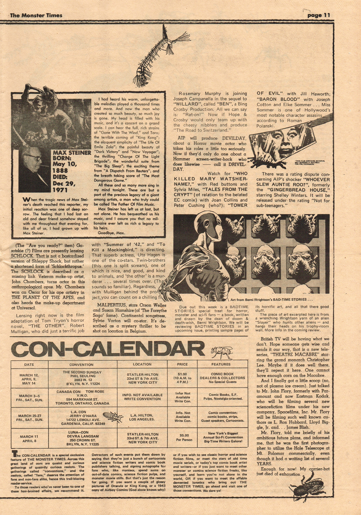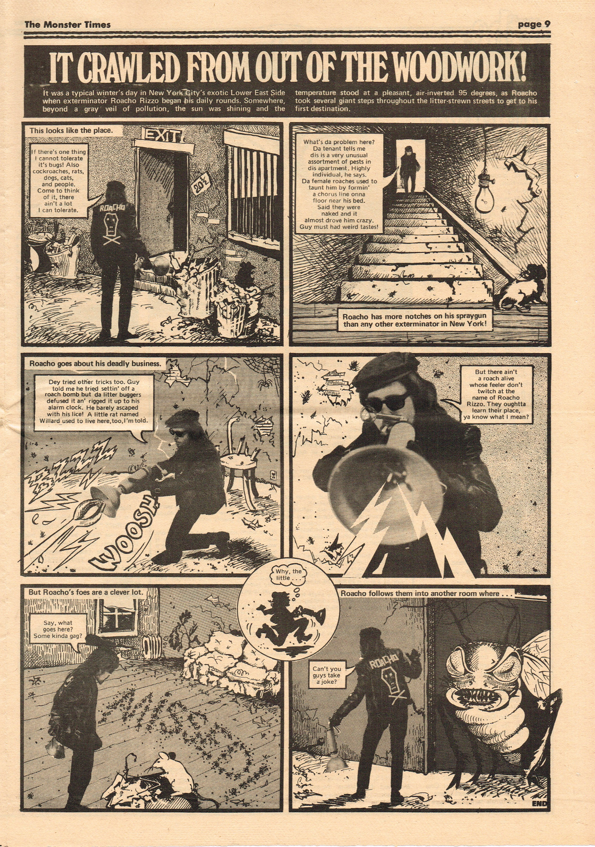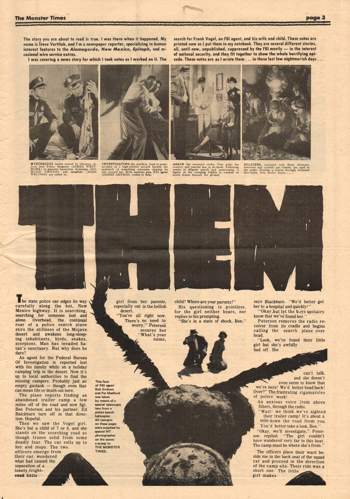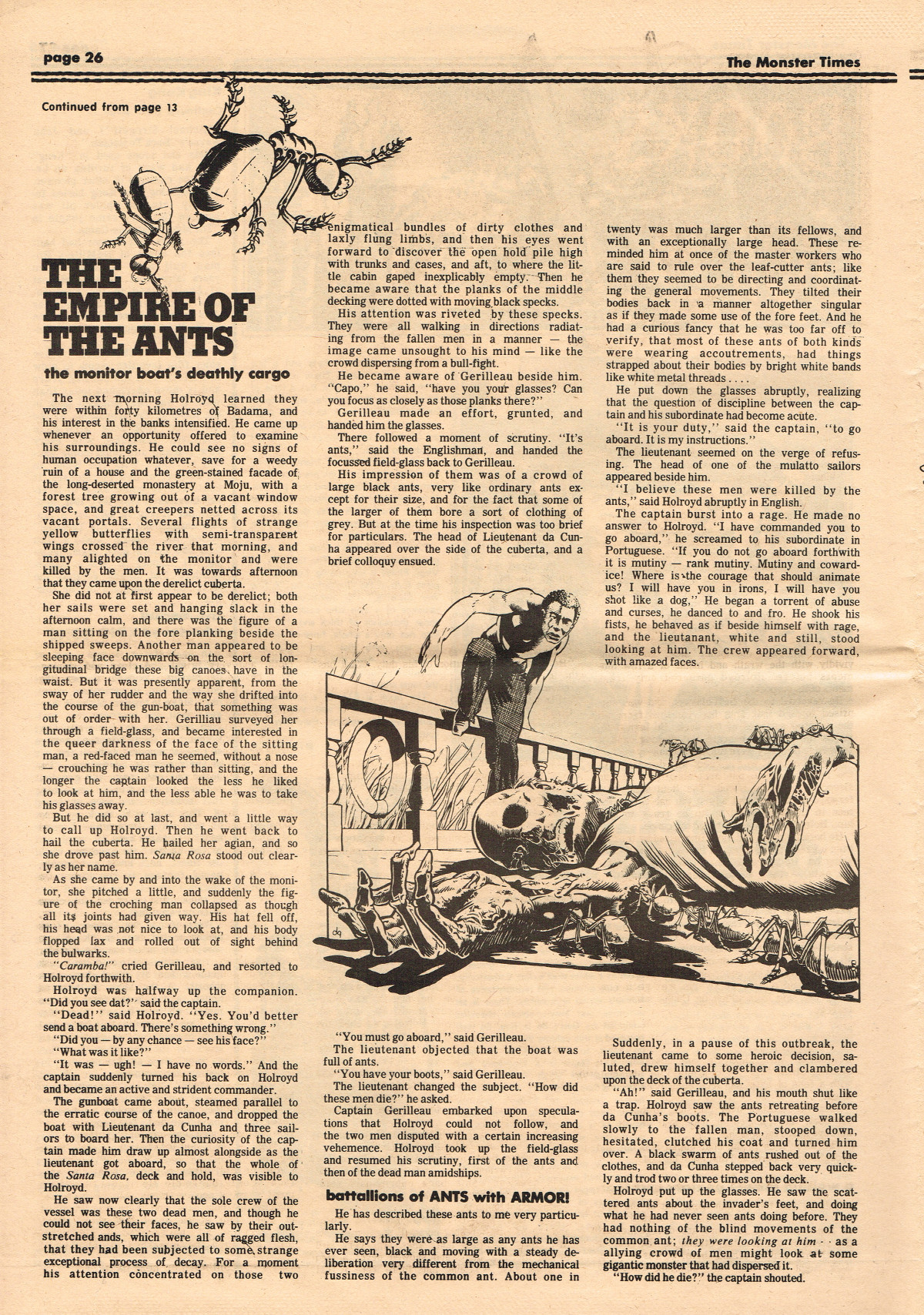 With issue 3 of The Monster Times (March 1972), bugs in movies and buggy superheroes in comic books get the magnifying glass treatment. So does King Kong with part 2 of The Men Who Saved Kong. Them gets a lengthy article. It's not a review but more like a storyline of the movie, including the dialog and events, all very literary–and boring if you've seen the movie. H.G. Wells Empire of the Ants also gets this treatment; the book, not the movie. Dare see the movie only if you want your brain to turn to jelly as Joan Collins screams in terror from the awful special effects. On another note, of particular interest is Dean Latimer's lambasting of A Marvelous Evening with Stan Lee, which took place at Carnegie Hall, 4 dollars and fifty cents a ticket. "The audience left in stunned silence, after often yawning louder than the fabulously fraught festivities."
