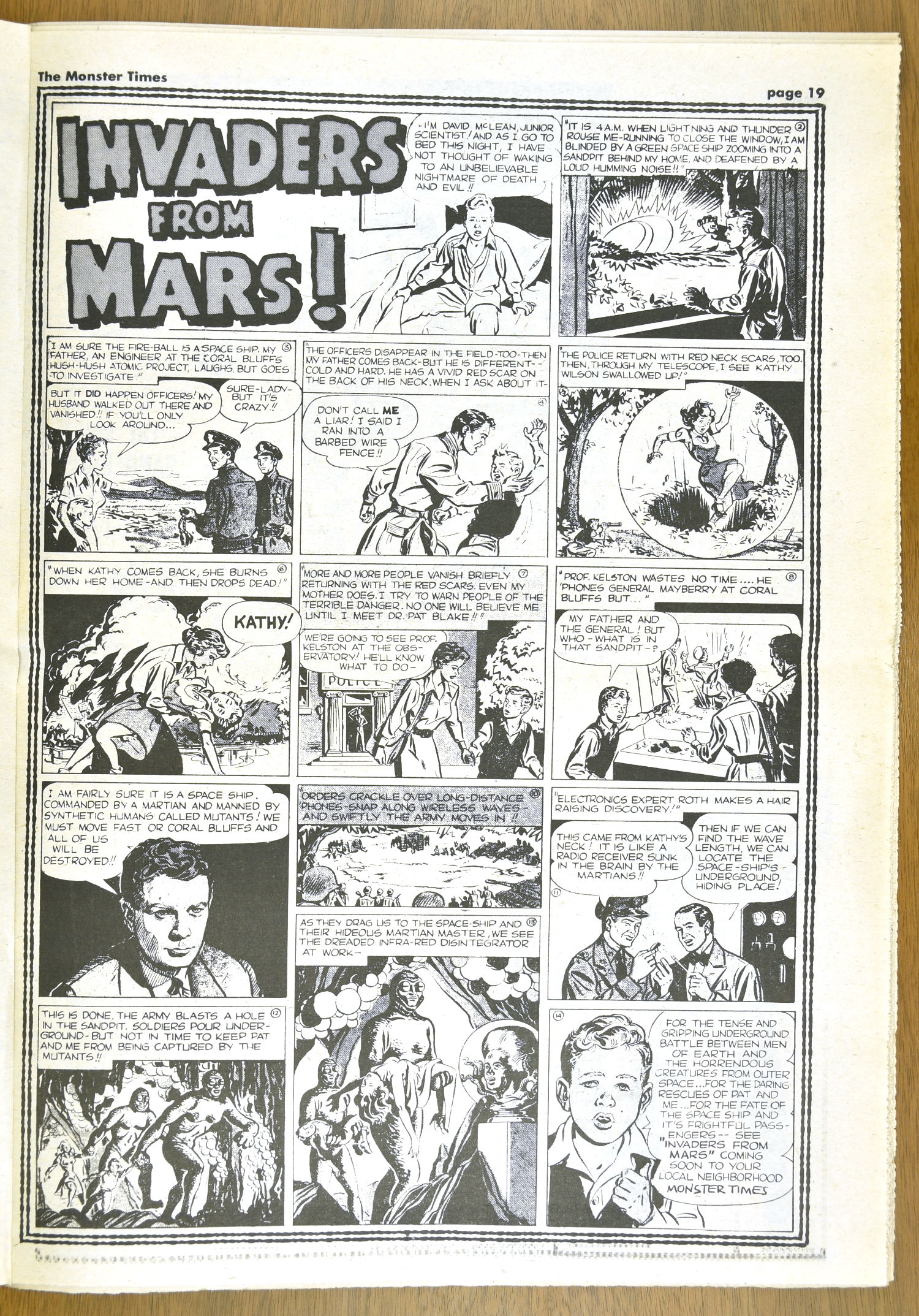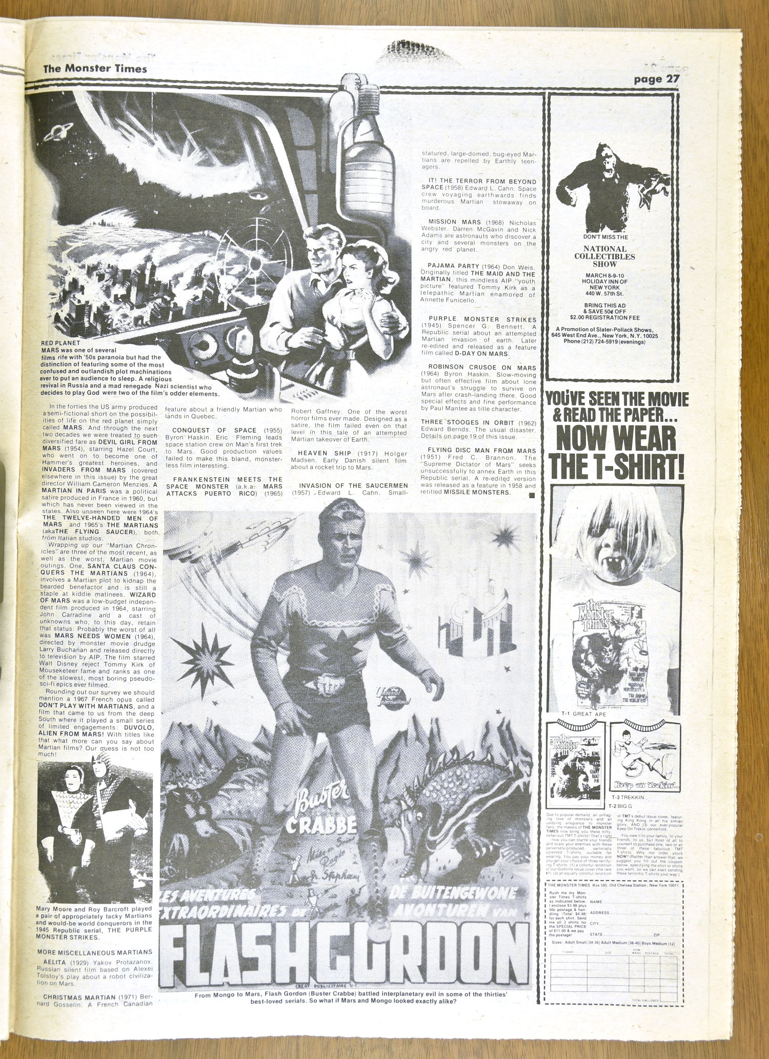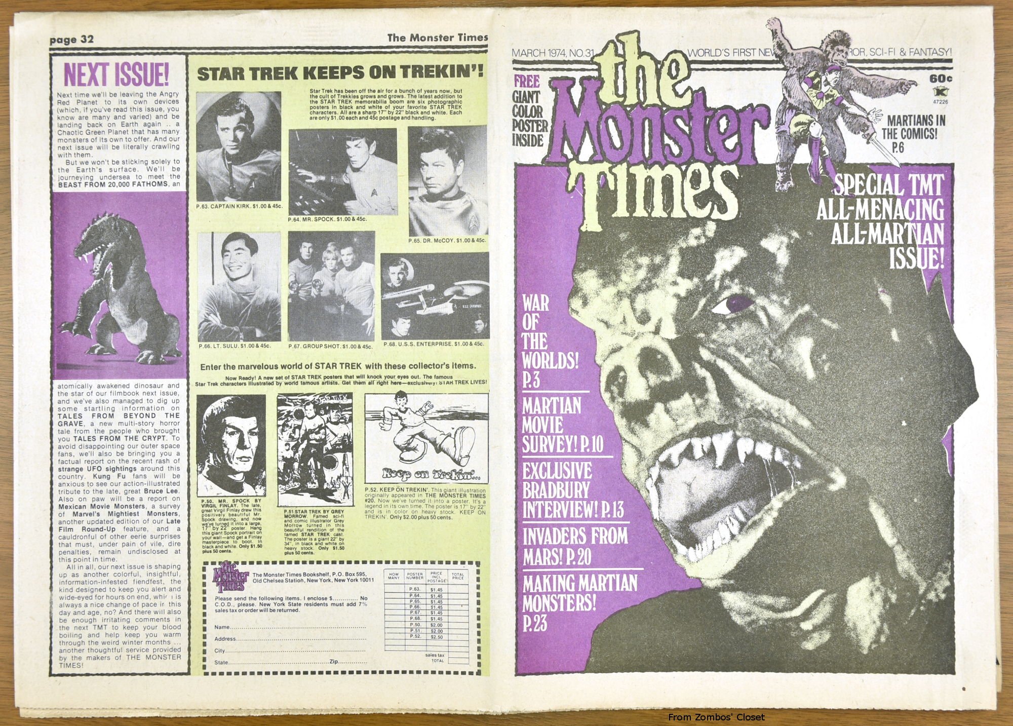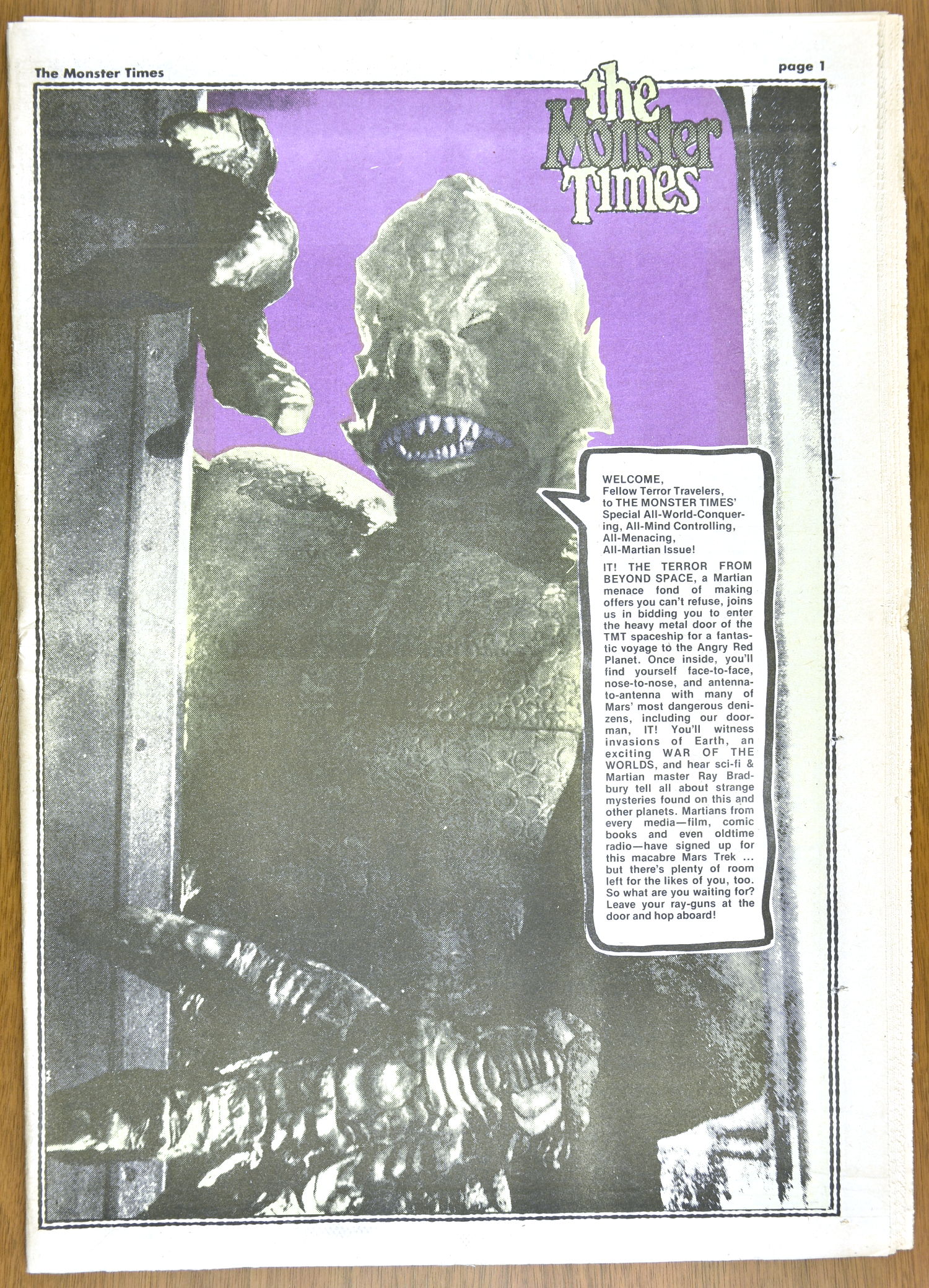 Martians invade this issue of The Monster Times. With an interview with Ray Bradbury, Martian movies covered, Orson Welles terrifying radio version of War of the Worlds, and Martians in the Movies as well as Martians in the Comics, you'll go out of this world.