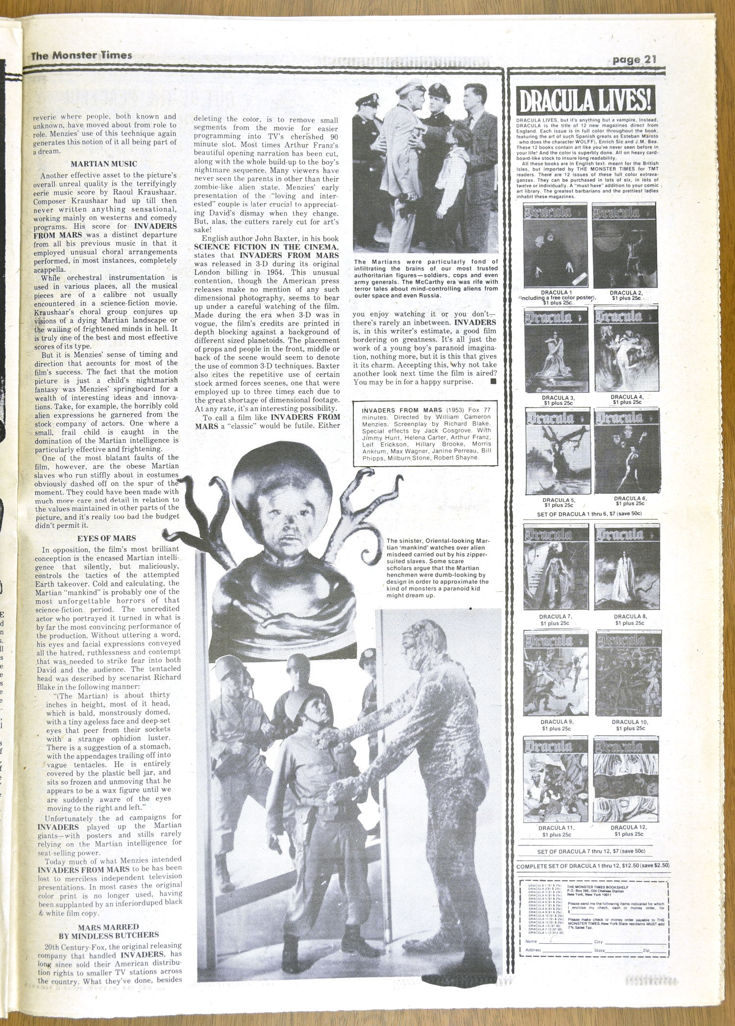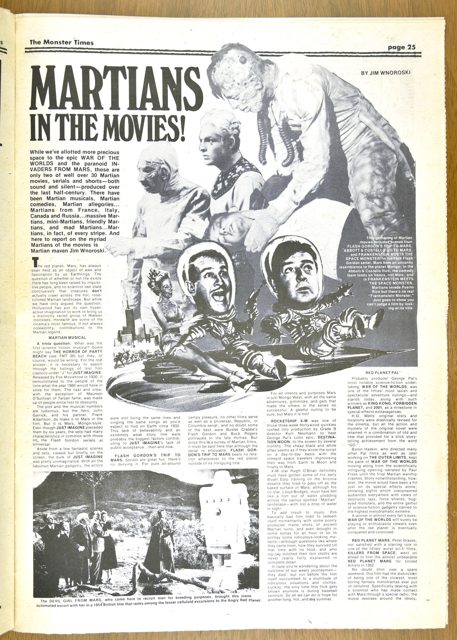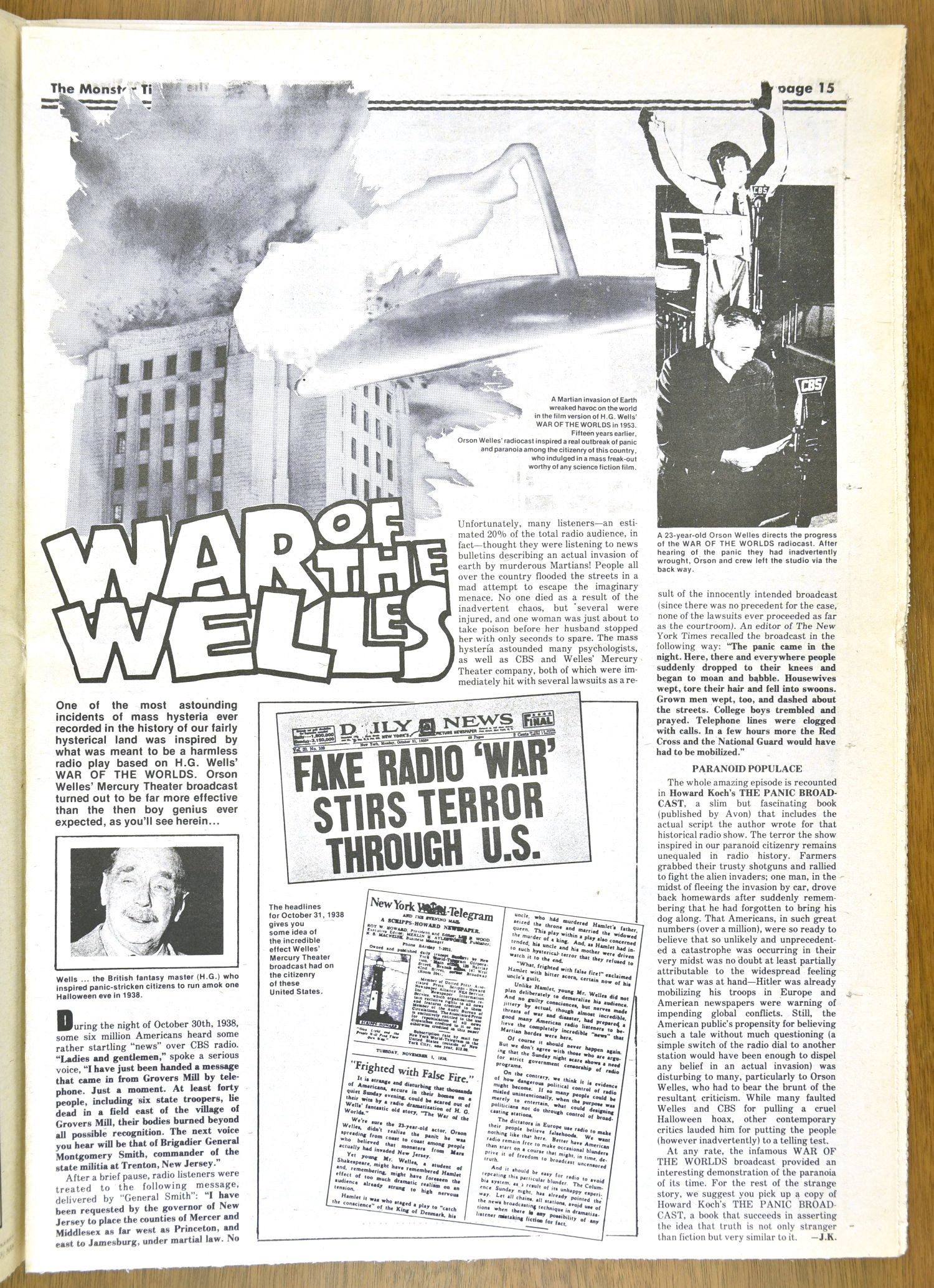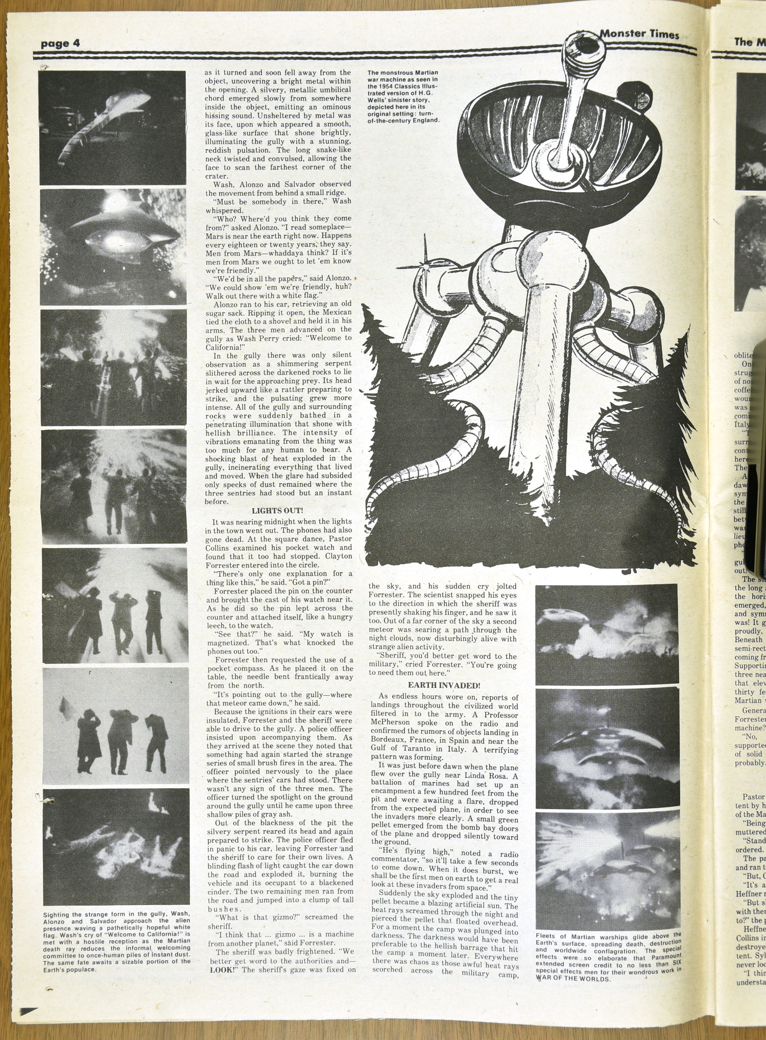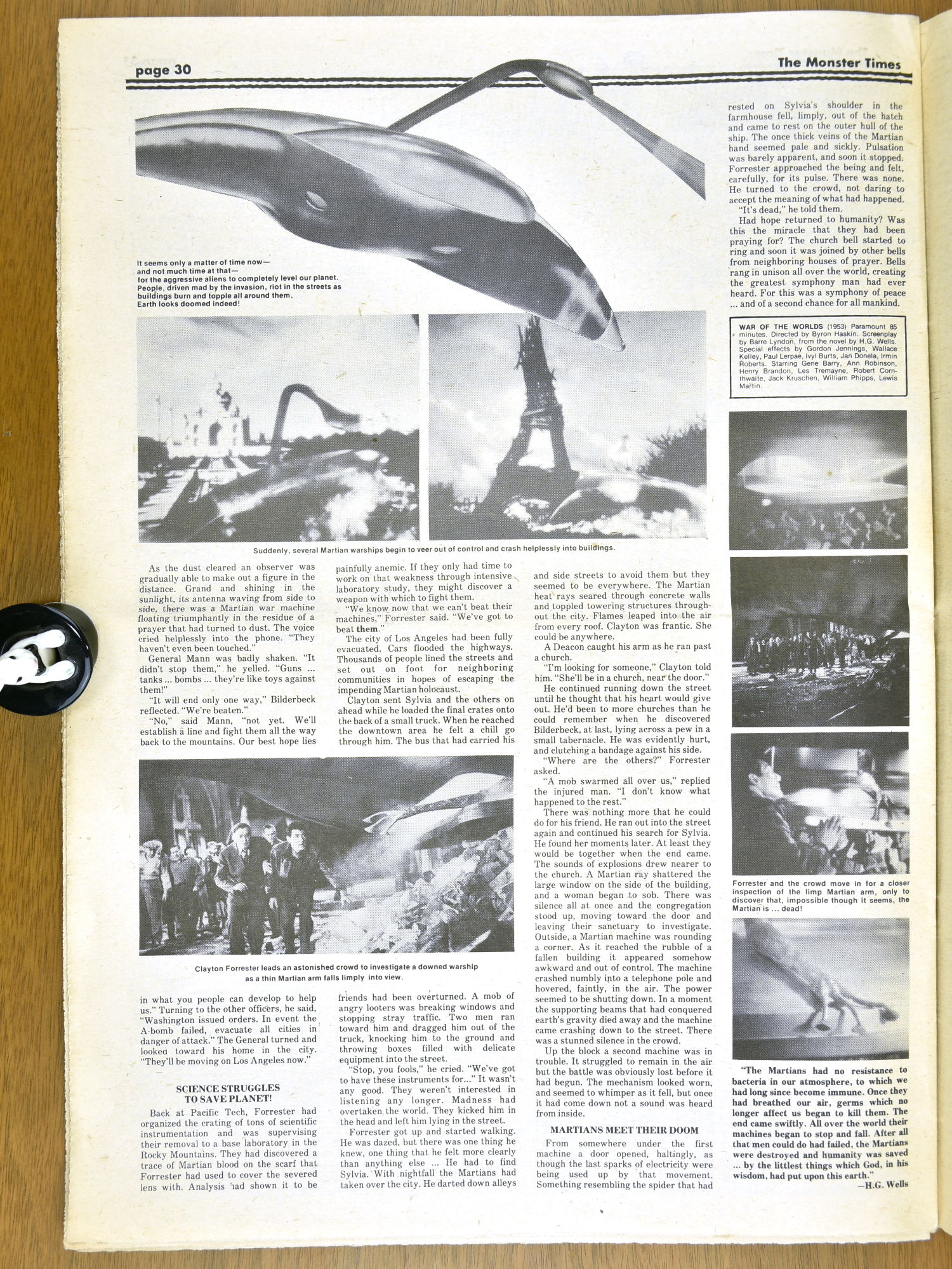 Martians invade this issue of The Monster Times. With an interview with Ray Bradbury, Martian movies covered, Orson Welles terrifying radio version of War of the Worlds, and Martians in the Movies as well as Martians in the Comics, you'll go out of this world.