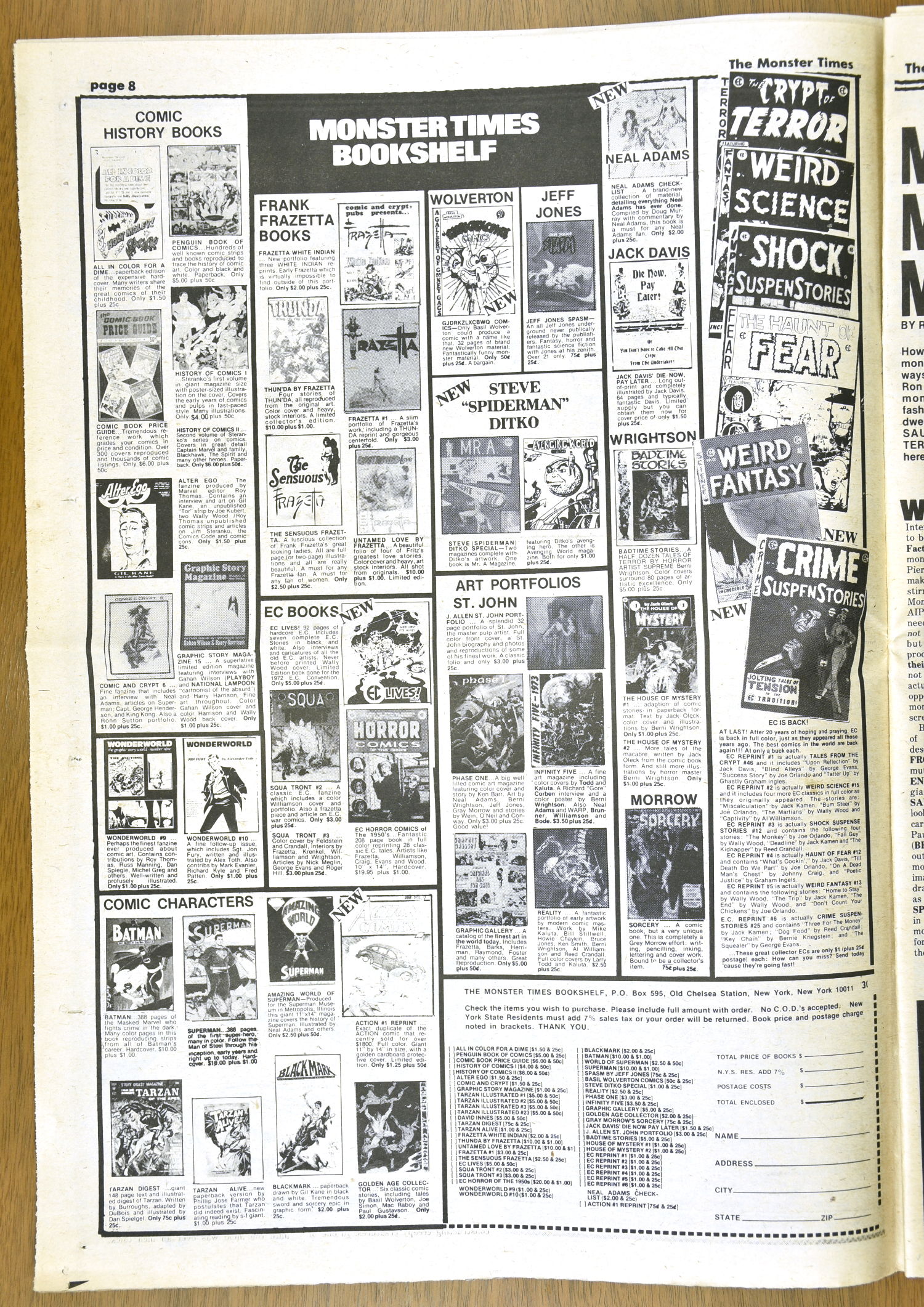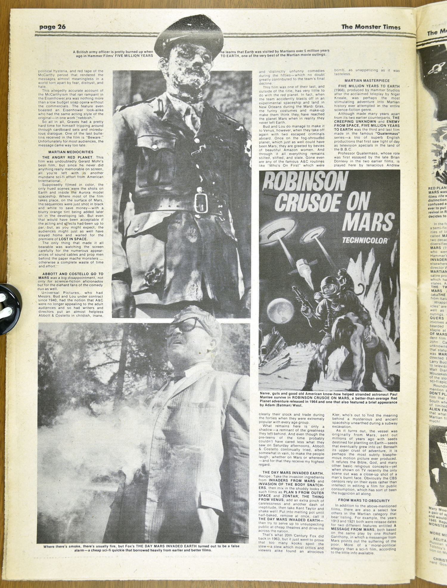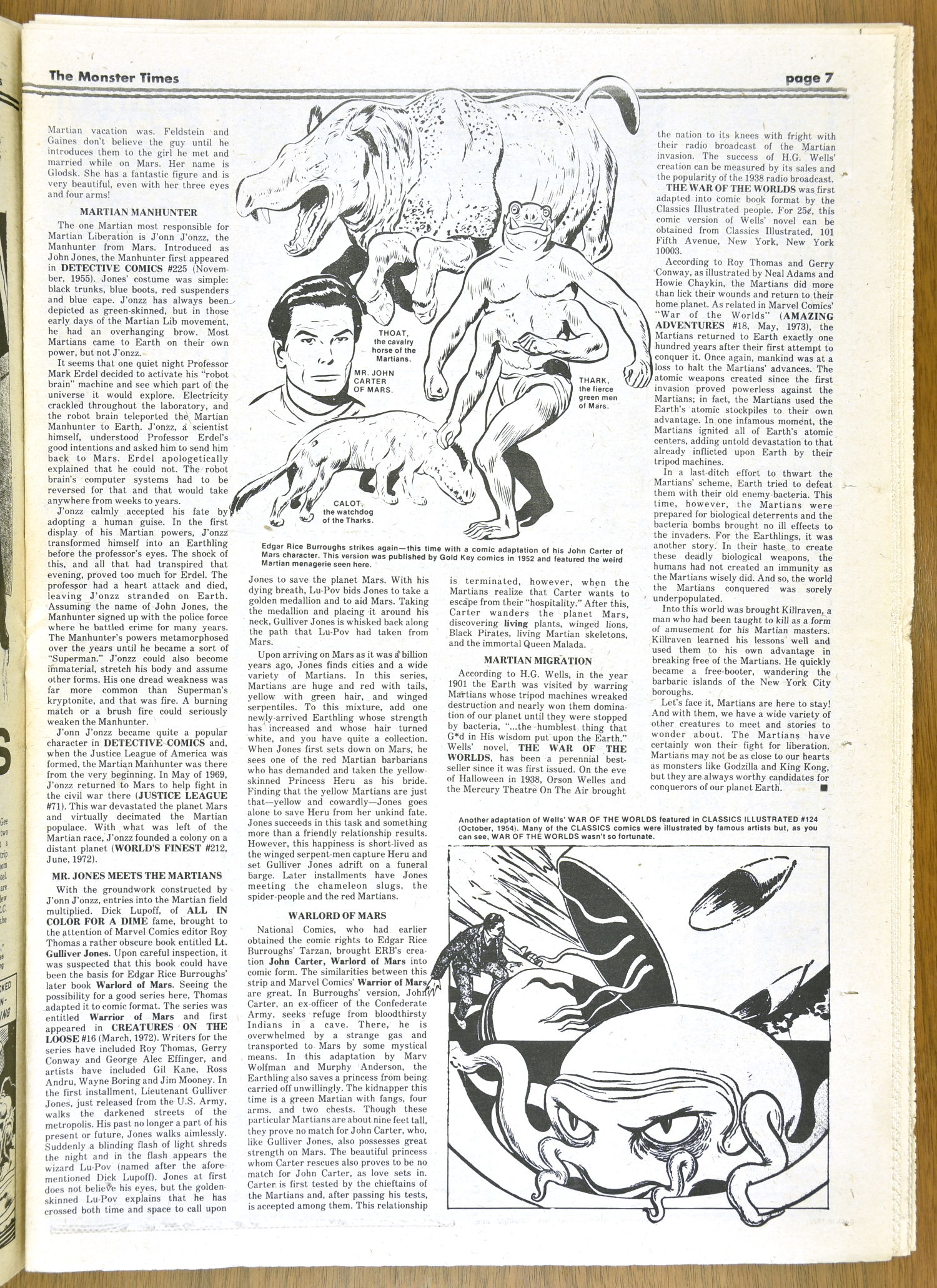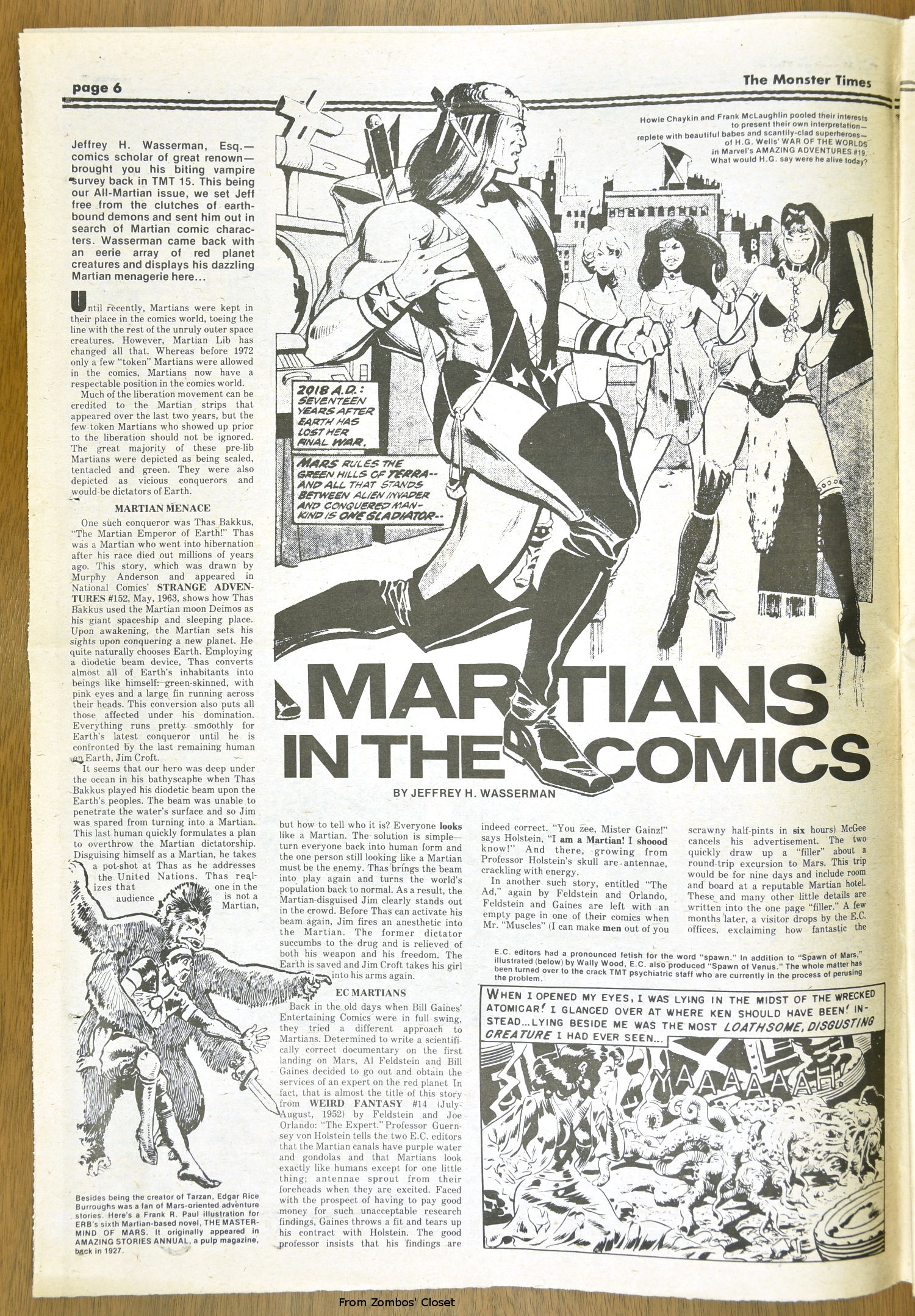 Martians invade this issue of The Monster Times. With an interview with Ray Bradbury, Martian movies covered, Orson Welles terrifying radio version of War of the Worlds, and Martians in the Movies as well as Martians in the Comics, you'll go out of this world.